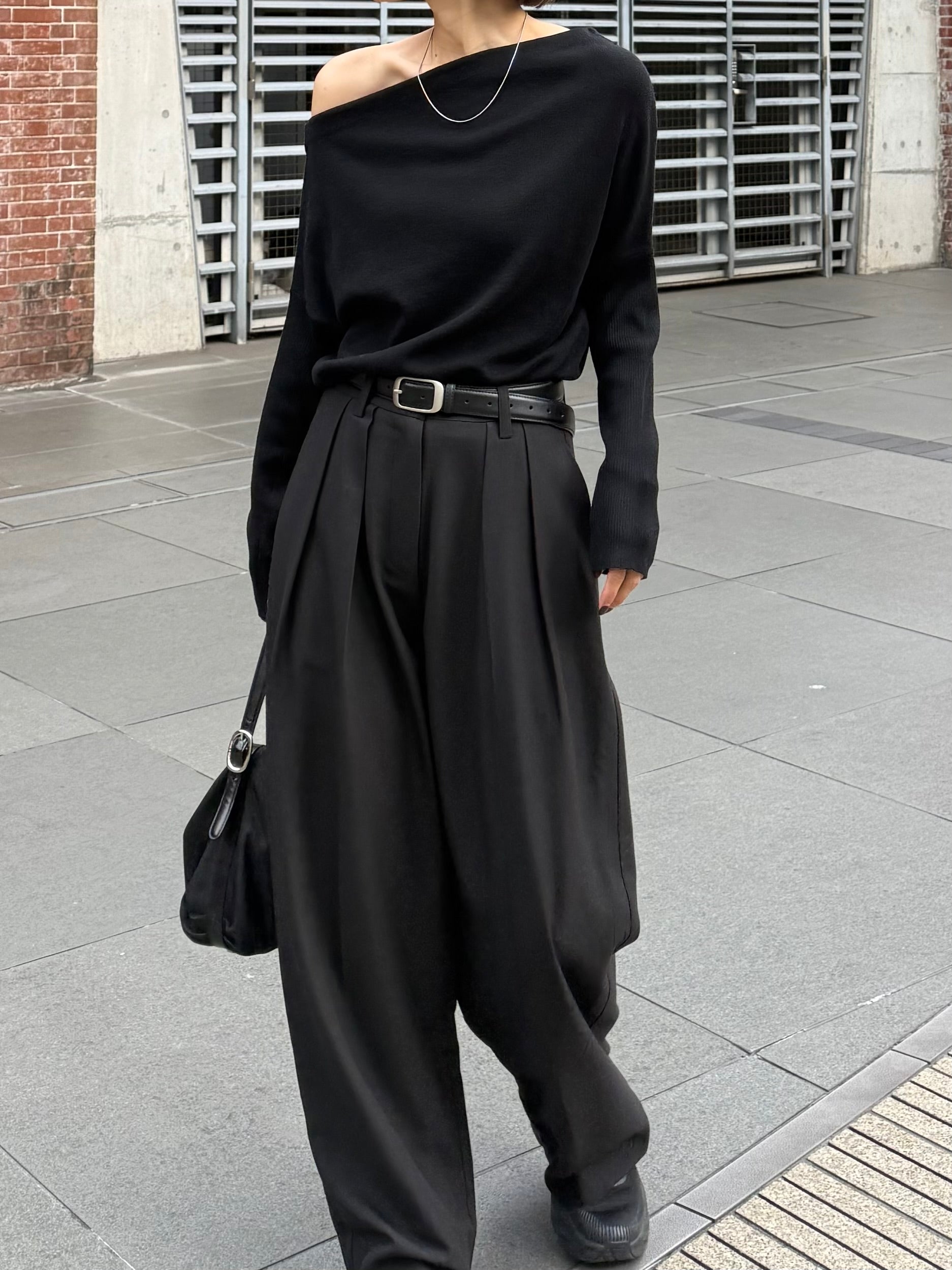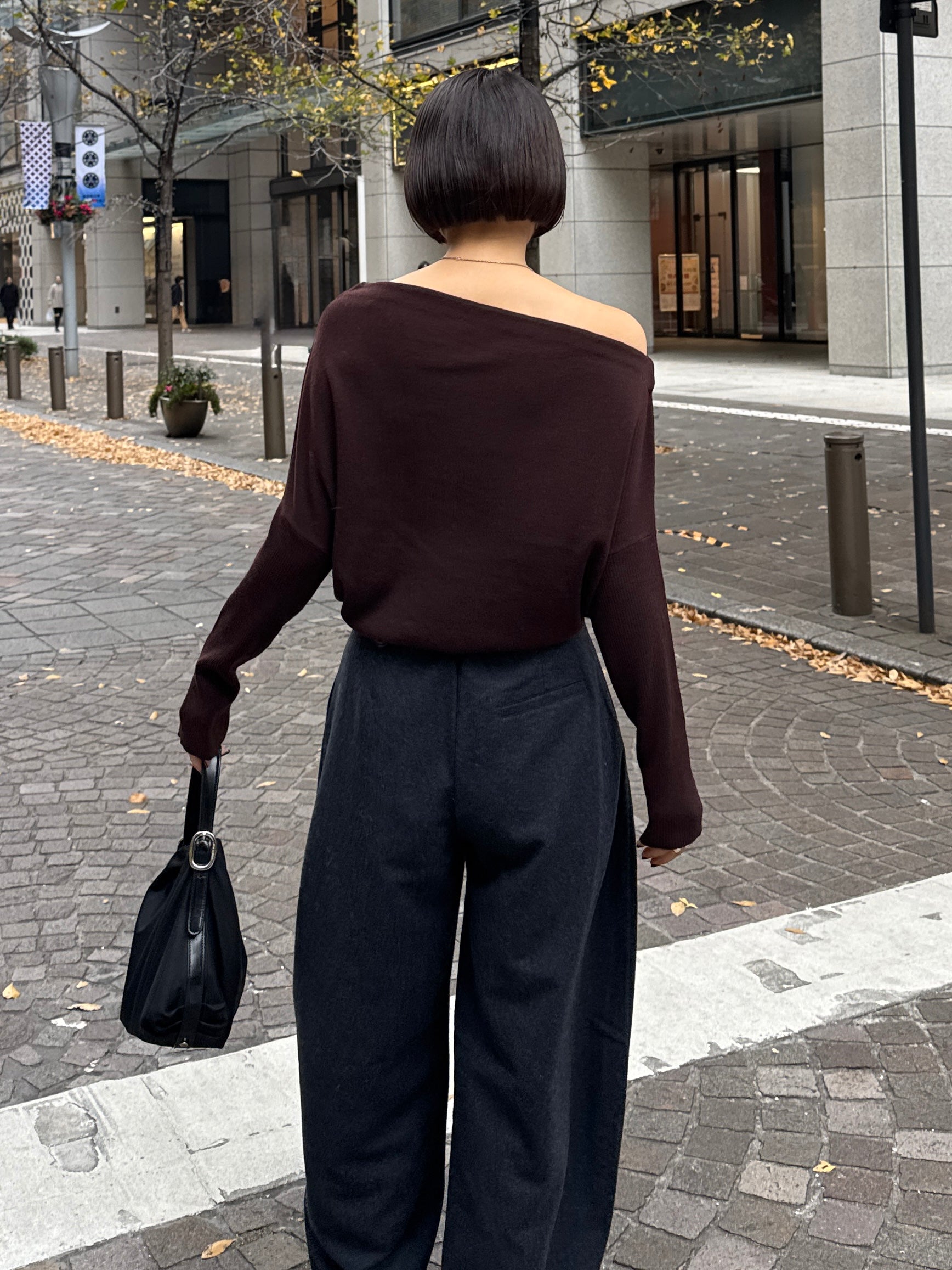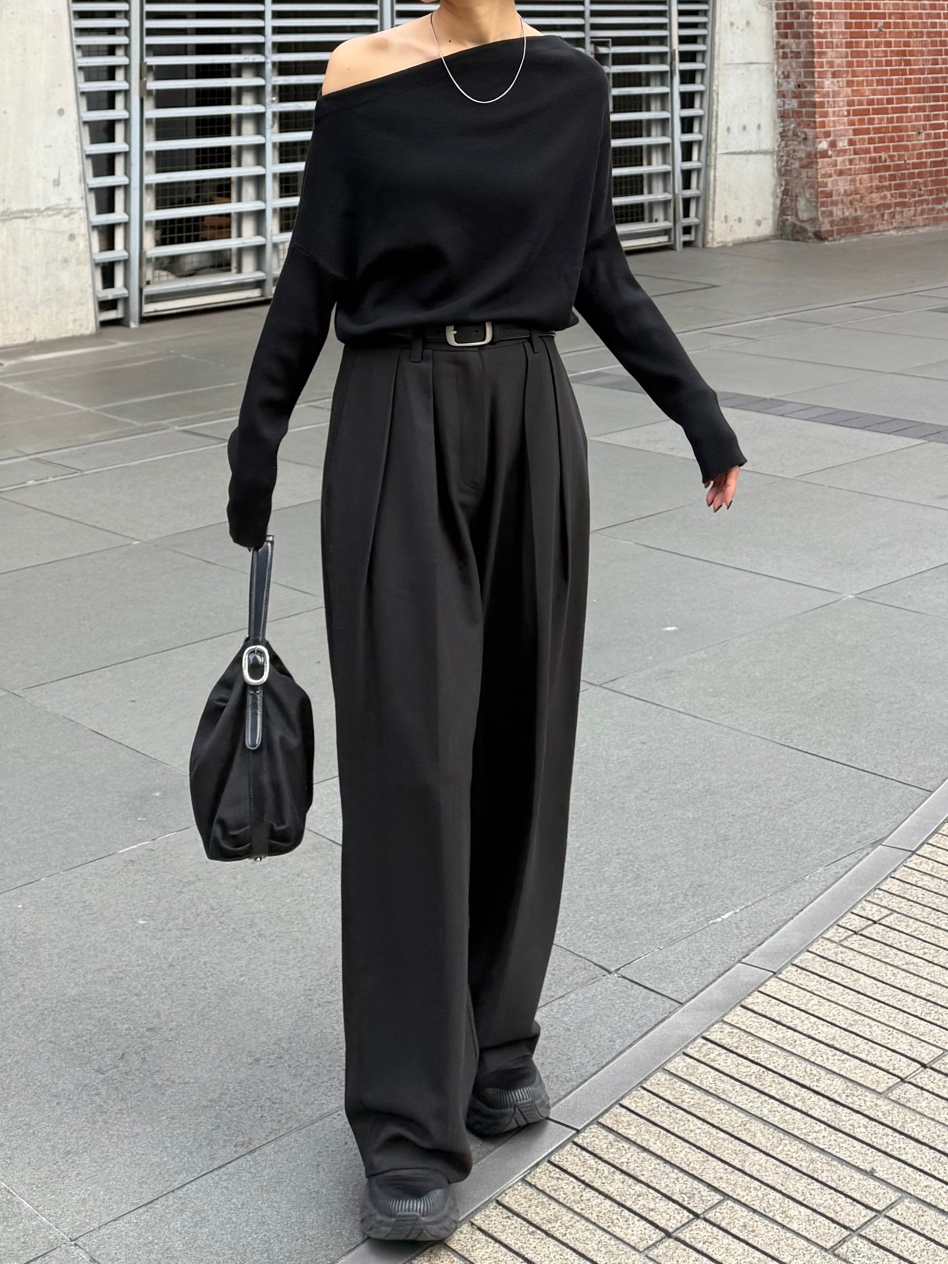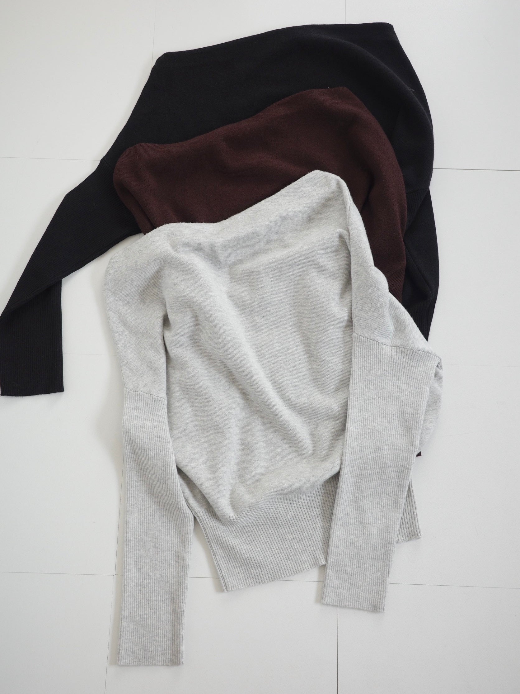 身体に沿って落ちるラインがきれいな、ワンショルダー仕様のニットトップス。 力を抜いたシルエットながら、着たときに自然と雰囲気の出る1枚です。 ネックラインは片側の肩がほどよく覗くカッティングにし抜け感がありつつ、肌見せが主張しすぎないバランスに仕上げています。 袖口と裾にはしっかり目のリブを効かせ、全体をすっきりと引き締めるディテールに。 薄すぎず厚すぎない素材感で、アウターの中にも収まりが良く冬場のレイヤードでも着膨れしにくいのも嬉しいポイントです。 カラーはアイボリーとネイビーの2色でワードローブに自然と馴染む落ち着いたラインナップです。