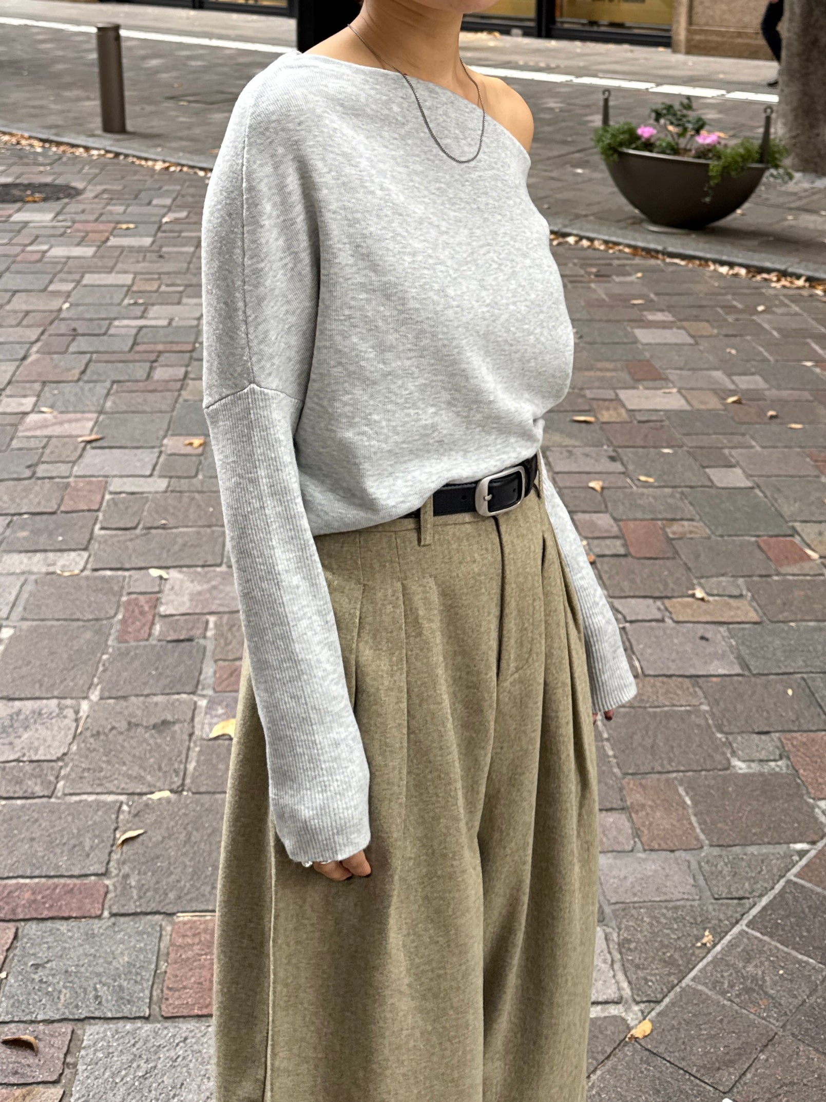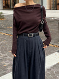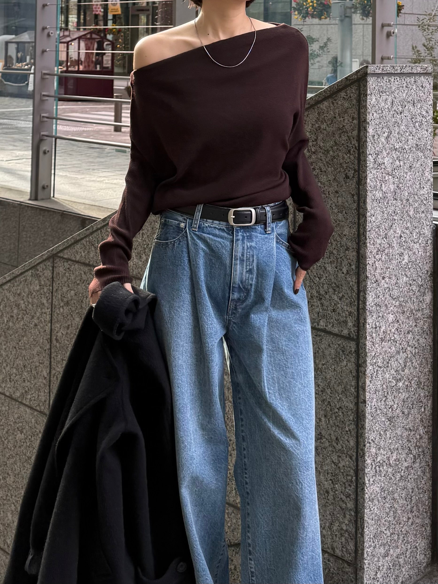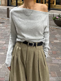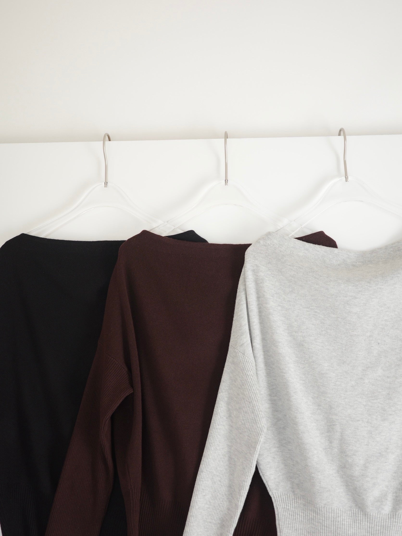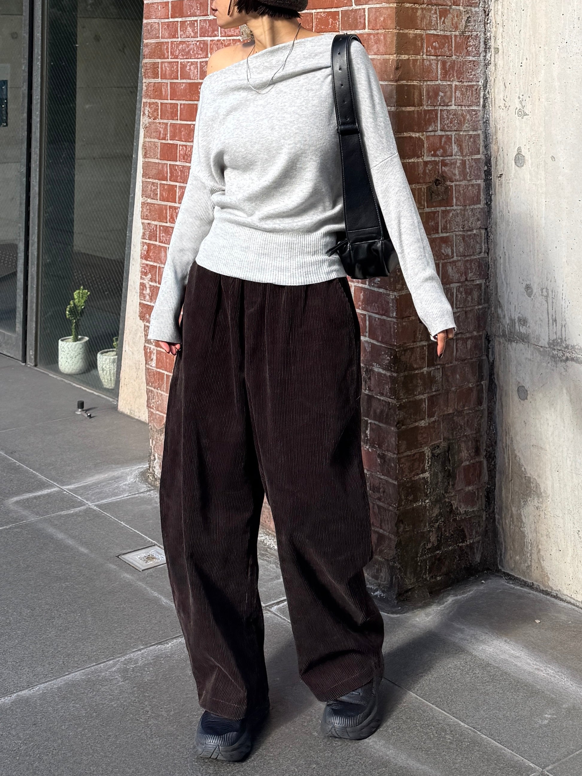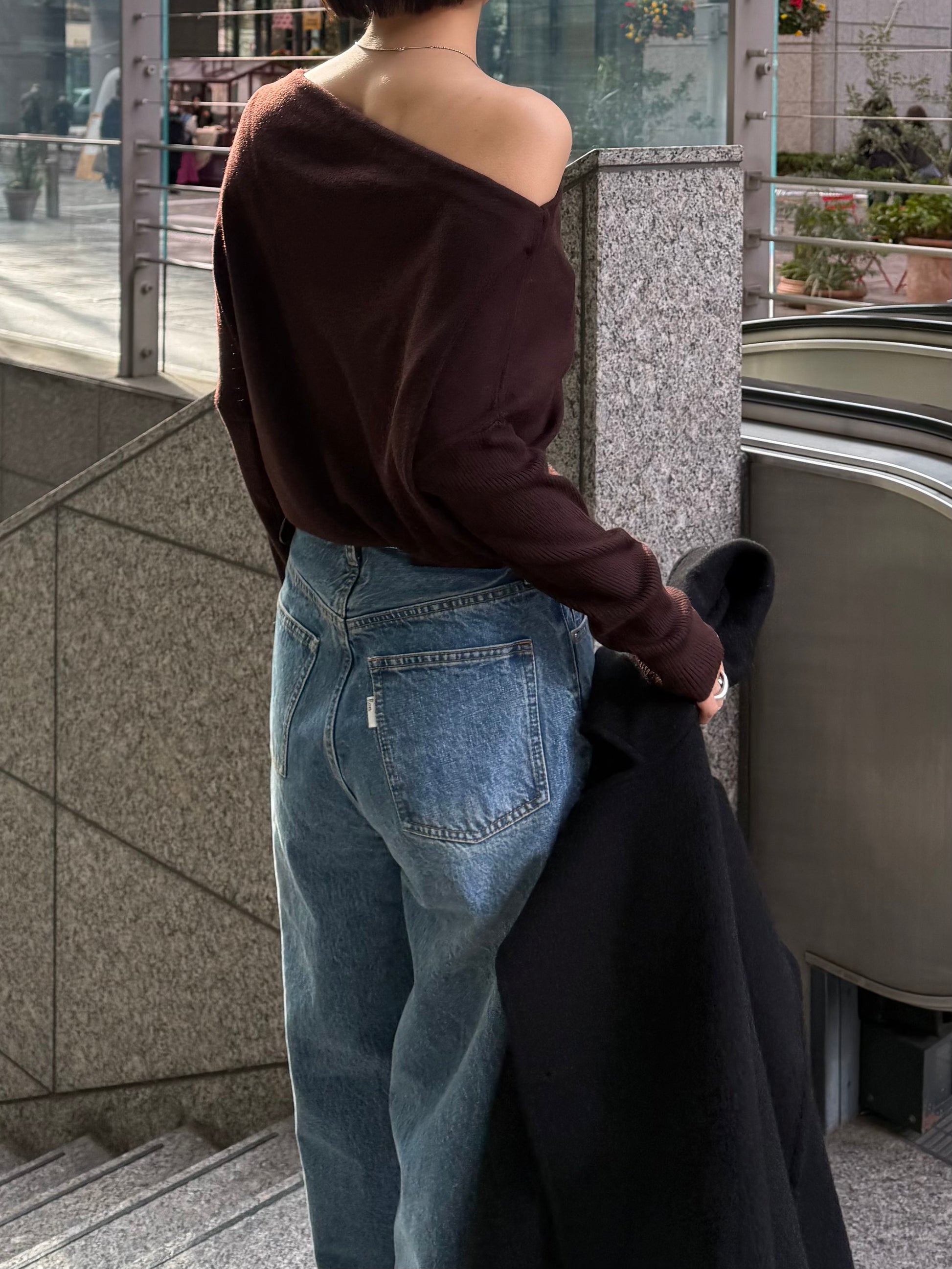 身体に沿って落ちるラインがきれいな、ワンショルダー仕様のニットトップス。 力を抜いたシルエットながら、着たときに自然と雰囲気の出る1枚です。 ネックラインは片側の肩がほどよく覗くカッティングにし抜け感がありつつ、肌見せが主張しすぎないバランスに仕上げています。 袖口と裾にはしっかり目のリブを効かせ、全体をすっきりと引き締めるディテールに。 薄すぎず厚すぎない素材感で、アウターの中にも収まりが良く冬場のレイヤードでも着膨れしにくいのも嬉しいポイントです。 カラーはアイボリーとネイビーの2色でワードローブに自然と馴染む落ち着いたラインナップです。