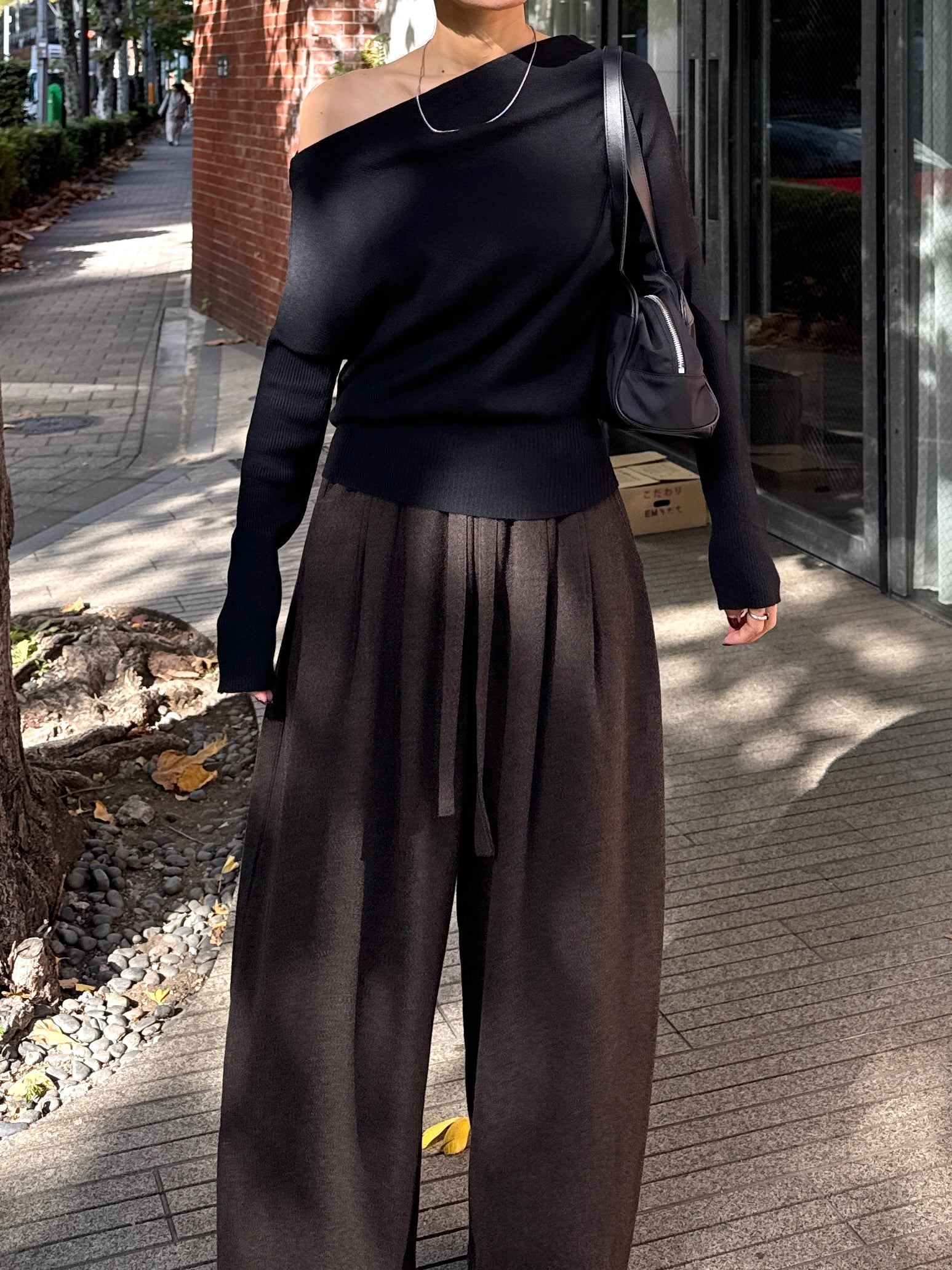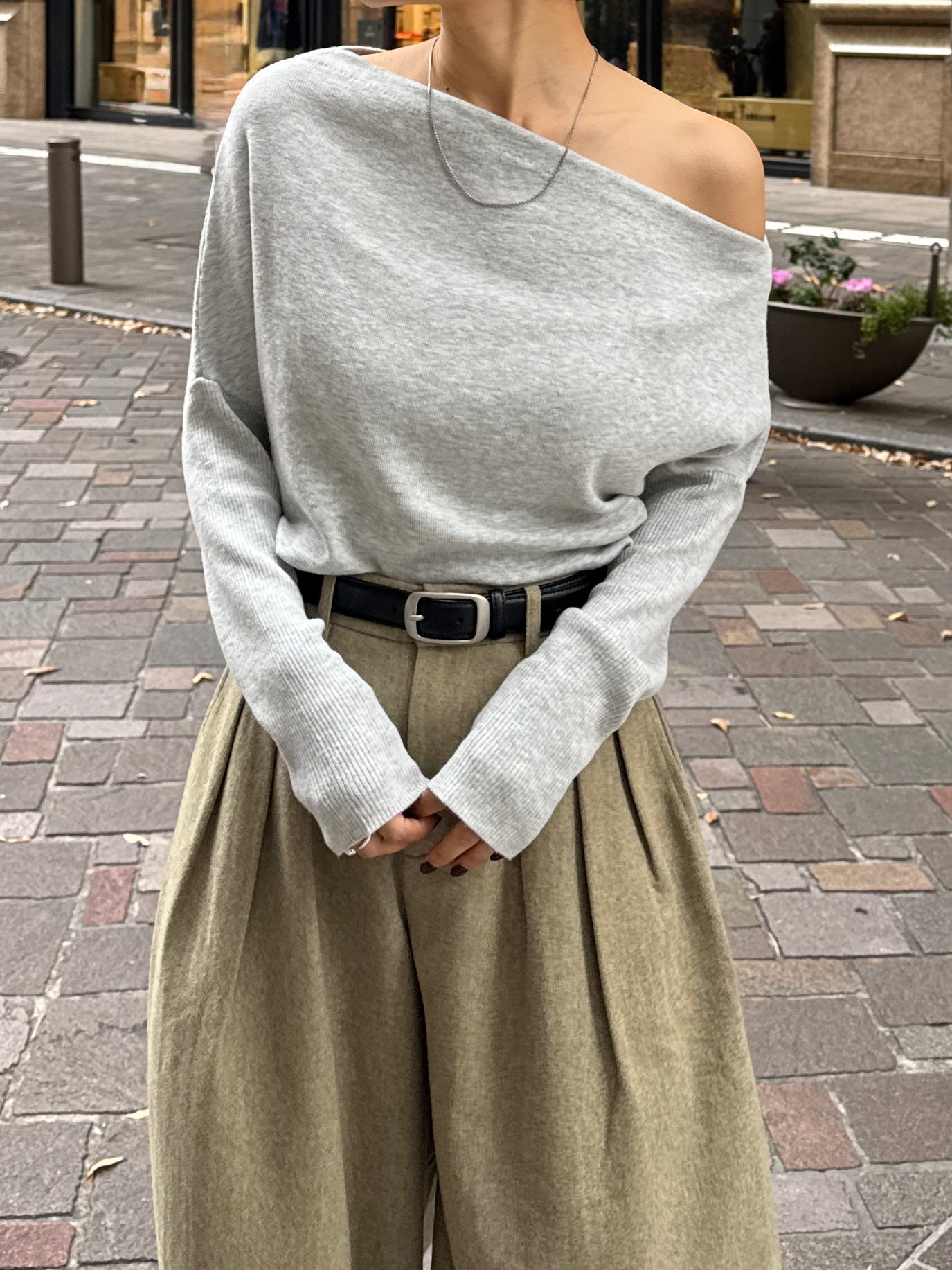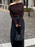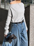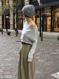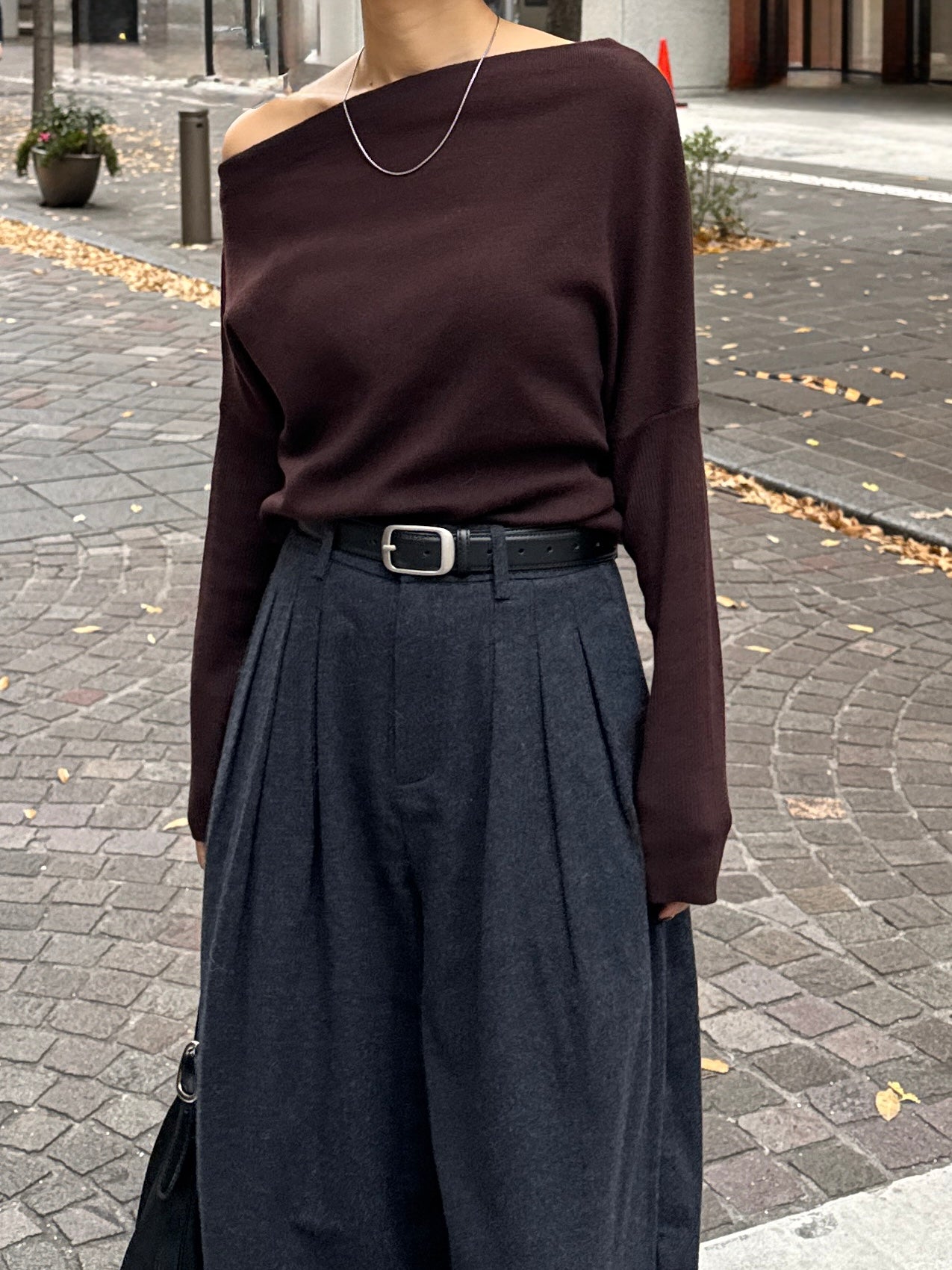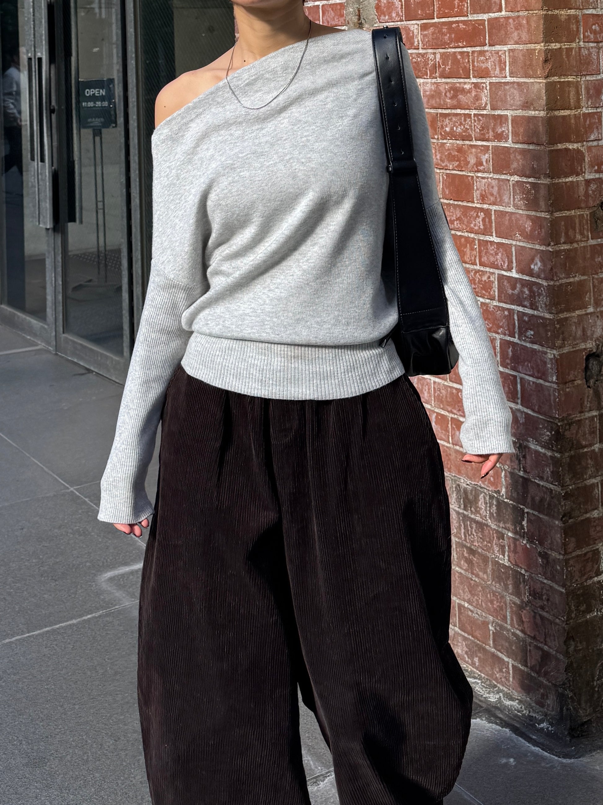 身体に沿って落ちるラインがきれいな、ワンショルダー仕様のニットトップス。 力を抜いたシルエットながら、着たときに自然と雰囲気の出る1枚です。 ネックラインは片側の肩がほどよく覗くカッティングにし抜け感がありつつ、肌見せが主張しすぎないバランスに仕上げています。 袖口と裾にはしっかり目のリブを効かせ、全体をすっきりと引き締めるディテールに。 薄すぎず厚すぎない素材感で、アウターの中にも収まりが良く冬場のレイヤードでも着膨れしにくいのも嬉しいポイントです。 カラーはアイボリーとネイビーの2色でワードローブに自然と馴染む落ち着いたラインナップです。
