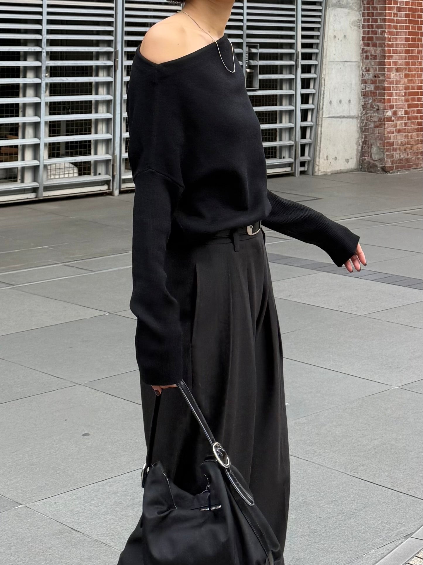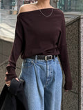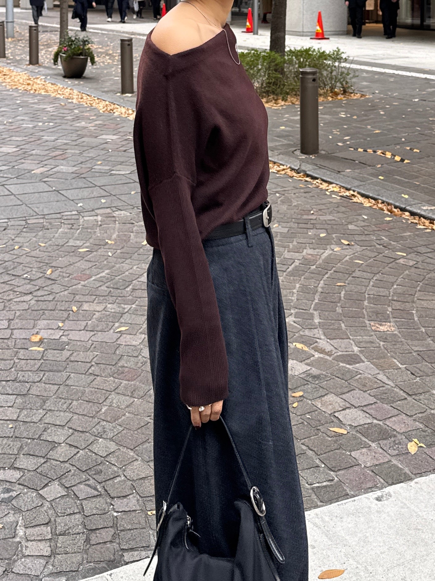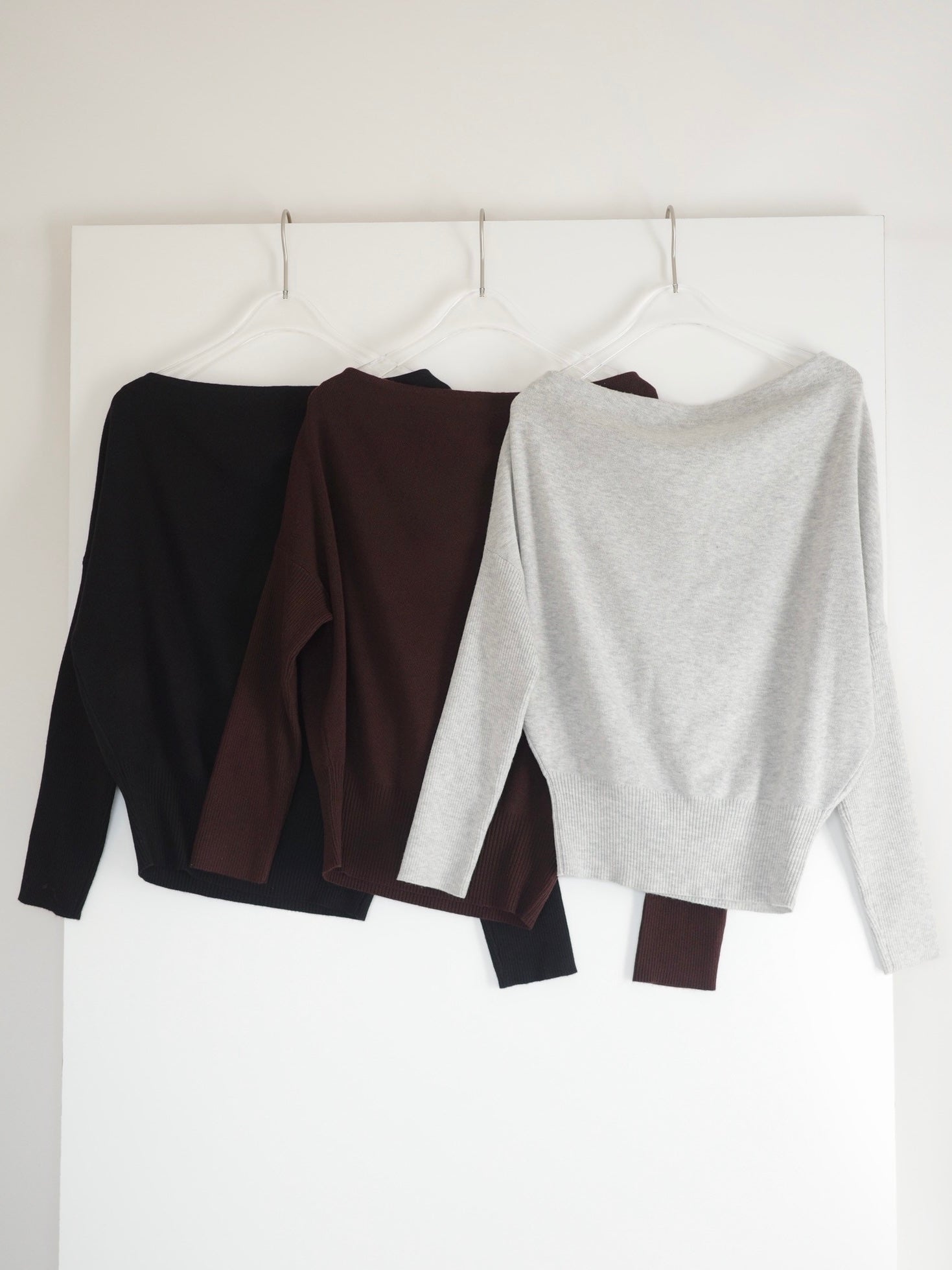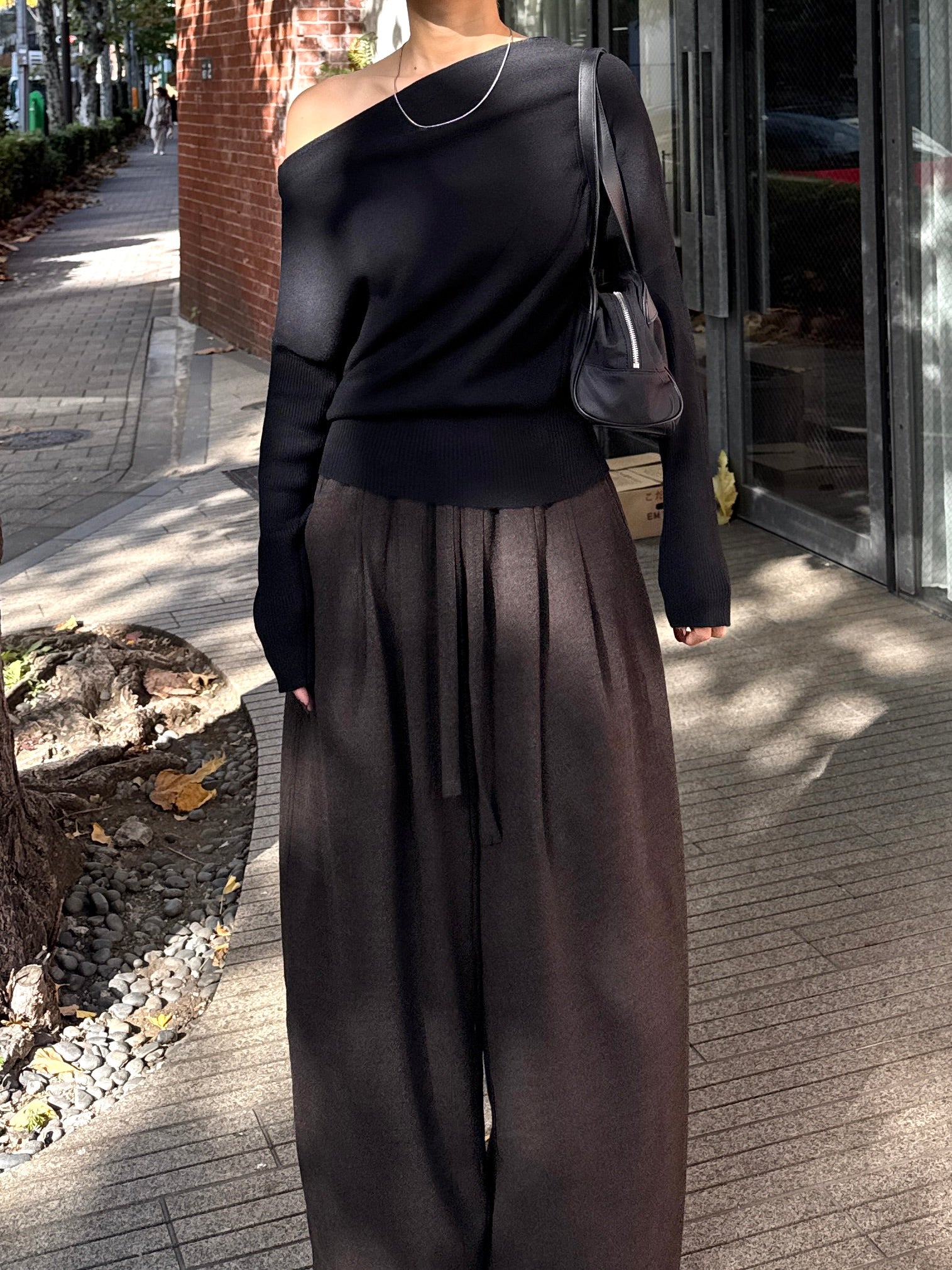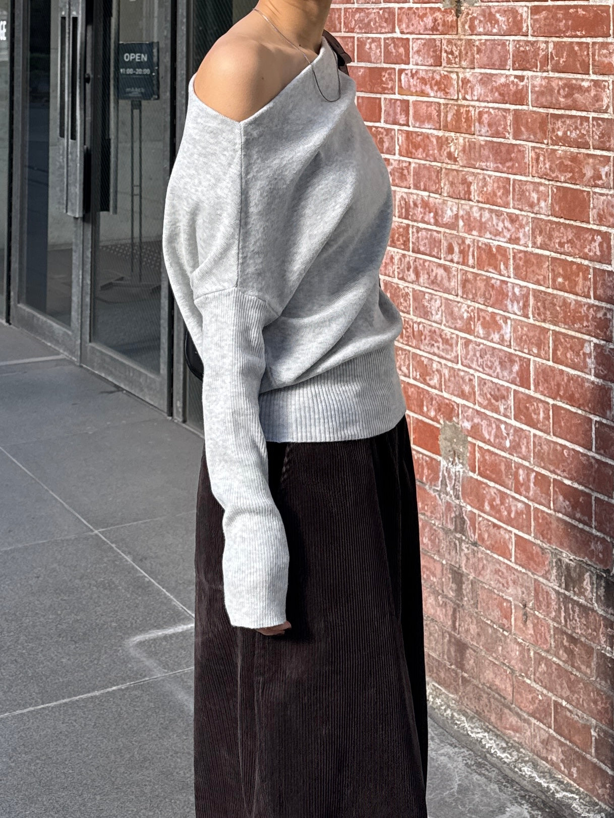 身体に沿って落ちるラインがきれいな、ワンショルダー仕様のニットトップス。 力を抜いたシルエットながら、着たときに自然と雰囲気の出る1枚です。 ネックラインは片側の肩がほどよく覗くカッティングにし抜け感がありつつ、肌見せが主張しすぎないバランスに仕上げています。 袖口と裾にはしっかり目のリブを効かせ、全体をすっきりと引き締めるディテールに。 薄すぎず厚すぎない素材感で、アウターの中にも収まりが良く冬場のレイヤードでも着膨れしにくいのも嬉しいポイントです。 カラーはアイボリーとネイビーの2色でワードローブに自然と馴染む落ち着いたラインナップです。
