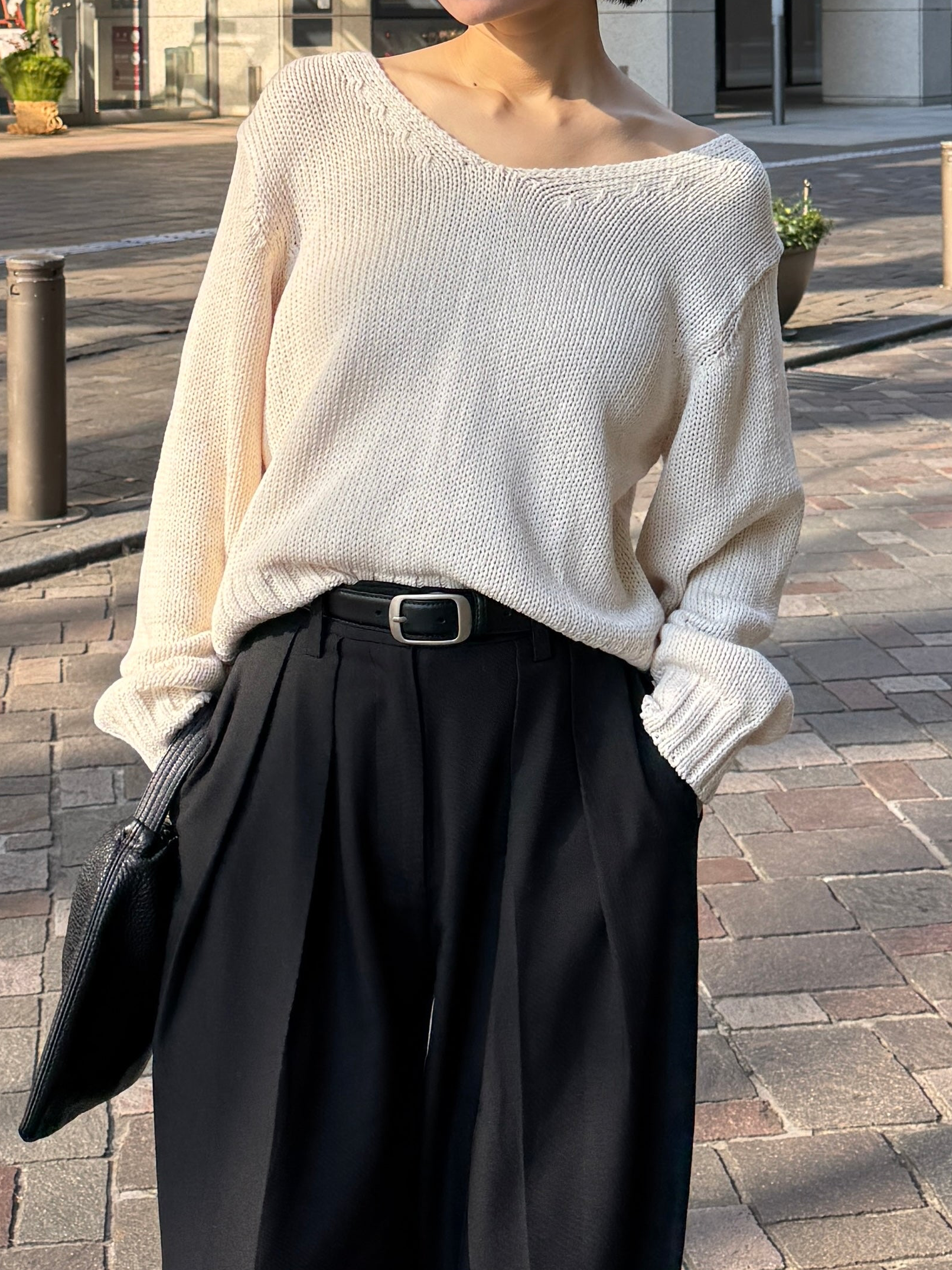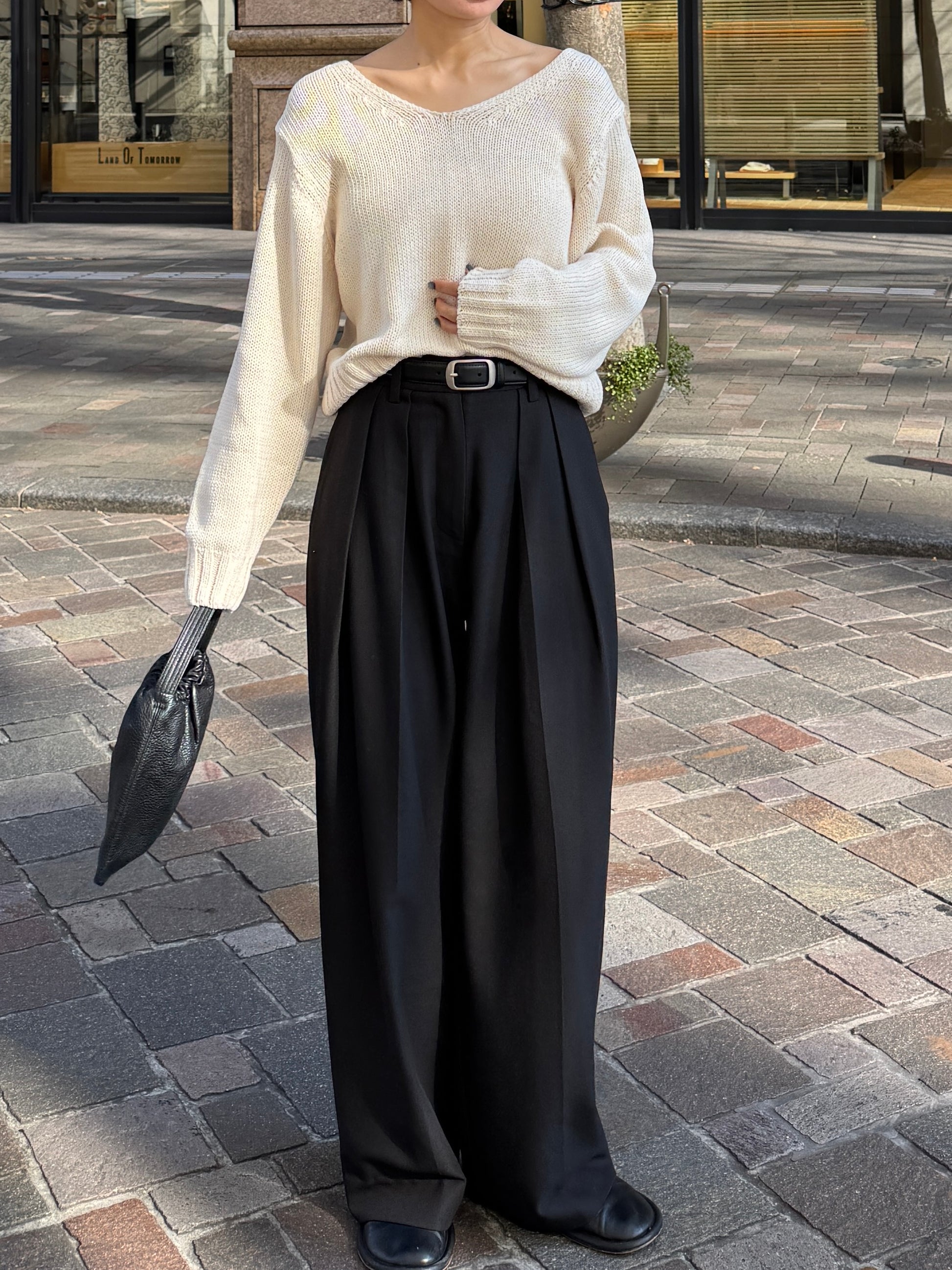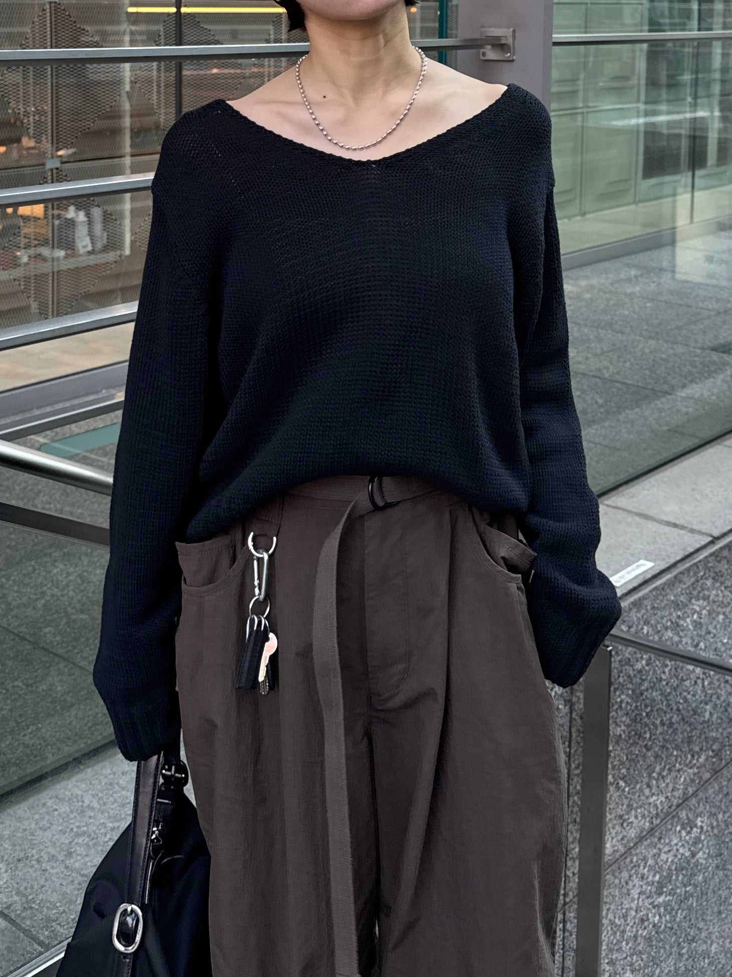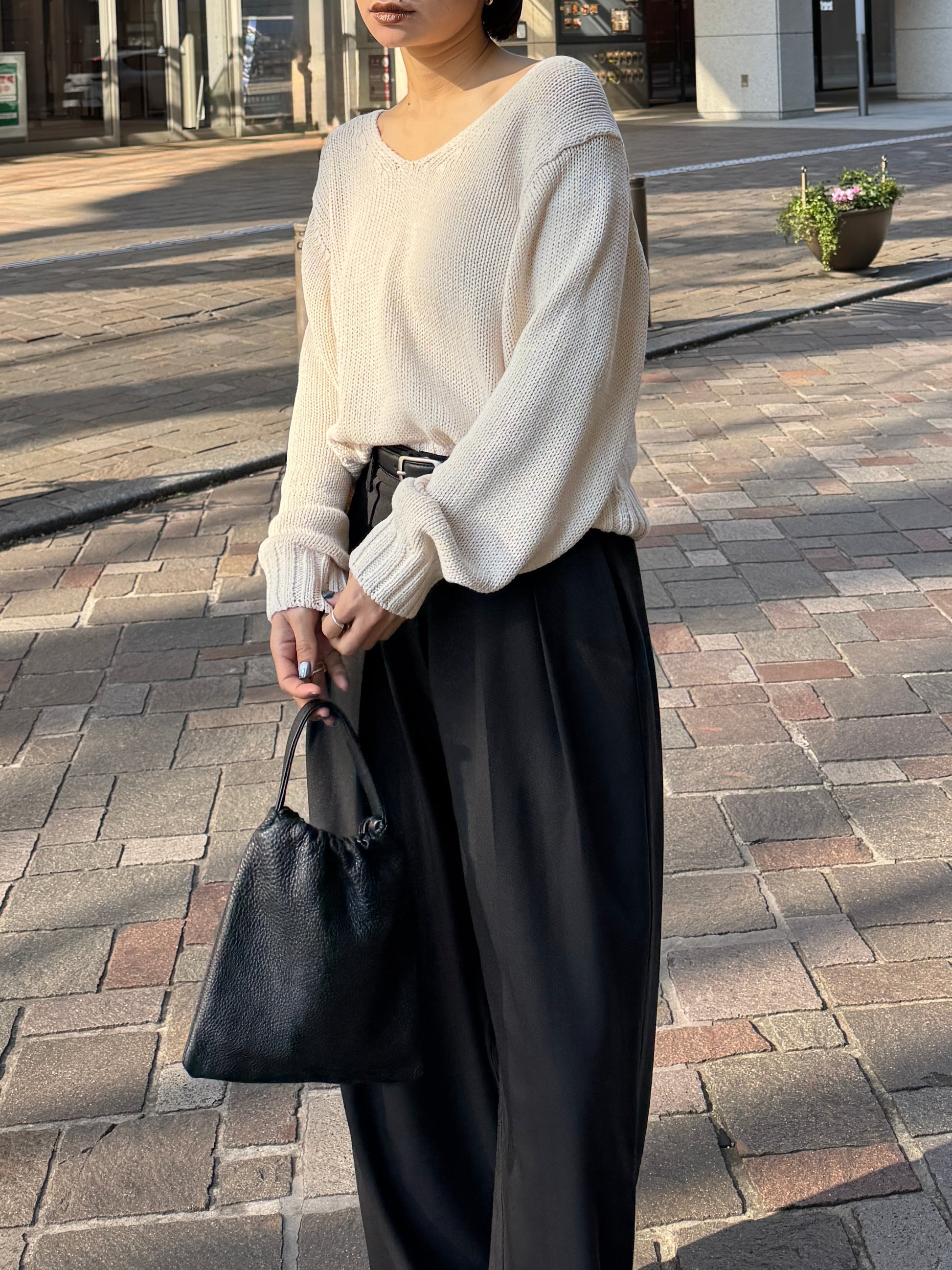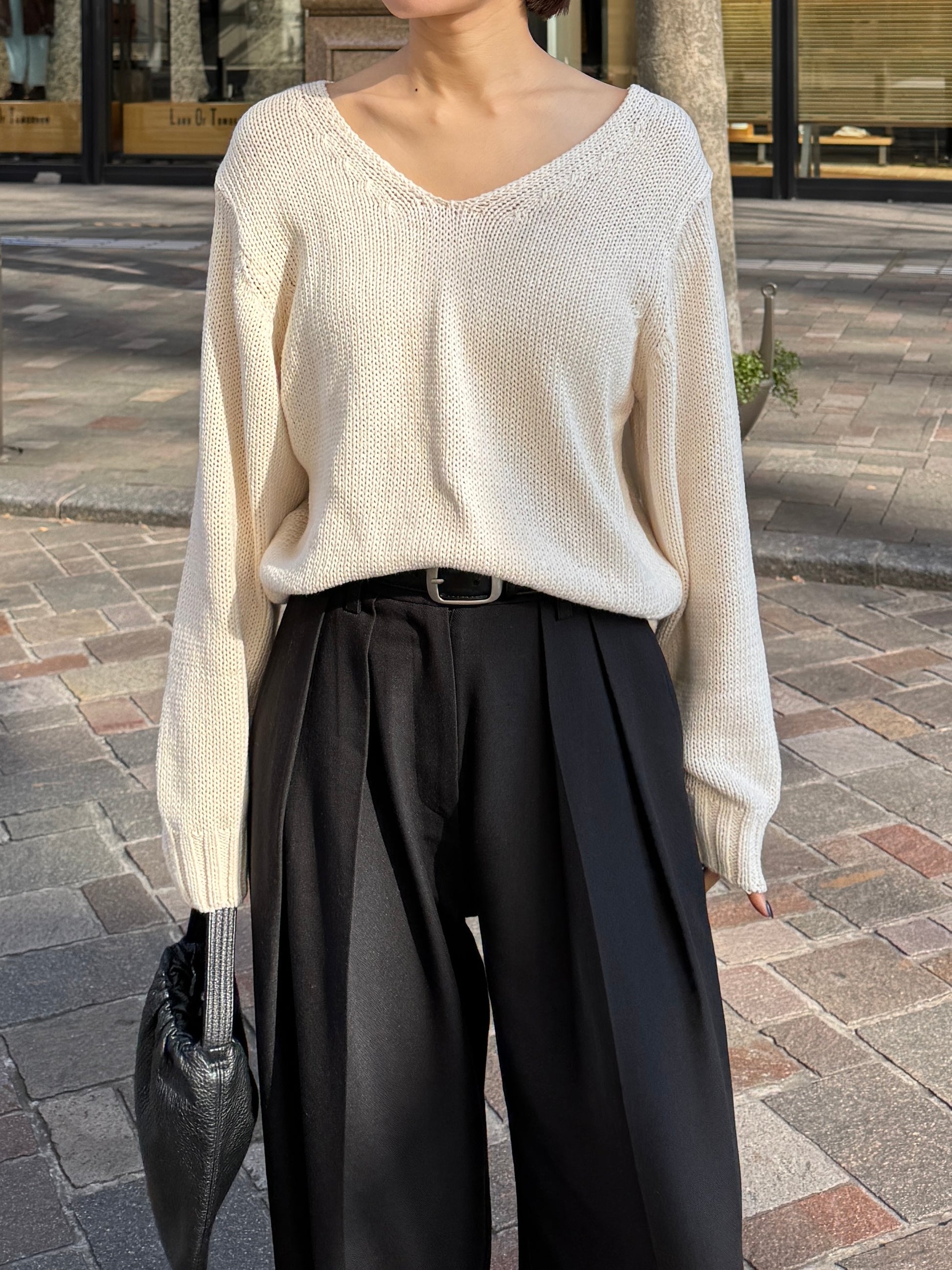 首元は開きすぎない絶妙なVネックラインで、デコルテをきれいに見せつつ上品な抜け感をプラスしてくれます◎