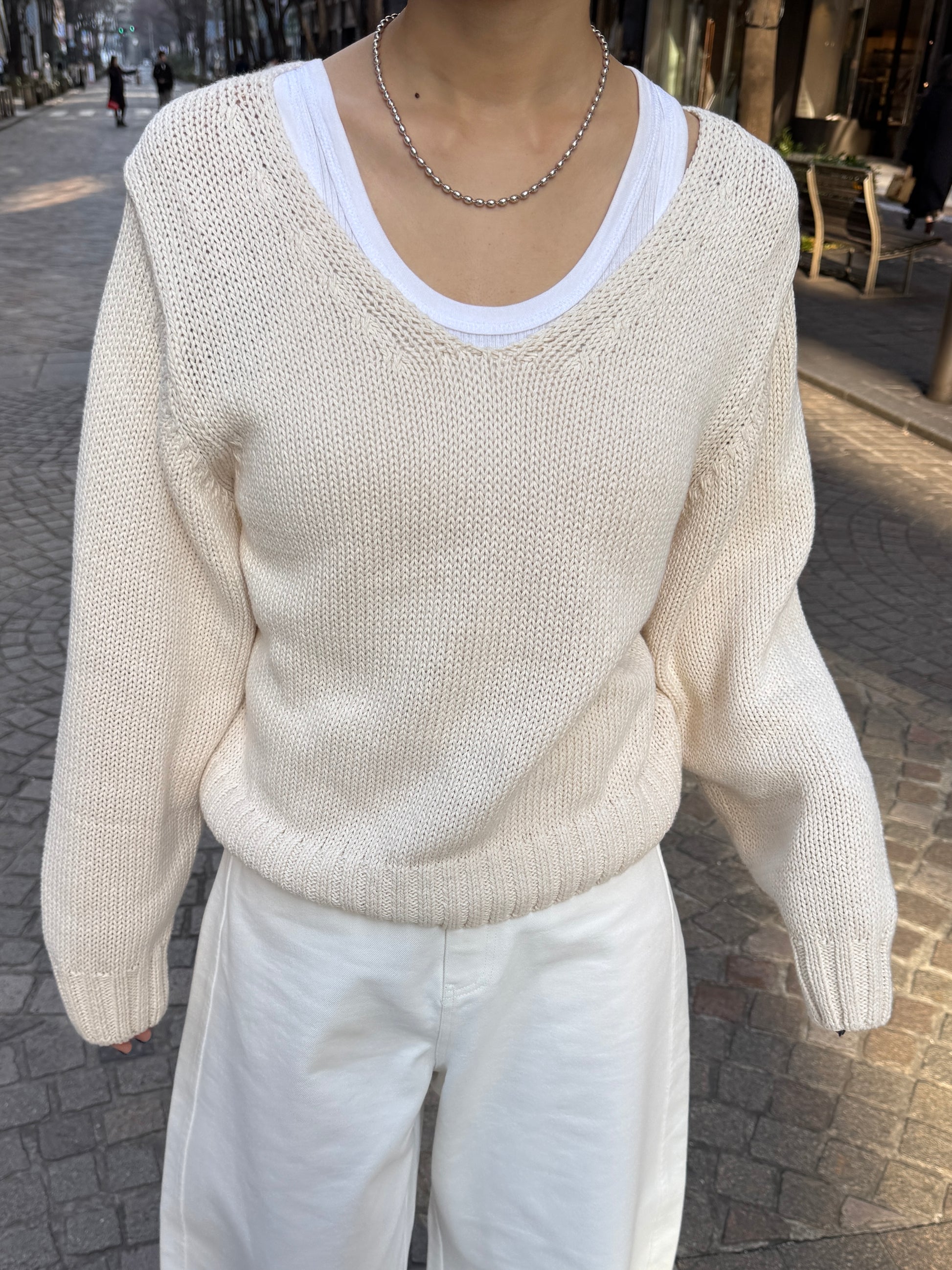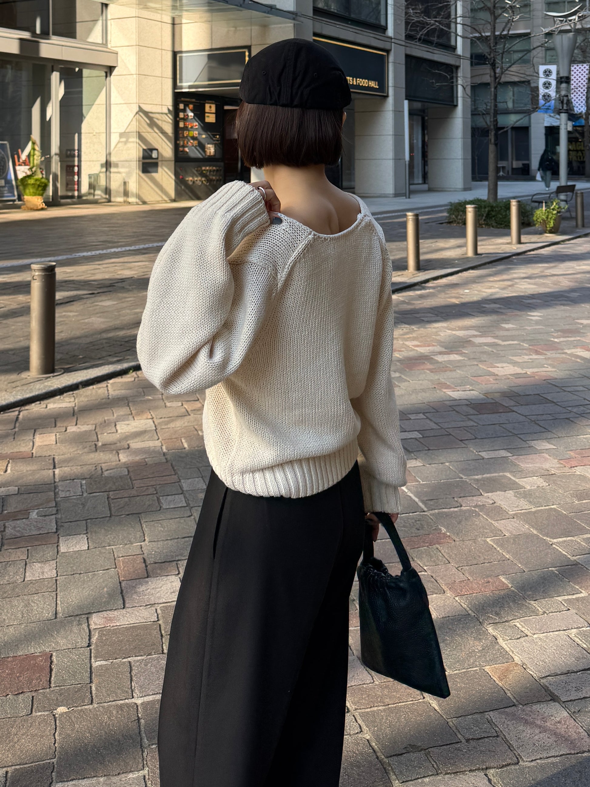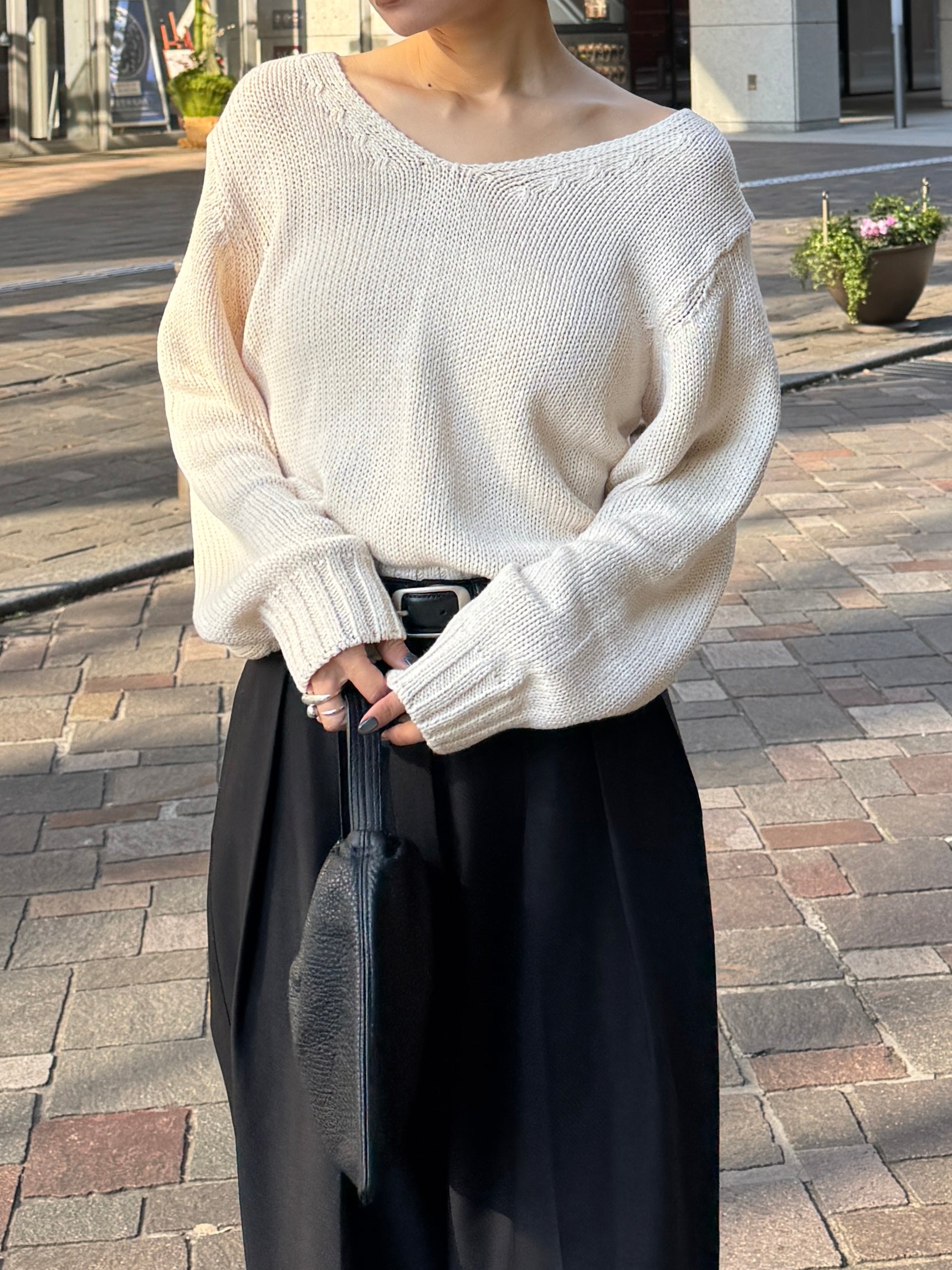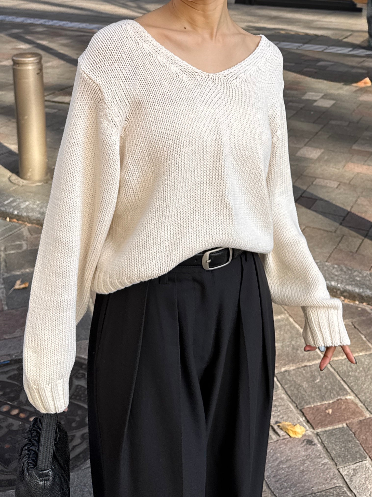 首元は開きすぎない絶妙なVネックラインで、デコルテをきれいに見せつつ上品な抜け感をプラスしてくれます◎