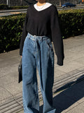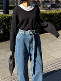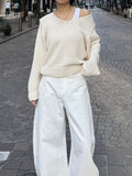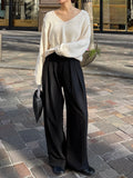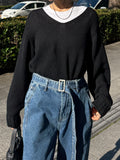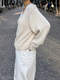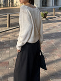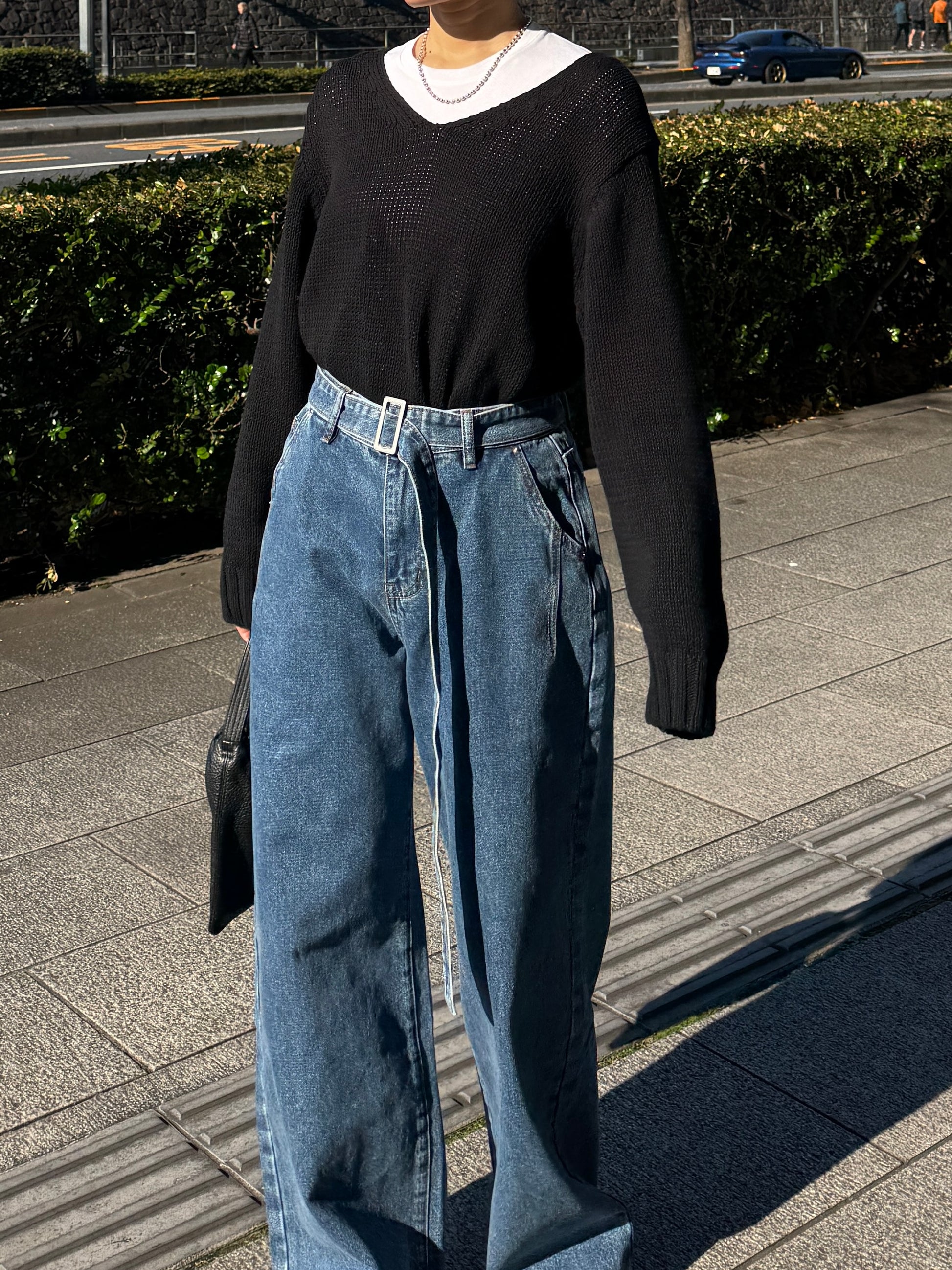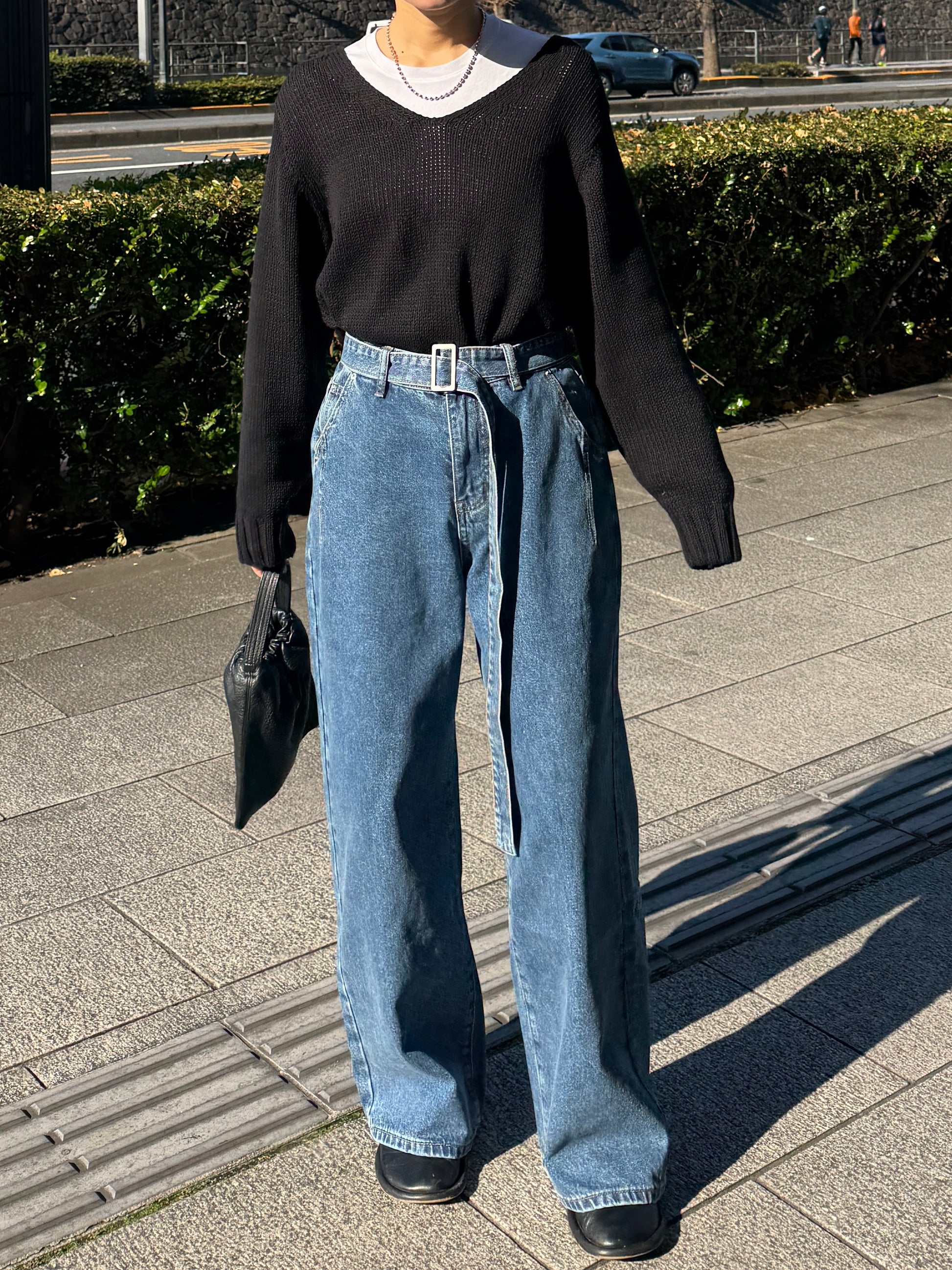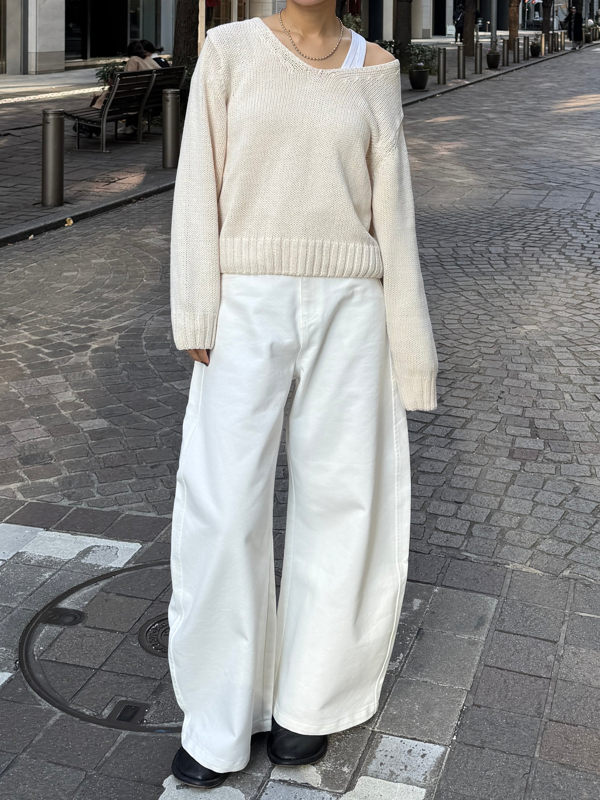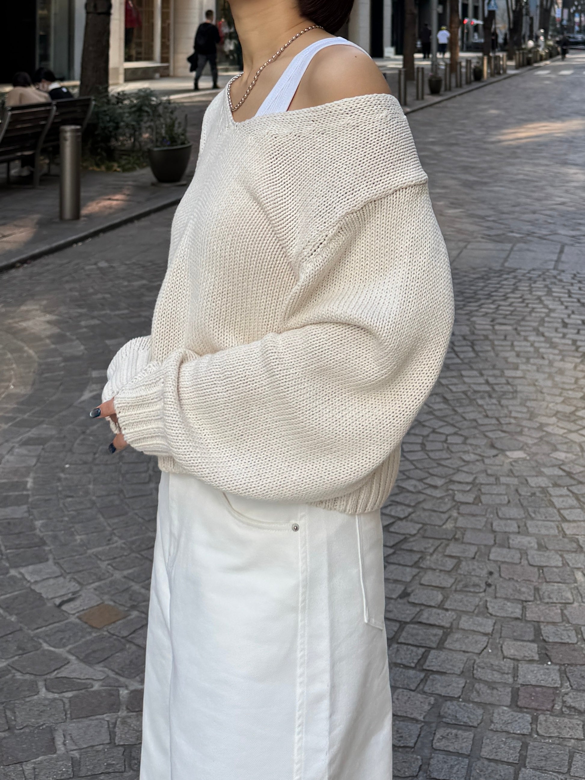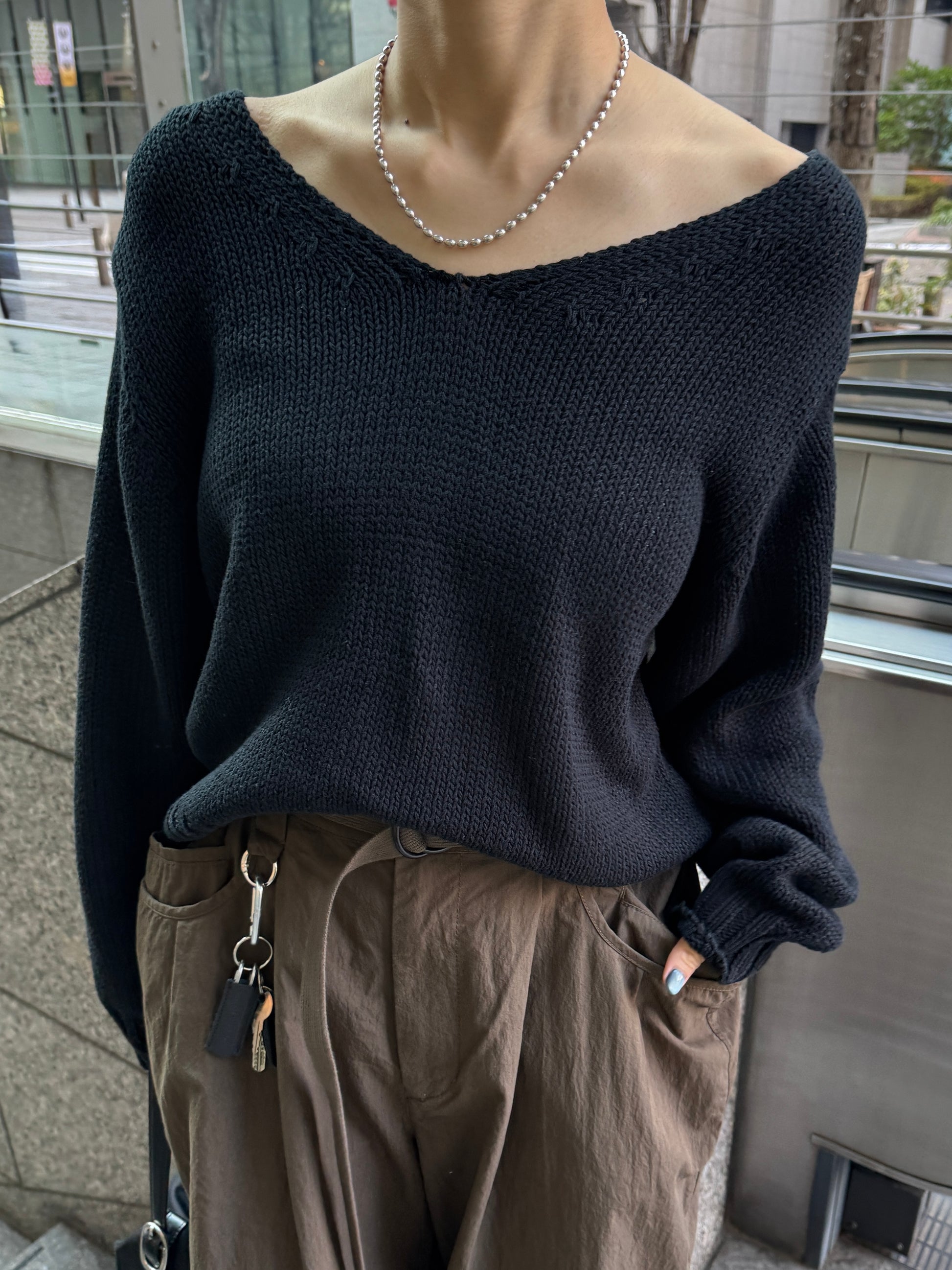 首元は開きすぎない絶妙なVネックラインで、デコルテをきれいに見せつつ上品な抜け感をプラスしてくれます◎
