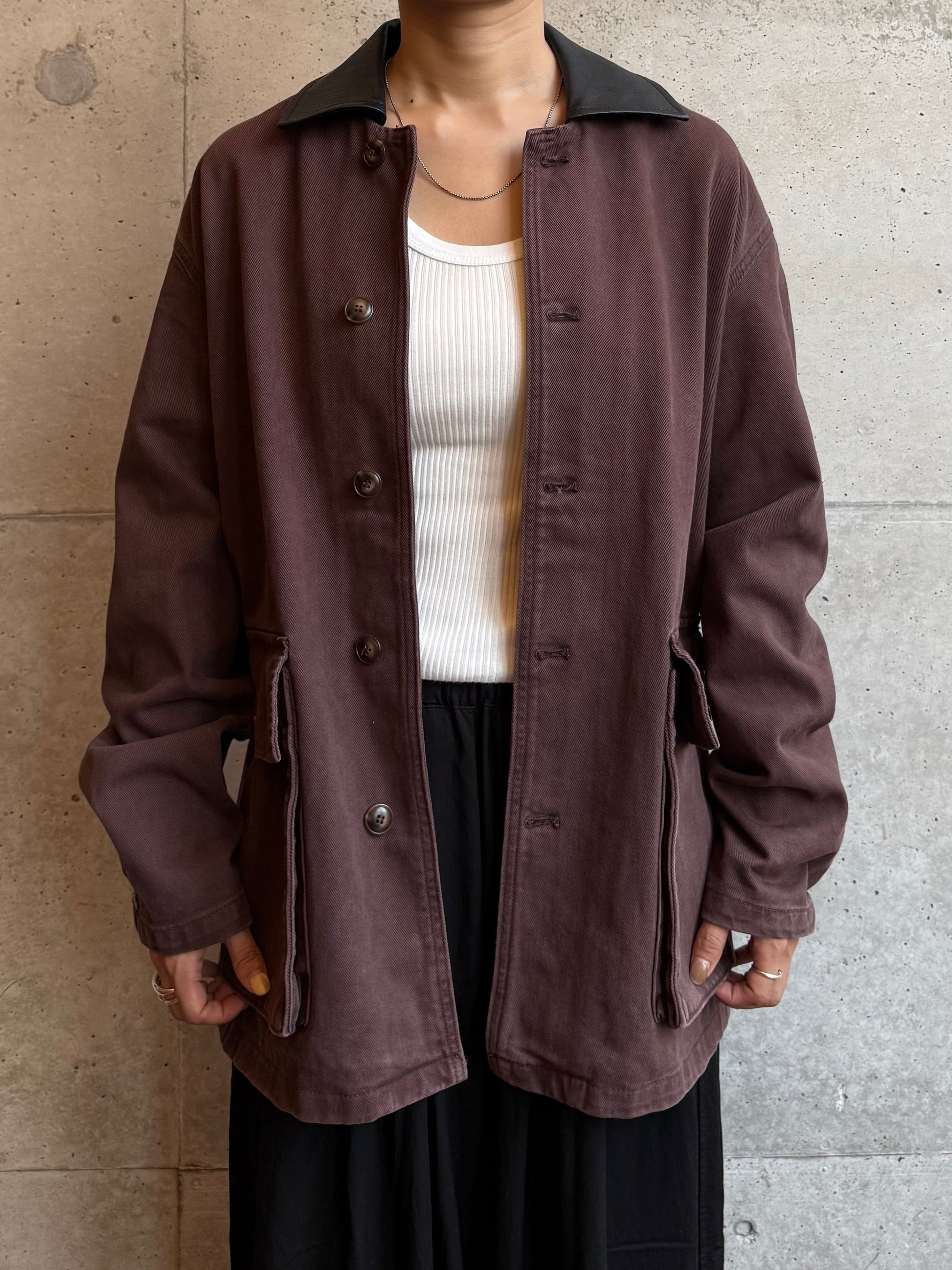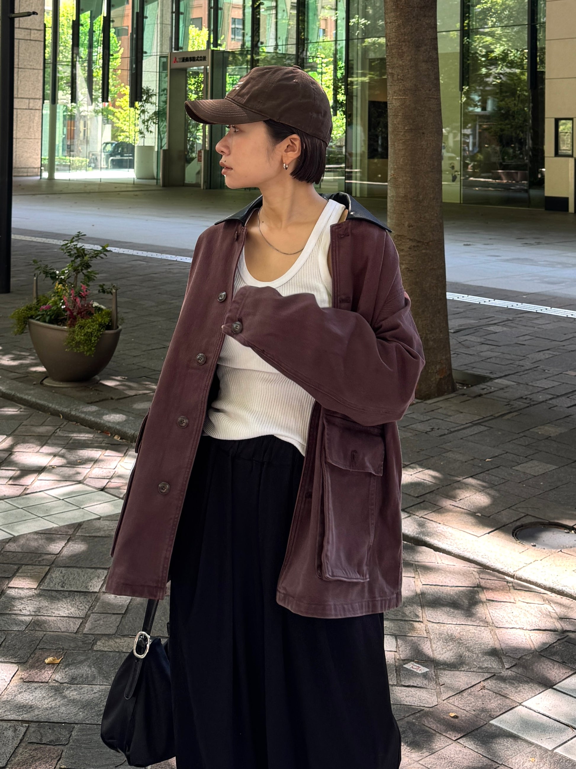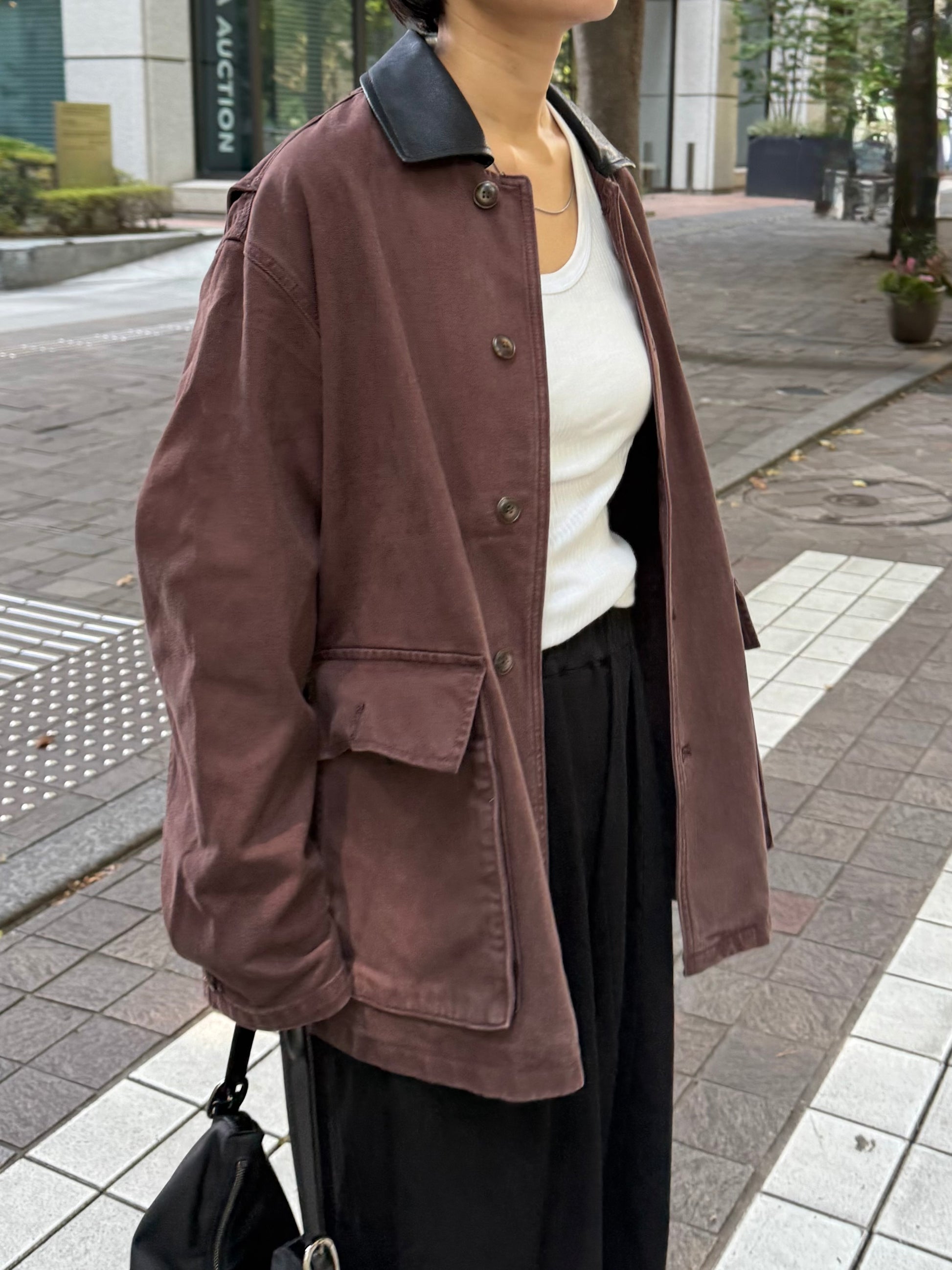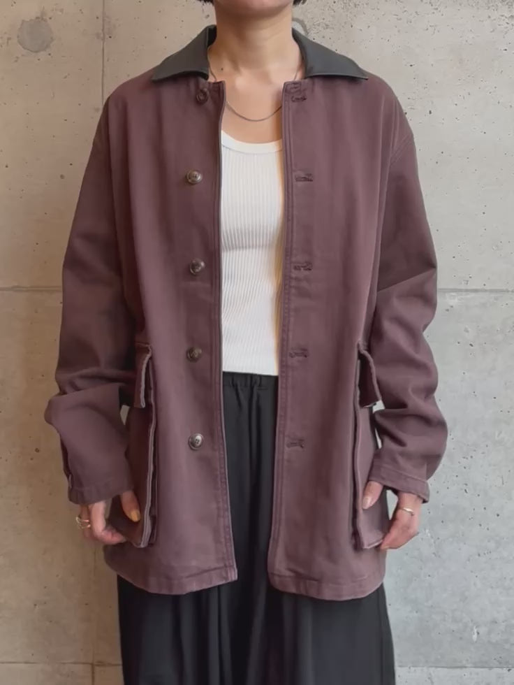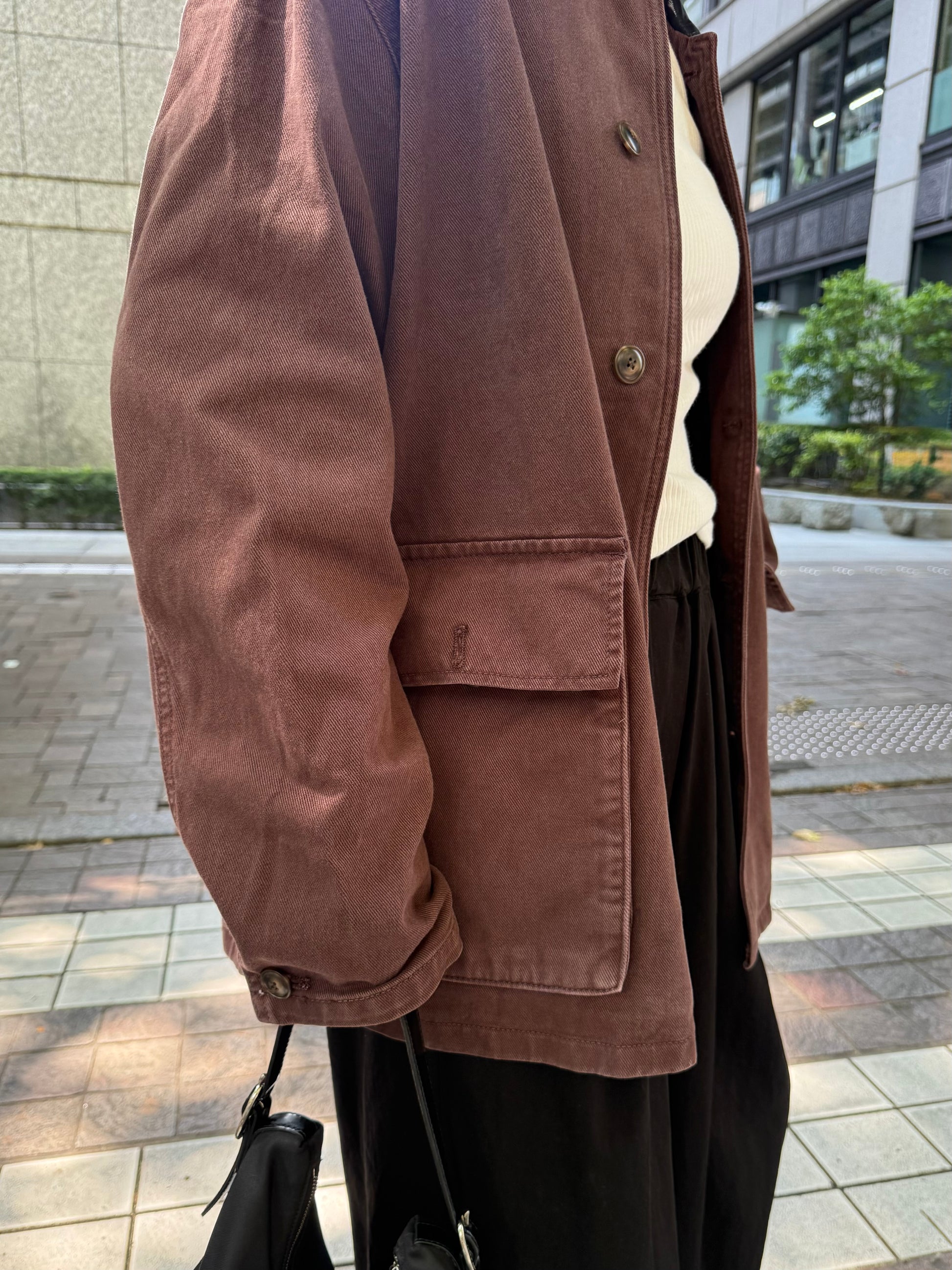ワードローブで長く愛用できるハンティングジャケットにused感を加え、シンプルながら存在感ある1枚に。 程よくウォッシュのかかった風合いが大人のこなれた雰囲気を演出し、羽織るだけでスタイリングを格上げしてくれます。 軽やかなコットン素材は季節の変わり目にさらりと羽織るのはもちろん、 ゆとりあるサイズ感設定の為スウェットやニットとのレイヤードもお楽しみいただけます。 襟元のさりげない切替と大きめのポケットでアクセントをプラス。女性らしい深みがある色味も他にはない魅力の1着。