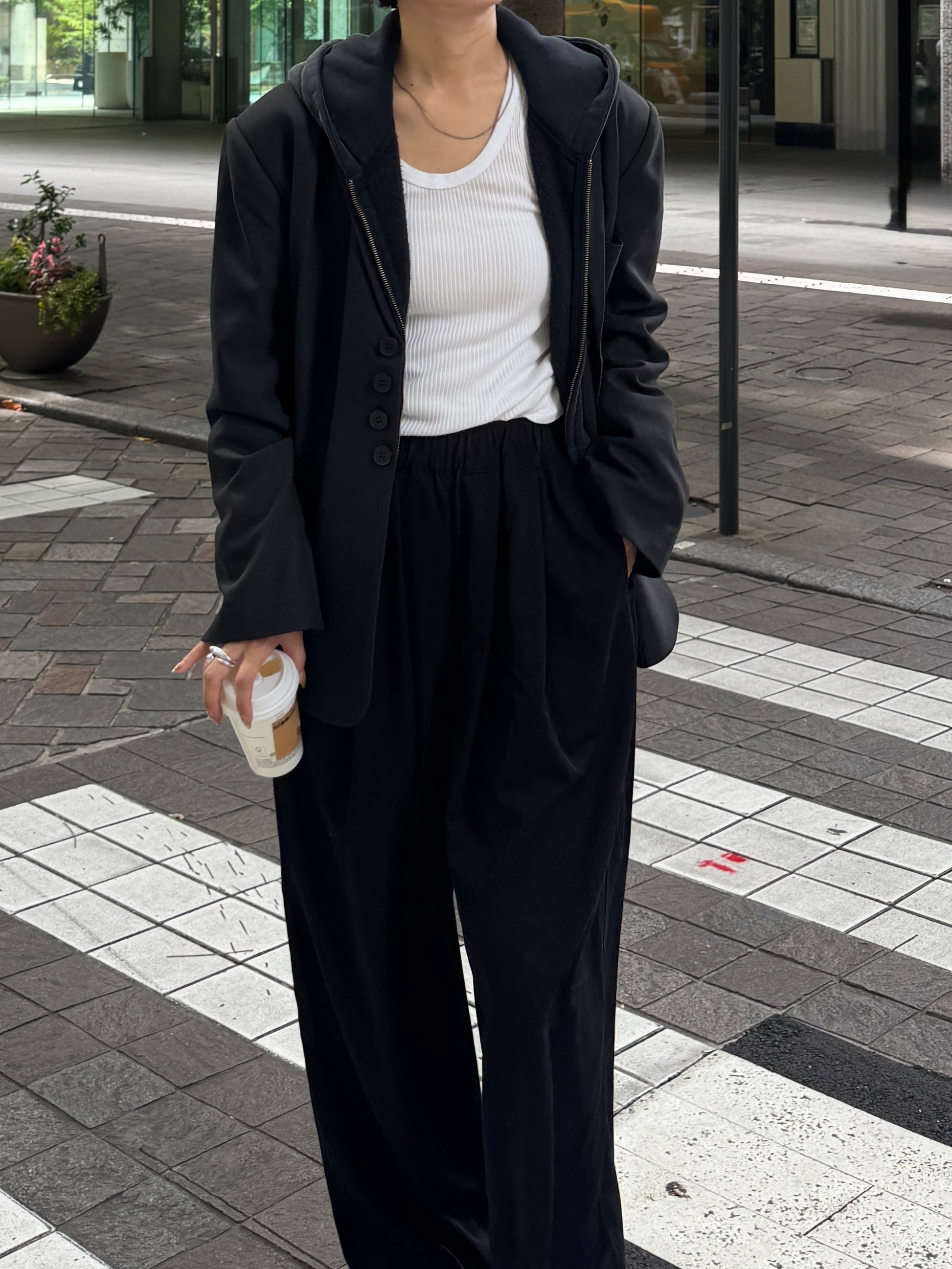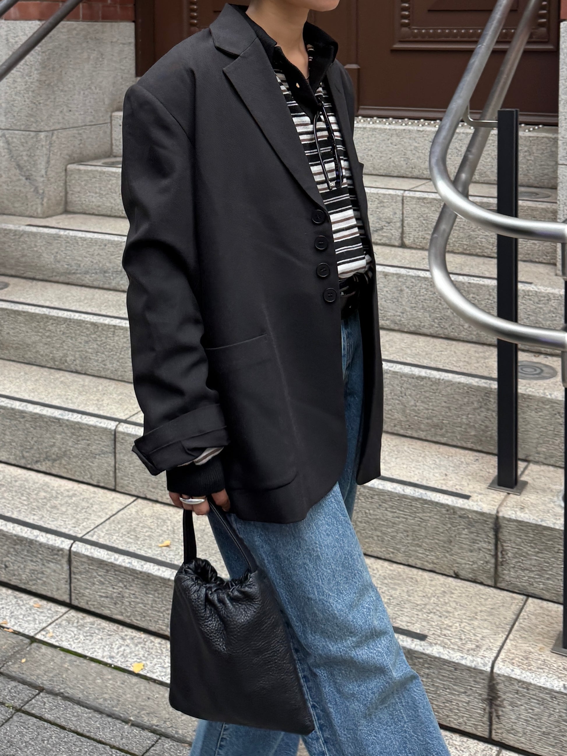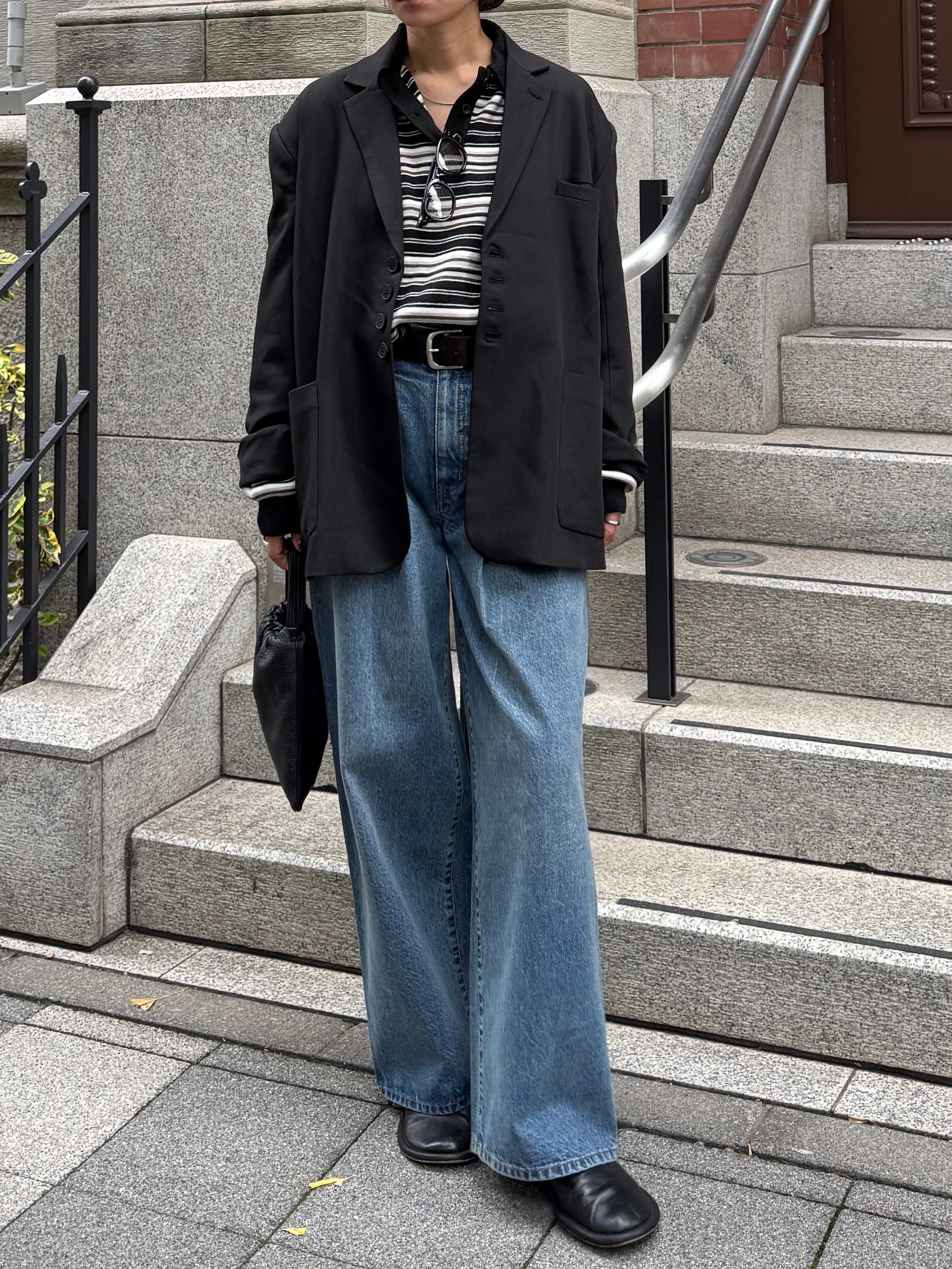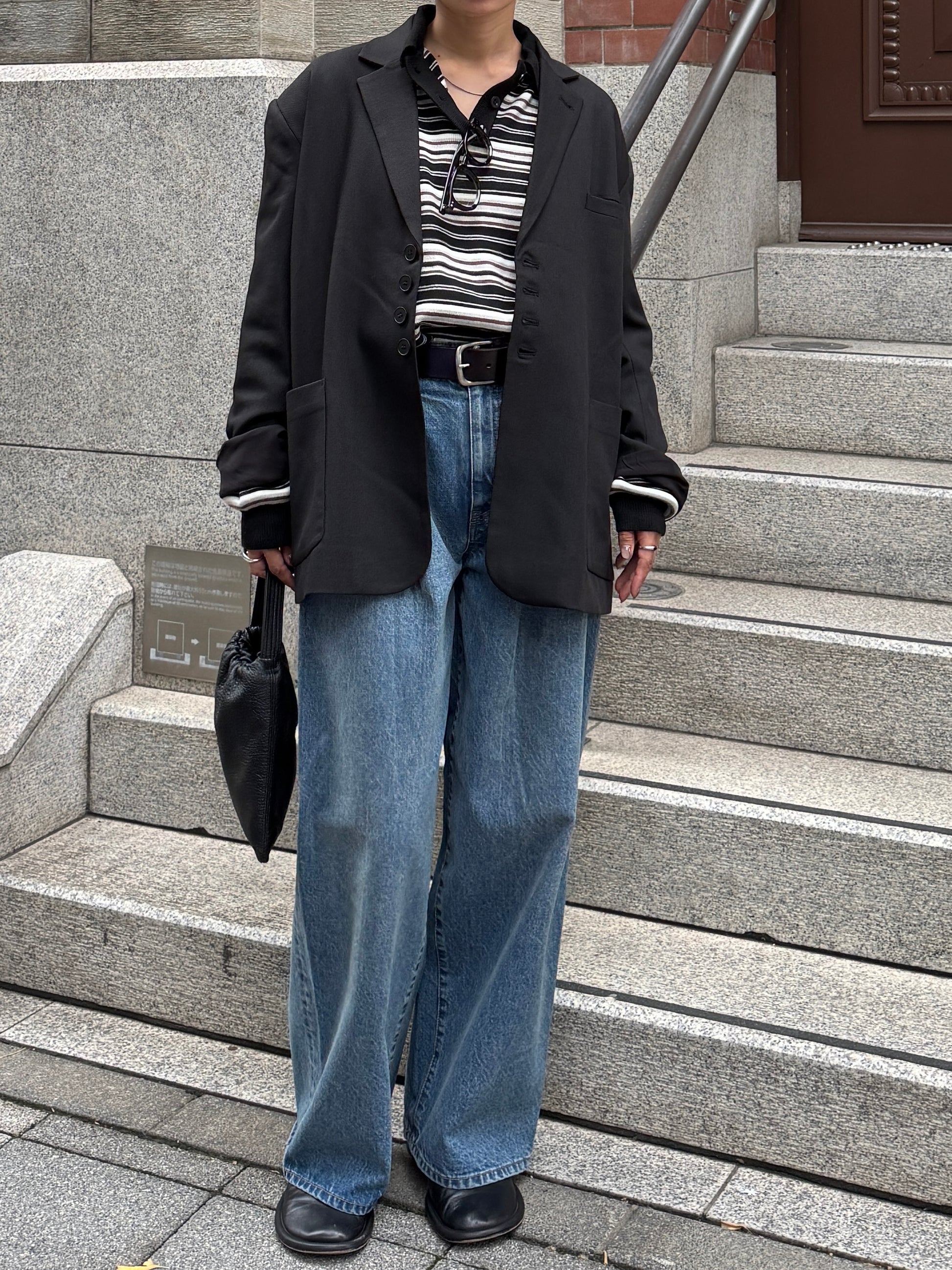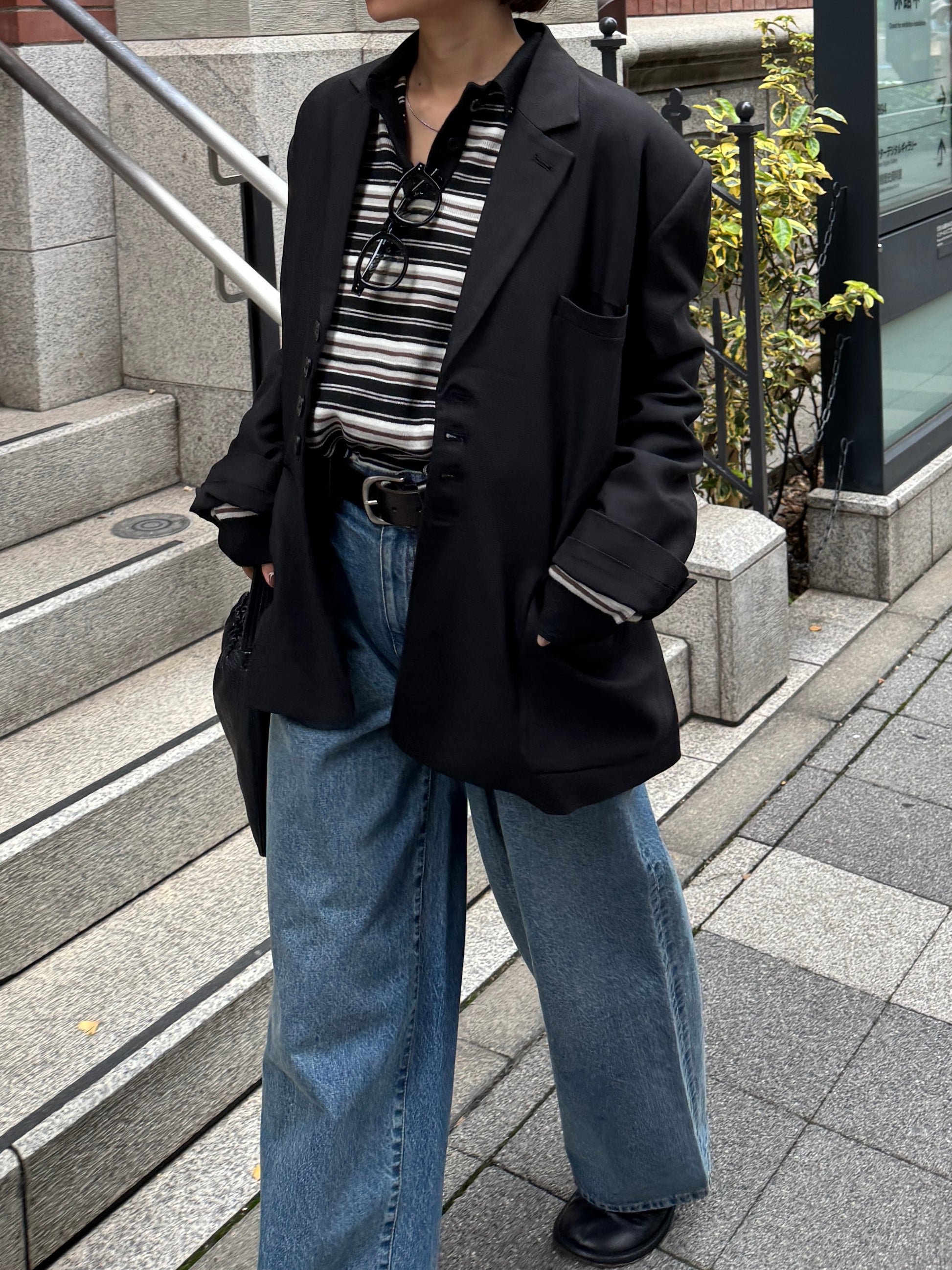上質でマニッシュな印象のテーラードジャケット。 オーバーショルダーや襟のシルエット、中央ボタンのバランスなど細部にまでこだわりの詰まったアイテムです。 落ち感のある素材感を採用し、着用した時のシルエットが綺麗に見えるよう仕立てました。 Double Tuck TrousersとのSET UP着用もおすすめですが、シンプルなトップスやデニムなどカジュアルに落とし込んでも馴染み良く、 合わせるだけで普段のスタイリングをアップデートしてくれます。