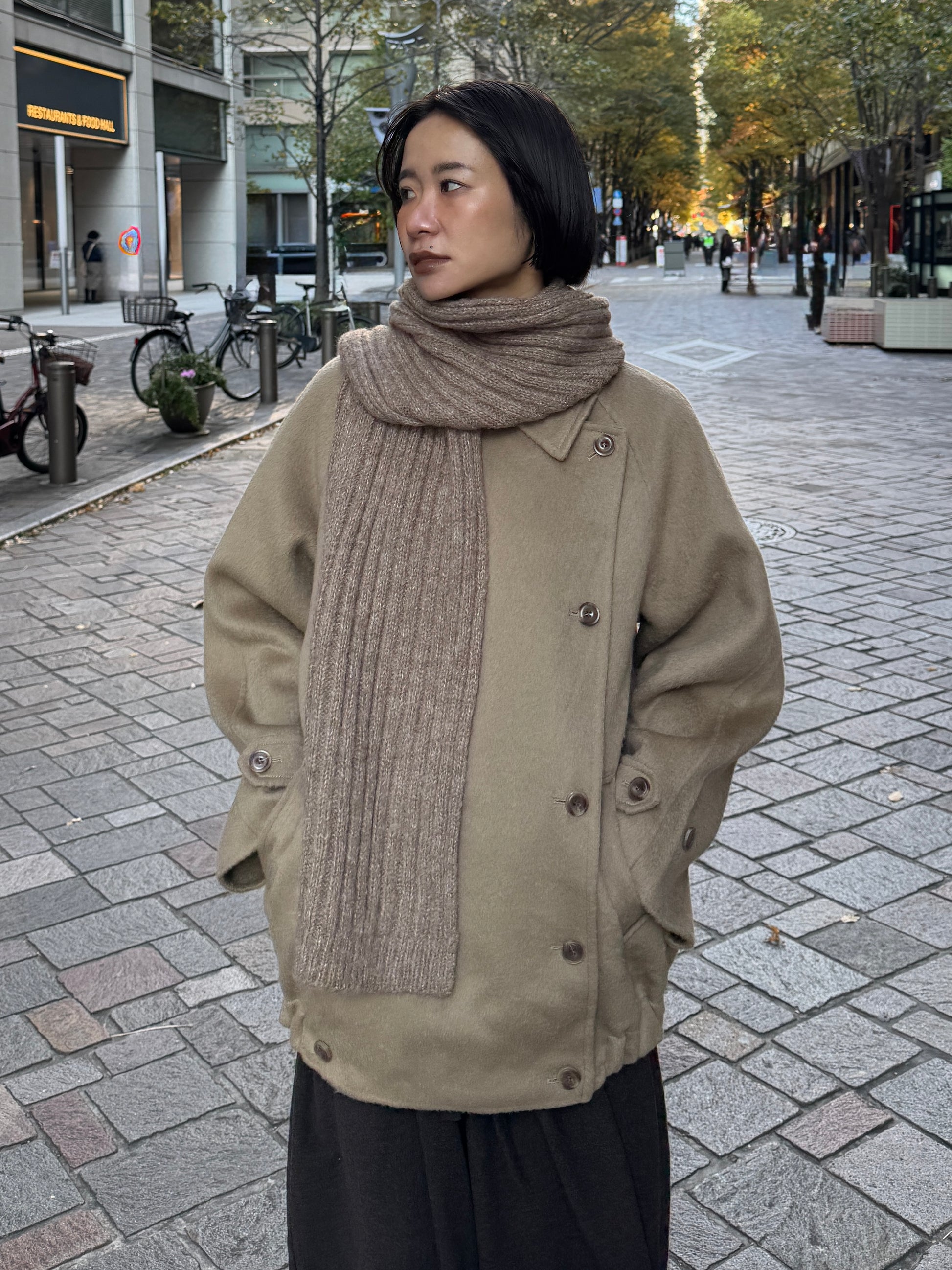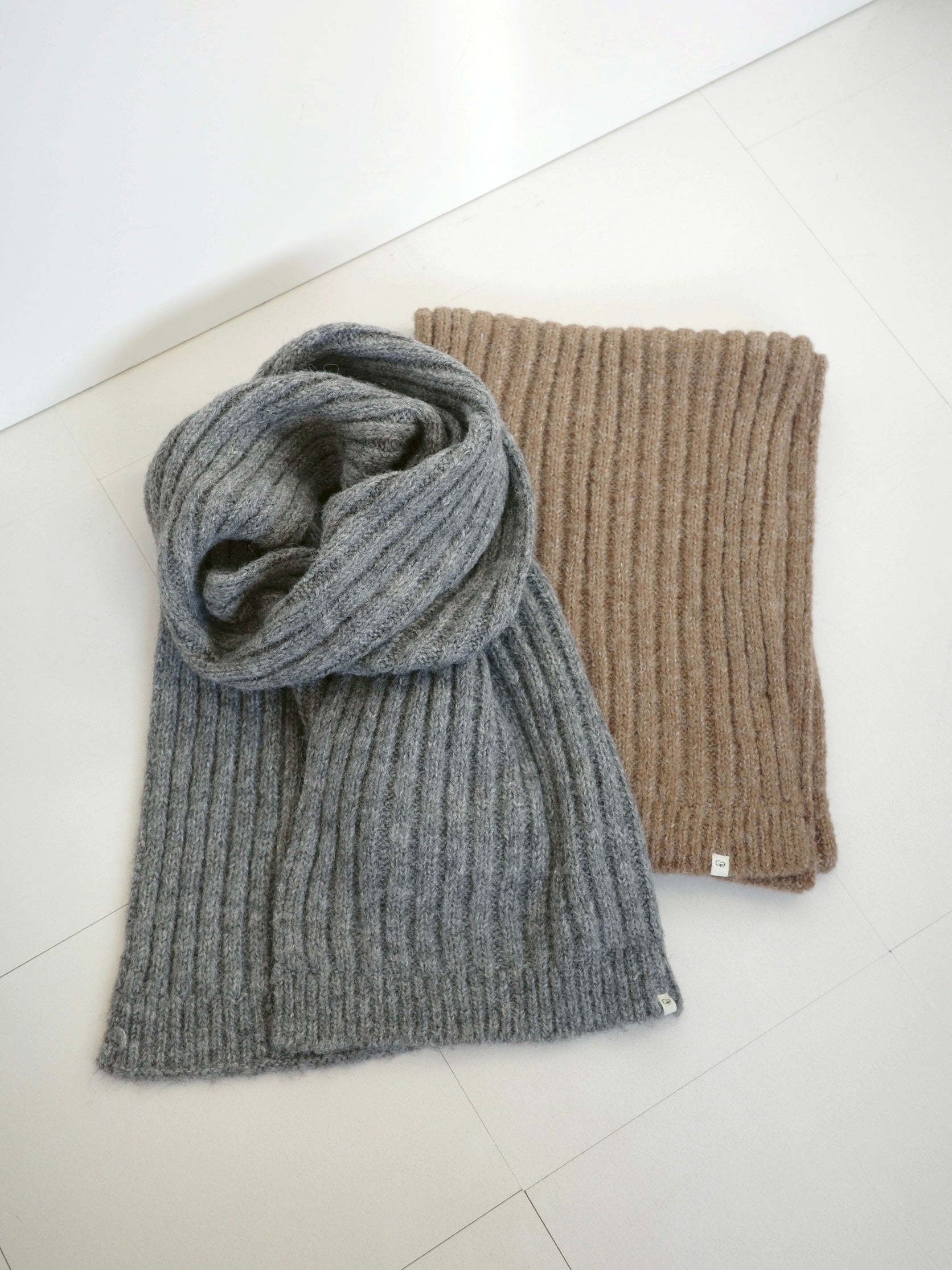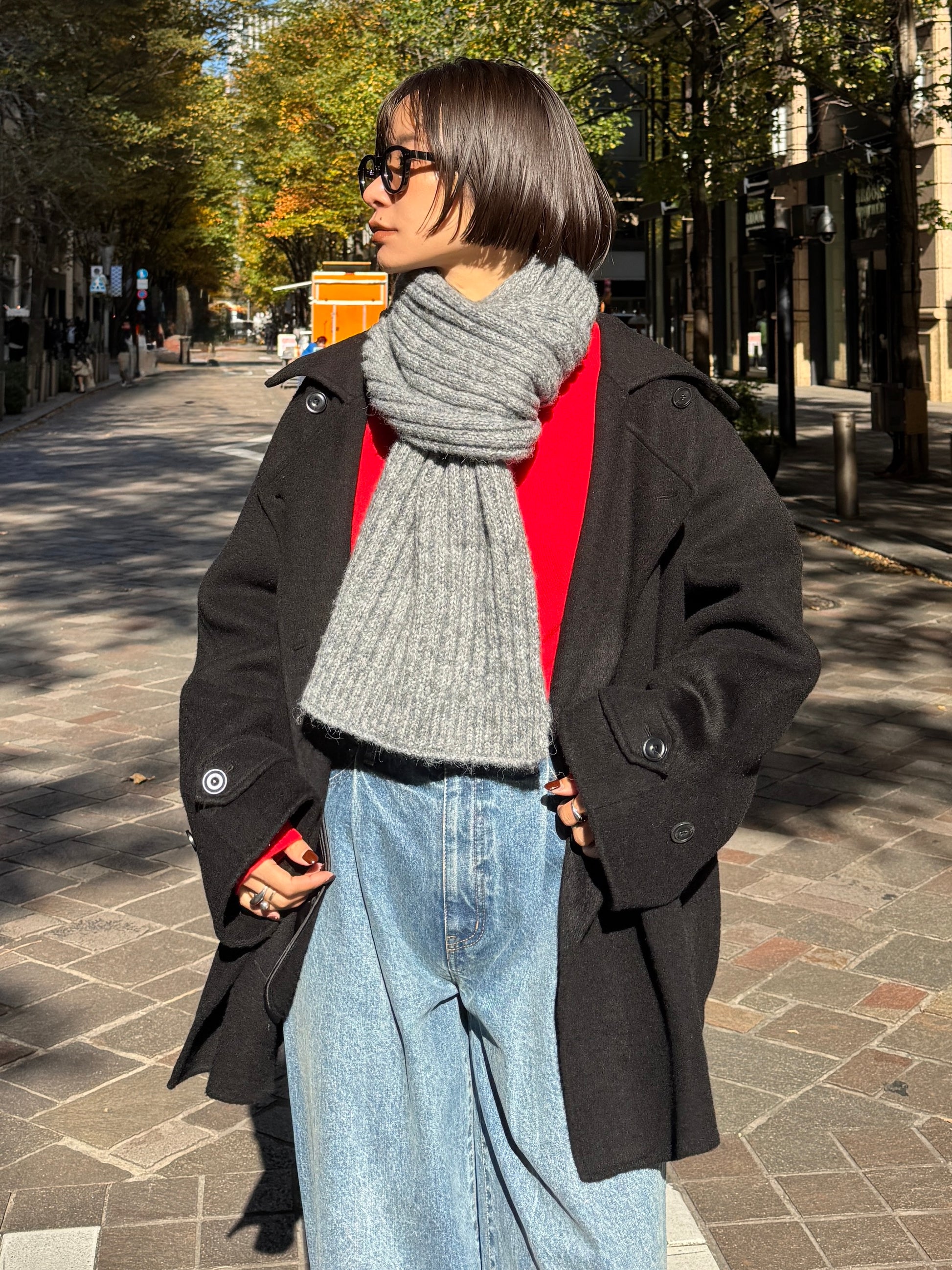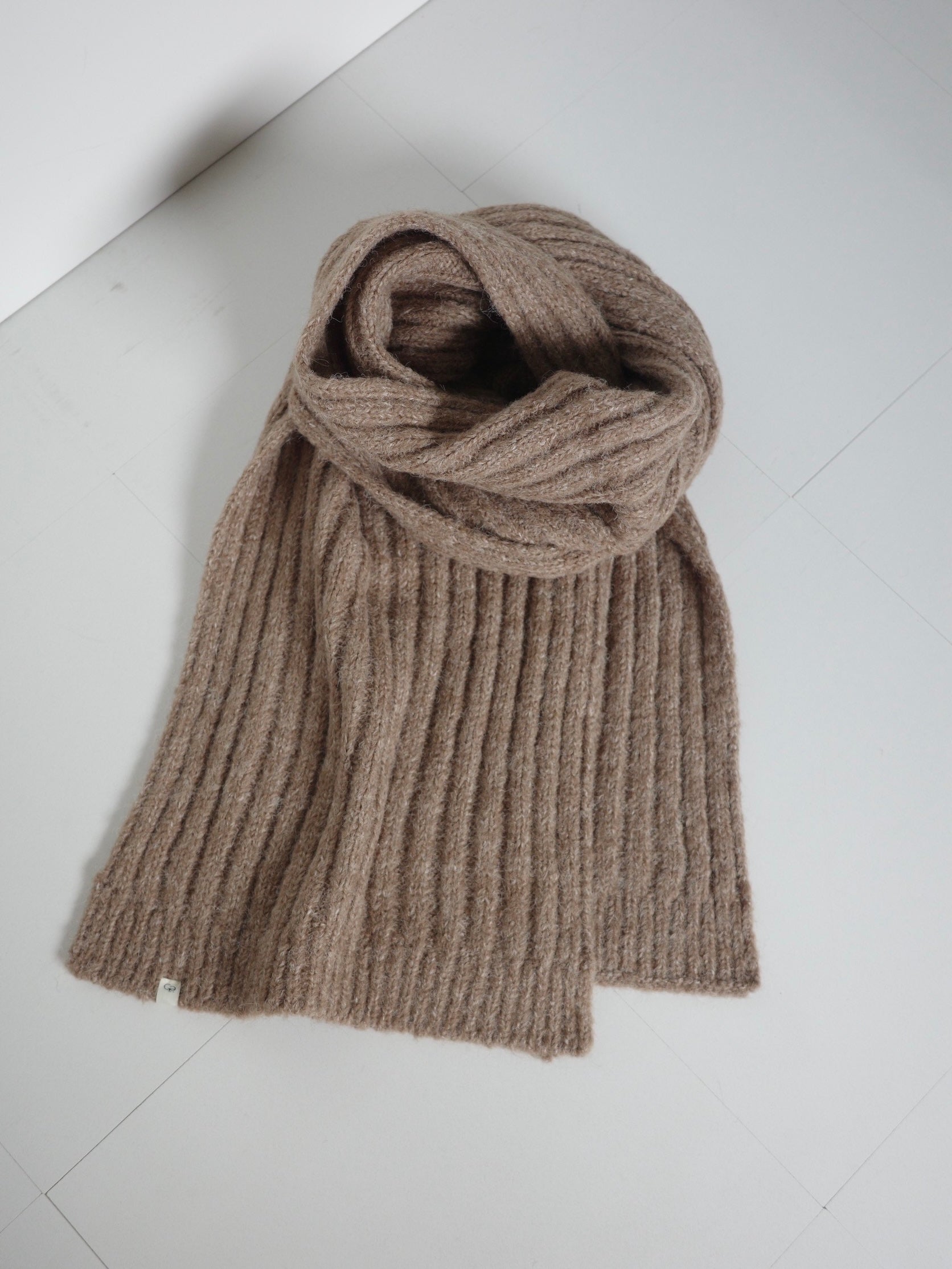 ふんわりと柔らかいタッチが魅力のリブ編みマフラー。 ポリエステル・アクリルの素材で、ウール特有のちくちく感なく 素肌に触れてもストレスを感じにくい快適なつけ心地に仕上げました。 程よくボリュームのある畦編みは、首元に巻くだけで自然と立体感が生まれ、シンプルなスタイリングにもこなれた雰囲気をプラス。 ロング丈で巻き方のアレンジがしやすく、ラフにひと巻きして垂らすだけでもバランス良く決まります。 防寒としての暖かさはもちろん、冬の着こなしに表情を添えるアクセントとしても活躍する1本です。 裾にはさりげなくブランドタブを配置しミニマルなデザインの中に、上質さを感じさせるディティールに。