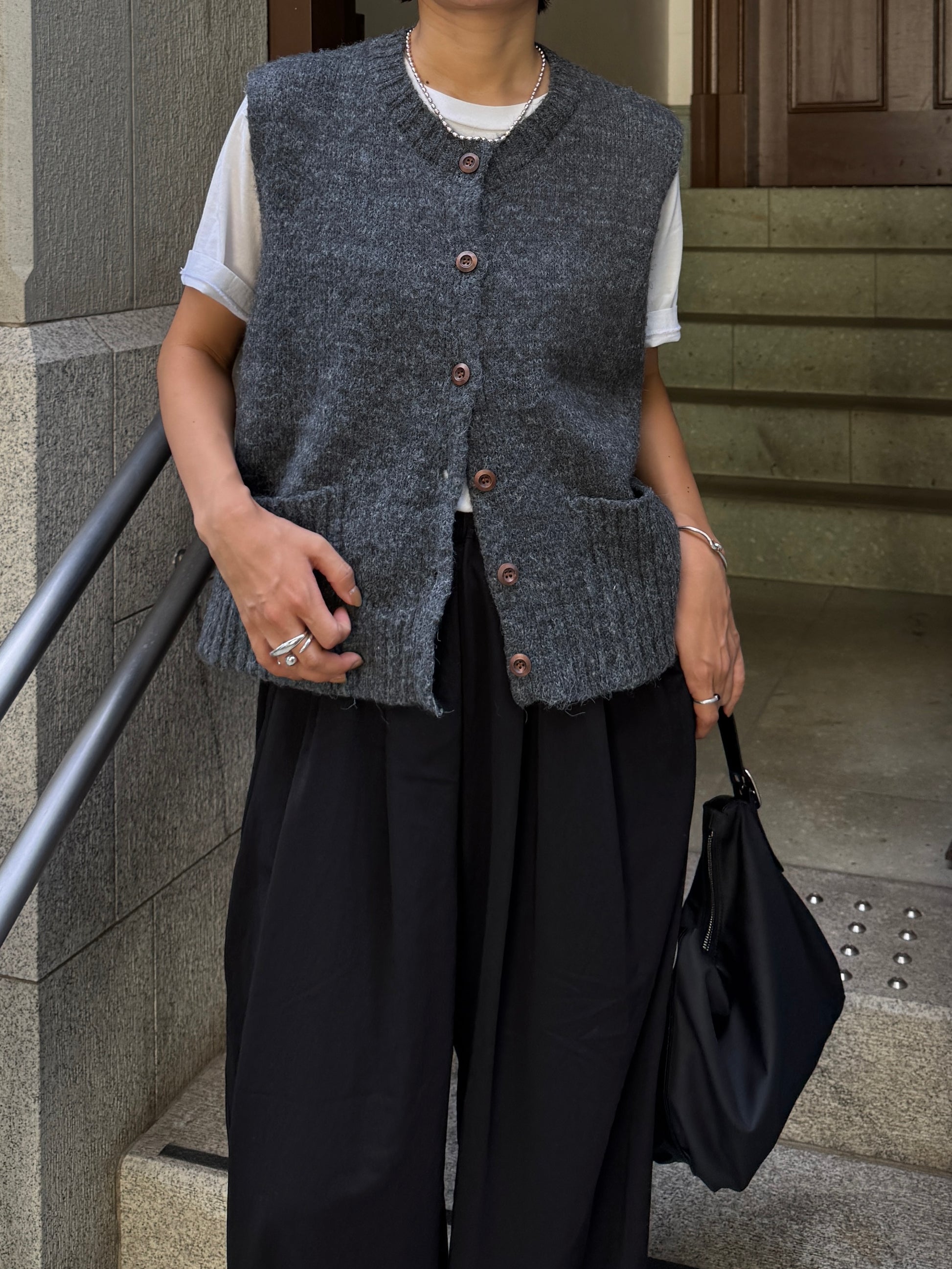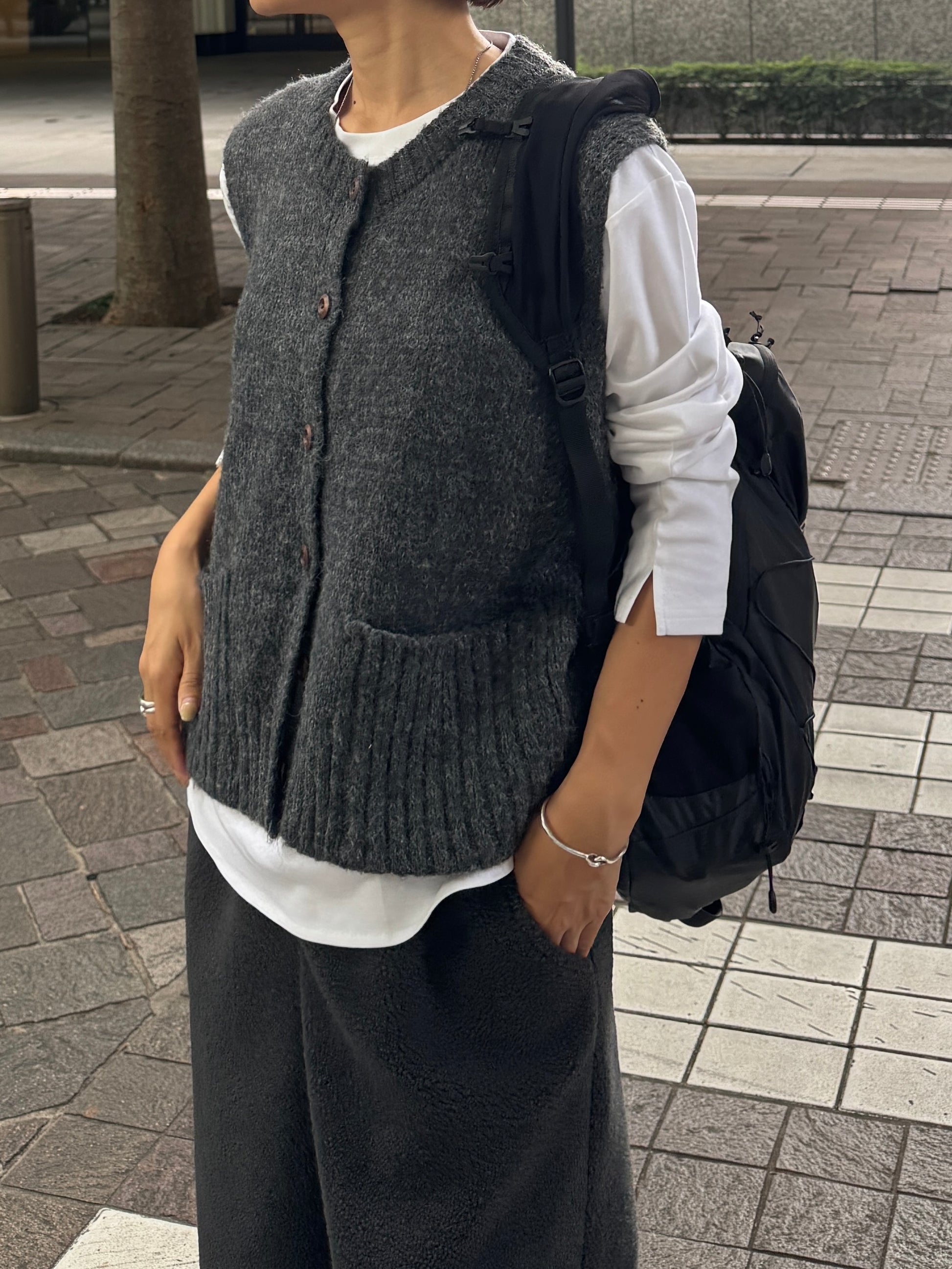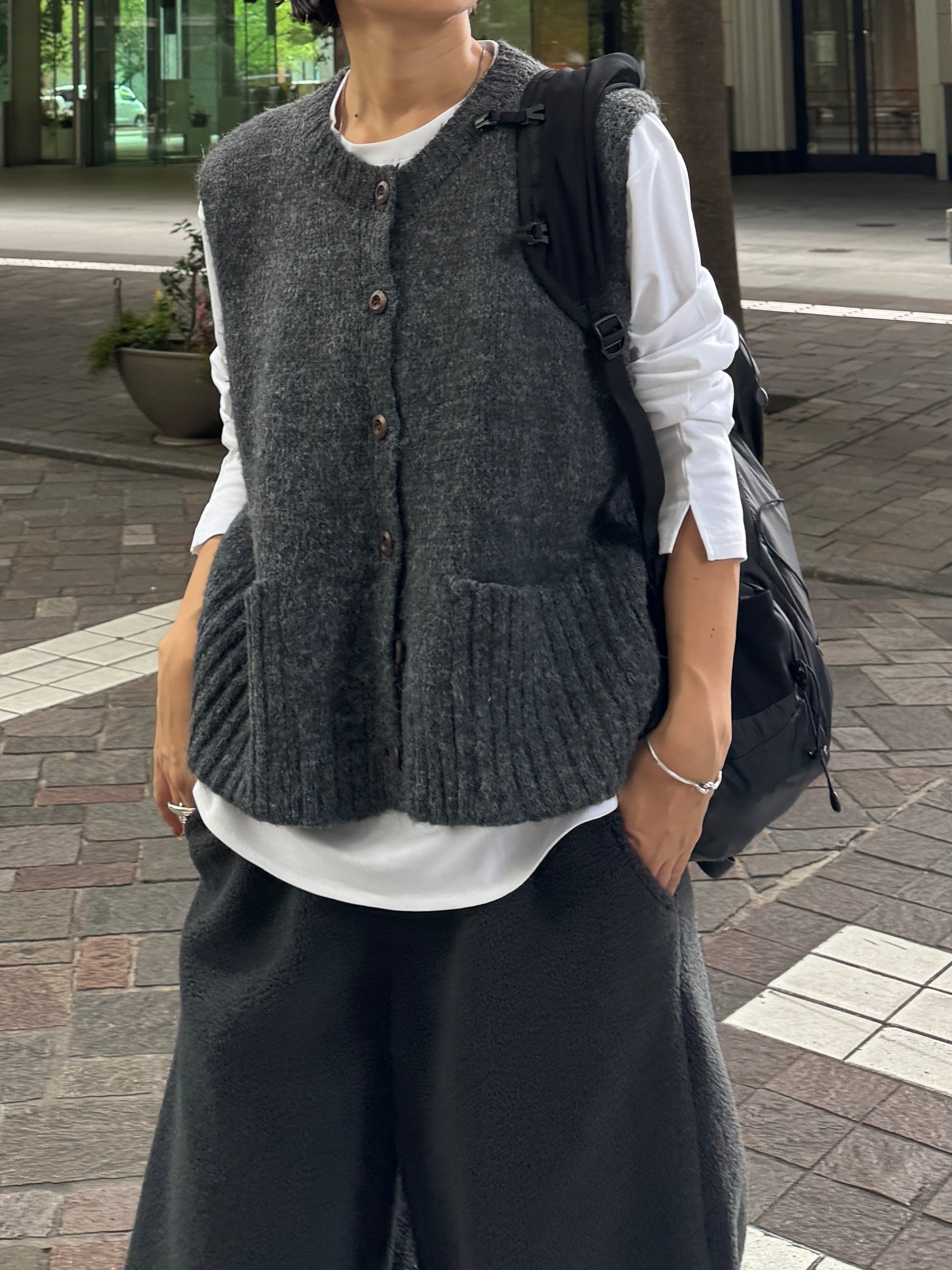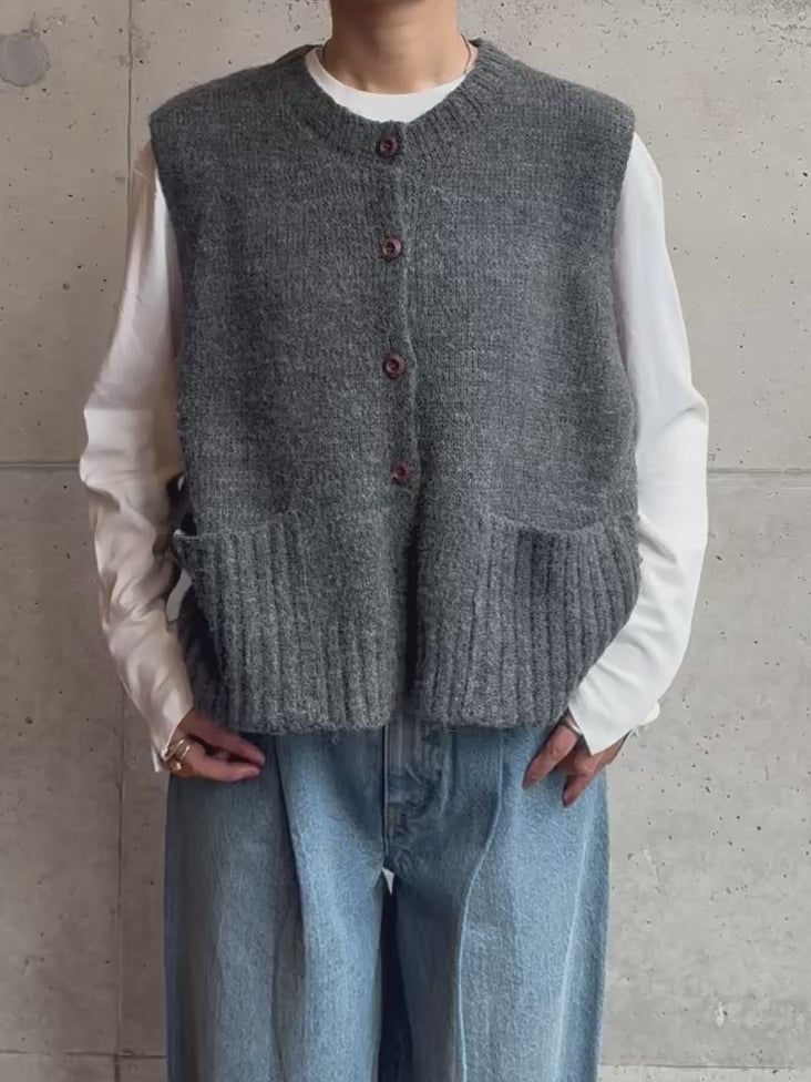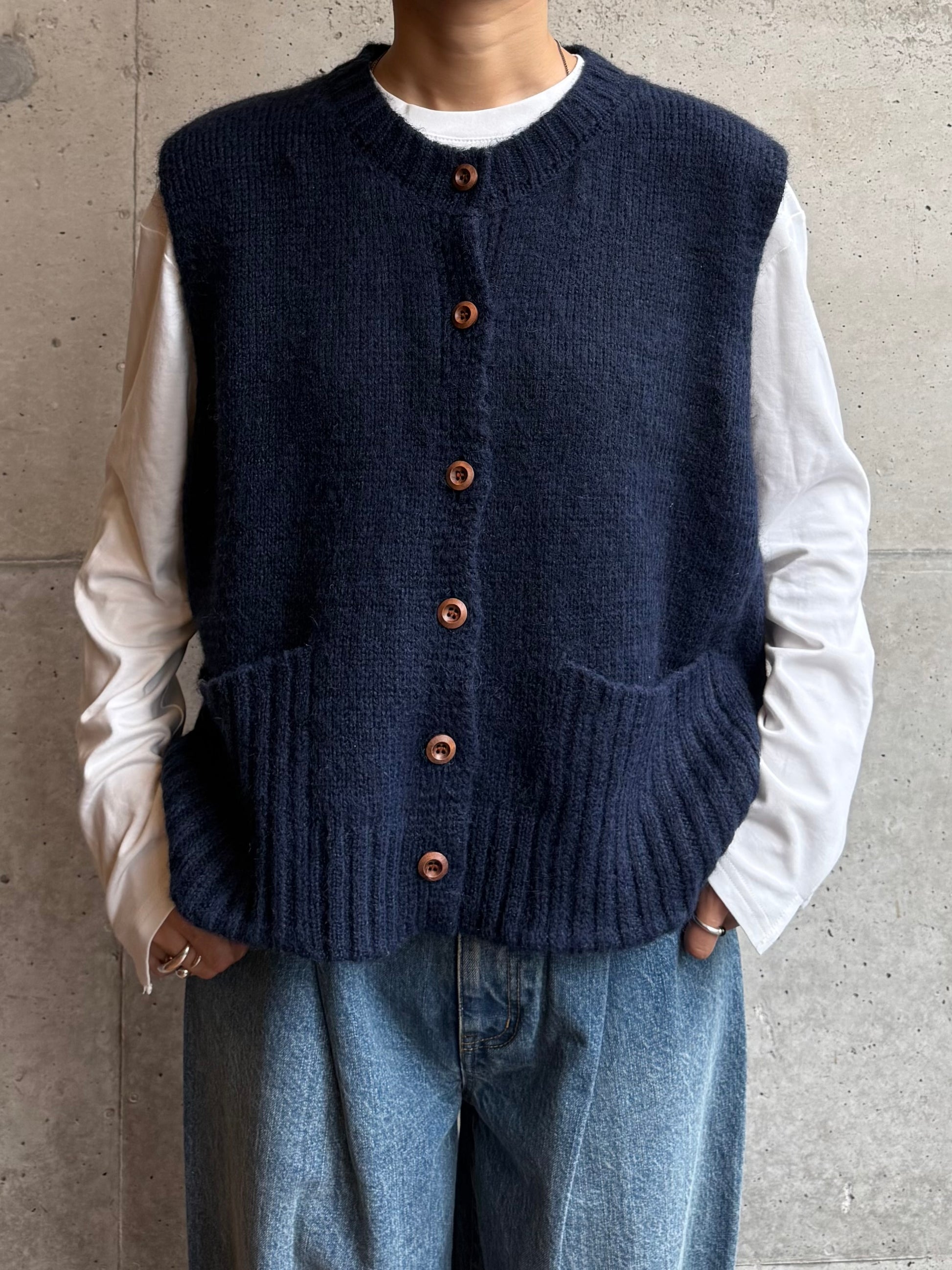 シンプルでありながら奥行きのある表情を楽しめるニットベスト。 フロントには温もりを添えるウッド調ボタンを施し、 リブ仕様がポイントのポケットにはさりげなくブランドタブを加えアクセントを。 アームホールは程よくゆとりを持たせている為カジュアルにカットソーとの合わせはもちろん、 シャツやワンピースなど様々なインナーとのレイヤードに抜け感をプラスしてくれる1着。 大人のワードローブに寄り添う、シーズンレスで活躍するおすすめアイテムです。