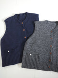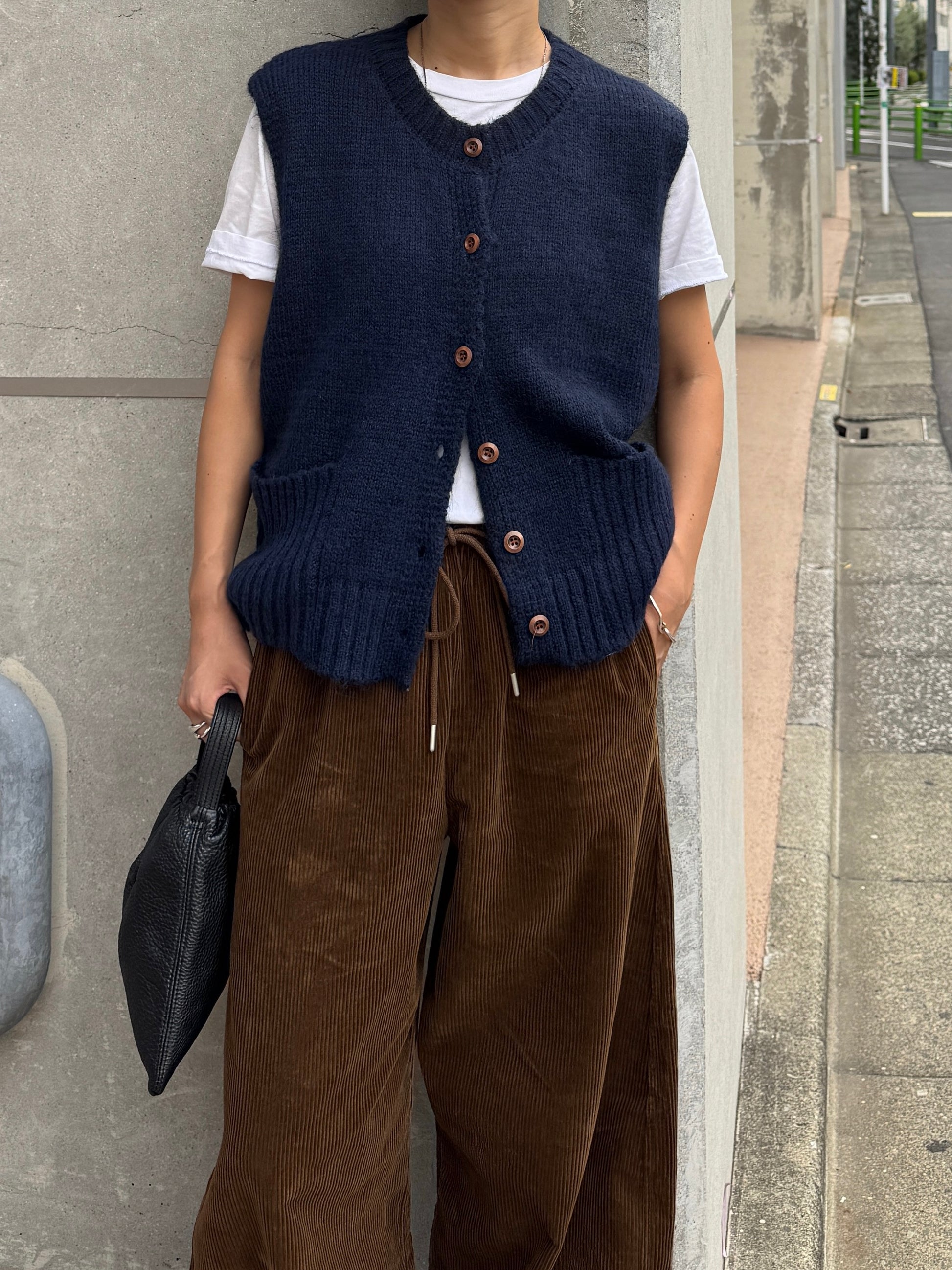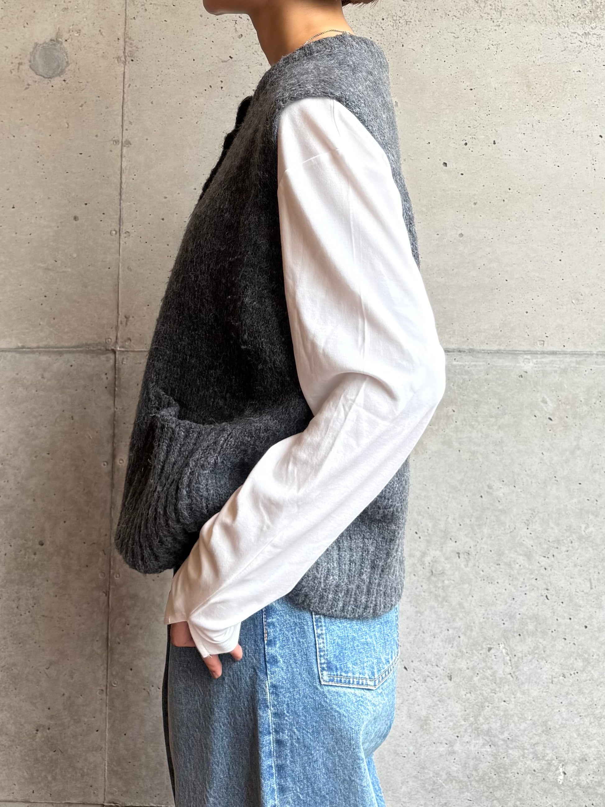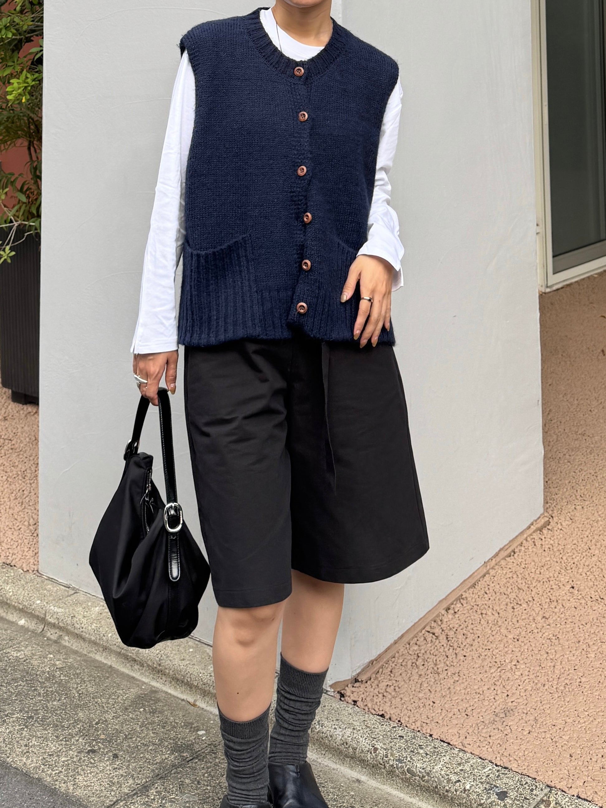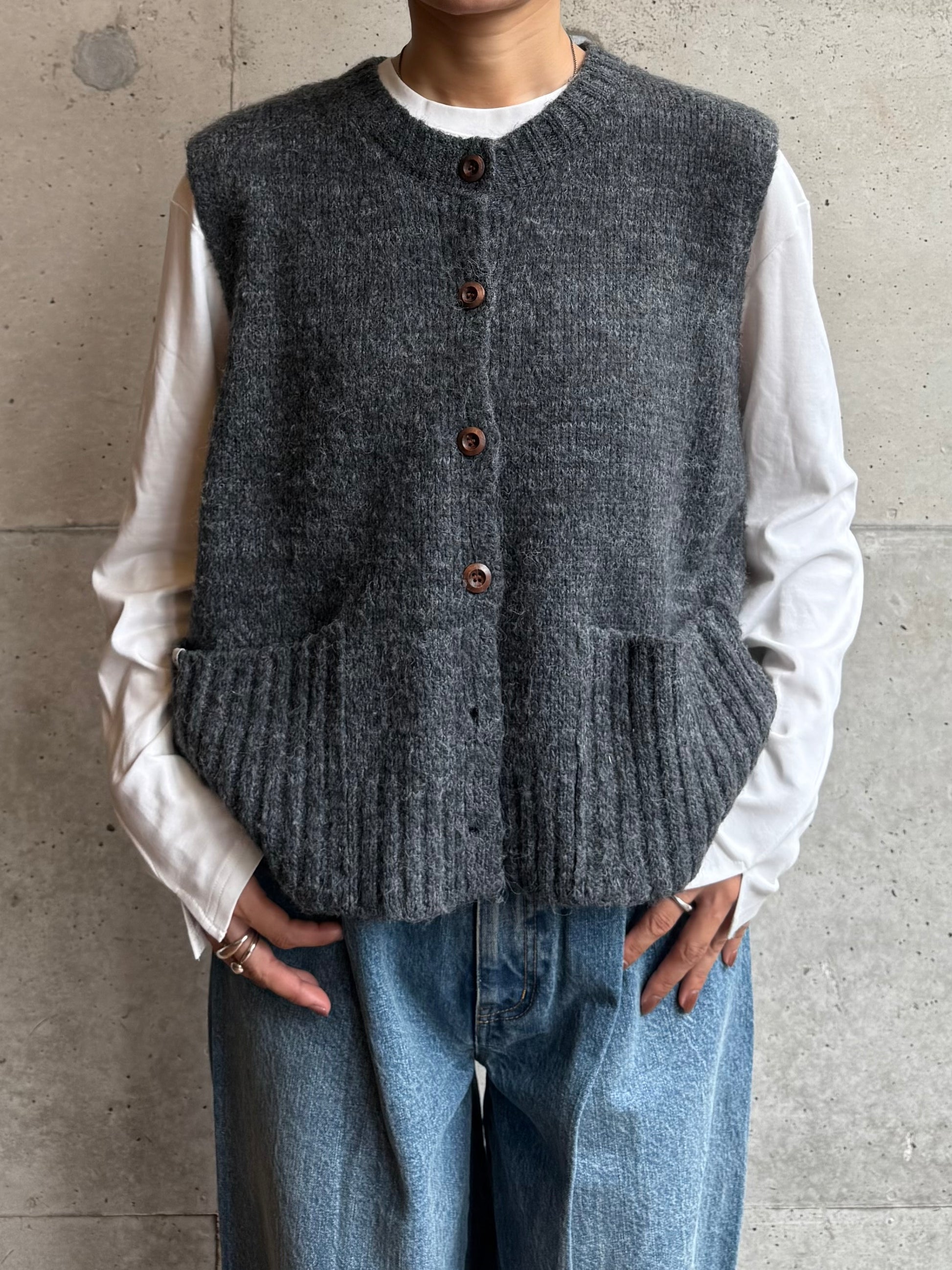 シンプルでありながら奥行きのある表情を楽しめるニットベスト。 フロントには温もりを添えるウッド調ボタンを施し、 リブ仕様がポイントのポケットにはさりげなくブランドタブを加えアクセントを。 アームホールは程よくゆとりを持たせている為カジュアルにカットソーとの合わせはもちろん、 シャツやワンピースなど様々なインナーとのレイヤードに抜け感をプラスしてくれる1着。 大人のワードローブに寄り添う、シーズンレスで活躍するおすすめアイテムです。