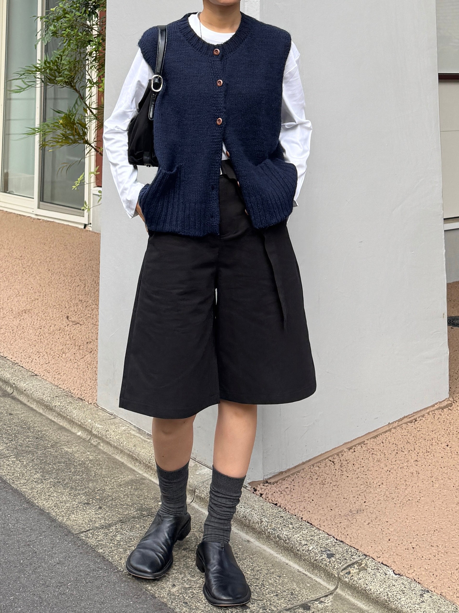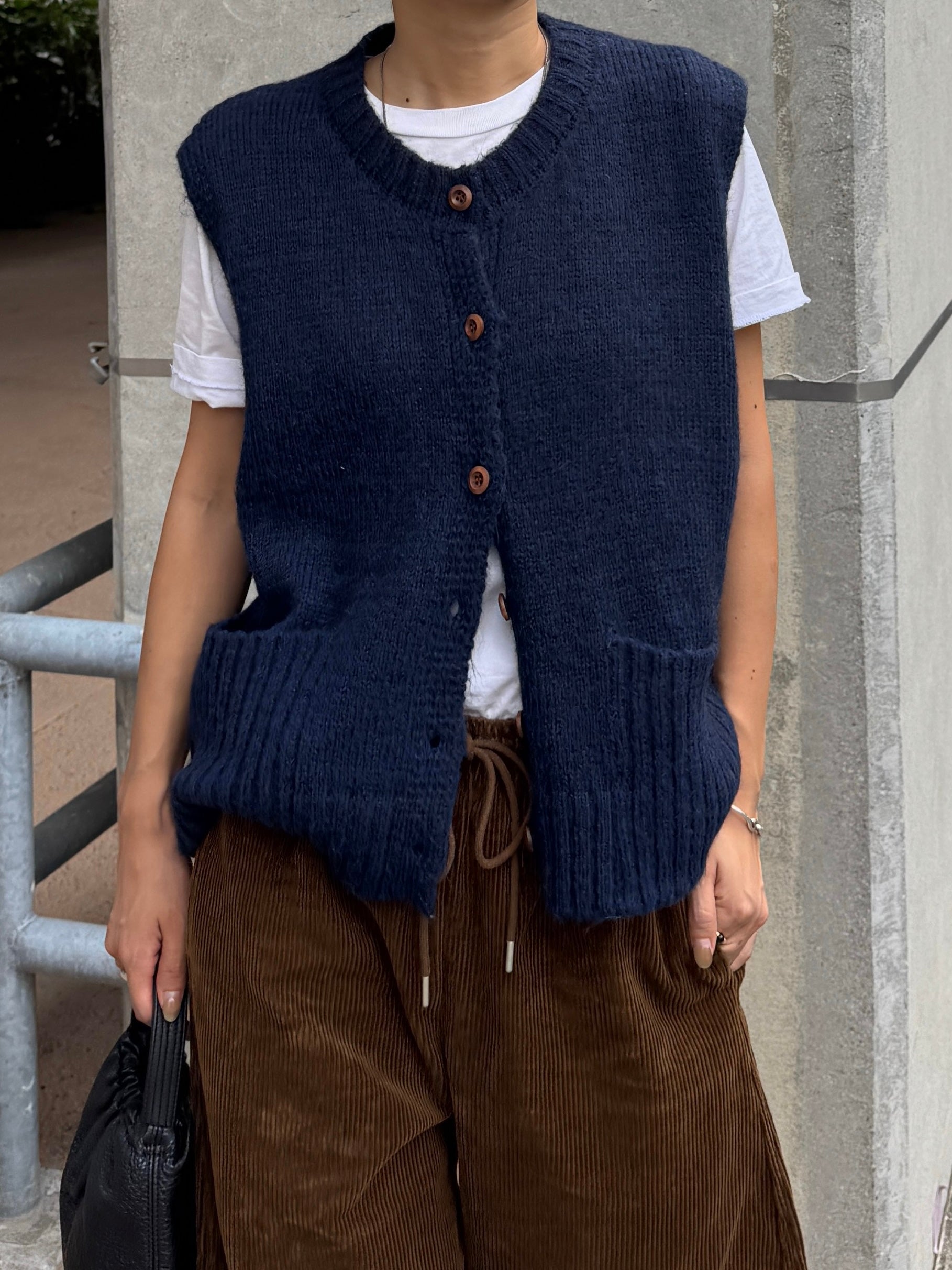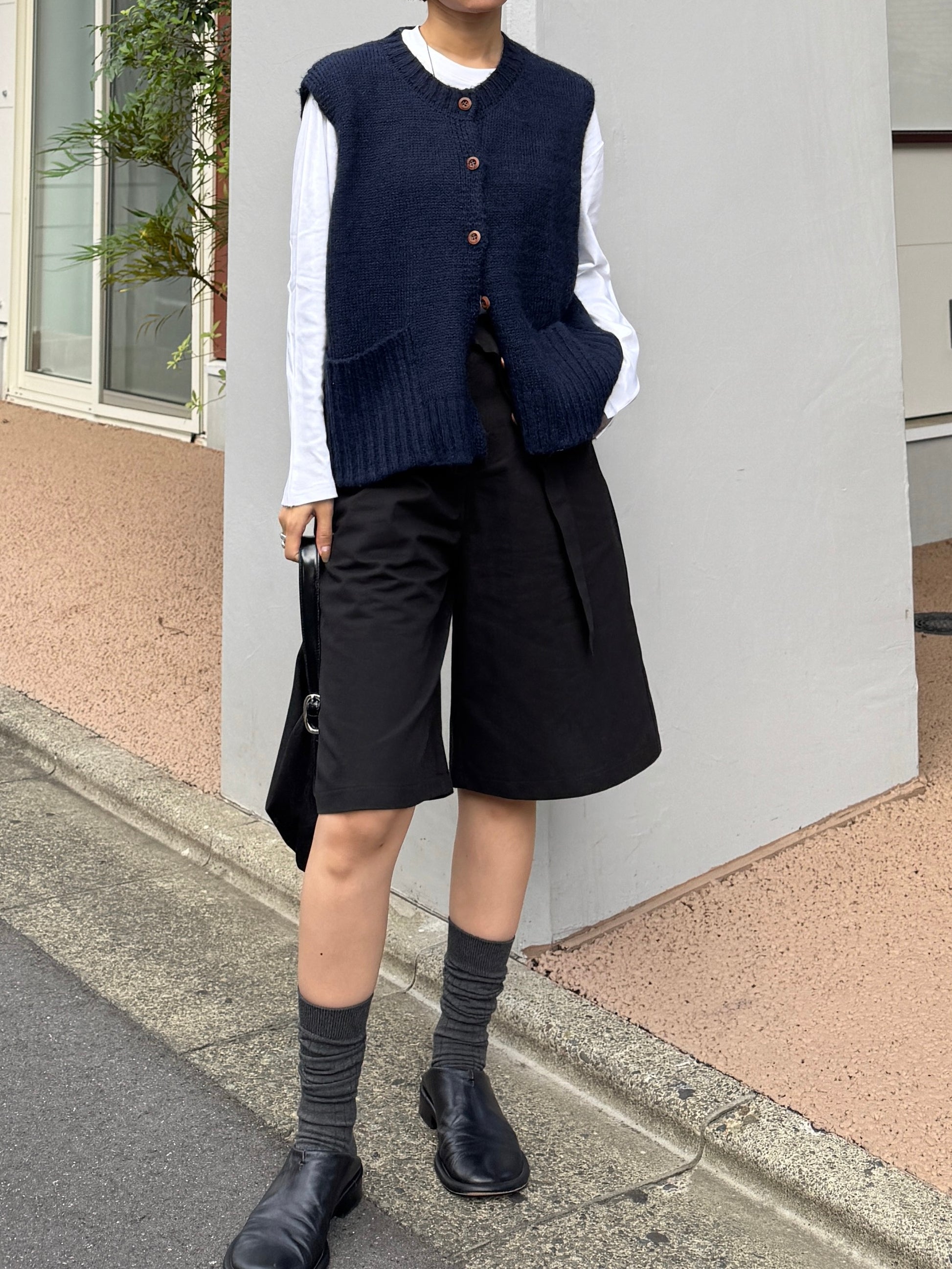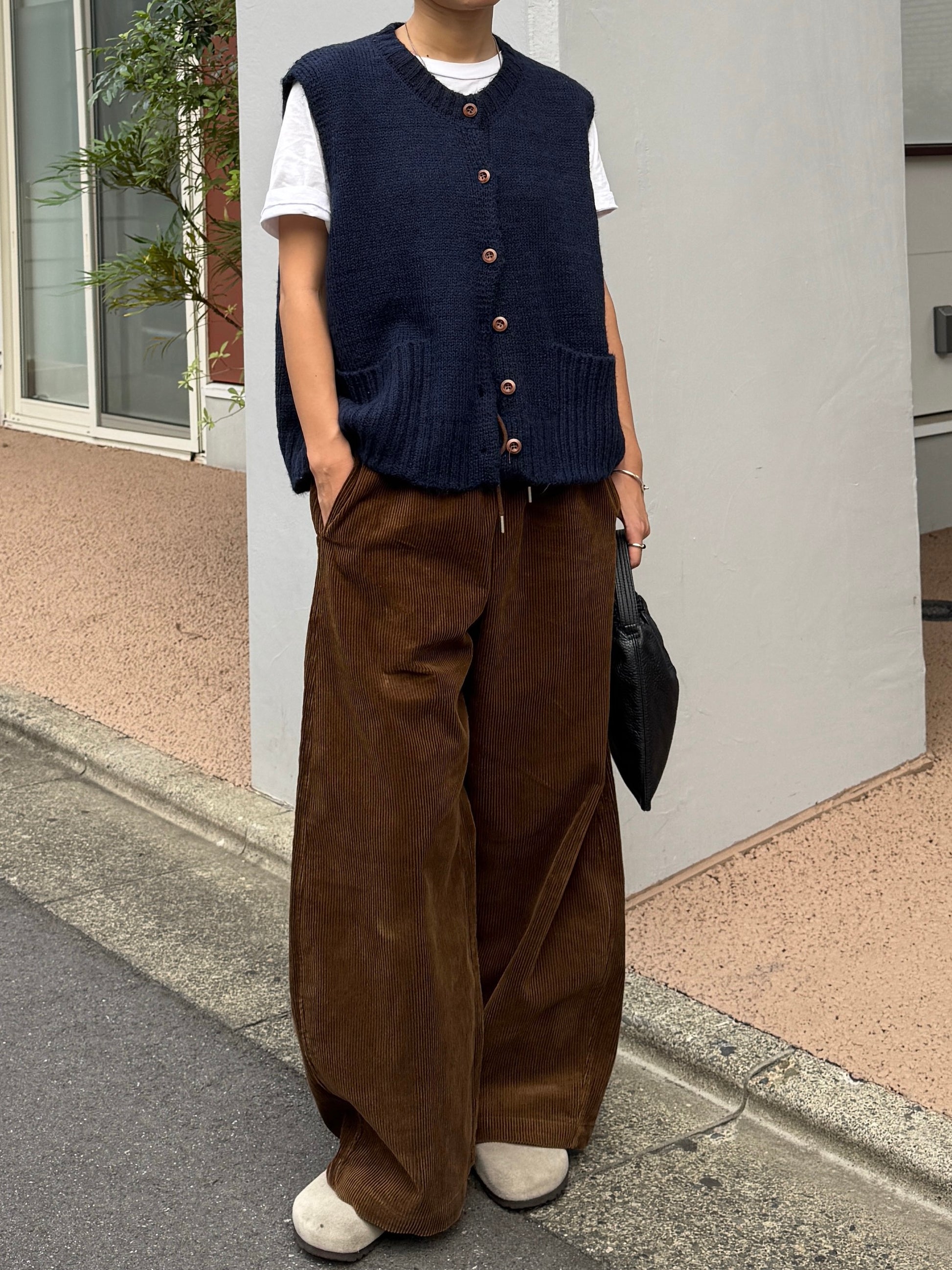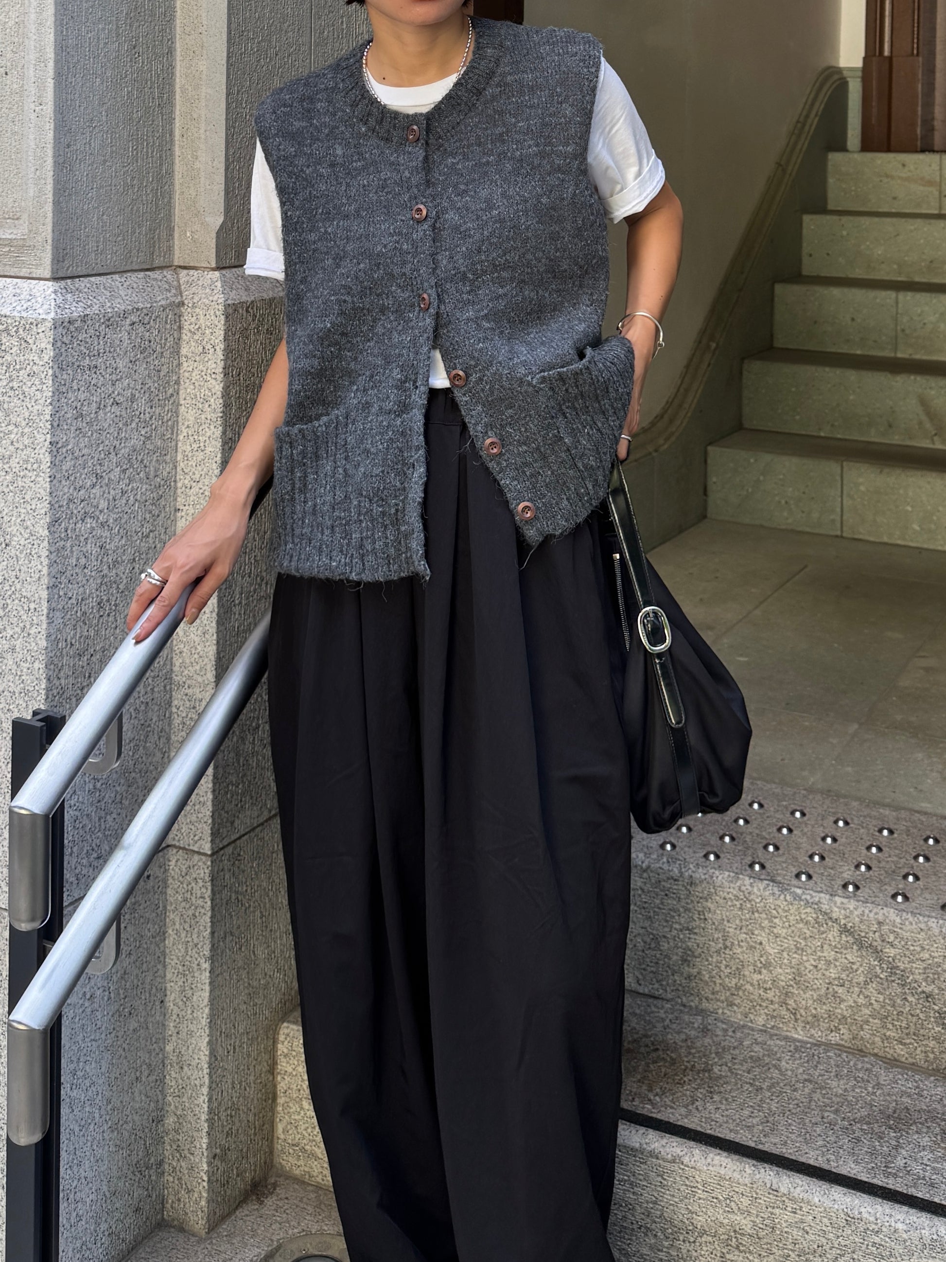 シンプルでありながら奥行きのある表情を楽しめるニットベスト。 フロントには温もりを添えるウッド調ボタンを施し、 リブ仕様がポイントのポケットにはさりげなくブランドタブを加えアクセントを。 アームホールは程よくゆとりを持たせている為カジュアルにカットソーとの合わせはもちろん、 シャツやワンピースなど様々なインナーとのレイヤードに抜け感をプラスしてくれる1着。 大人のワードローブに寄り添う、シーズンレスで活躍するおすすめアイテムです。