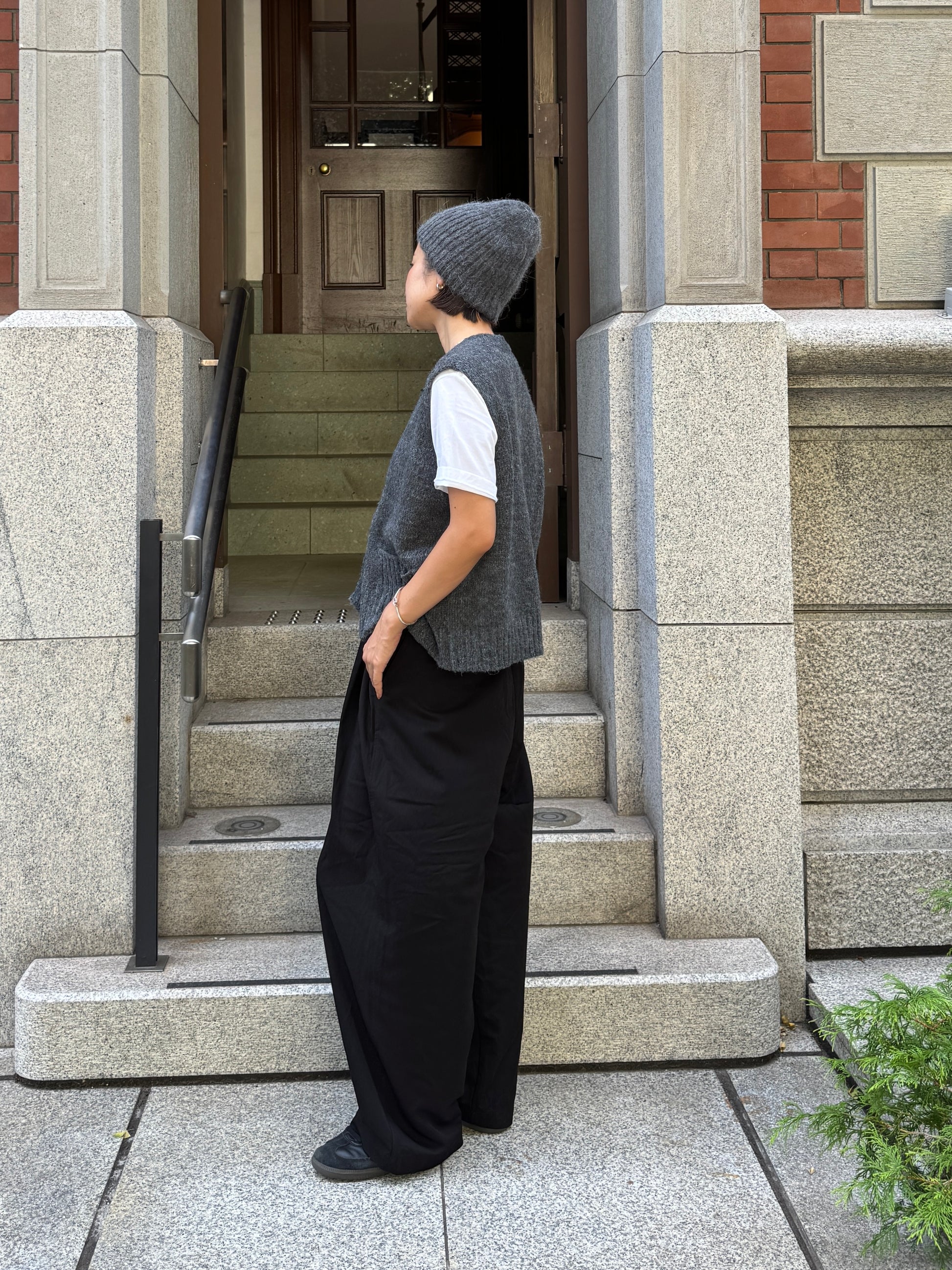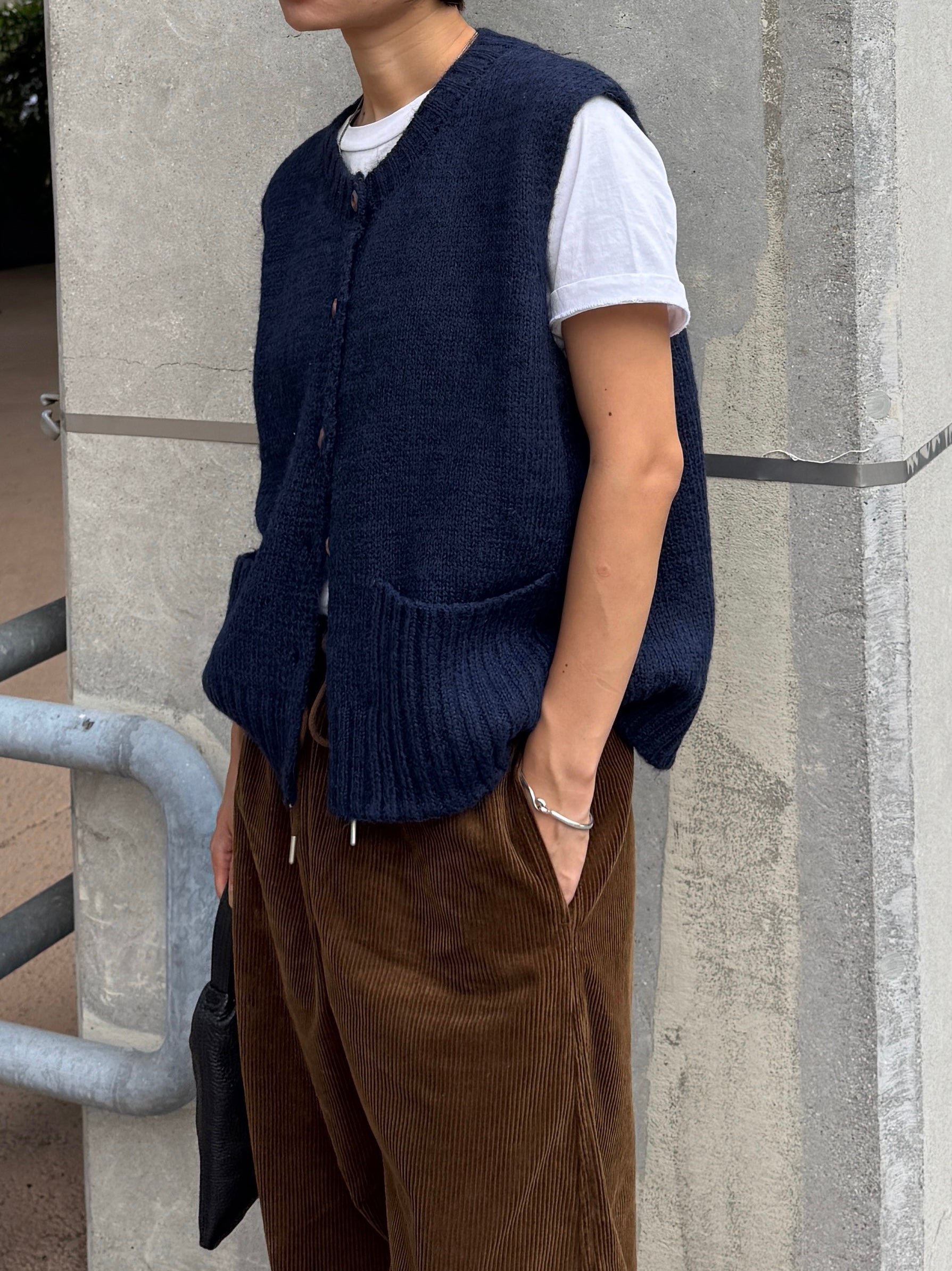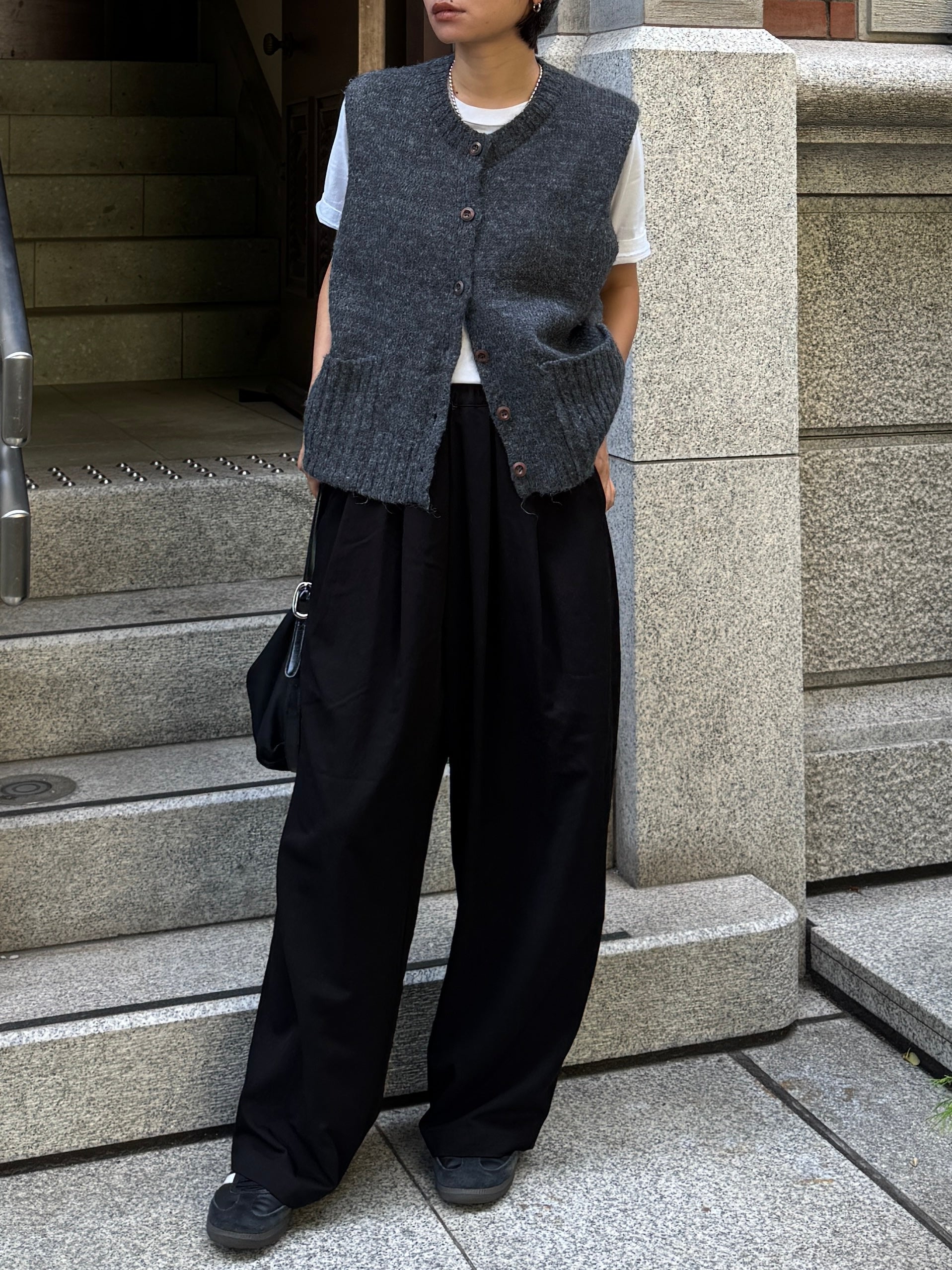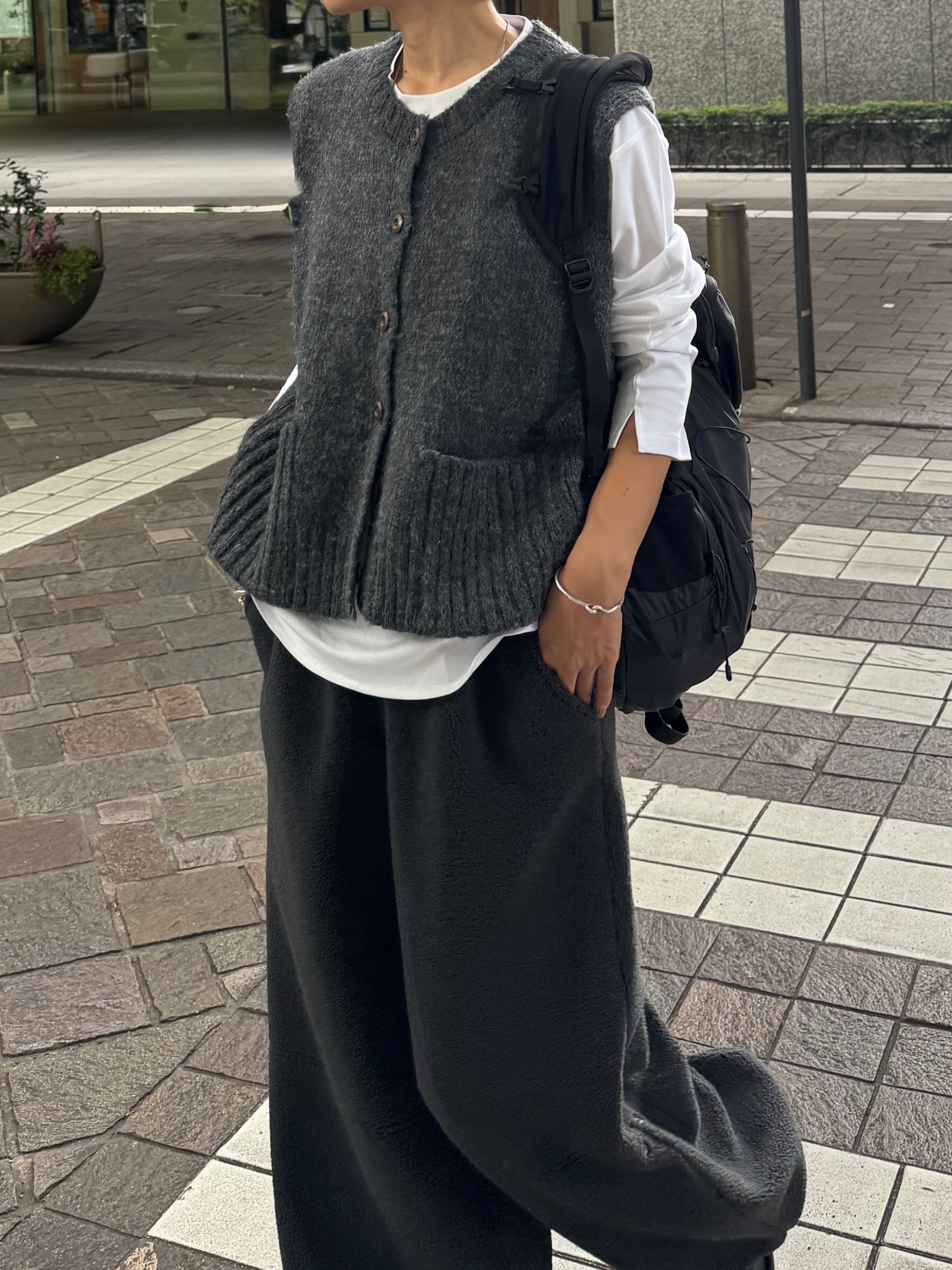 シンプルでありながら奥行きのある表情を楽しめるニットベスト。 フロントには温もりを添えるウッド調ボタンを施し、 リブ仕様がポイントのポケットにはさりげなくブランドタブを加えアクセントを。 アームホールは程よくゆとりを持たせている為カジュアルにカットソーとの合わせはもちろん、 シャツやワンピースなど様々なインナーとのレイヤードに抜け感をプラスしてくれる1着。 大人のワードローブに寄り添う、シーズンレスで活躍するおすすめアイテムです。