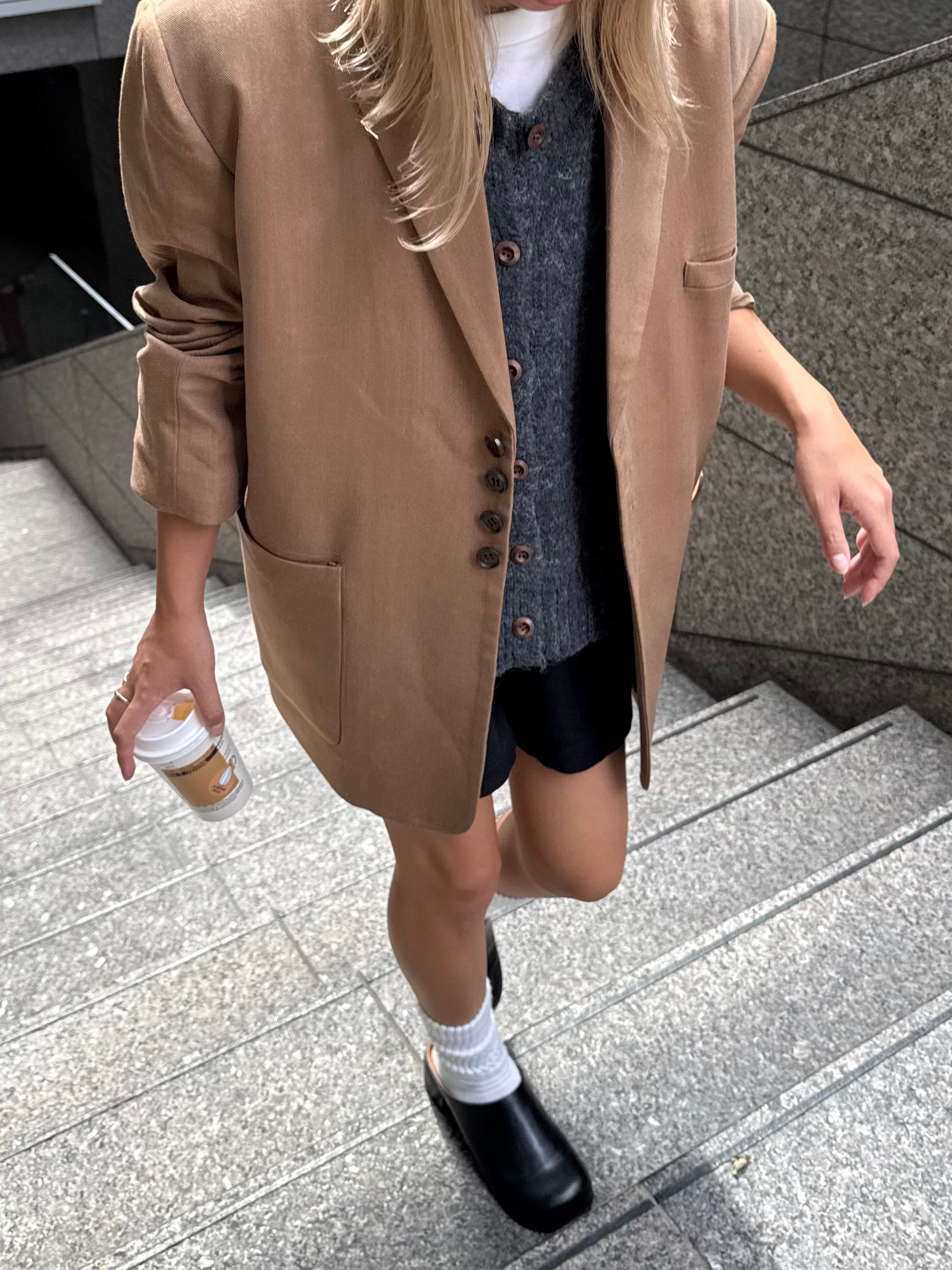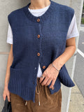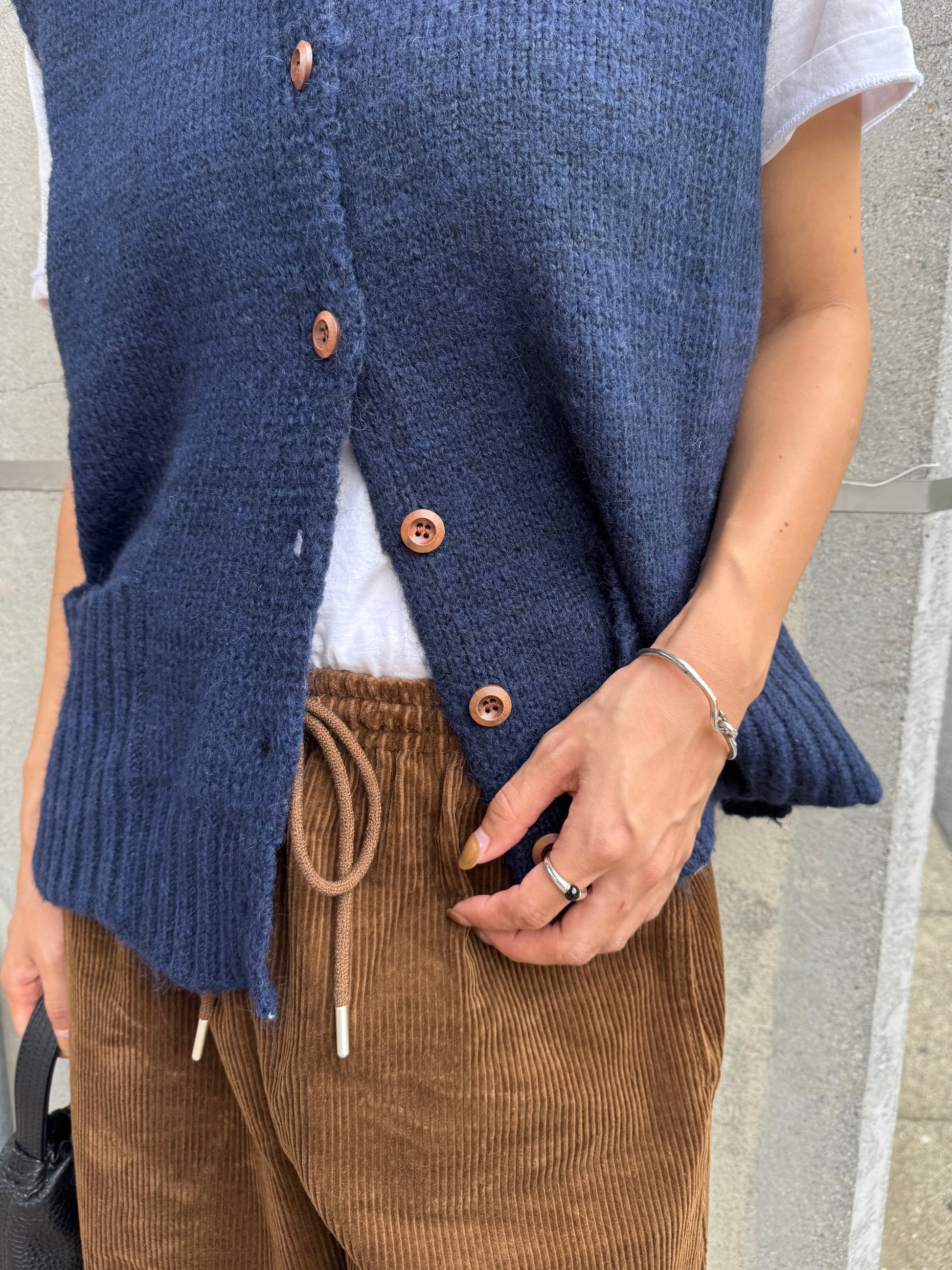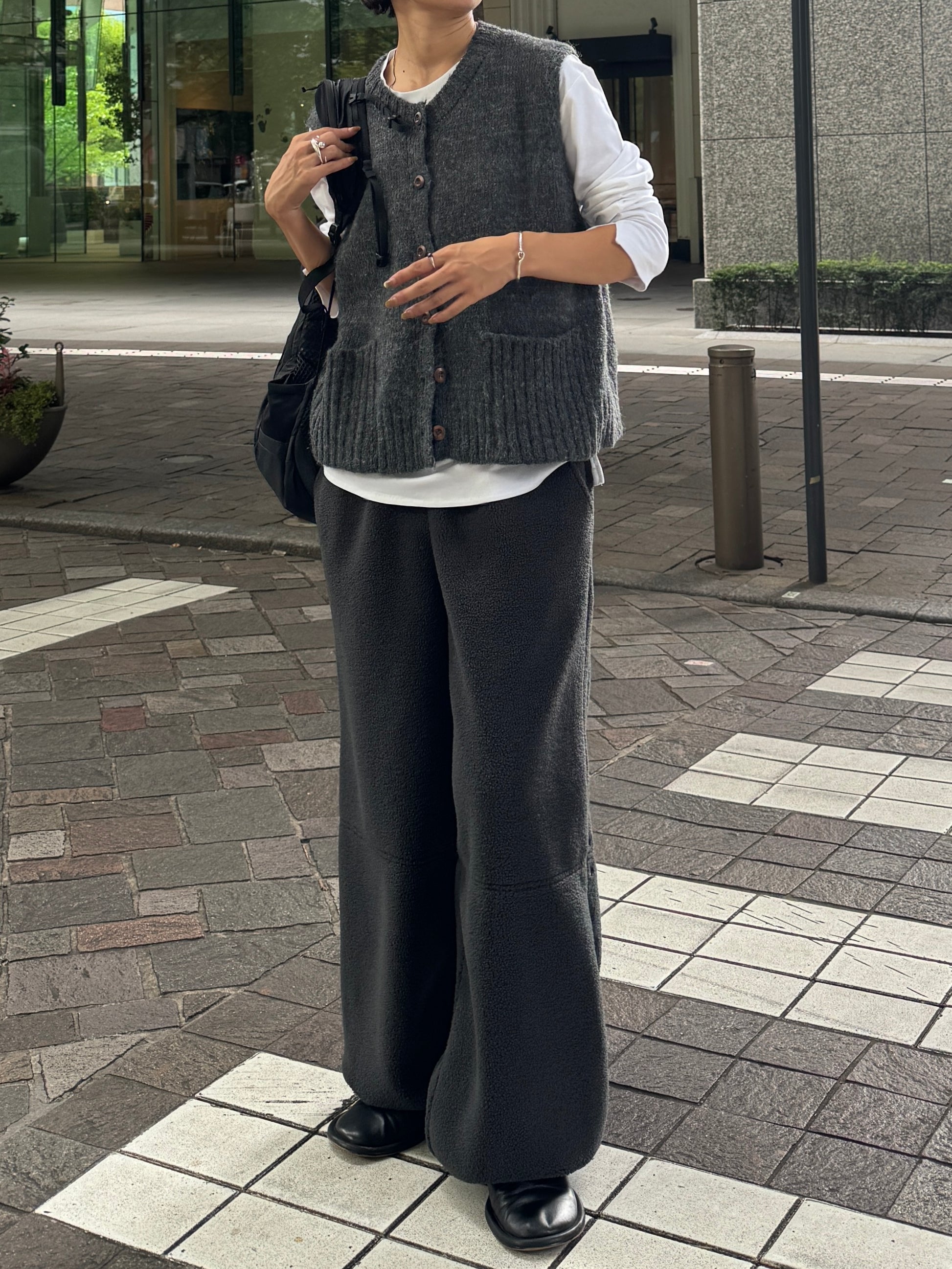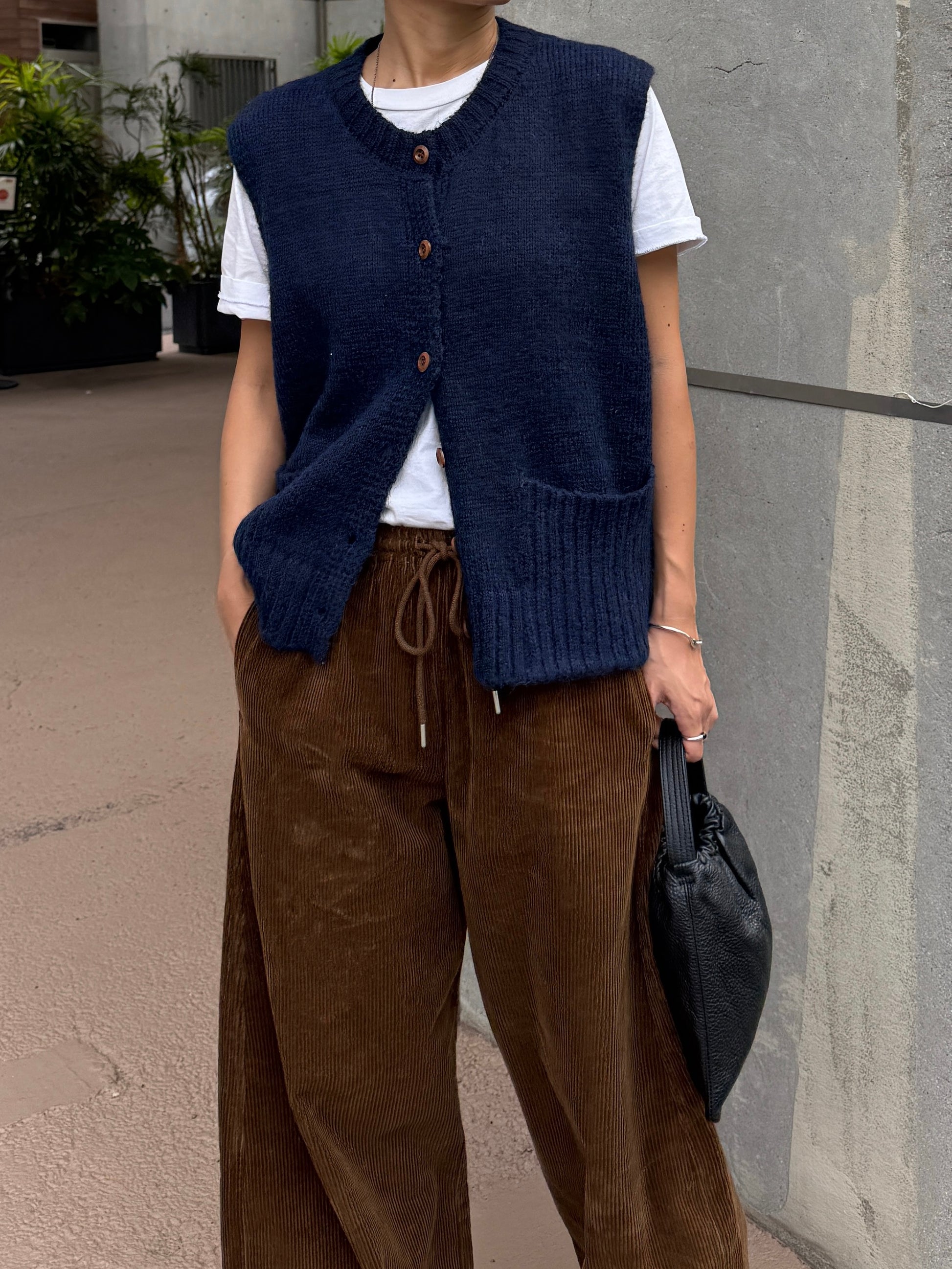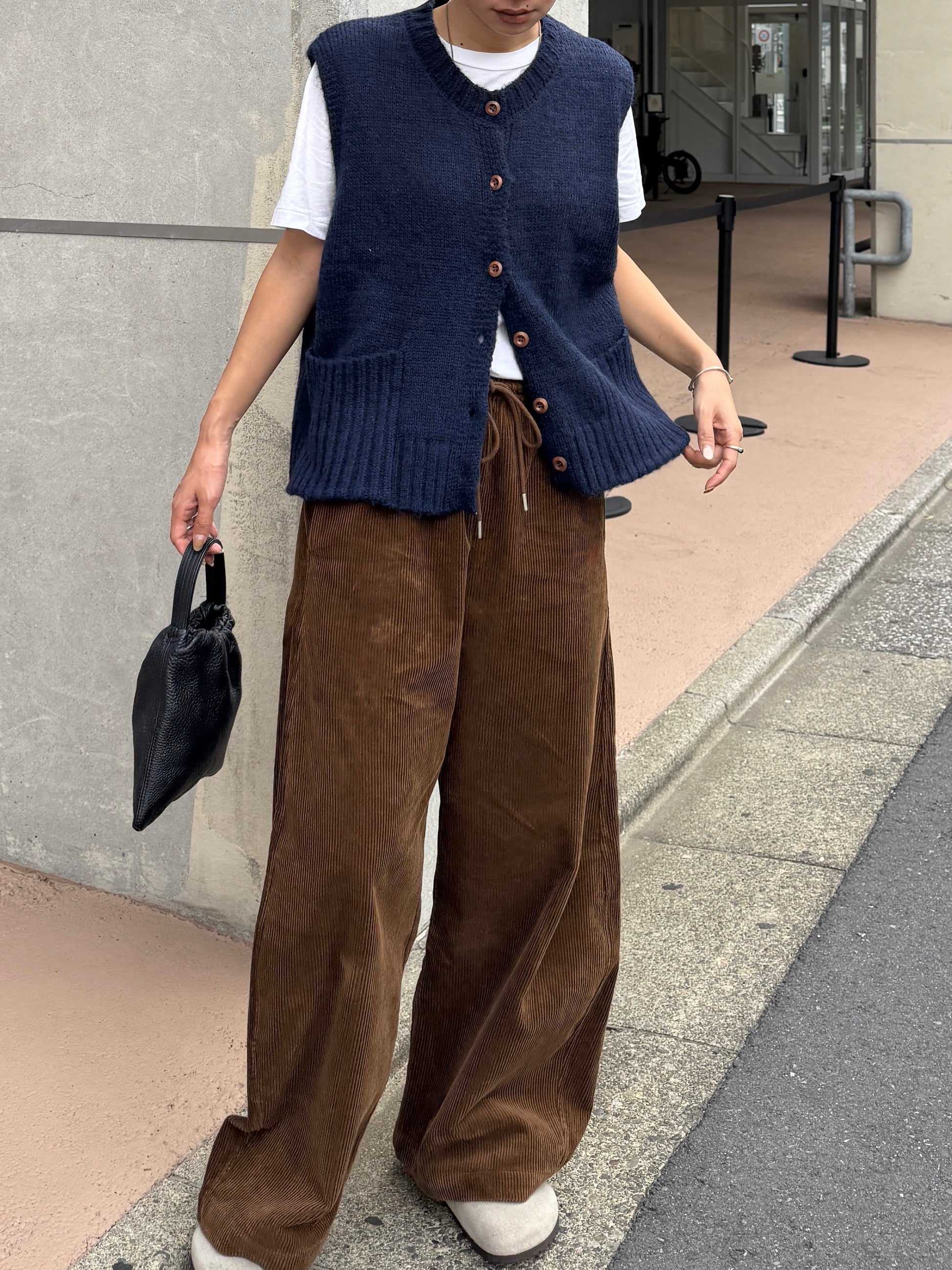 シンプルでありながら奥行きのある表情を楽しめるニットベスト。 フロントには温もりを添えるウッド調ボタンを施し、 リブ仕様がポイントのポケットにはさりげなくブランドタブを加えアクセントを。 アームホールは程よくゆとりを持たせている為カジュアルにカットソーとの合わせはもちろん、 シャツやワンピースなど様々なインナーとのレイヤードに抜け感をプラスしてくれる1着。 大人のワードローブに寄り添う、シーズンレスで活躍するおすすめアイテムです。
