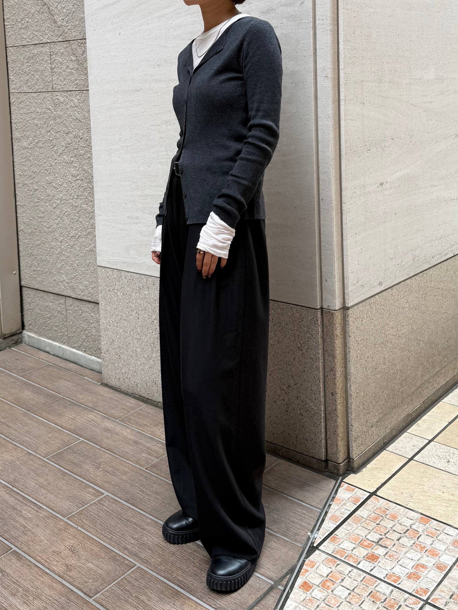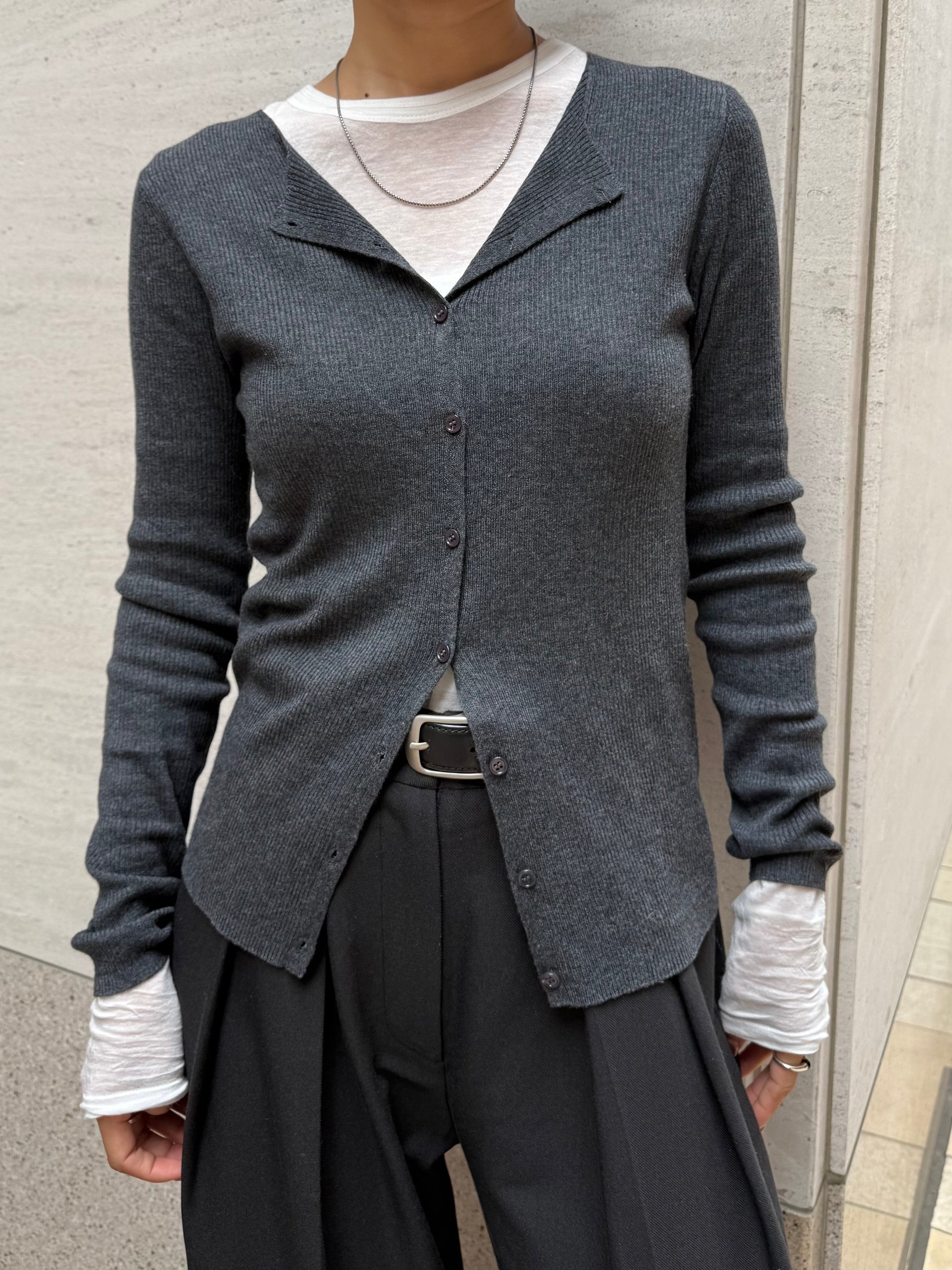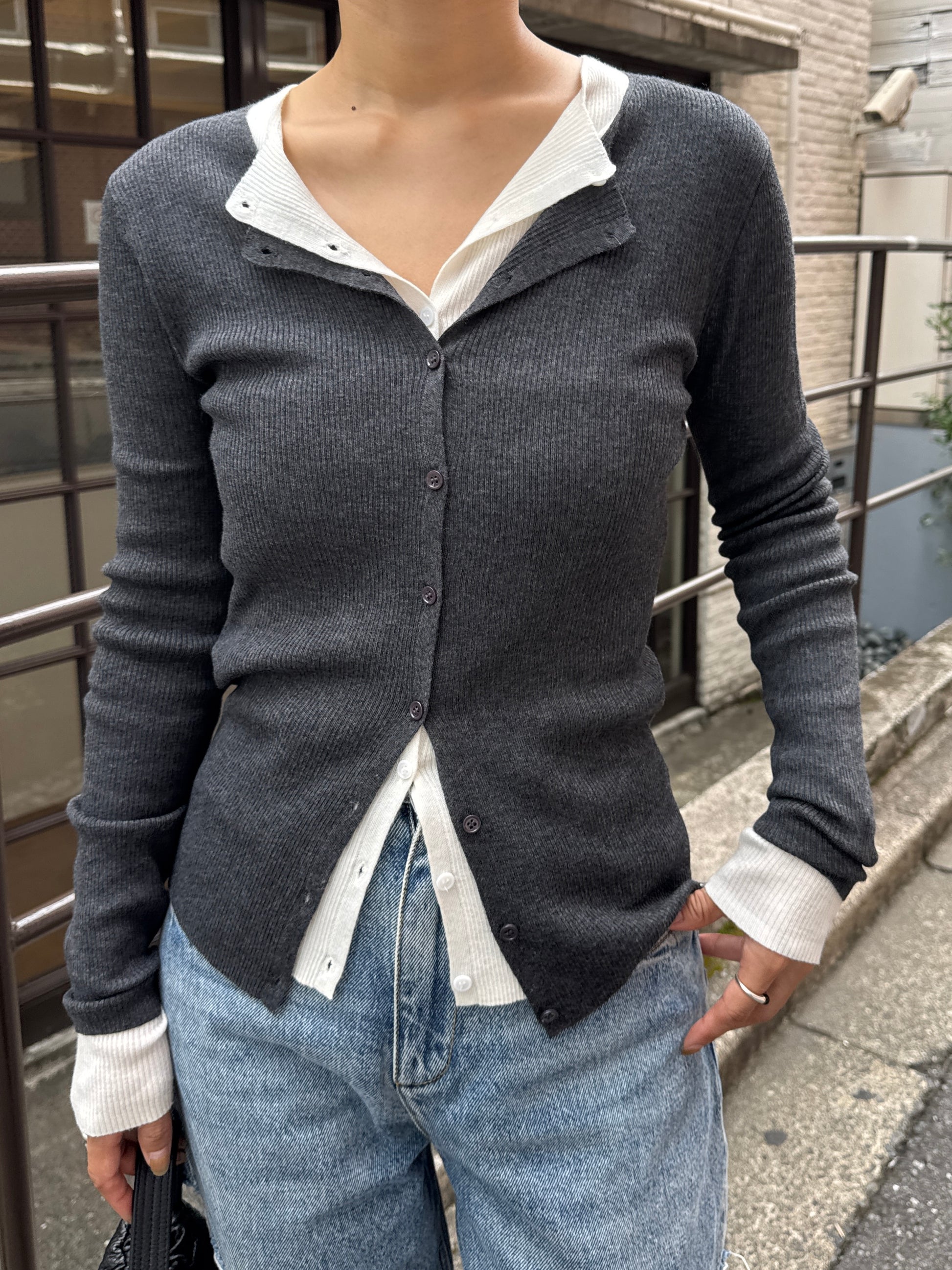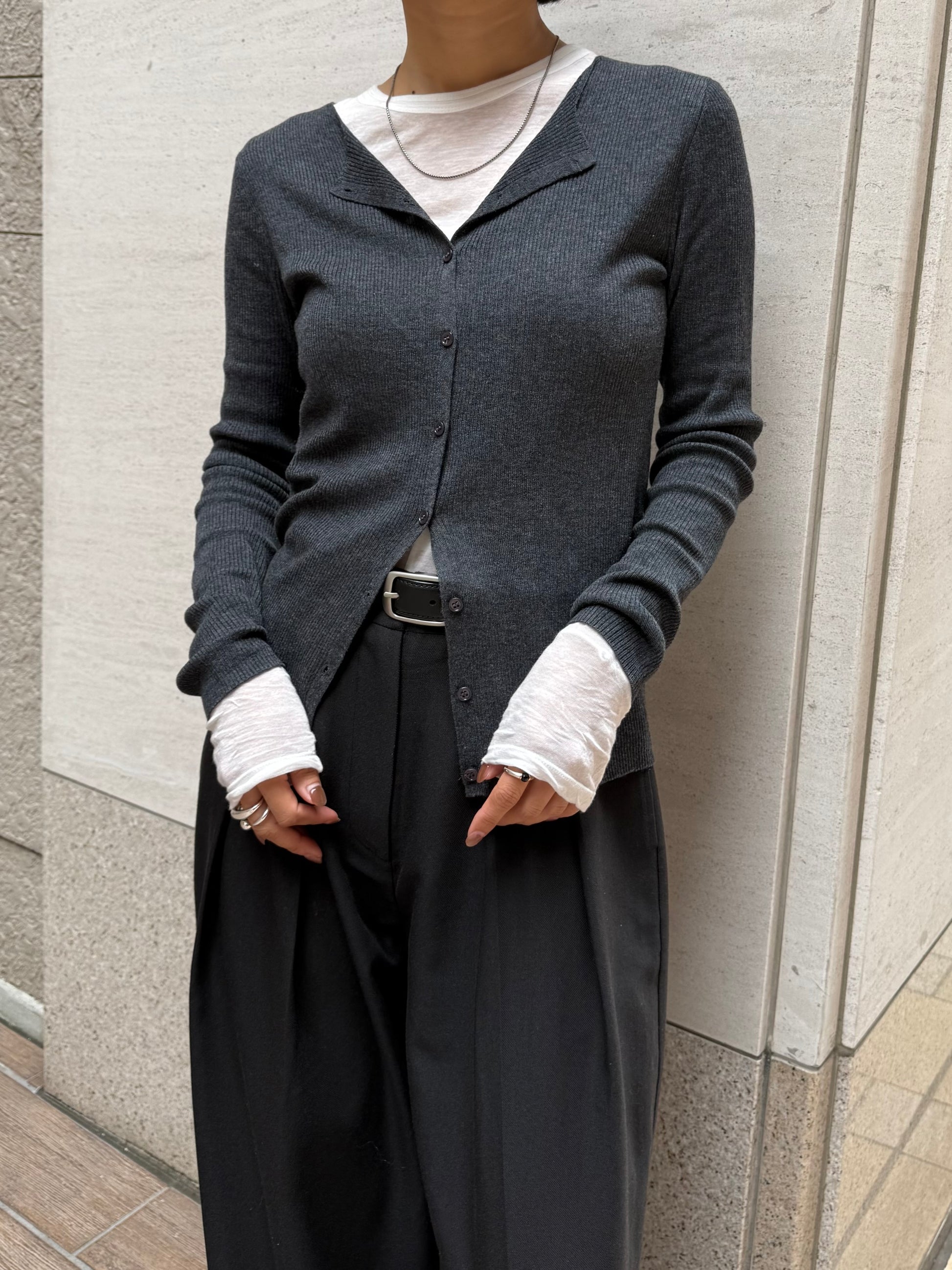 上品さとこなれ感を両立したレイヤードスタイルが楽しめる薄手のニットカーディガン。 程よく身体にフィットする細リブ素材で仕立てており、すっきりとしたシルエットを演出。 伸縮性ある肌あたりの優しい生地で、リラックス感ある着心地も魅力の1枚です。 1枚でのご着用はもちろん、2枚重ねたレイヤードスタイルも衿元や裾、袖口から覗く インナーがアクセントになり、シンプルながらも奥行きのある着こなしを叶えます。 軽い羽織りとしても、アウターのインナーにも映える万能アイテム。