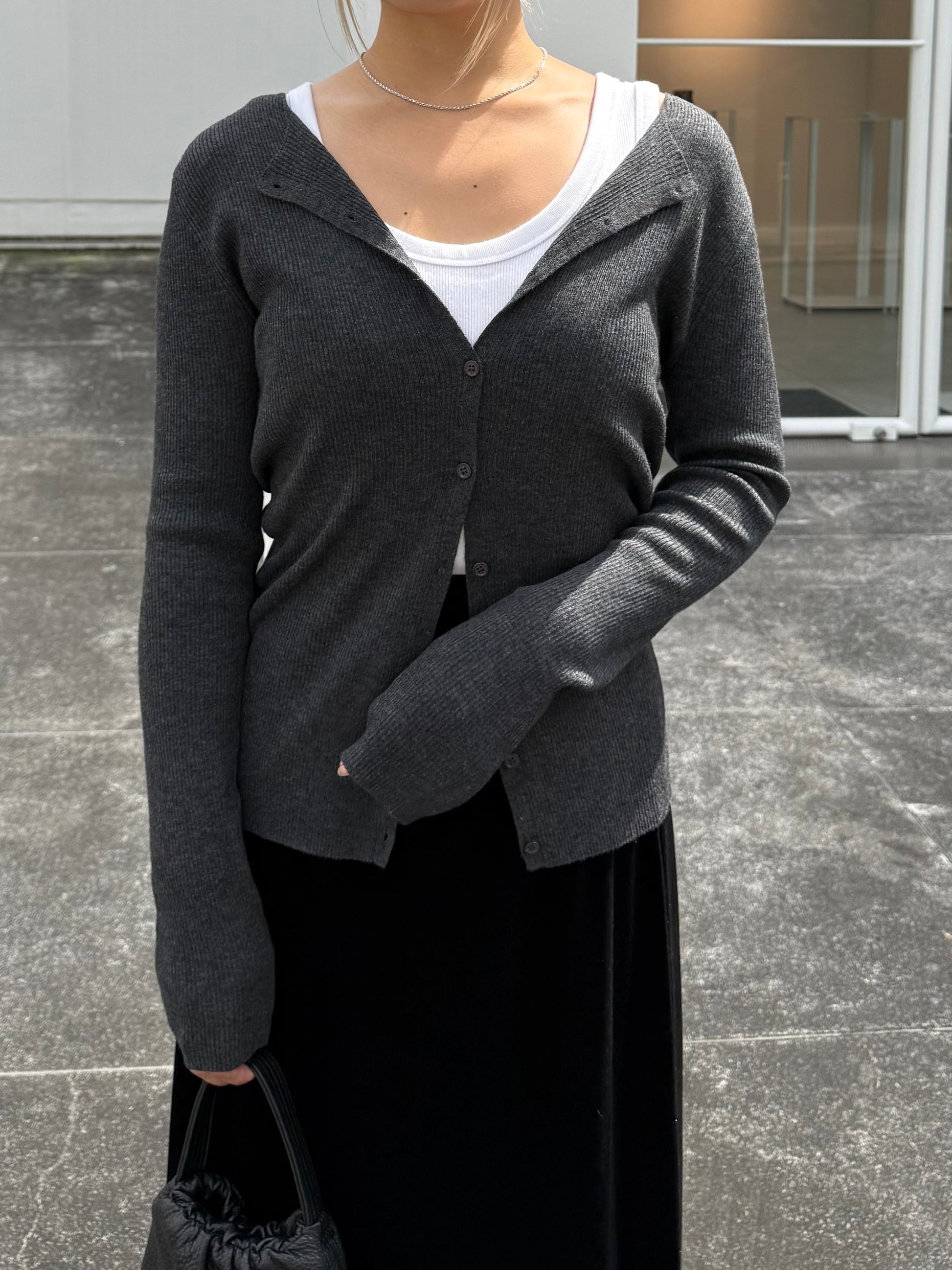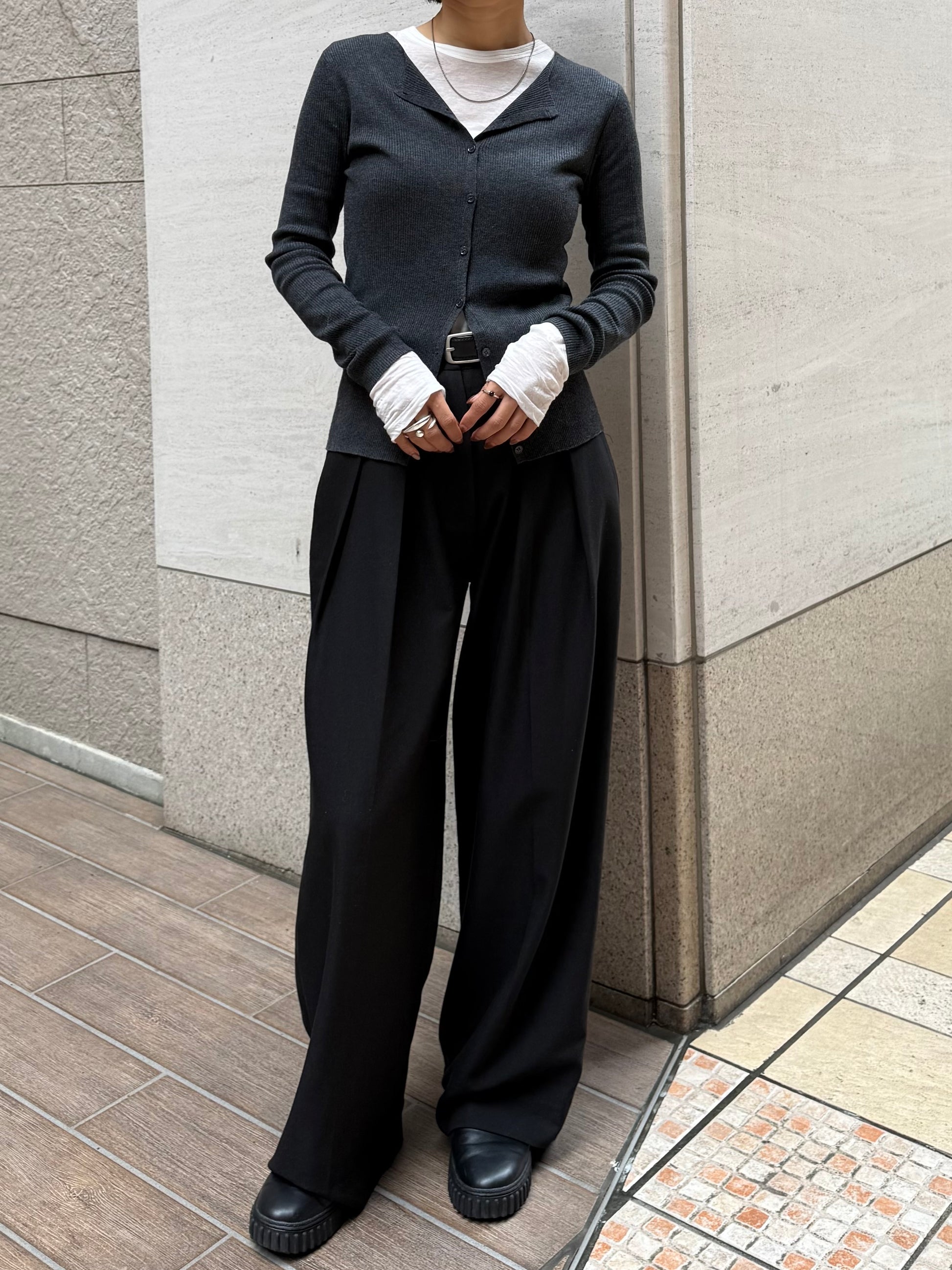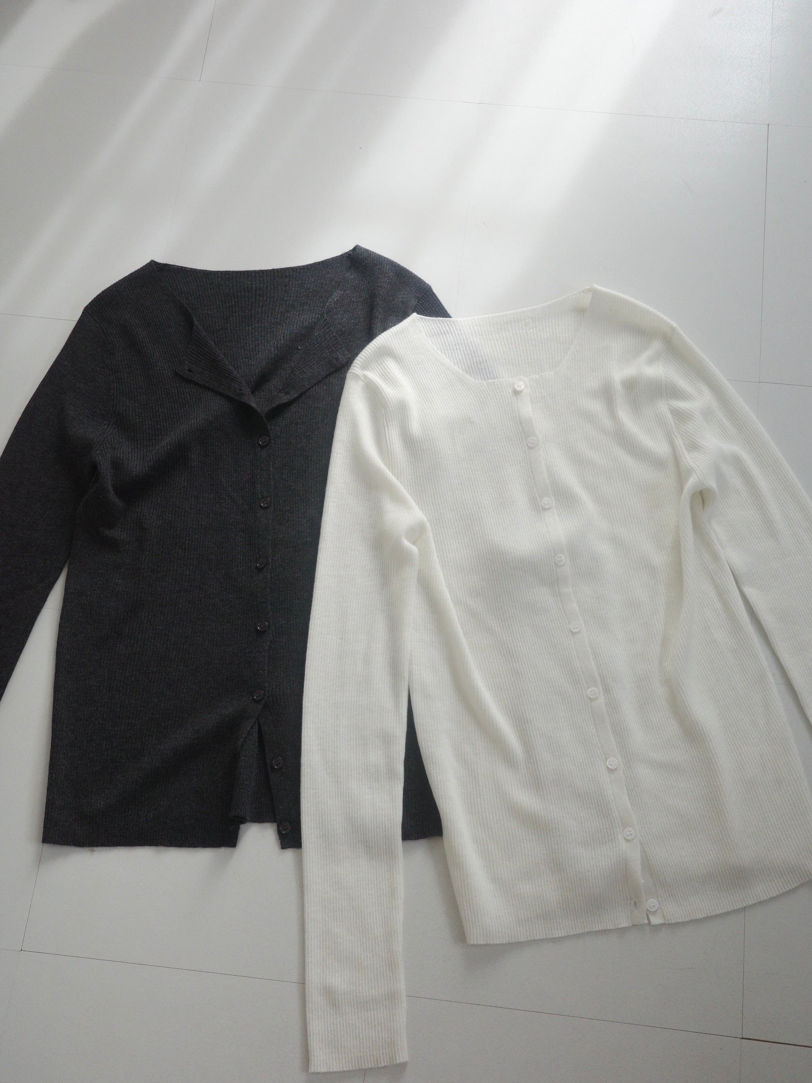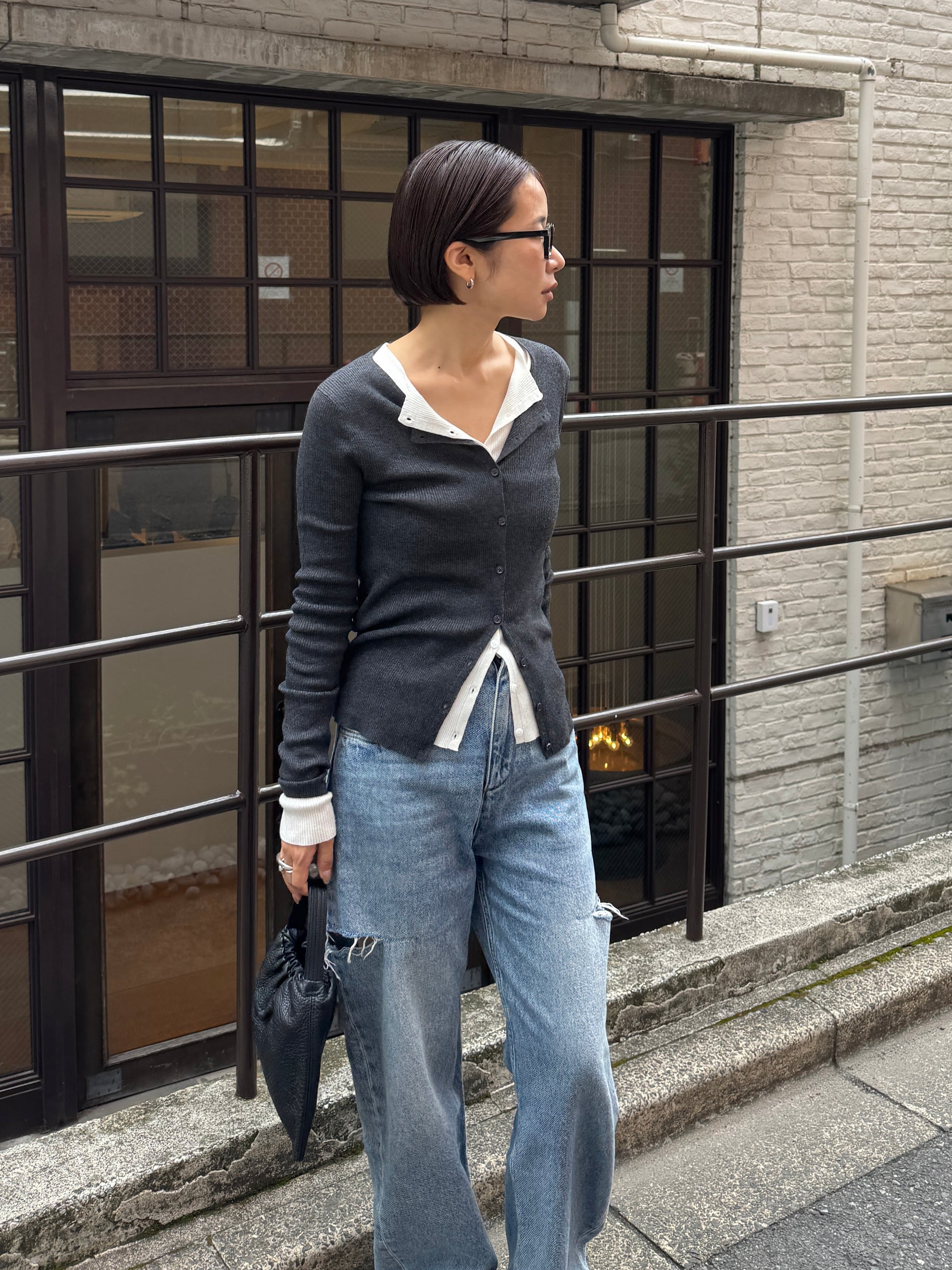 上品さとこなれ感を両立したレイヤードスタイルが楽しめる薄手のニットカーディガン。 程よく身体にフィットする細リブ素材で仕立てており、すっきりとしたシルエットを演出。 伸縮性ある肌あたりの優しい生地で、リラックス感ある着心地も魅力の1枚です。 1枚でのご着用はもちろん、2枚重ねたレイヤードスタイルも衿元や裾、袖口から覗く インナーがアクセントになり、シンプルながらも奥行きのある着こなしを叶えます。 軽い羽織りとしても、アウターのインナーにも映える万能アイテム。
