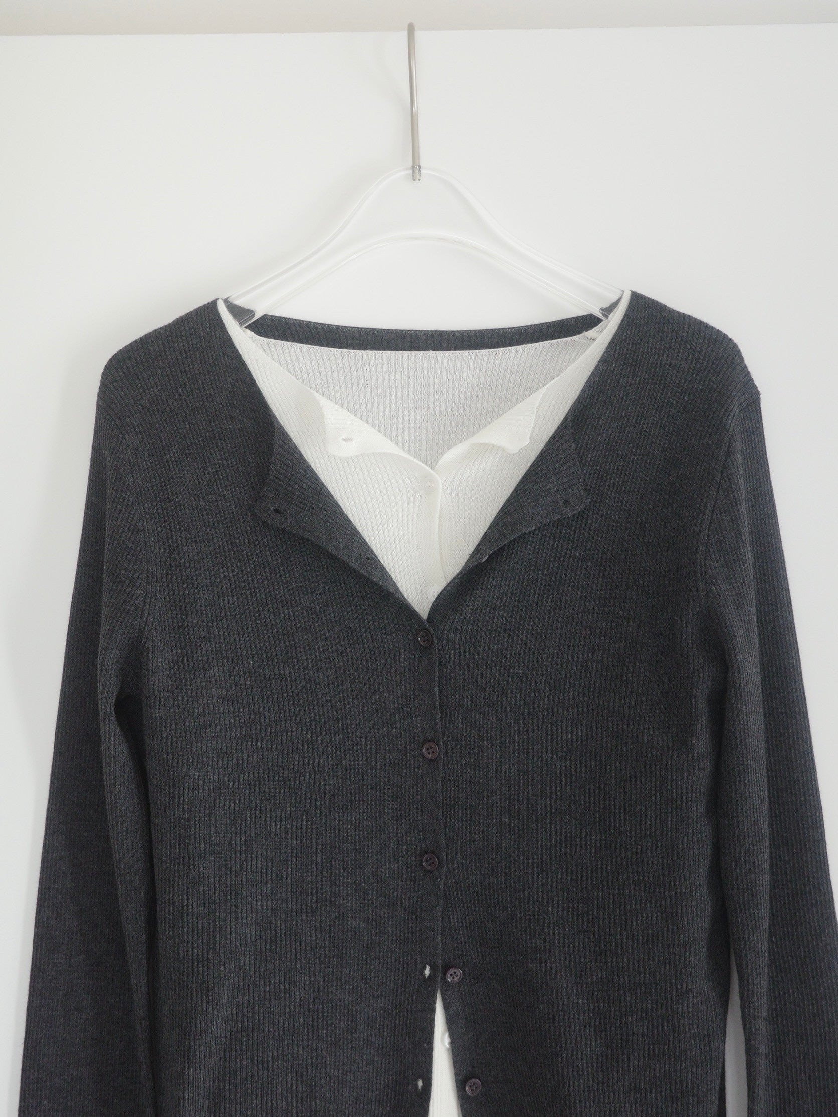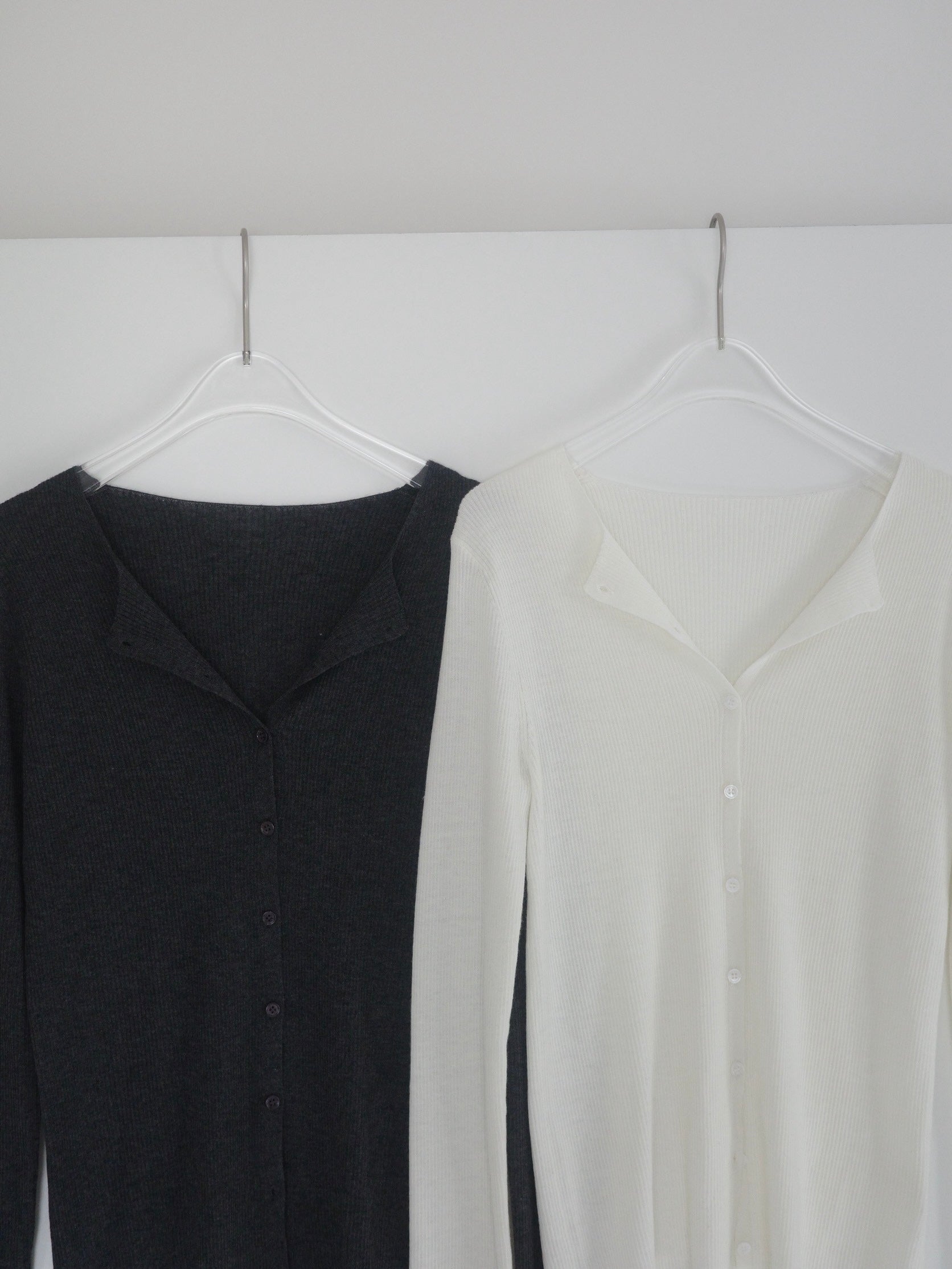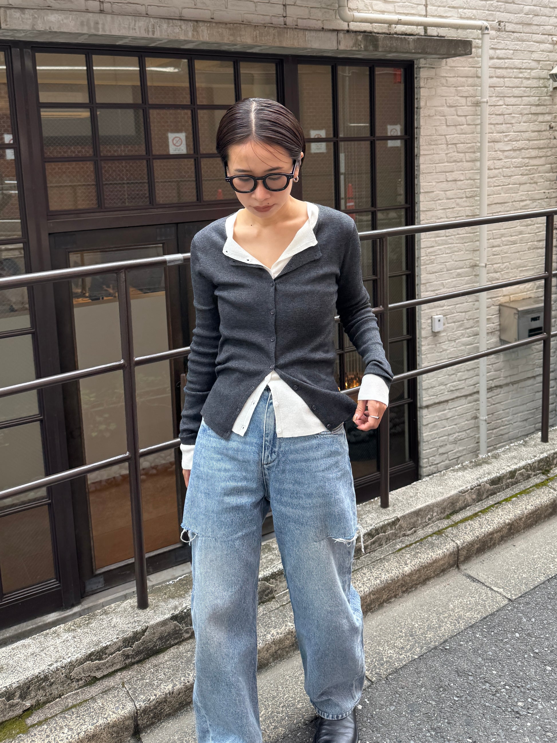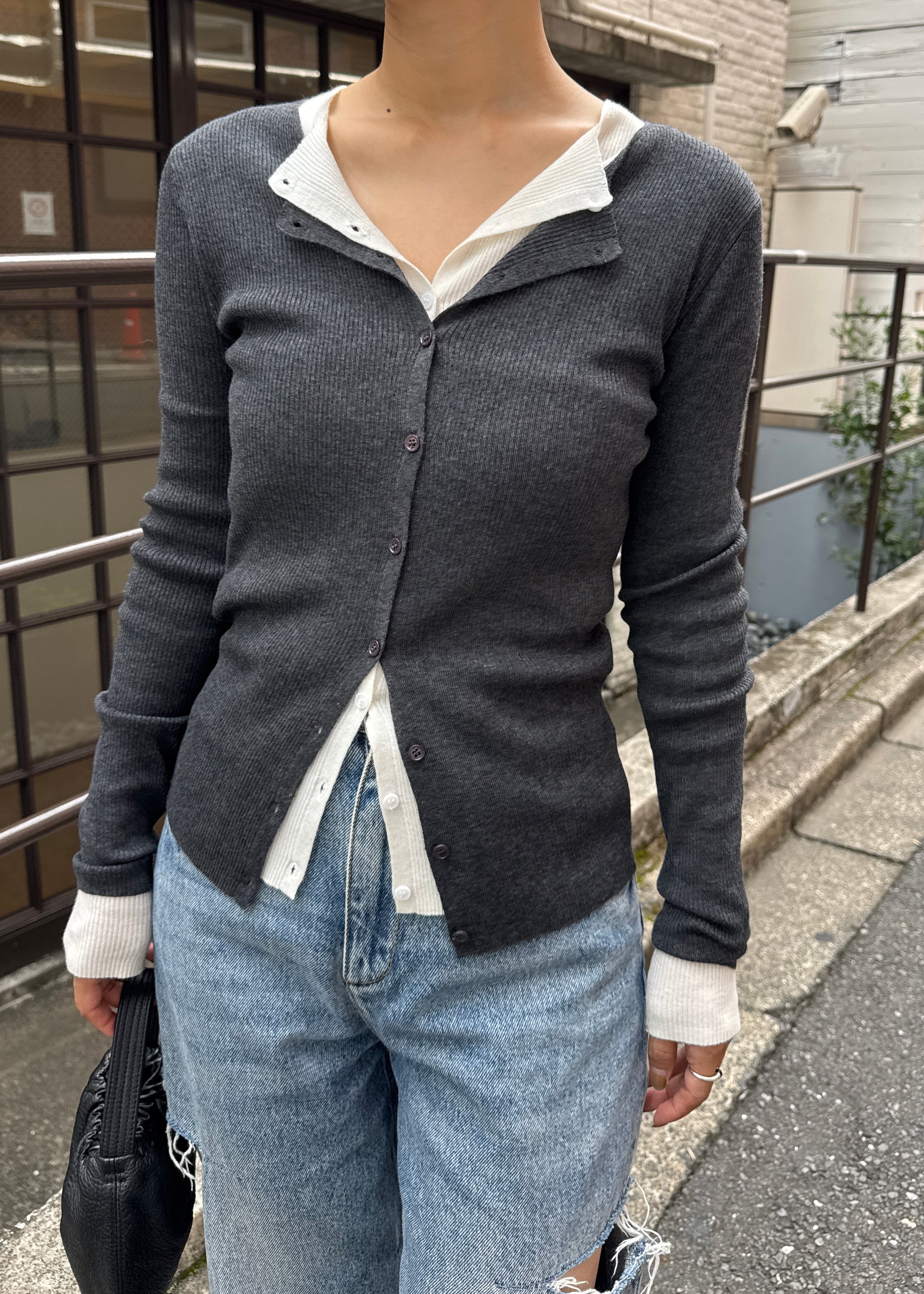 上品さとこなれ感を両立したレイヤードスタイルが楽しめる薄手のニットカーディガン。 程よく身体にフィットする細リブ素材で仕立てており、すっきりとしたシルエットを演出。 伸縮性ある肌あたりの優しい生地で、リラックス感ある着心地も魅力の1枚です。 1枚でのご着用はもちろん、2枚重ねたレイヤードスタイルも衿元や裾、袖口から覗く インナーがアクセントになり、シンプルながらも奥行きのある着こなしを叶えます。 軽い羽織りとしても、アウターのインナーにも映える万能アイテム。