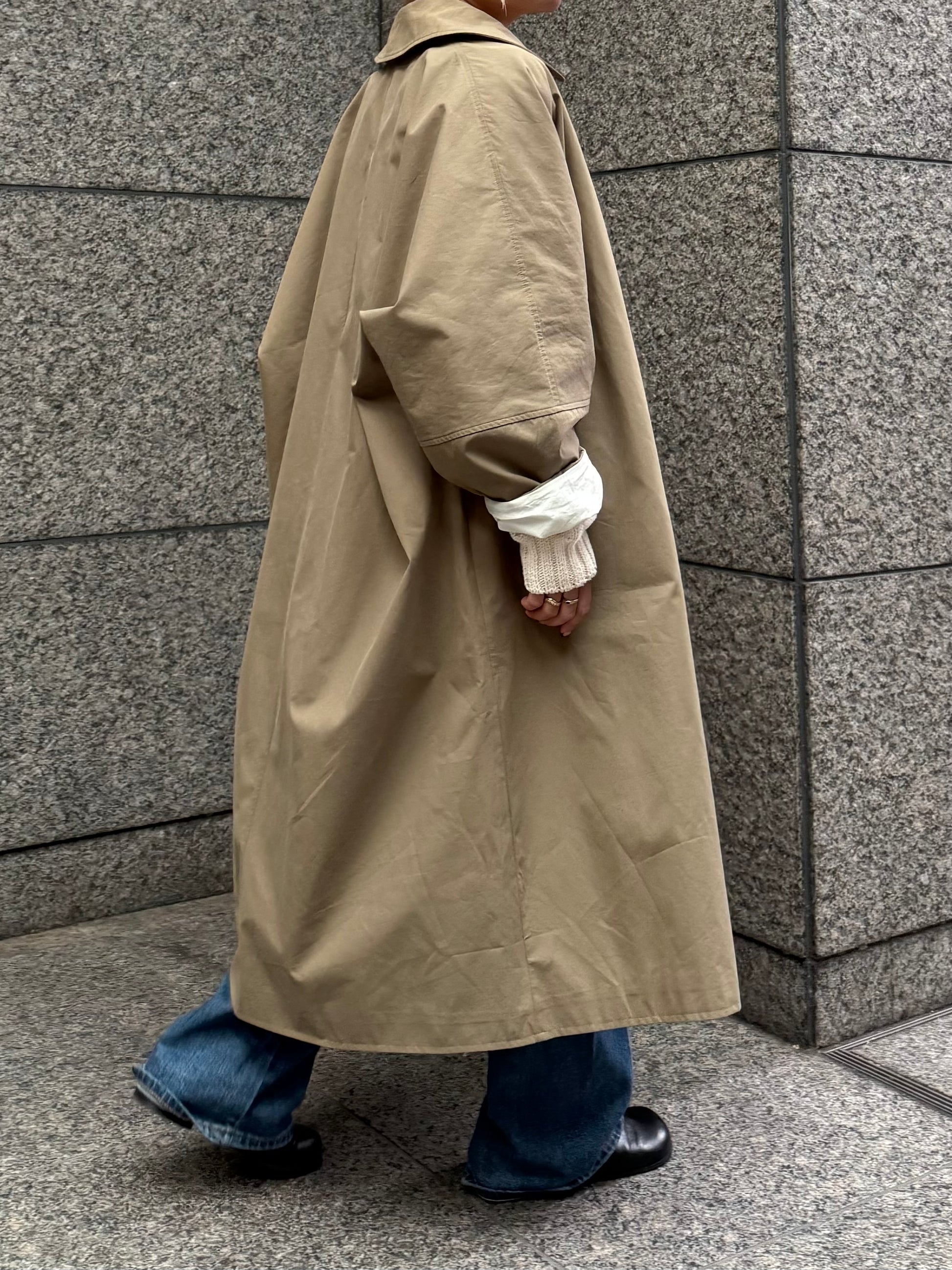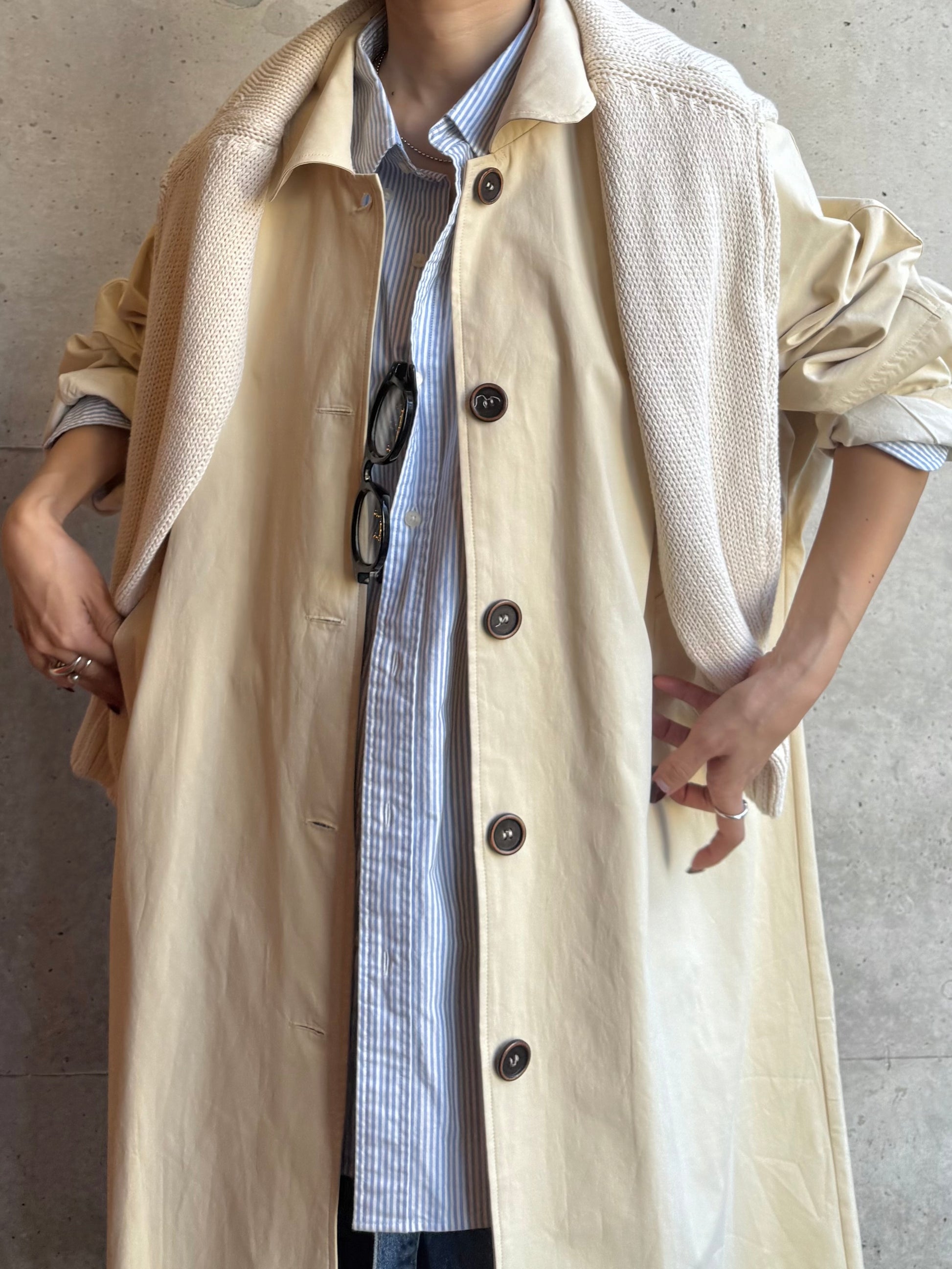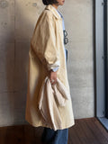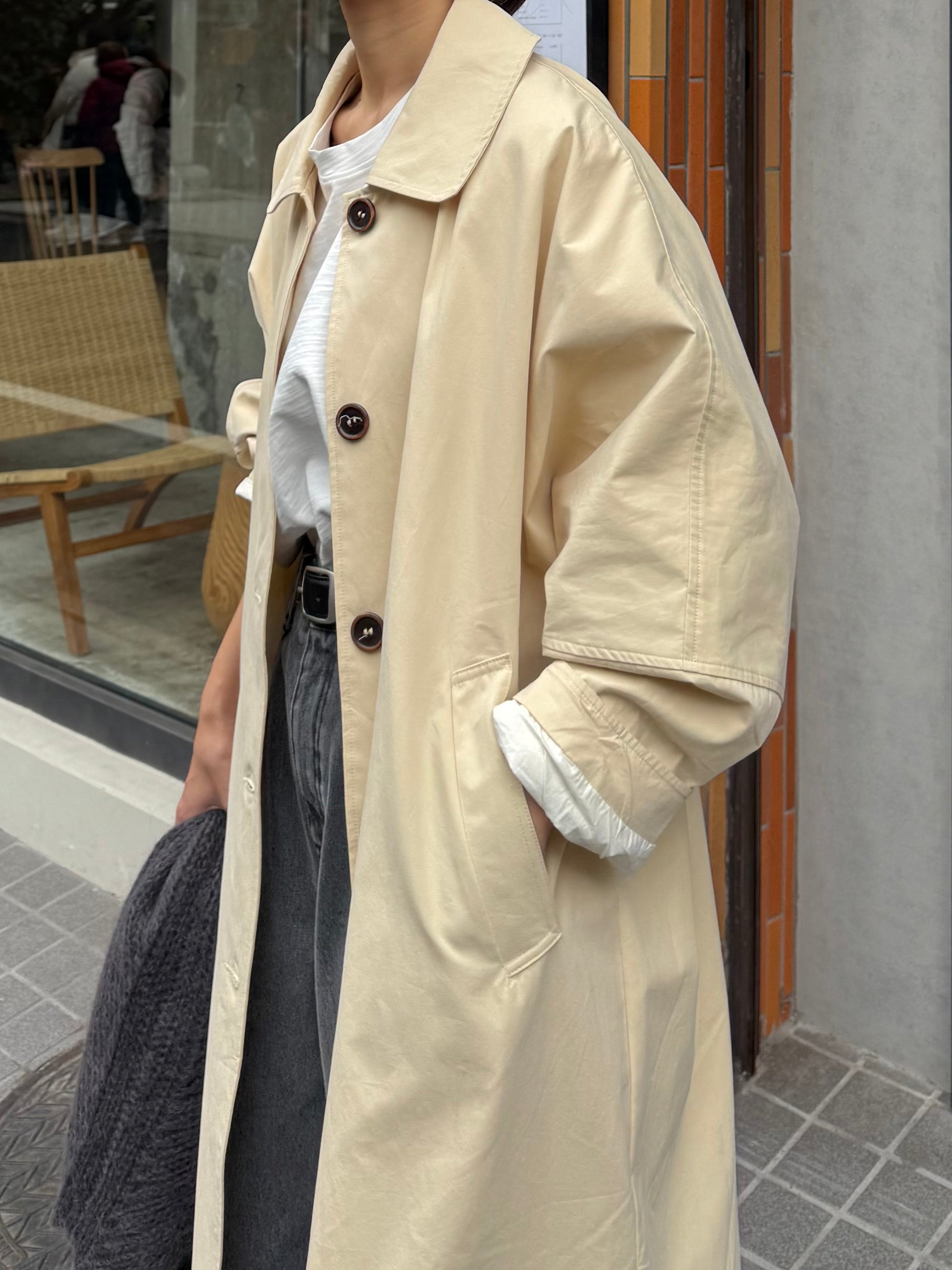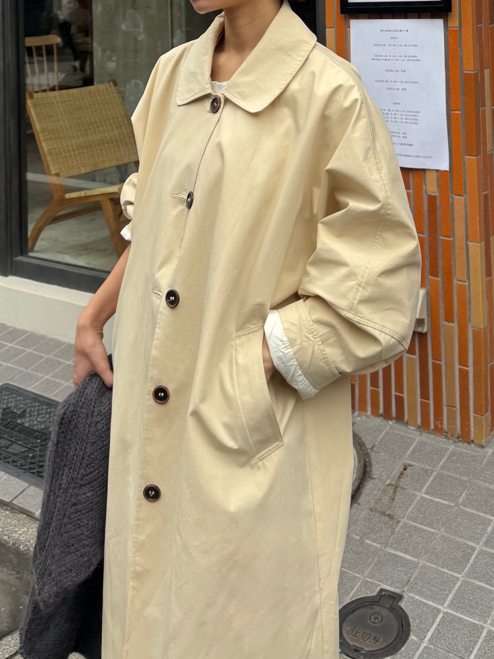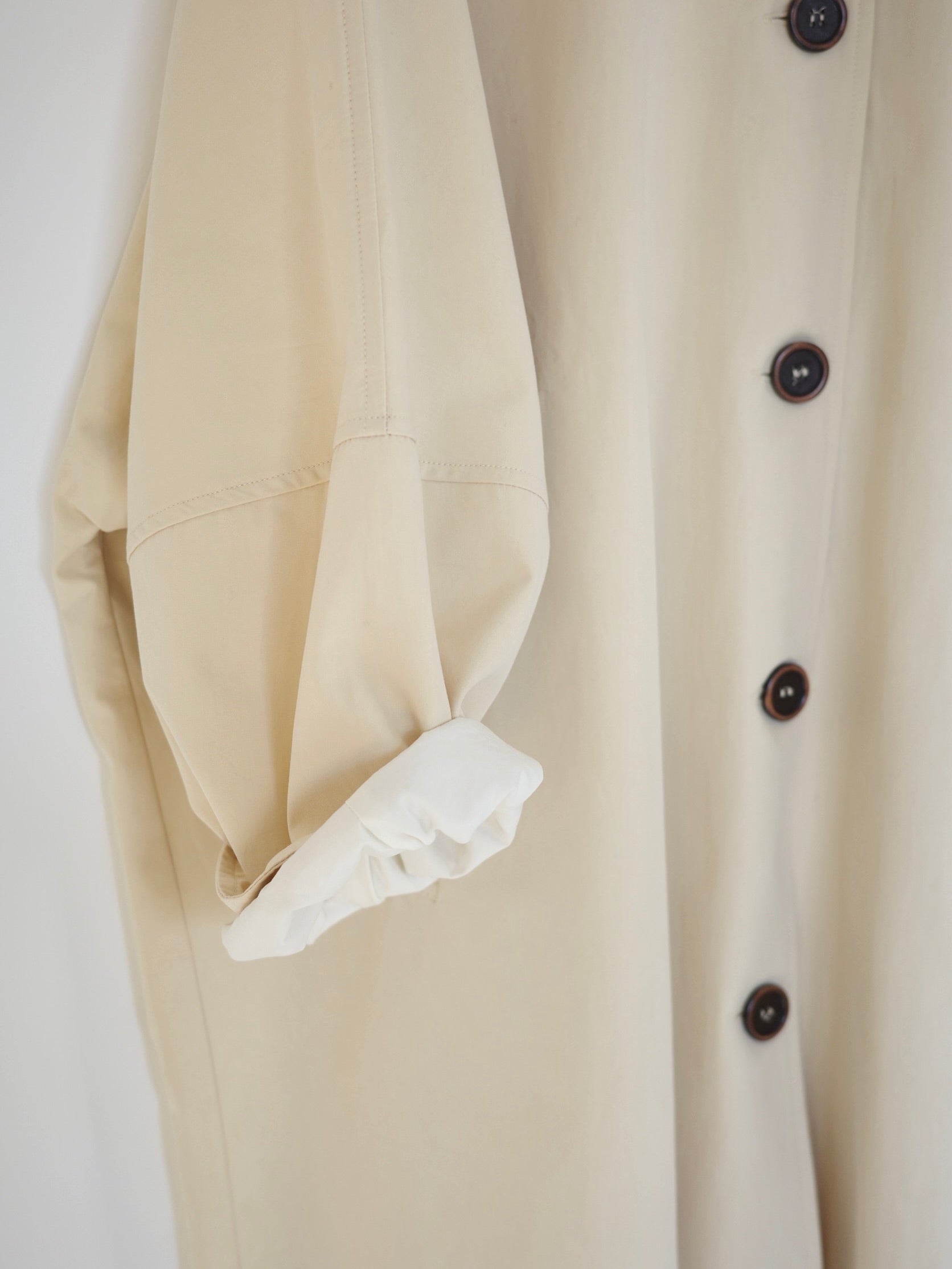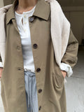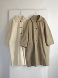 綿と麻を使用した、軽やかな着心地の春ロングコート。 天然素材ならではのナチュラルな風合いで、季節の変わり目にも手に取りやすい一枚です。 身幅をたっぷりと取ったリラックス感のあるシルエットに加え、袖に切り替えを入れることで、自然な丸みのあるフォルムに。 腕まわりにやさしい立体感が生まれ、シンプルながらも柔らかく、女性らしい印象を与えてくれます。 ボタンを留めても開けても様になるデザインにこだわり、ロールアップしたときの袖の表情もスタイリングのさりげないアクセントに◎ 春の空気に自然と馴染み、コーディネート全体を軽やかに見せてくれる色味も魅力です。