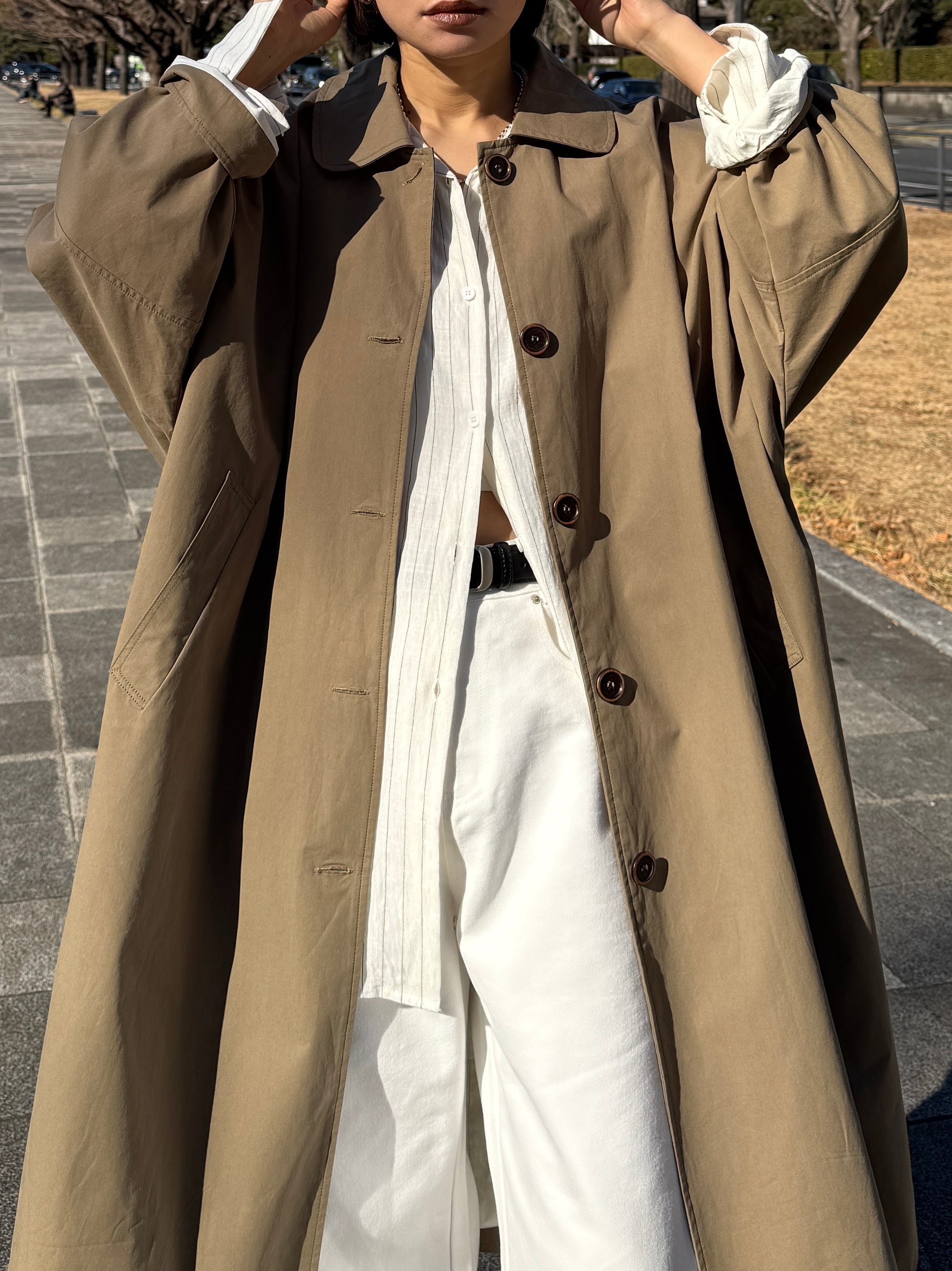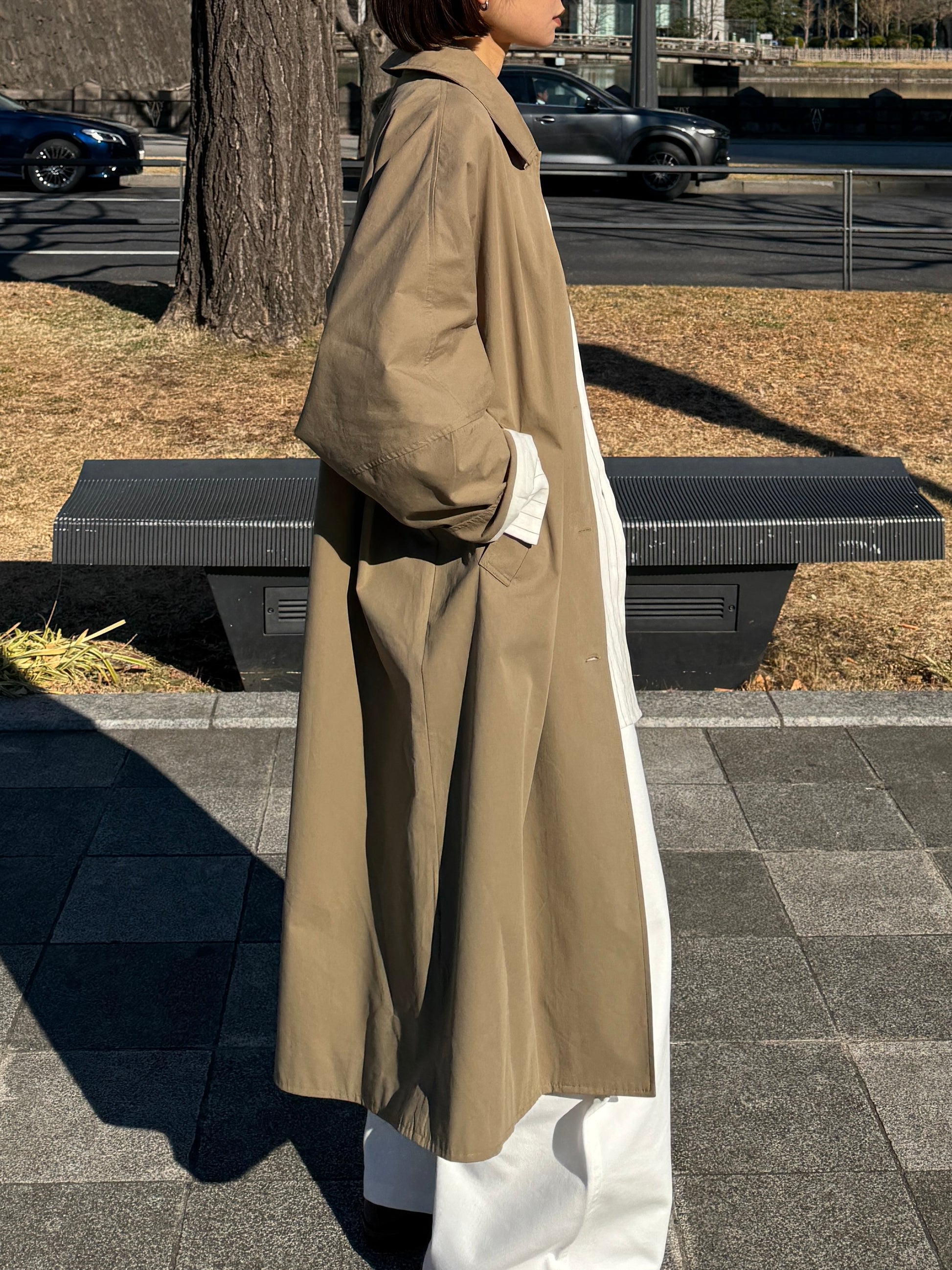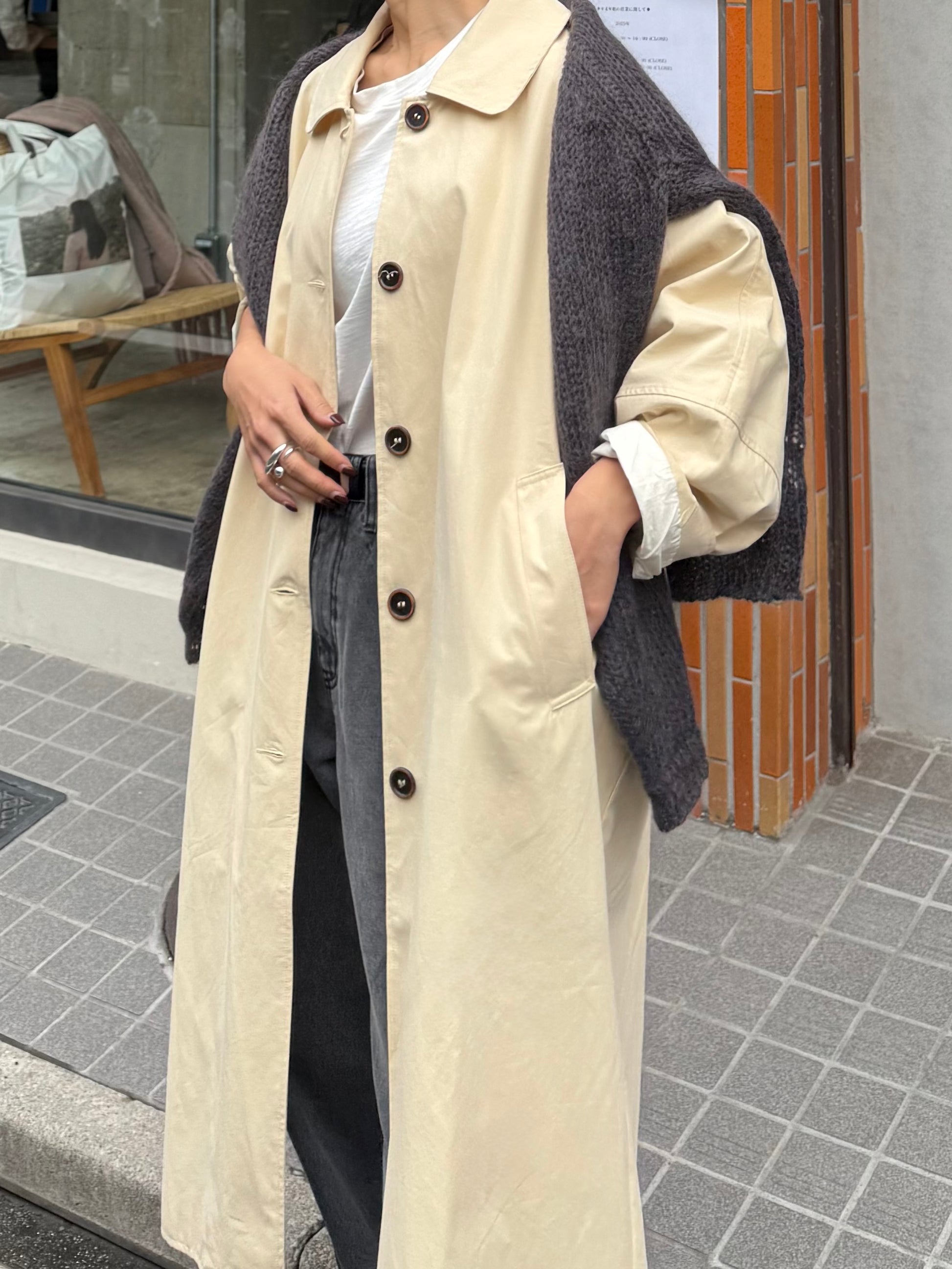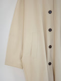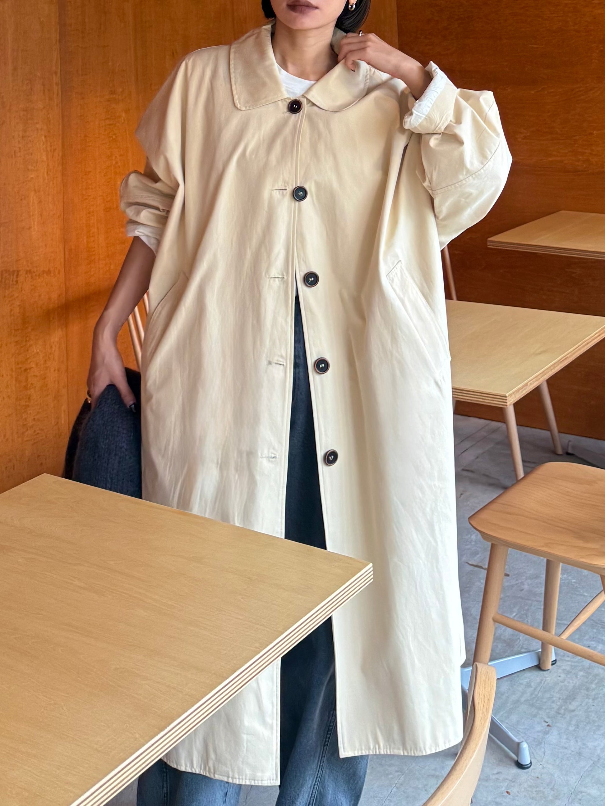 綿と麻を使用した、軽やかな着心地の春ロングコート。 天然素材ならではのナチュラルな風合いで、季節の変わり目にも手に取りやすい一枚です。 身幅をたっぷりと取ったリラックス感のあるシルエットに加え、袖に切り替えを入れることで、自然な丸みのあるフォルムに。 腕まわりにやさしい立体感が生まれ、シンプルながらも柔らかく、女性らしい印象を与えてくれます。 ボタンを留めても開けても様になるデザインにこだわり、ロールアップしたときの袖の表情もスタイリングのさりげないアクセントに◎ 春の空気に自然と馴染み、コーディネート全体を軽やかに見せてくれる色味も魅力です。