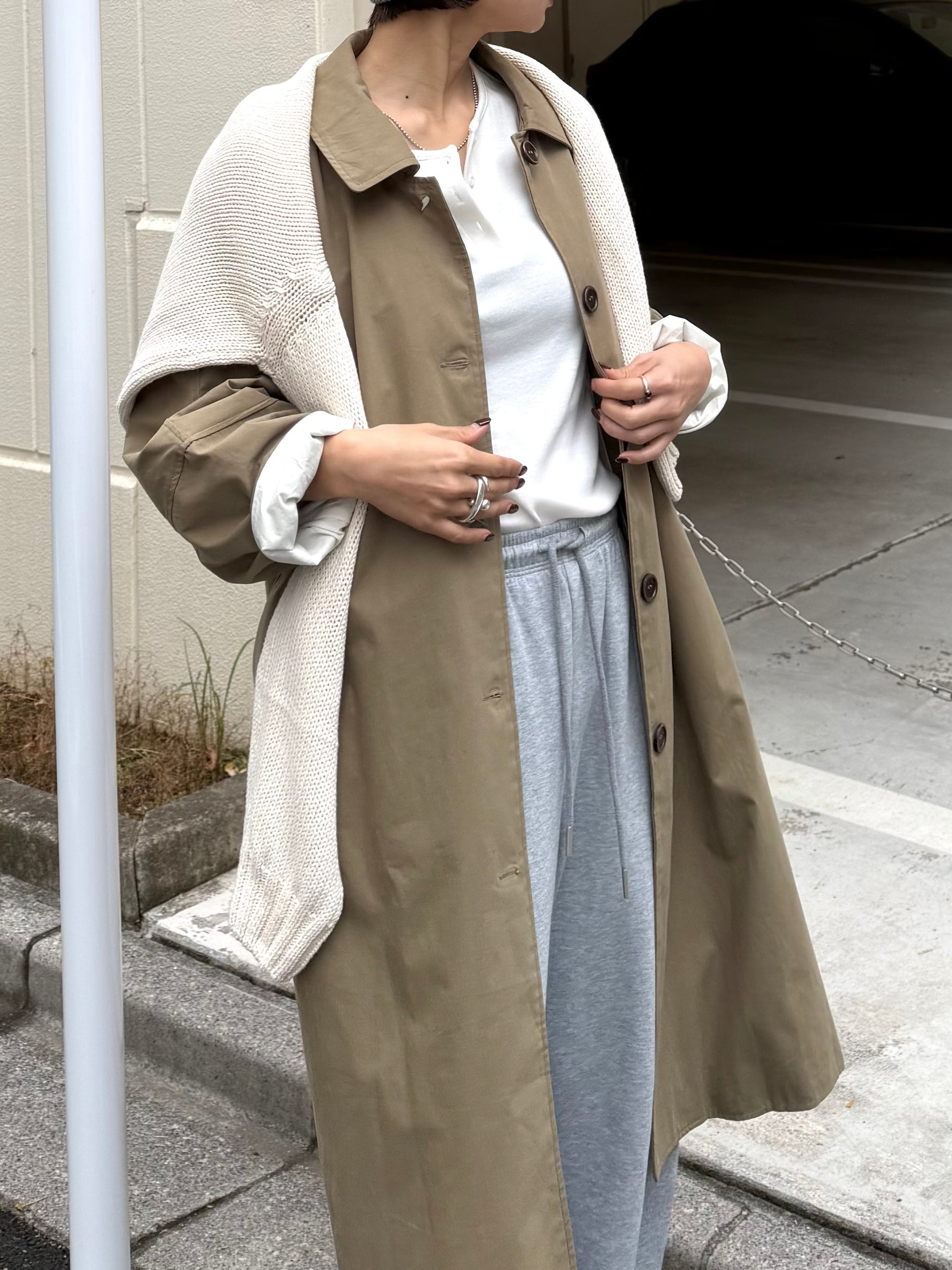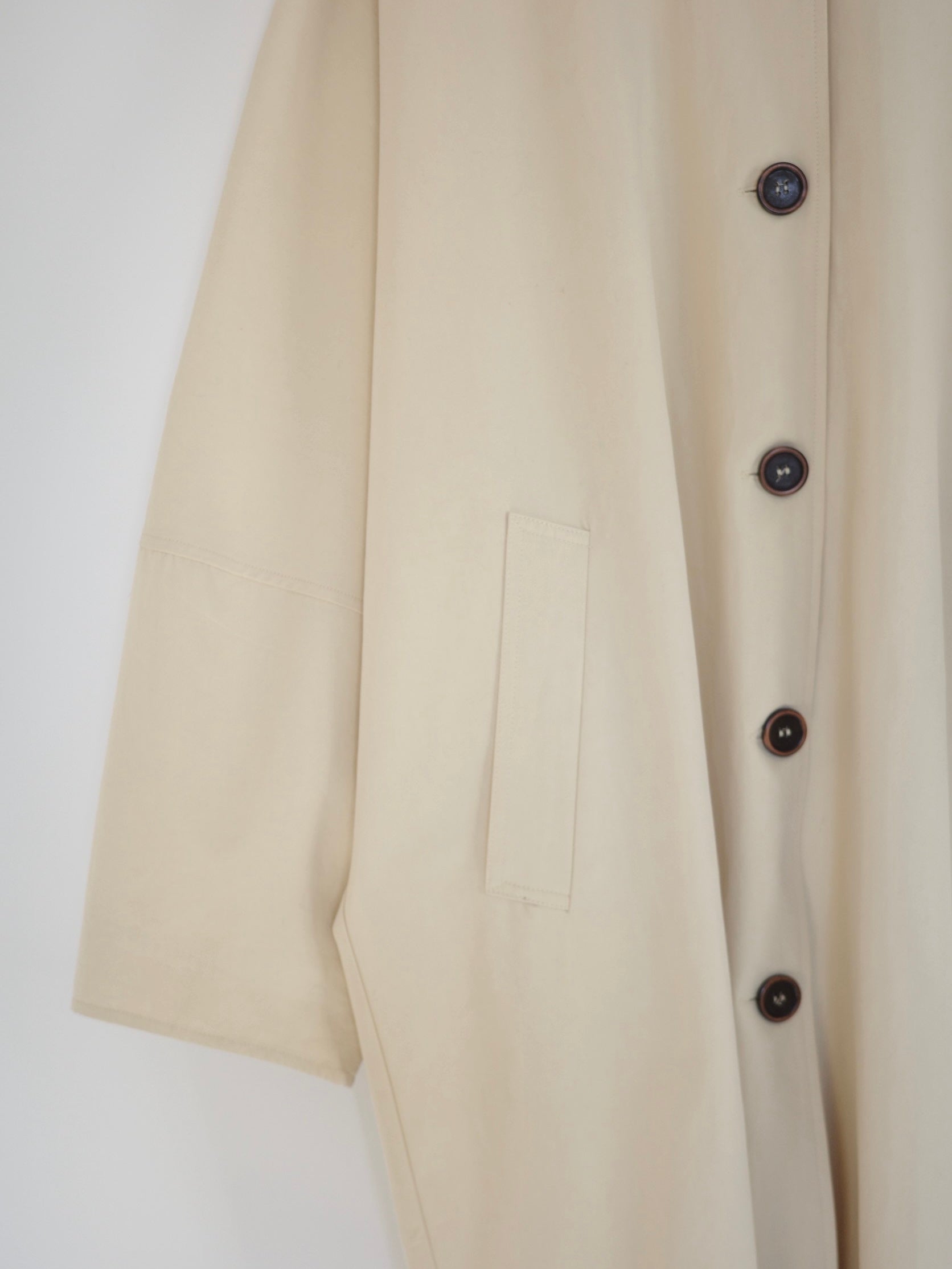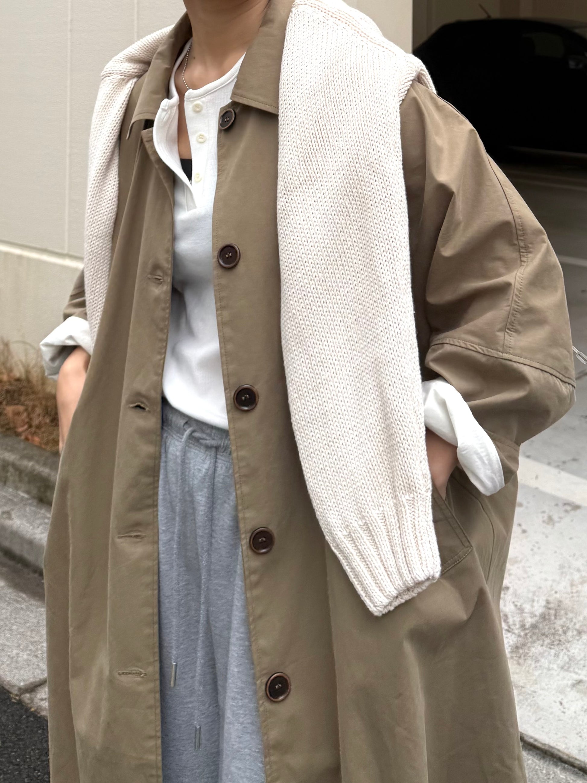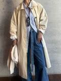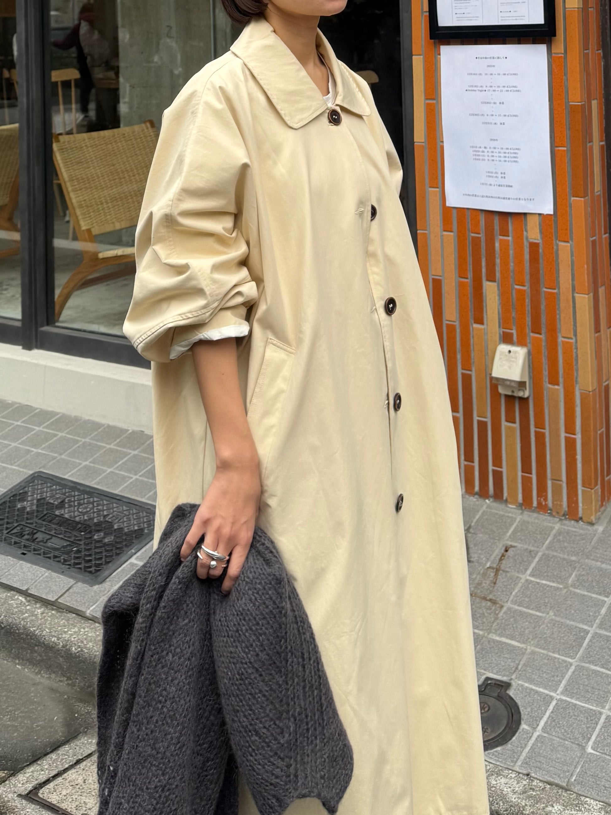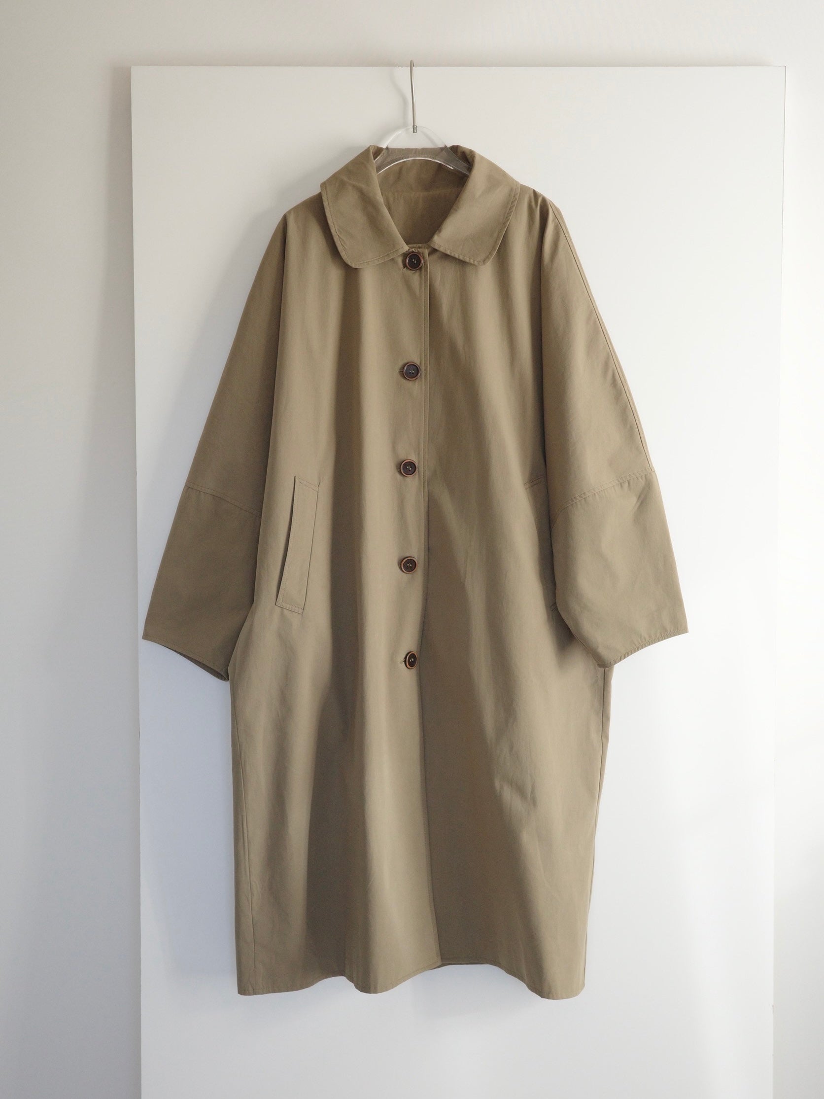 綿と麻を使用した、軽やかな着心地の春ロングコート。 天然素材ならではのナチュラルな風合いで、季節の変わり目にも手に取りやすい一枚です。 身幅をたっぷりと取ったリラックス感のあるシルエットに加え、袖に切り替えを入れることで、自然な丸みのあるフォルムに。 腕まわりにやさしい立体感が生まれ、シンプルながらも柔らかく、女性らしい印象を与えてくれます。 ボタンを留めても開けても様になるデザインにこだわり、ロールアップしたときの袖の表情もスタイリングのさりげないアクセントに◎ 春の空気に自然と馴染み、コーディネート全体を軽やかに見せてくれる色味も魅力です。
