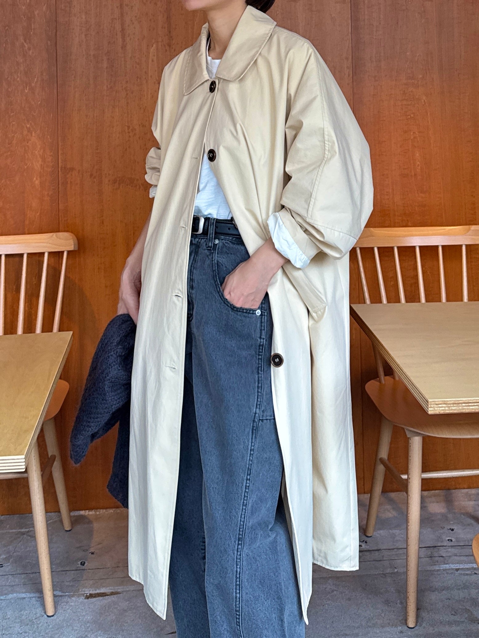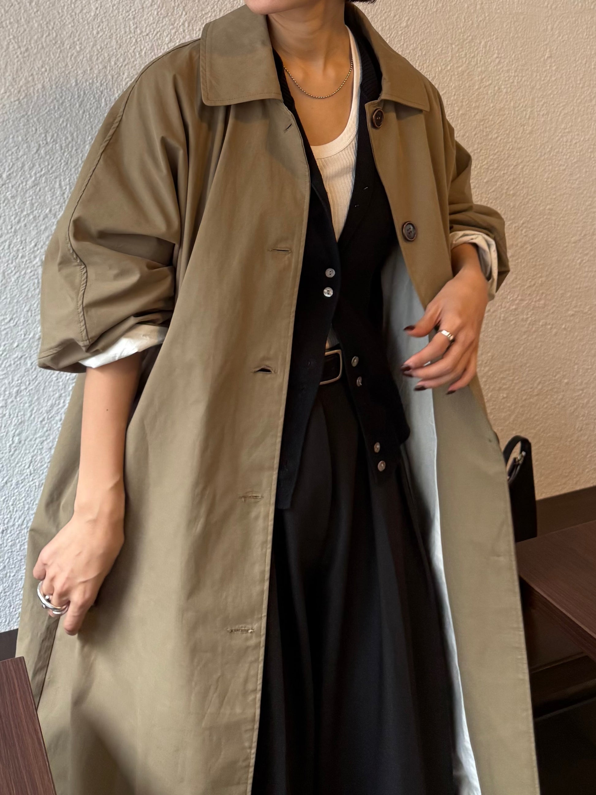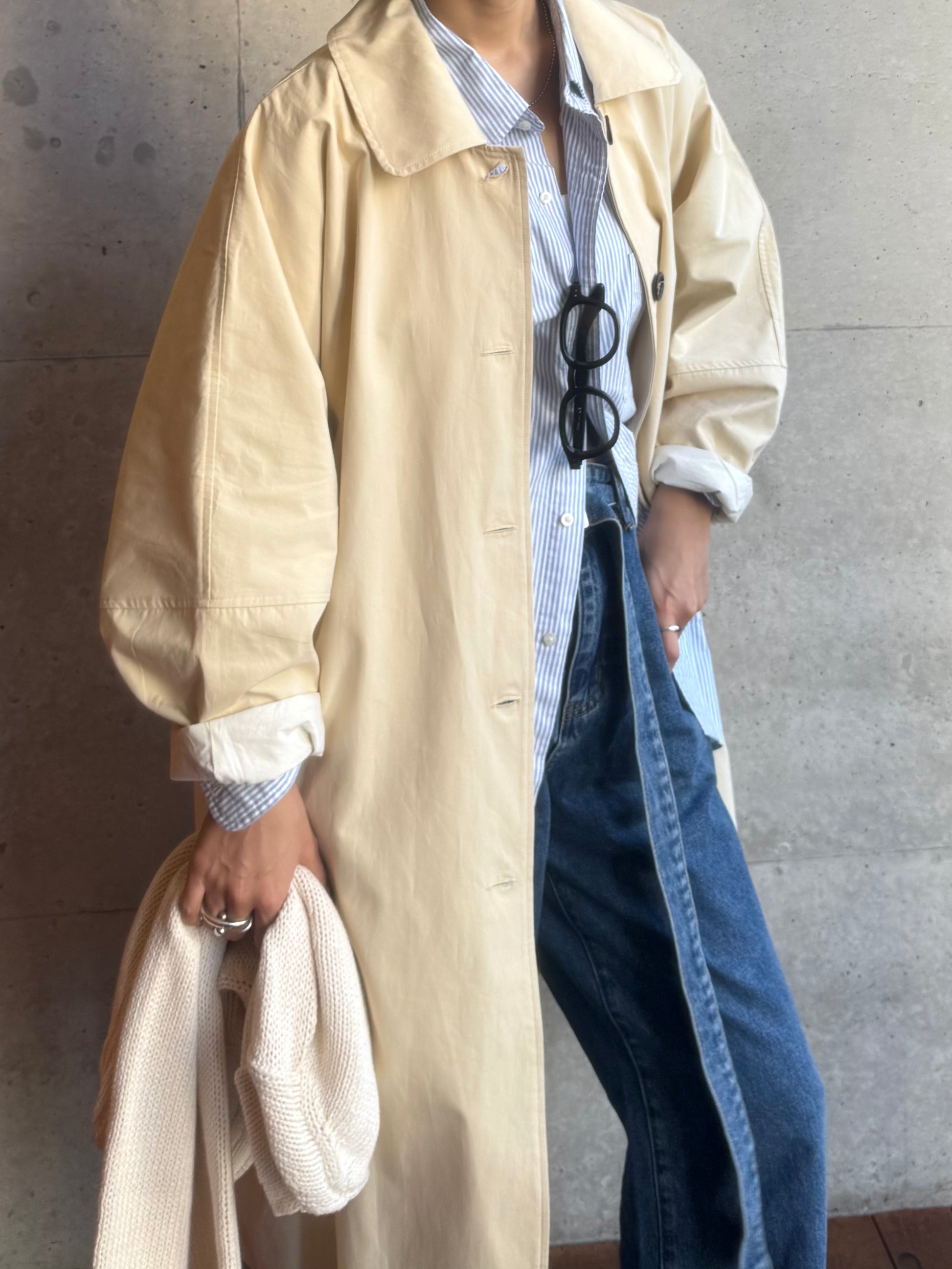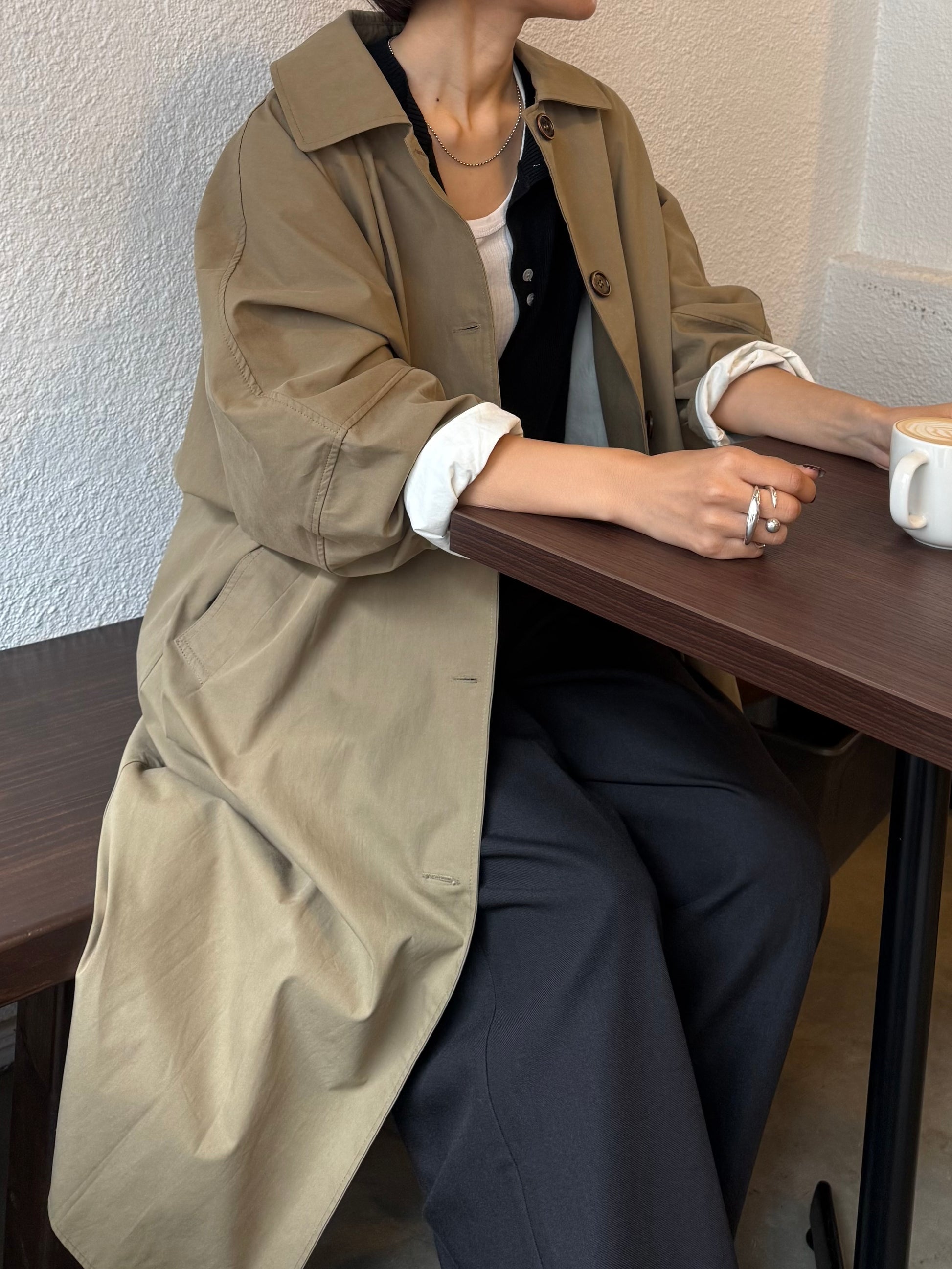 綿と麻を使用した、軽やかな着心地の春ロングコート。 天然素材ならではのナチュラルな風合いで、季節の変わり目にも手に取りやすい一枚です。 身幅をたっぷりと取ったリラックス感のあるシルエットに加え、袖に切り替えを入れることで、自然な丸みのあるフォルムに。 腕まわりにやさしい立体感が生まれ、シンプルながらも柔らかく、女性らしい印象を与えてくれます。 ボタンを留めても開けても様になるデザインにこだわり、ロールアップしたときの袖の表情もスタイリングのさりげないアクセントに◎ 春の空気に自然と馴染み、コーディネート全体を軽やかに見せてくれる色味も魅力です。