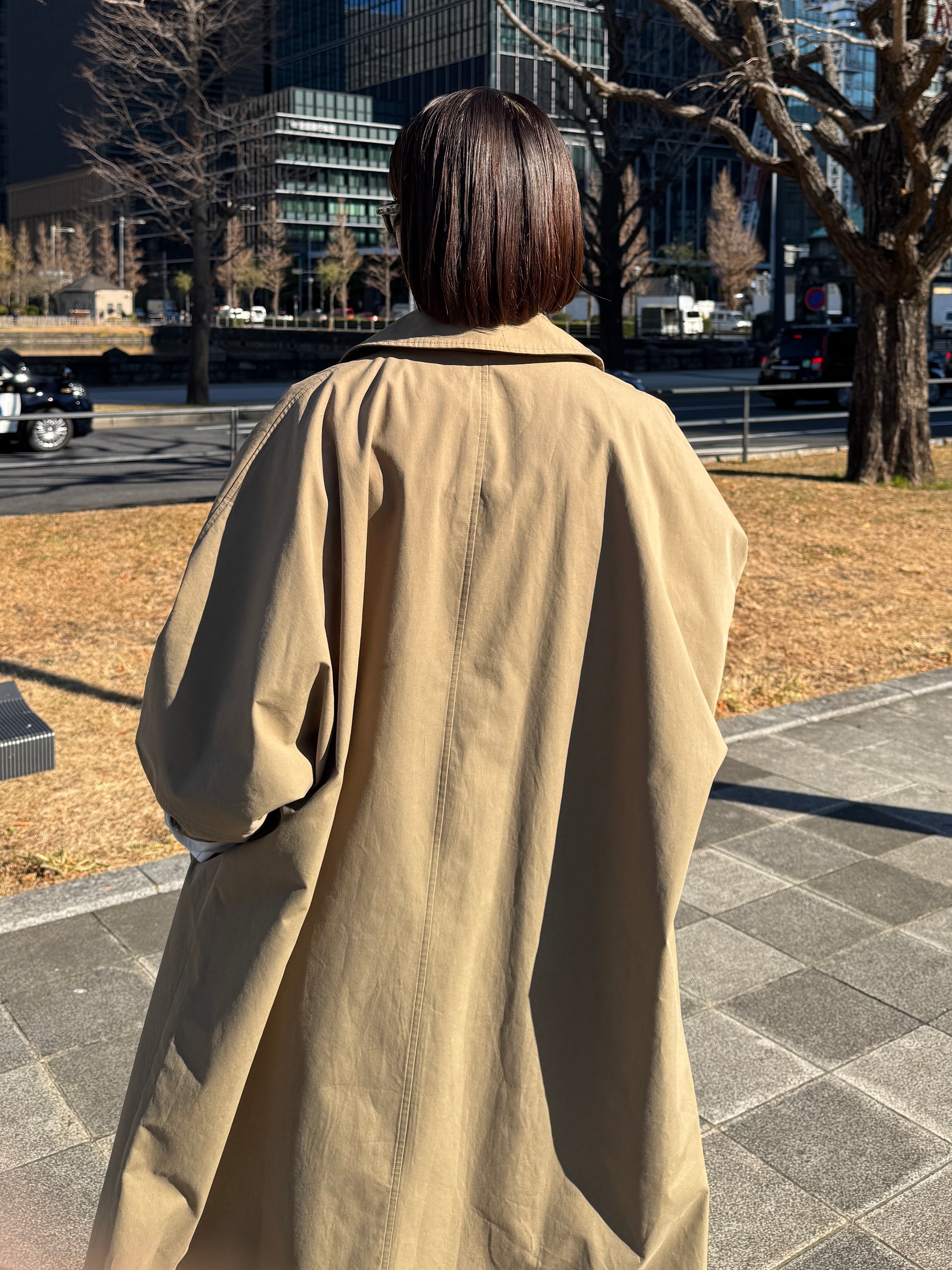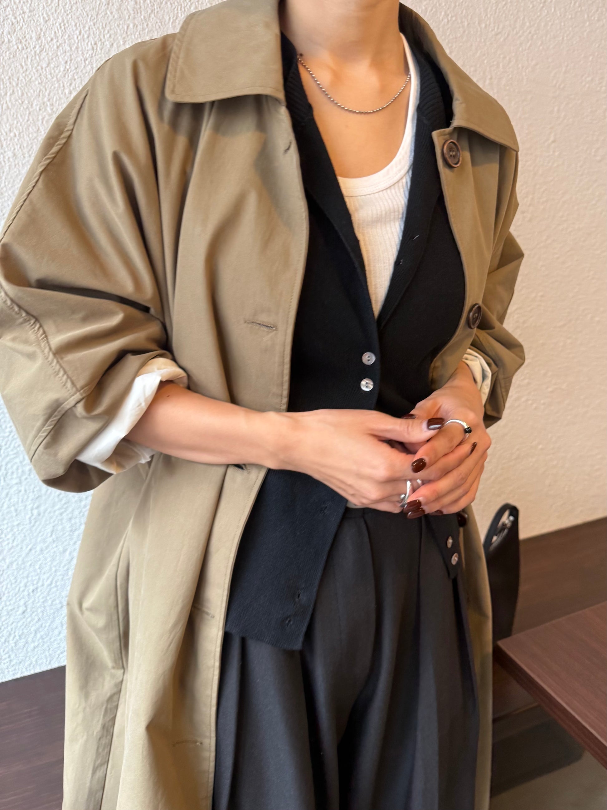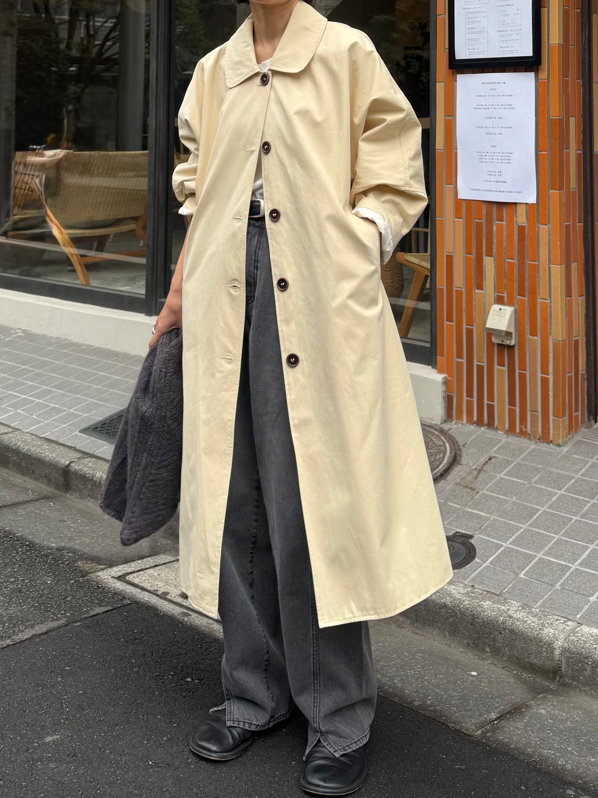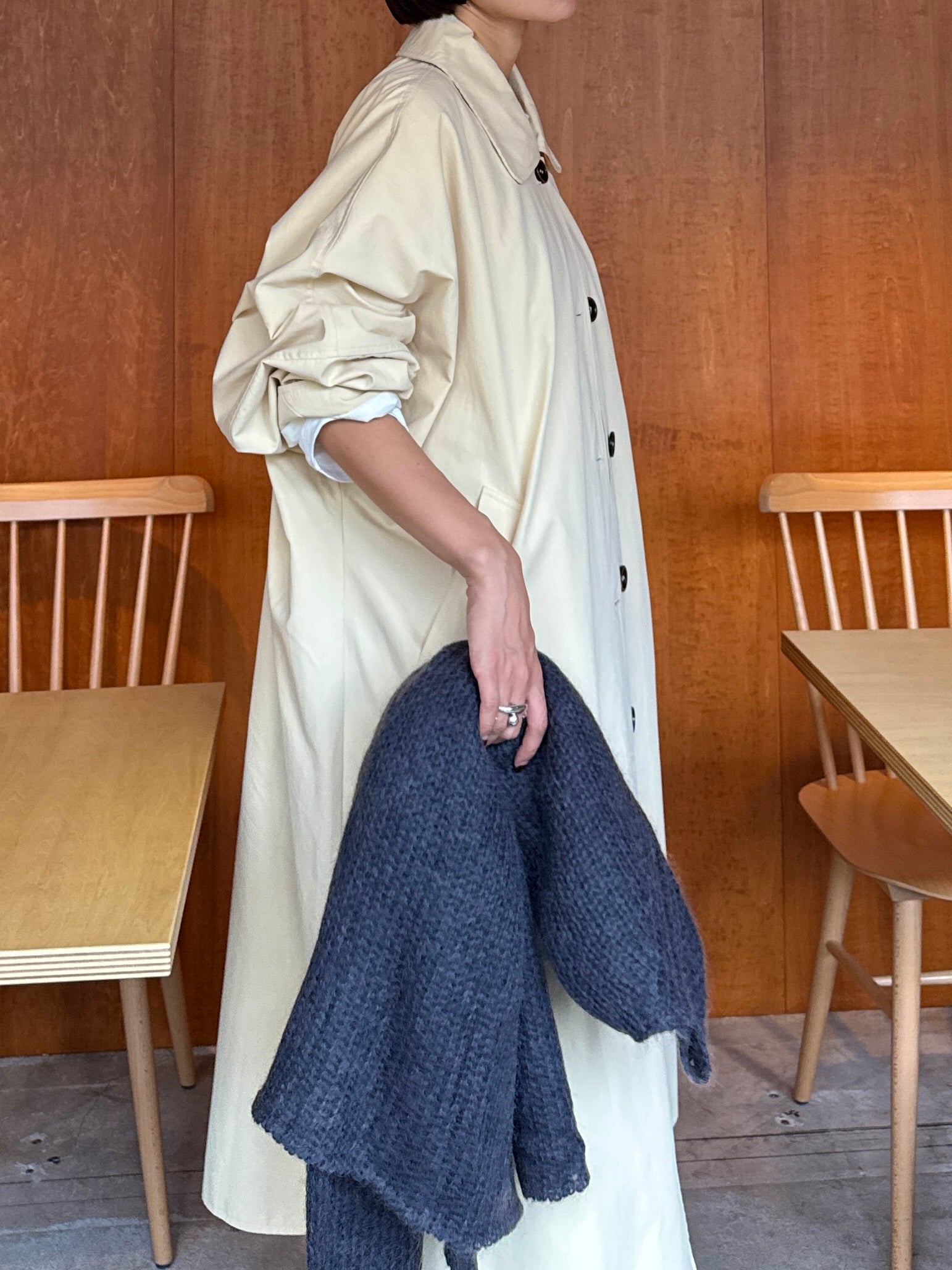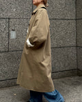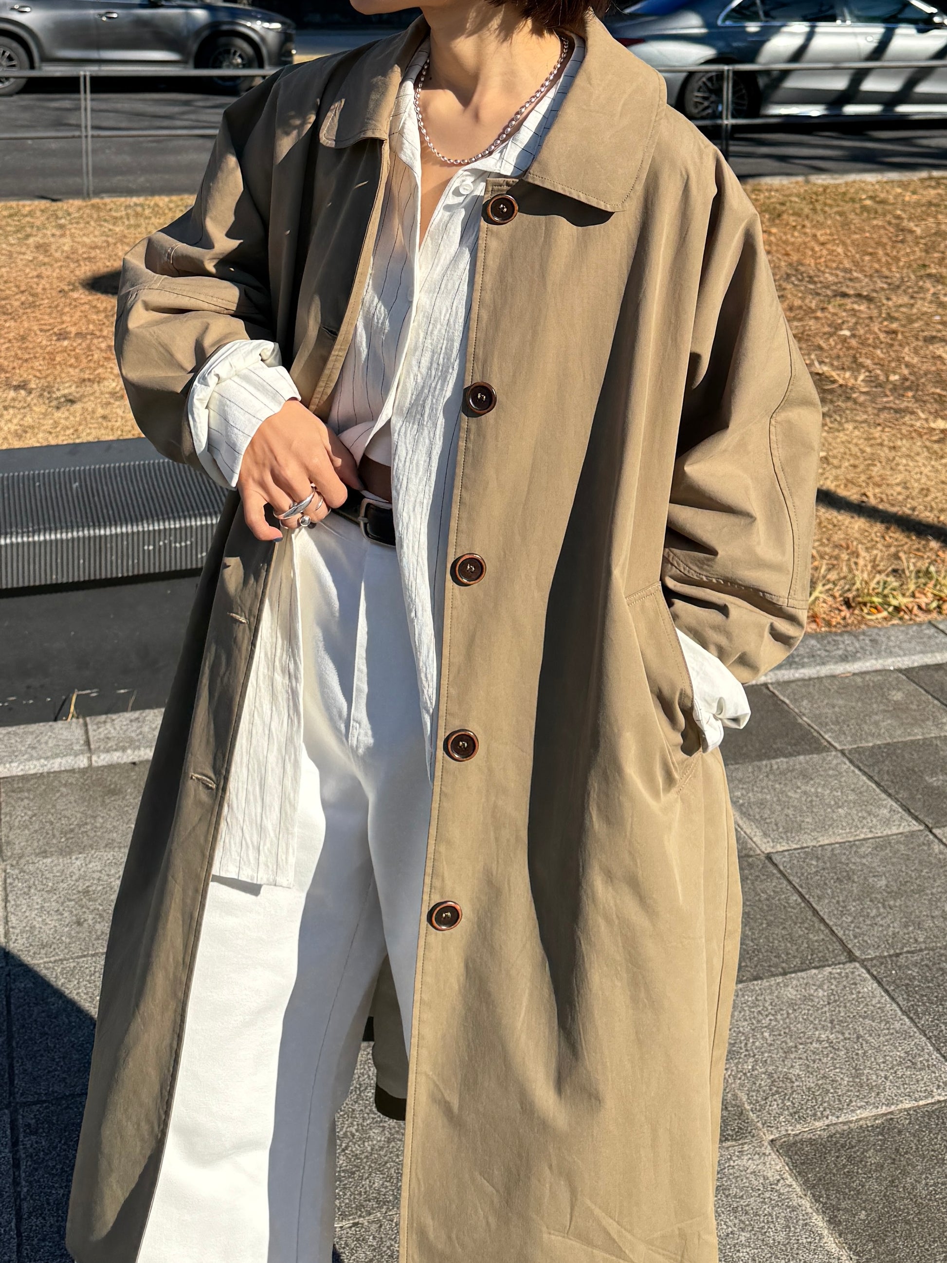 綿と麻を使用した、軽やかな着心地の春ロングコート。 天然素材ならではのナチュラルな風合いで、季節の変わり目にも手に取りやすい一枚です。 身幅をたっぷりと取ったリラックス感のあるシルエットに加え、袖に切り替えを入れることで、自然な丸みのあるフォルムに。 腕まわりにやさしい立体感が生まれ、シンプルながらも柔らかく、女性らしい印象を与えてくれます。 ボタンを留めても開けても様になるデザインにこだわり、ロールアップしたときの袖の表情もスタイリングのさりげないアクセントに◎ 春の空気に自然と馴染み、コーディネート全体を軽やかに見せてくれる色味も魅力です。