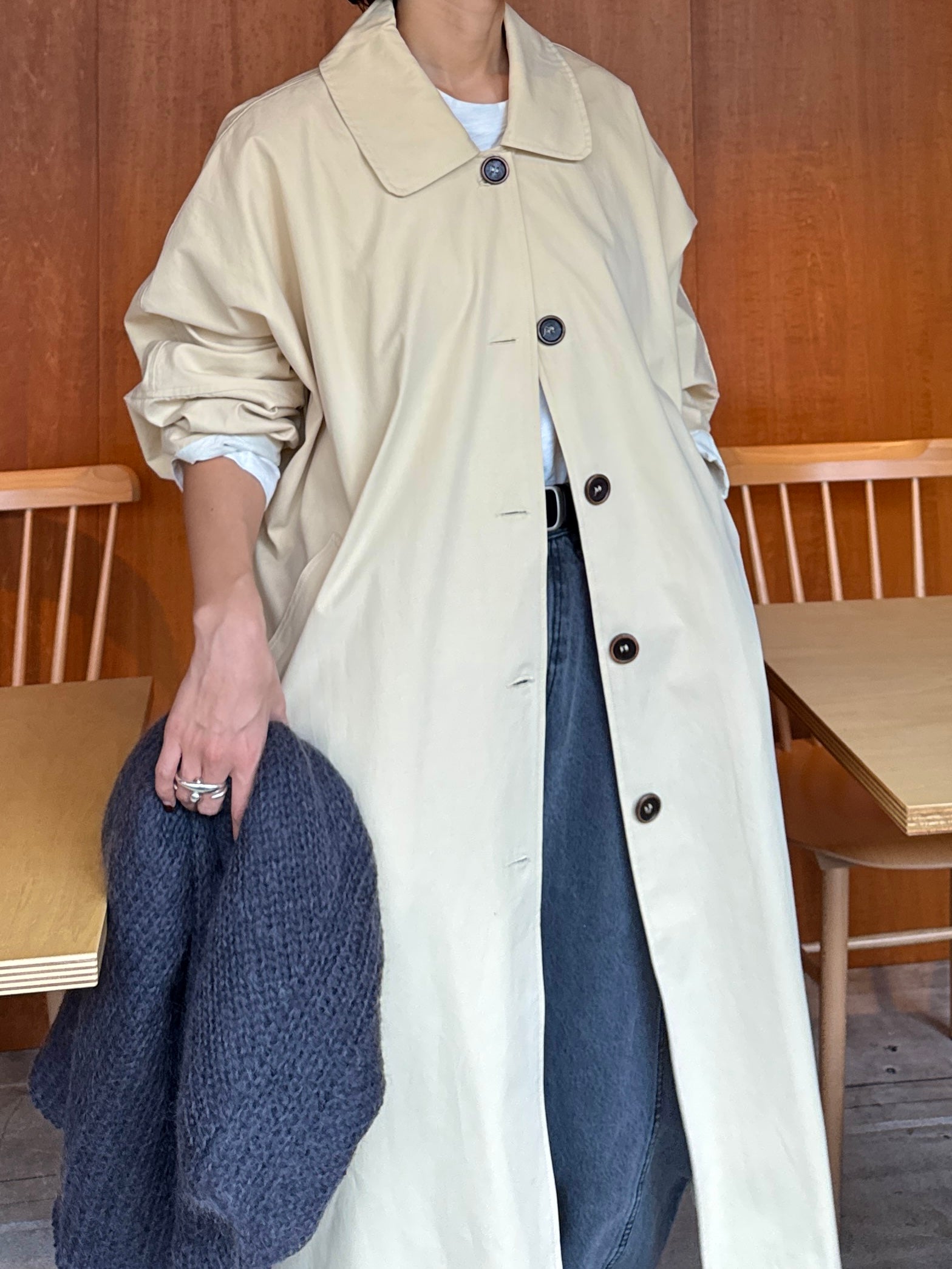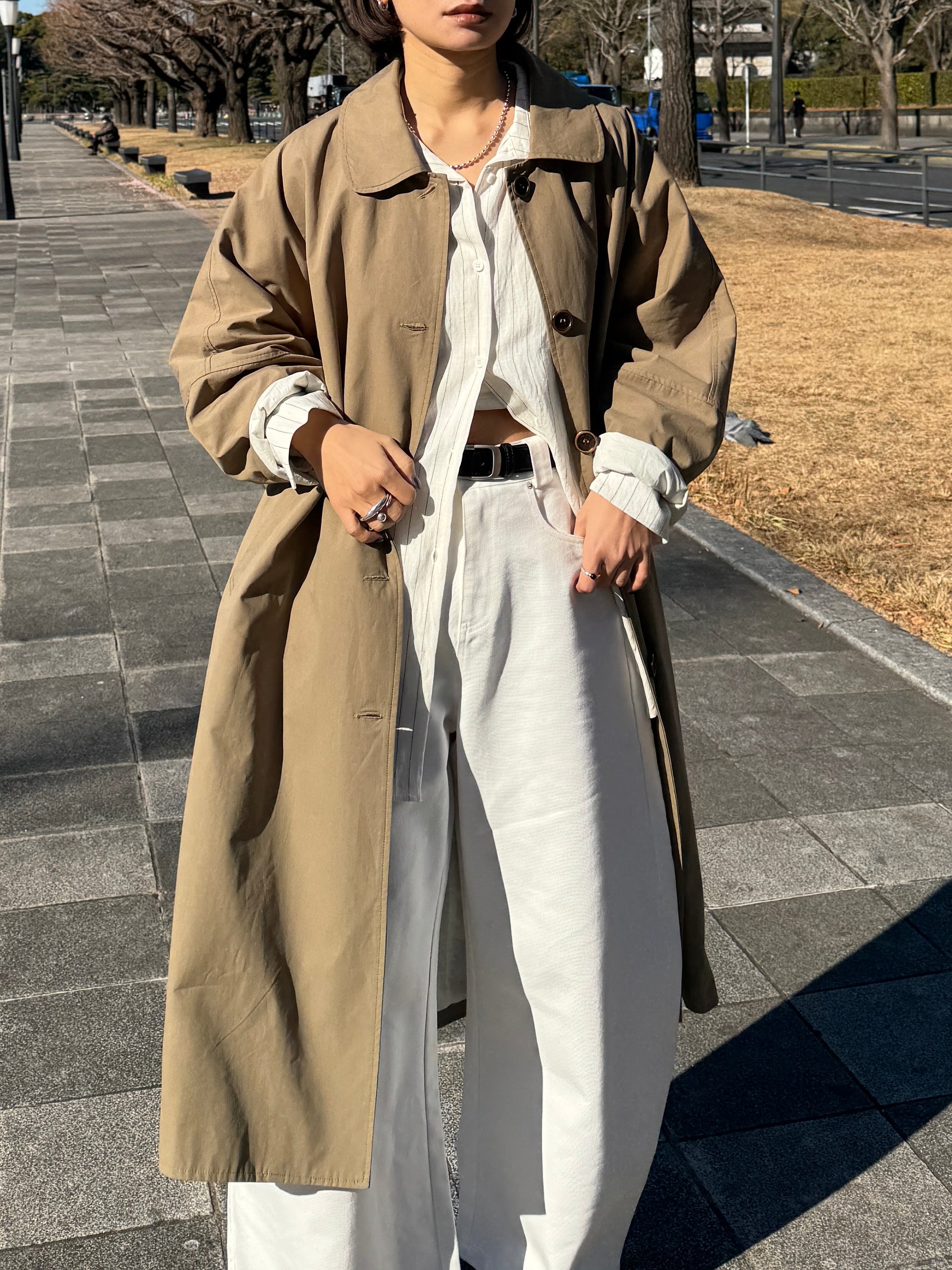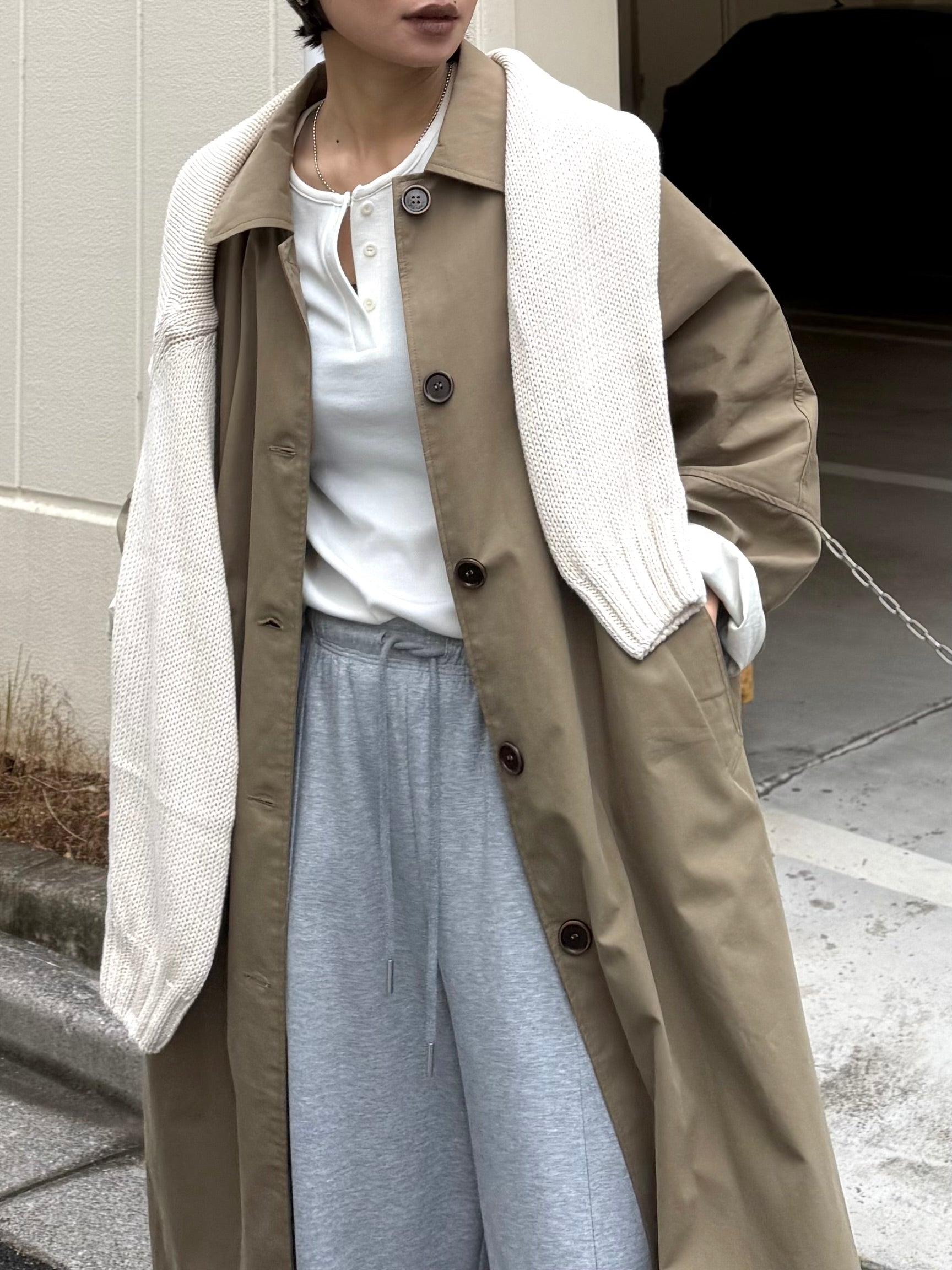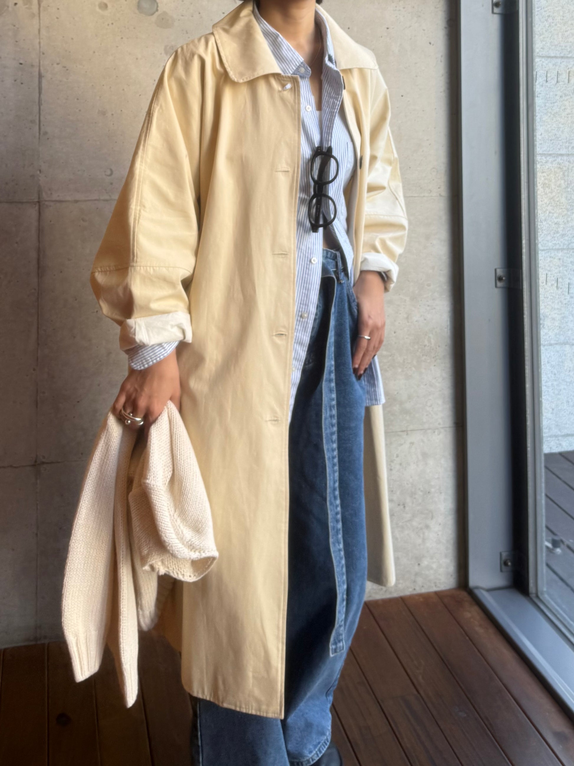 綿と麻を使用した、軽やかな着心地の春ロングコート。 天然素材ならではのナチュラルな風合いで、季節の変わり目にも手に取りやすい一枚です。 身幅をたっぷりと取ったリラックス感のあるシルエットに加え、袖に切り替えを入れることで、自然な丸みのあるフォルムに。 腕まわりにやさしい立体感が生まれ、シンプルながらも柔らかく、女性らしい印象を与えてくれます。 ボタンを留めても開けても様になるデザインにこだわり、ロールアップしたときの袖の表情もスタイリングのさりげないアクセントに◎ 春の空気に自然と馴染み、コーディネート全体を軽やかに見せてくれる色味も魅力です。