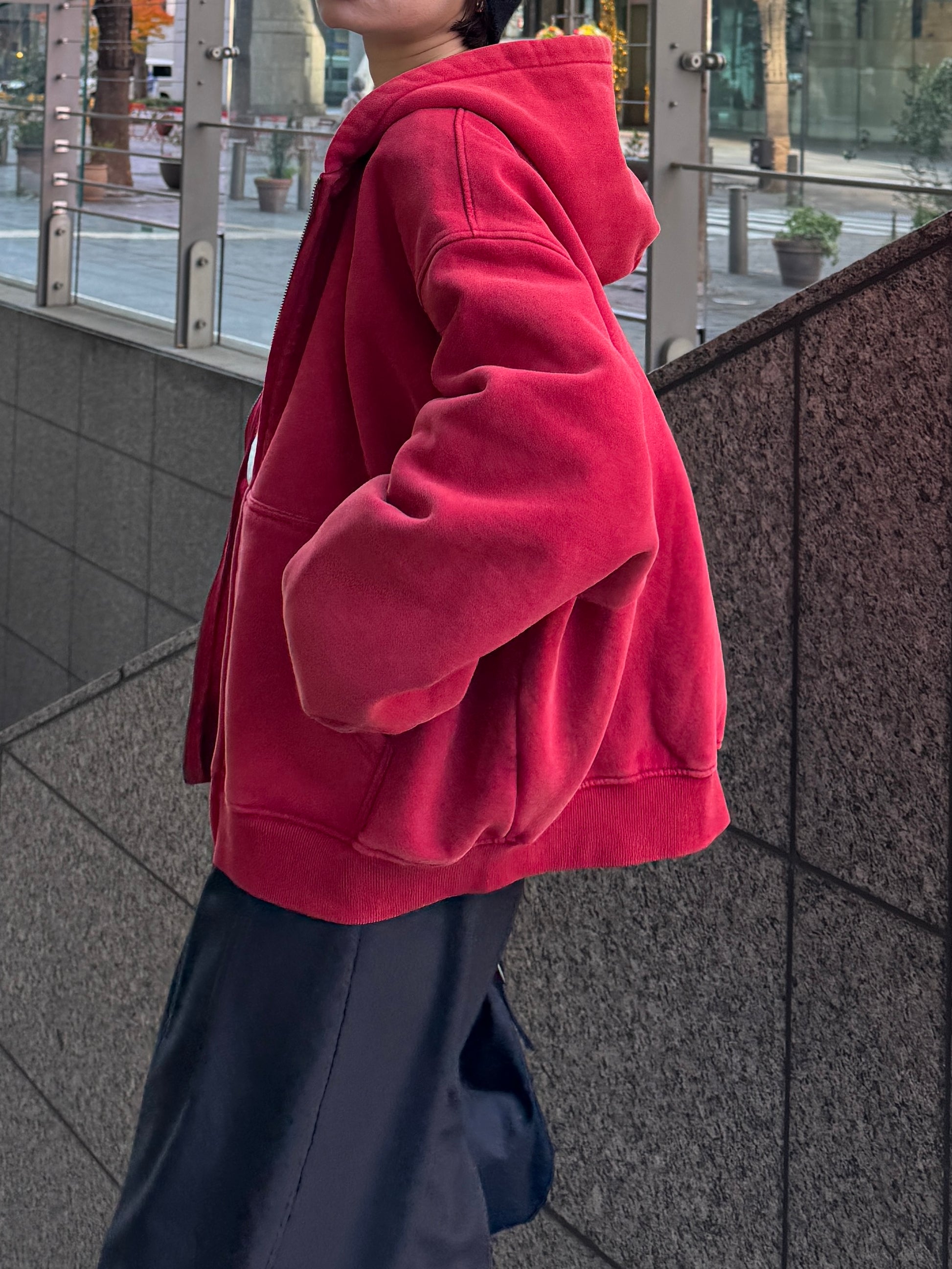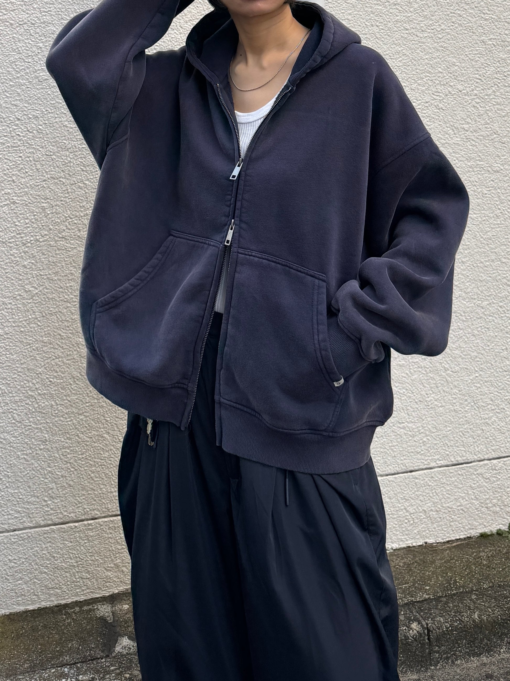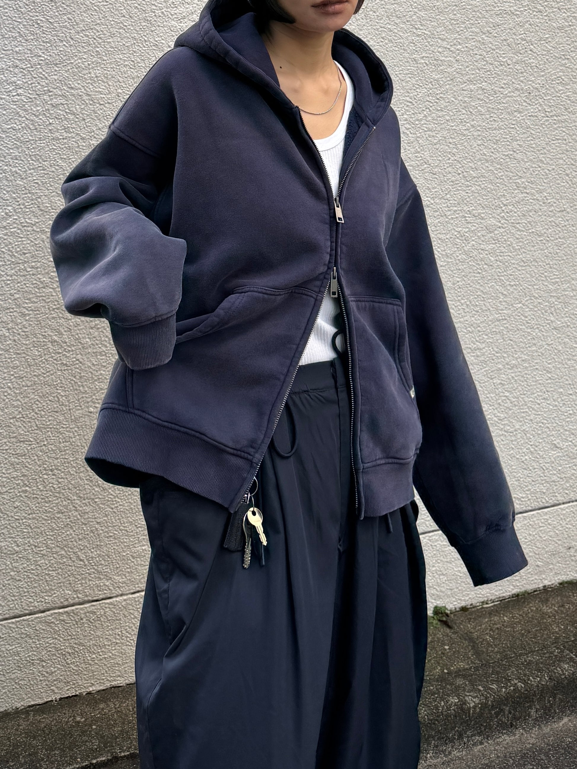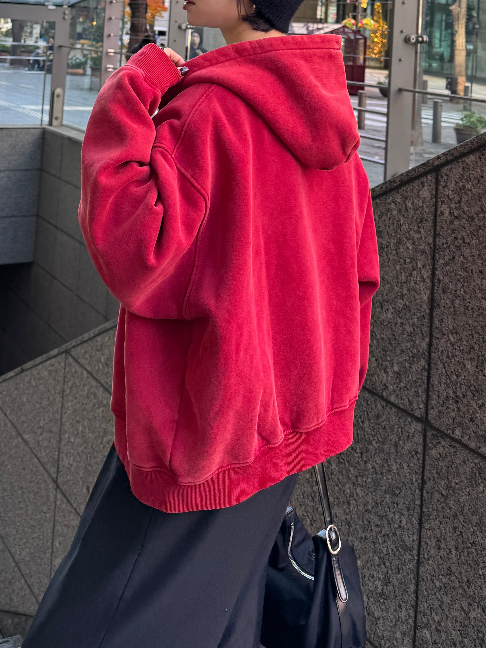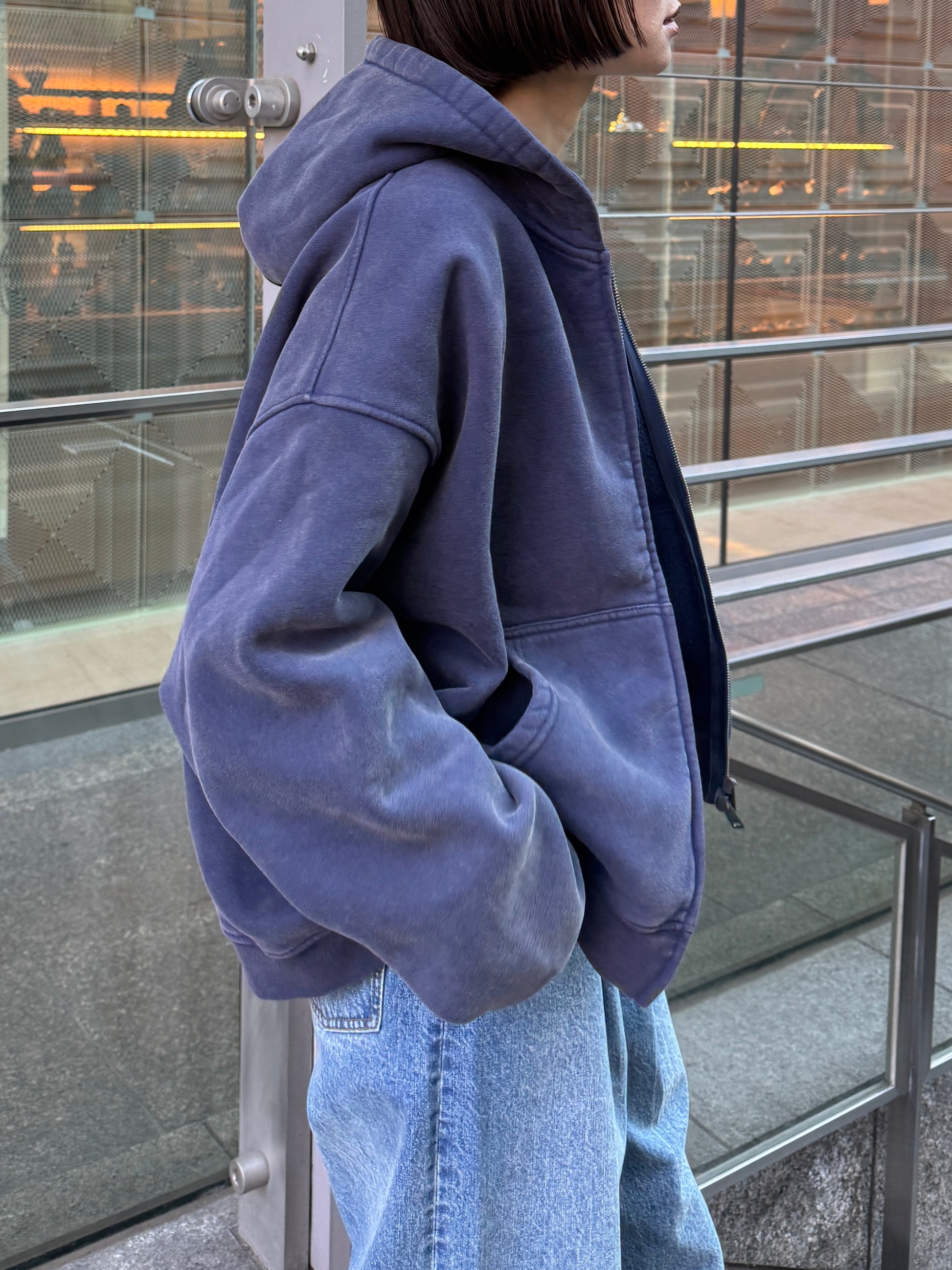 程よく色褪せたような風合いが魅力の、ヴィンテージライクなウォッシュフーディー。 やわらかく肌馴染みのいい生地に、裏起毛を施し冬から春にかけて心地よく着られる1枚。 肩のラインを落としたリラックス感のあるシルエットに、程よいボリュームの袖がラフさの中に女性らしいやわらかさをプラス。 様々なボトムスにバランス良く馴染みやすい、短すぎず長すぎない着丈設定で仕上げました。 フロントはWジップ仕様の為、ジップの開閉でスタイリングの変化もお楽しみいただけます。 寒い時期は防寒として、春先には軽い羽織りとしても、長い季節寄り添ってくれる、大人のためのフーディーです。