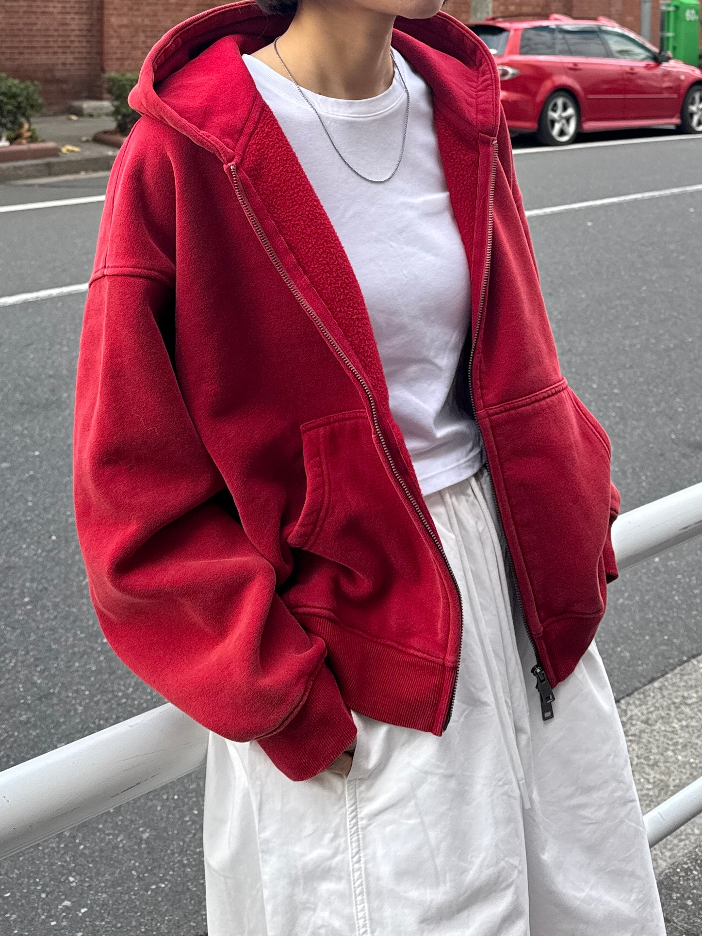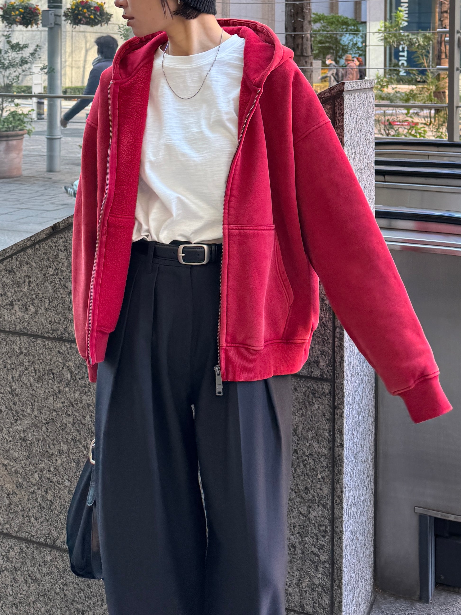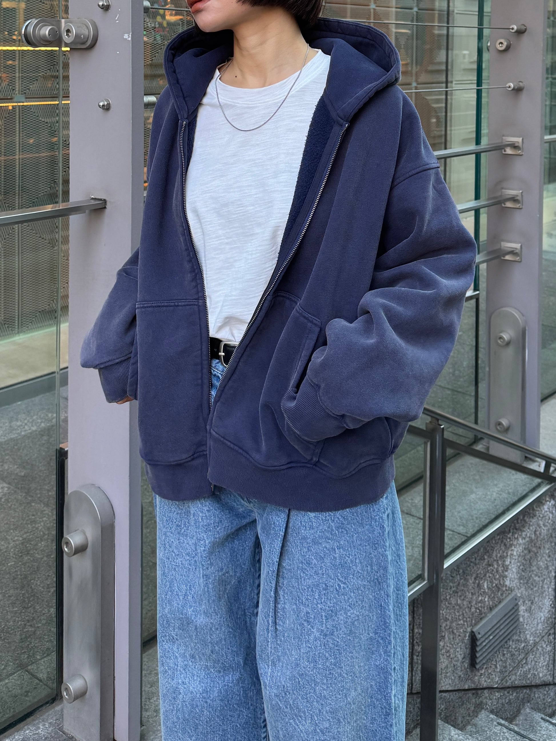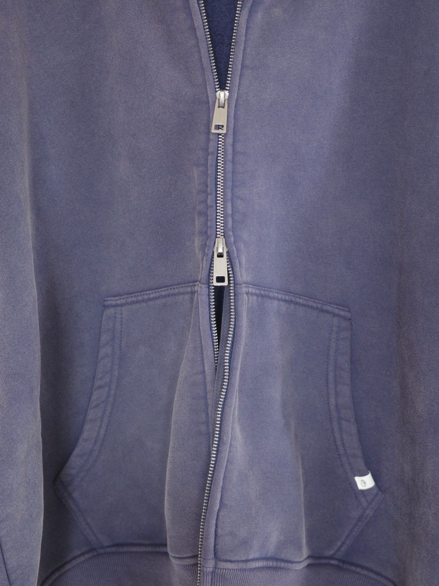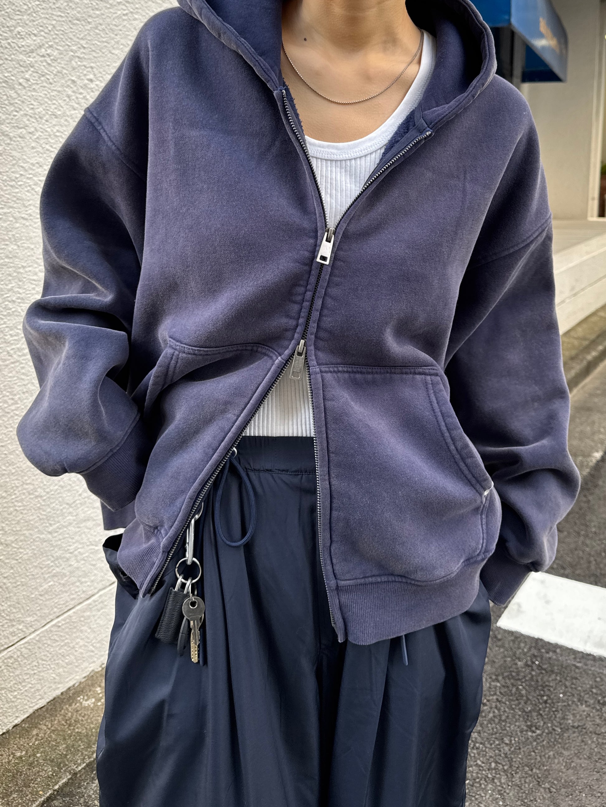 程よく色褪せたような風合いが魅力の、ヴィンテージライクなウォッシュフーディー。 やわらかく肌馴染みのいい生地に、裏起毛を施し冬から春にかけて心地よく着られる1枚。 肩のラインを落としたリラックス感のあるシルエットに、程よいボリュームの袖がラフさの中に女性らしいやわらかさをプラス。 様々なボトムスにバランス良く馴染みやすい、短すぎず長すぎない着丈設定で仕上げました。 フロントはWジップ仕様の為、ジップの開閉でスタイリングの変化もお楽しみいただけます。 寒い時期は防寒として、春先には軽い羽織りとしても、長い季節寄り添ってくれる、大人のためのフーディーです。