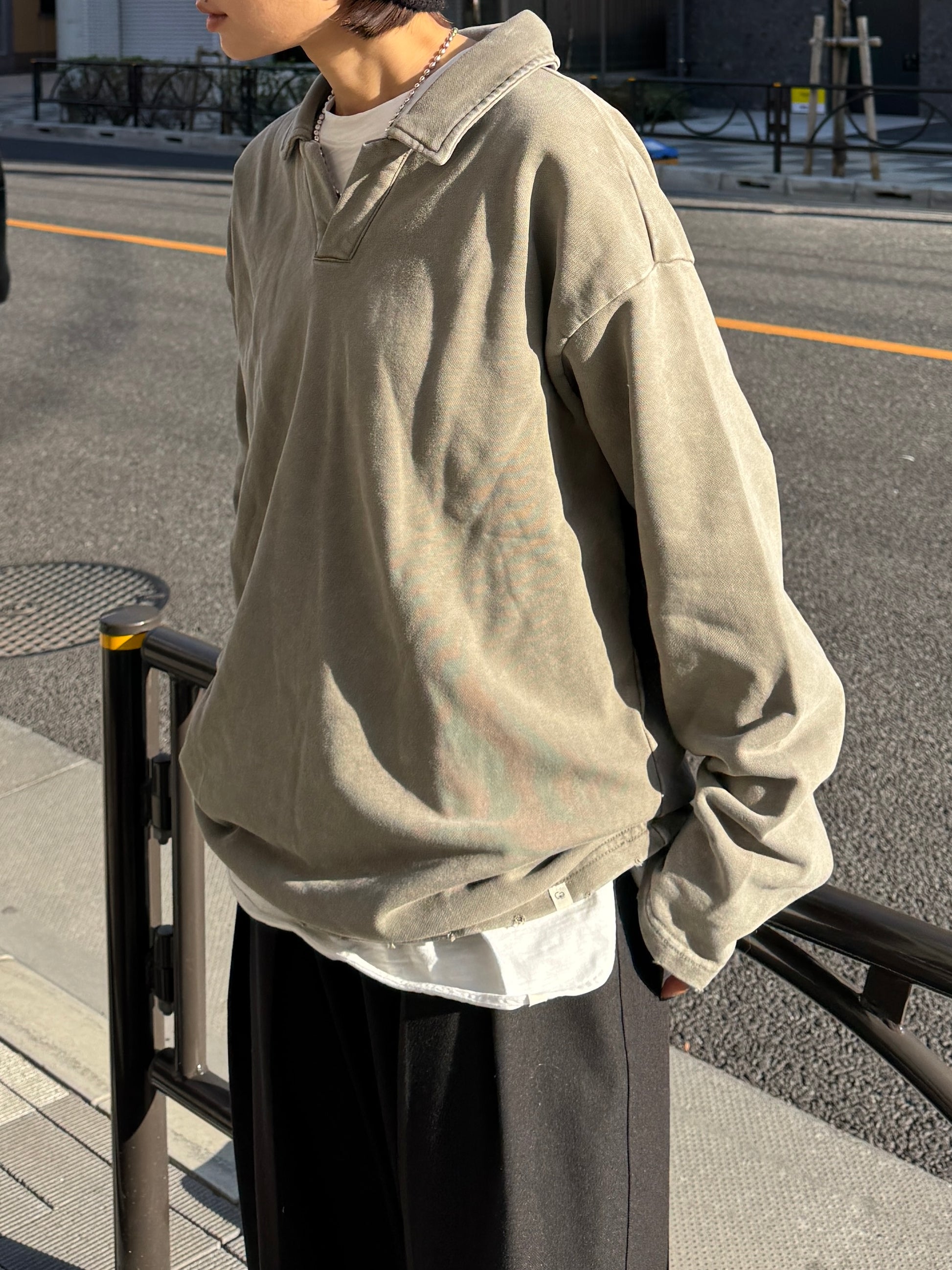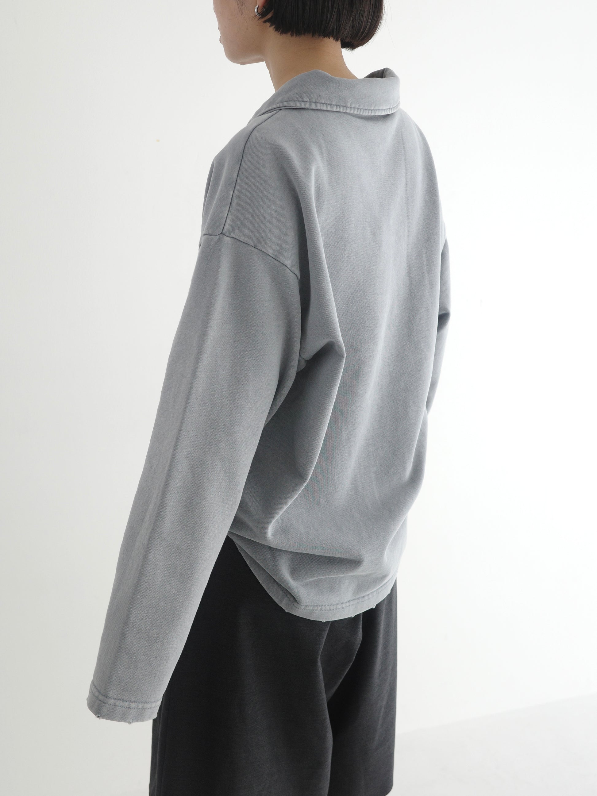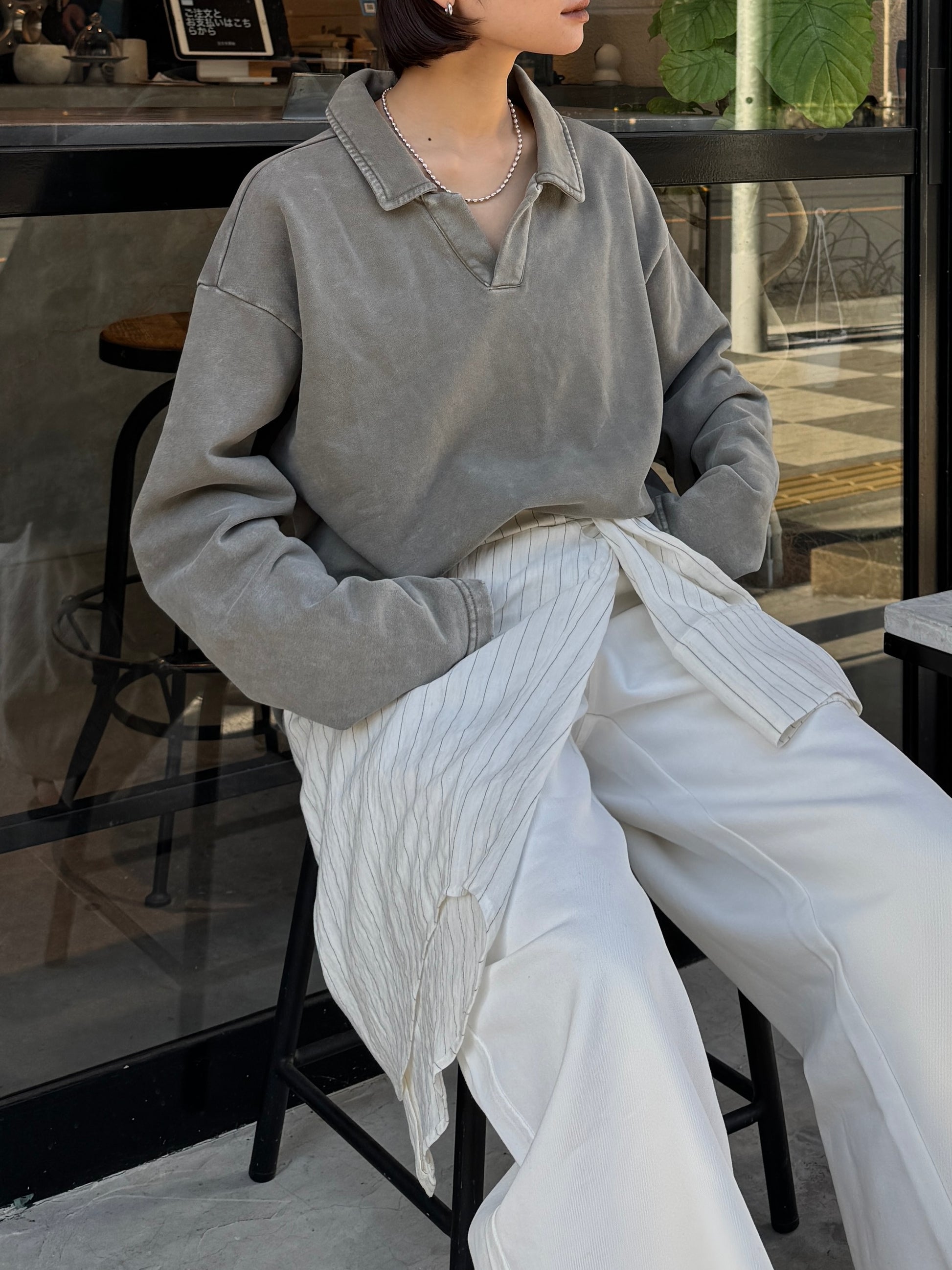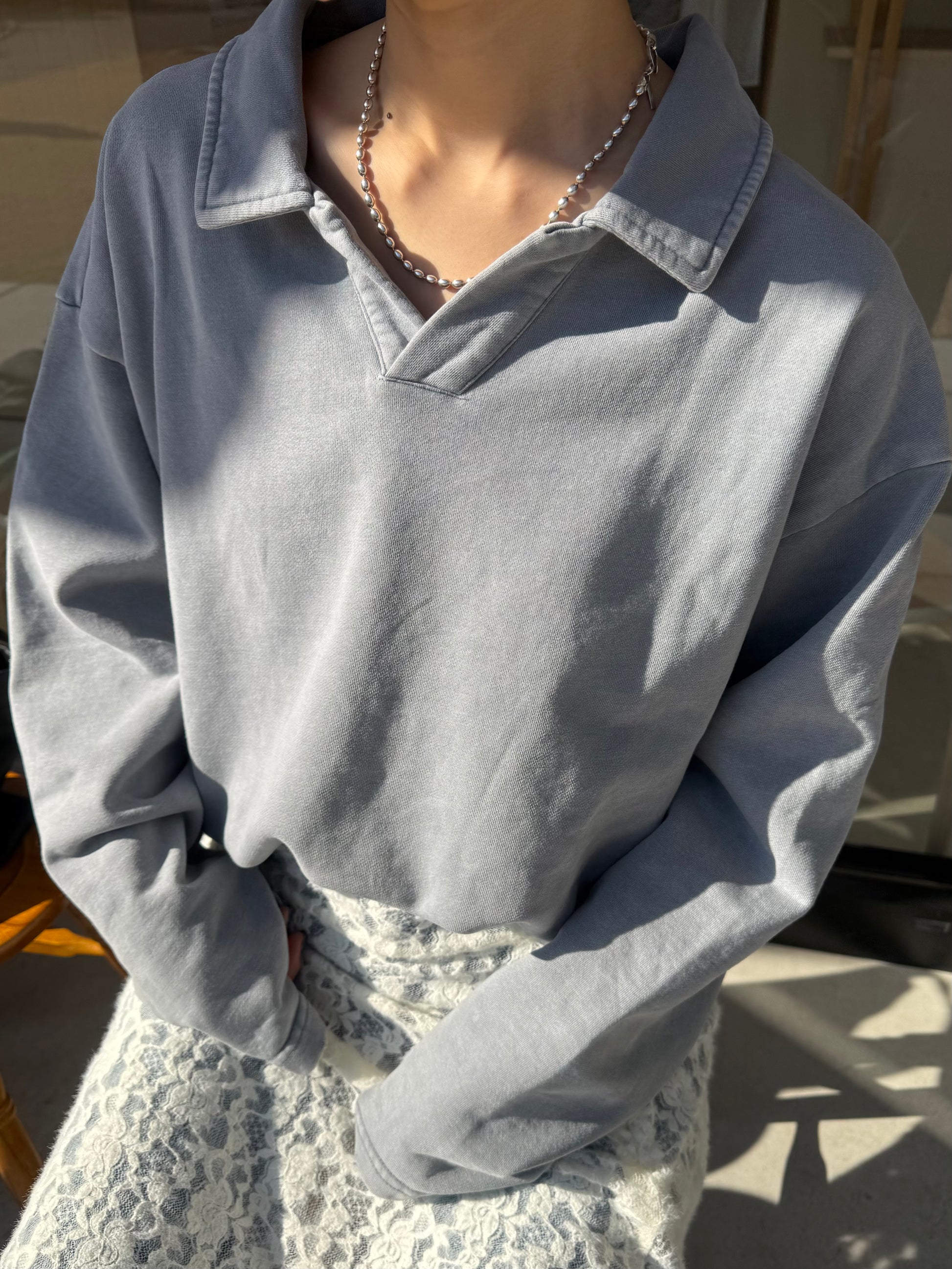 ヴィンテージライクなウォッシュ感が印象的な、襟付きスウェットトップス。 程よく色褪せた表情に加え、袖口と裾に施したさりげないダメージ加工が、ラフさの中に抜け感をプラスします。 肩の力を抜いて着られる、ほどよくゆとりのあるシルエットも魅力。 落ち感のある素材とやわらかなフォルムが、カジュアルになりすぎず、さりげなく女性らしい印象に仕上げてくれます。 肌寒い時期から春に向けて、レイヤード次第で軽やかな季節感を楽しめる1枚です。