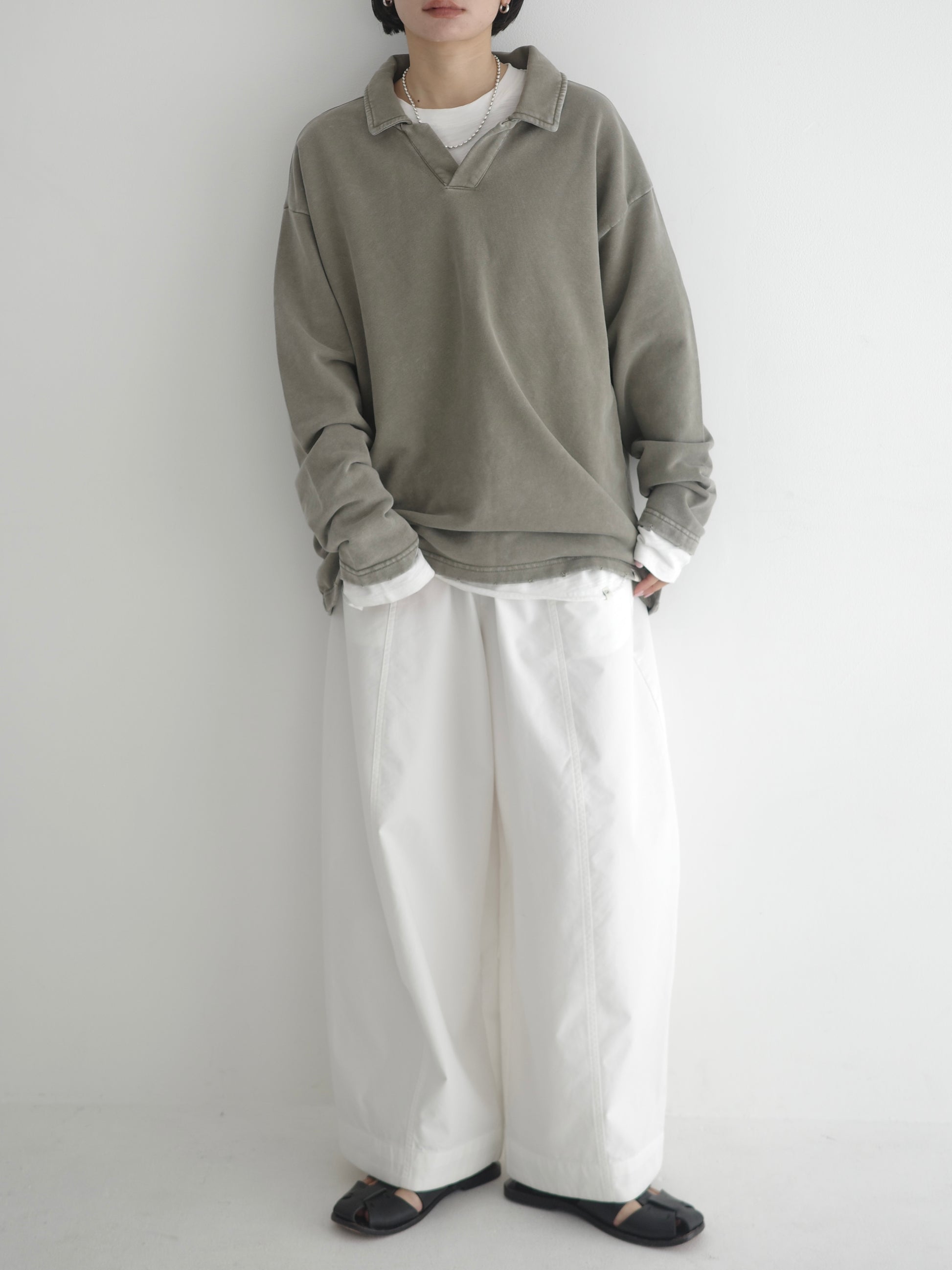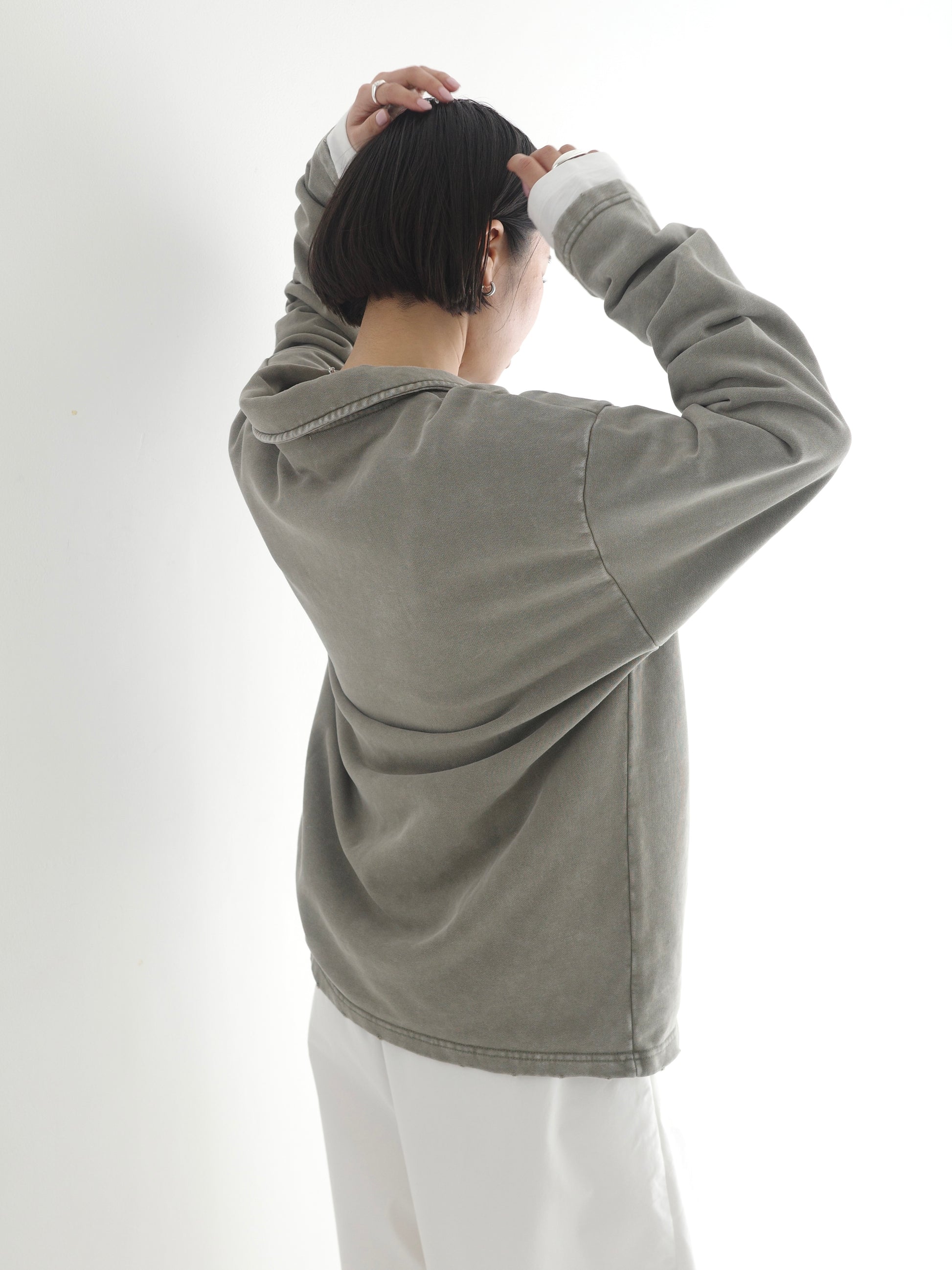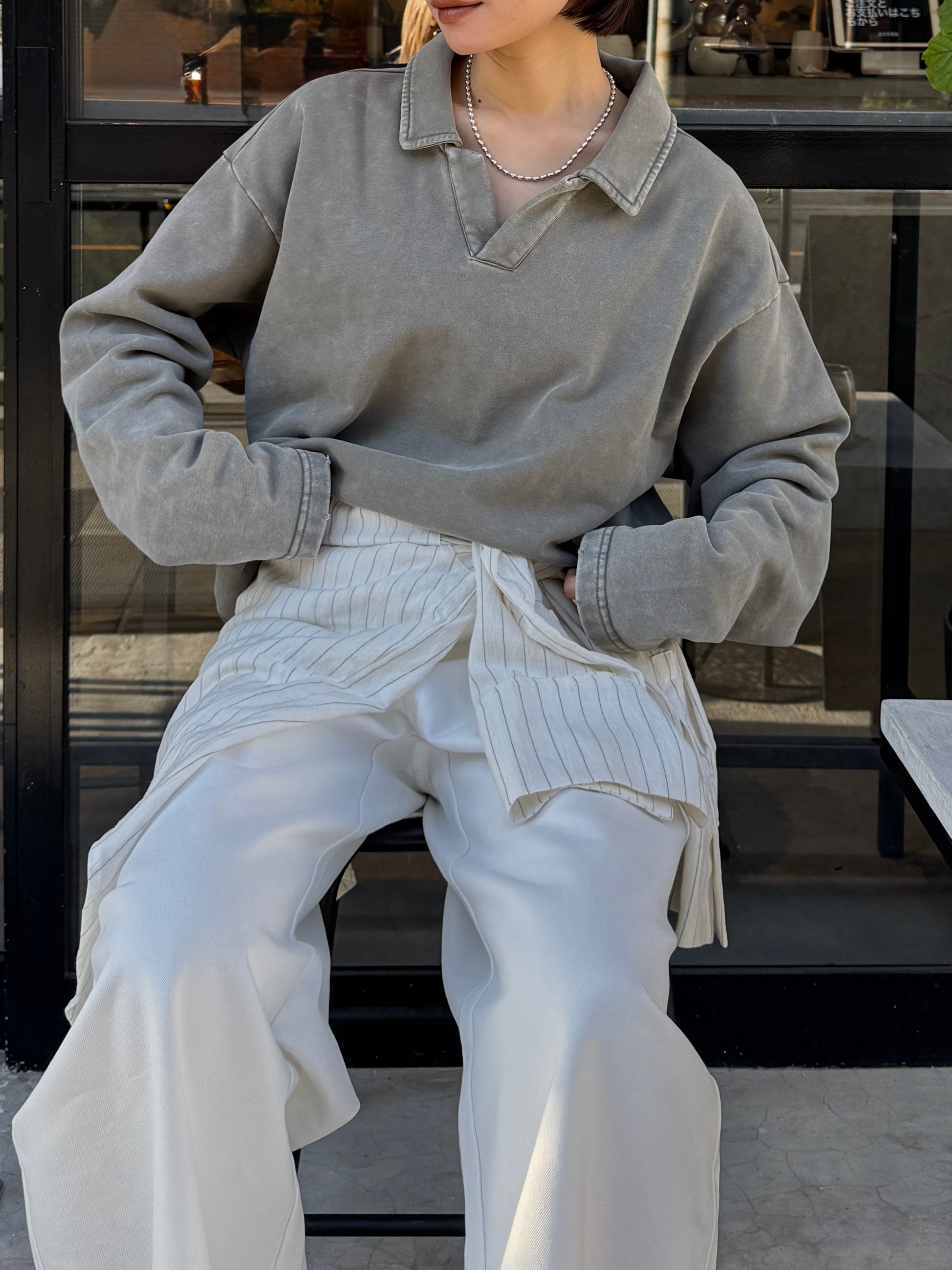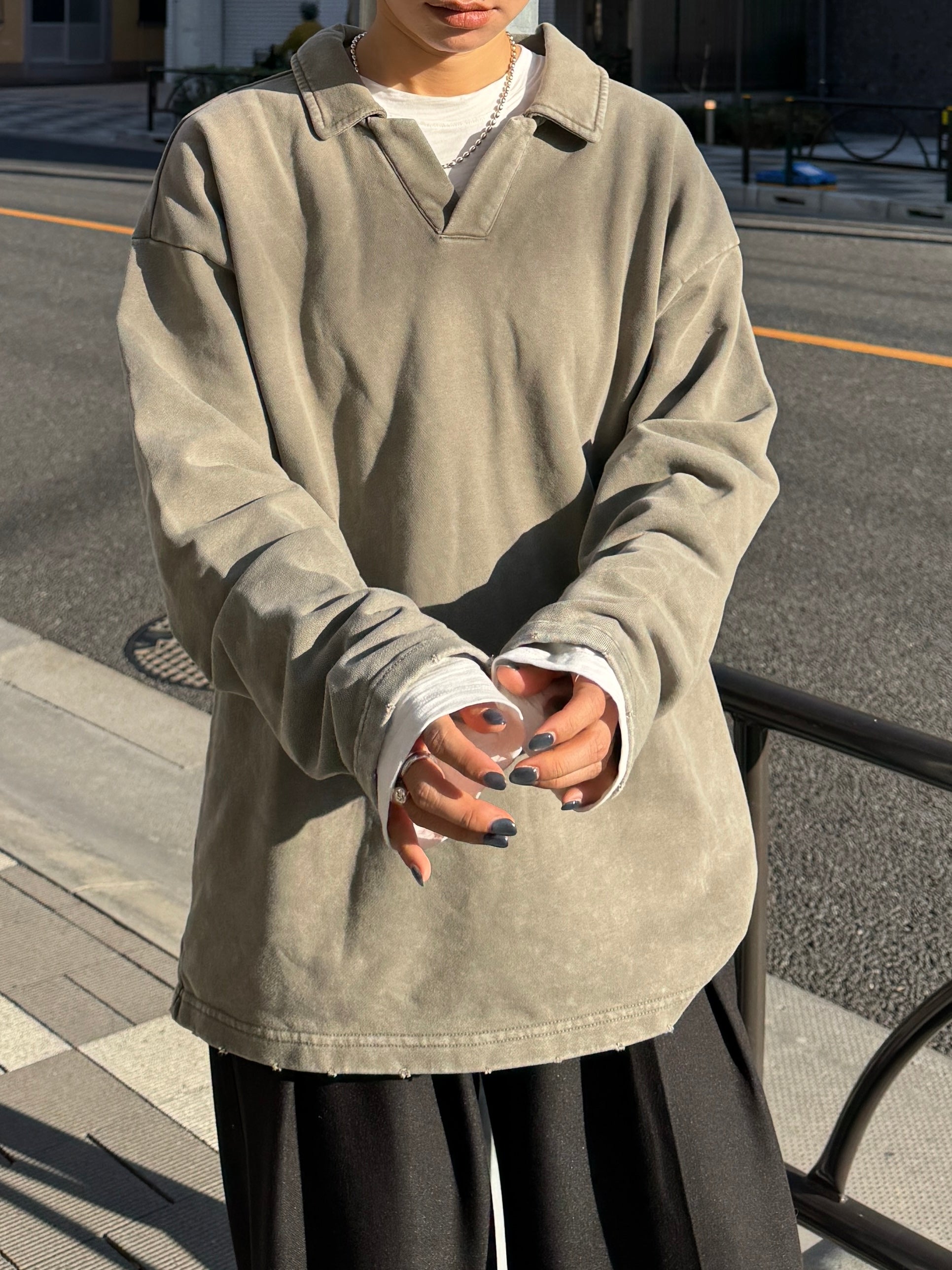 ヴィンテージライクなウォッシュ感が印象的な、襟付きスウェットトップス。 程よく色褪せた表情に加え、袖口と裾に施したさりげないダメージ加工が、ラフさの中に抜け感をプラスします。 肩の力を抜いて着られる、ほどよくゆとりのあるシルエットも魅力。 落ち感のある素材とやわらかなフォルムが、カジュアルになりすぎず、さりげなく女性らしい印象に仕上げてくれます。 肌寒い時期から春に向けて、レイヤード次第で軽やかな季節感を楽しめる1枚です。
