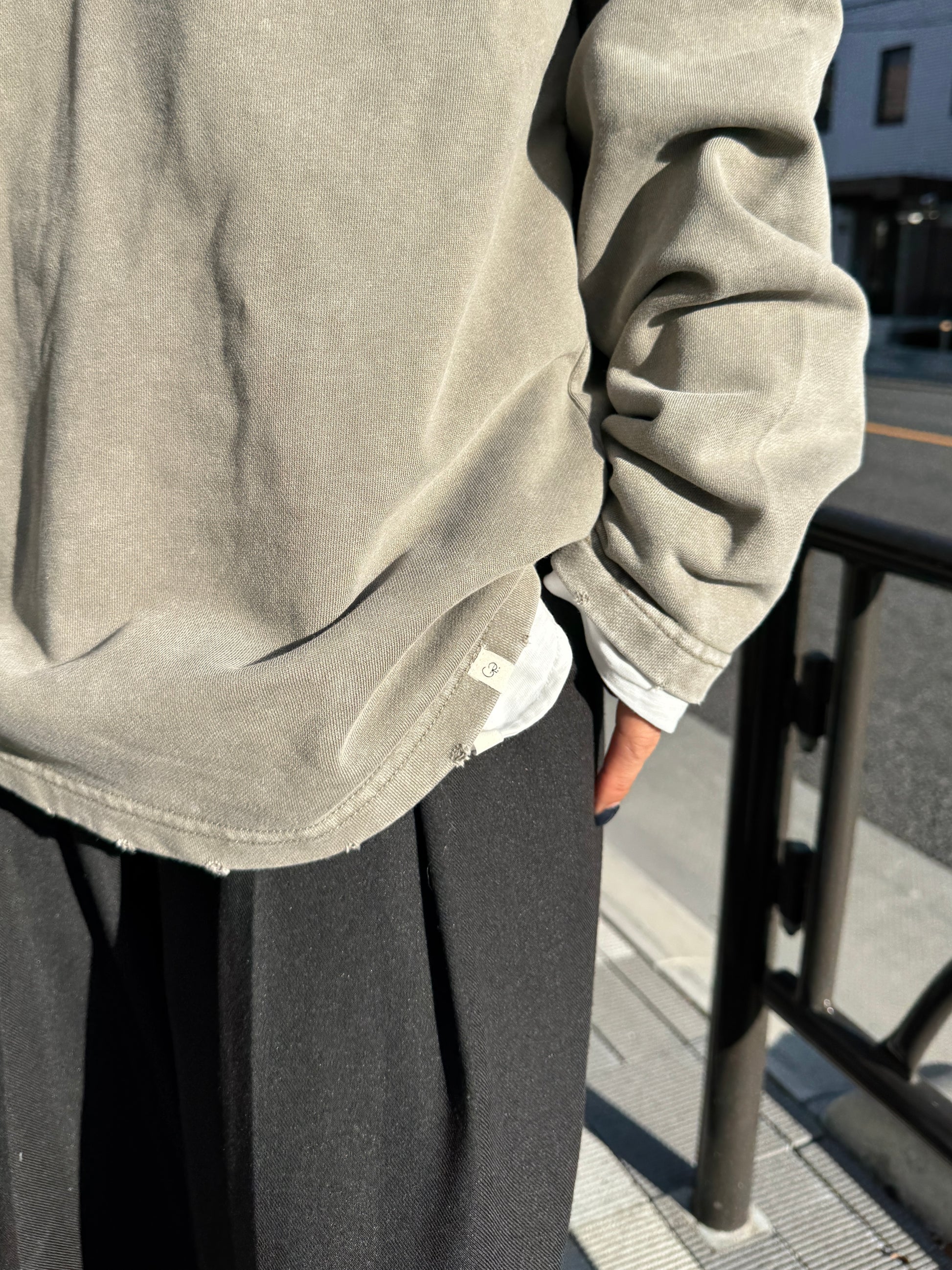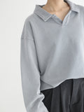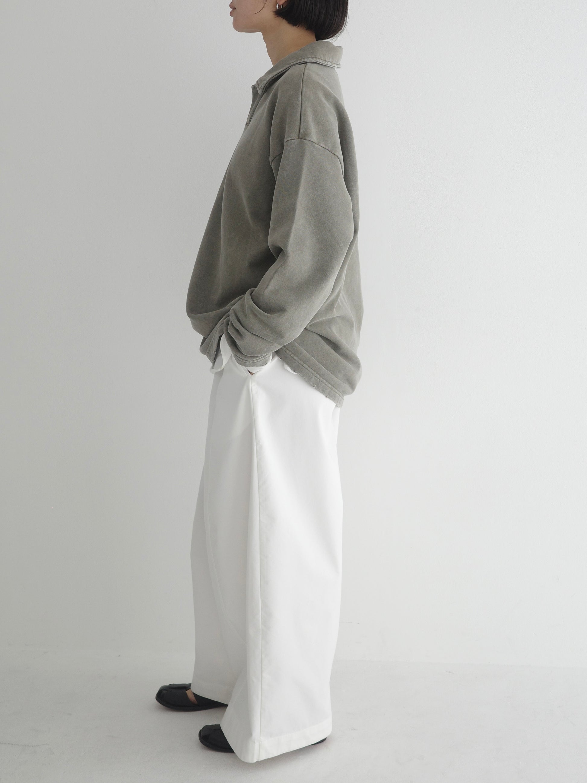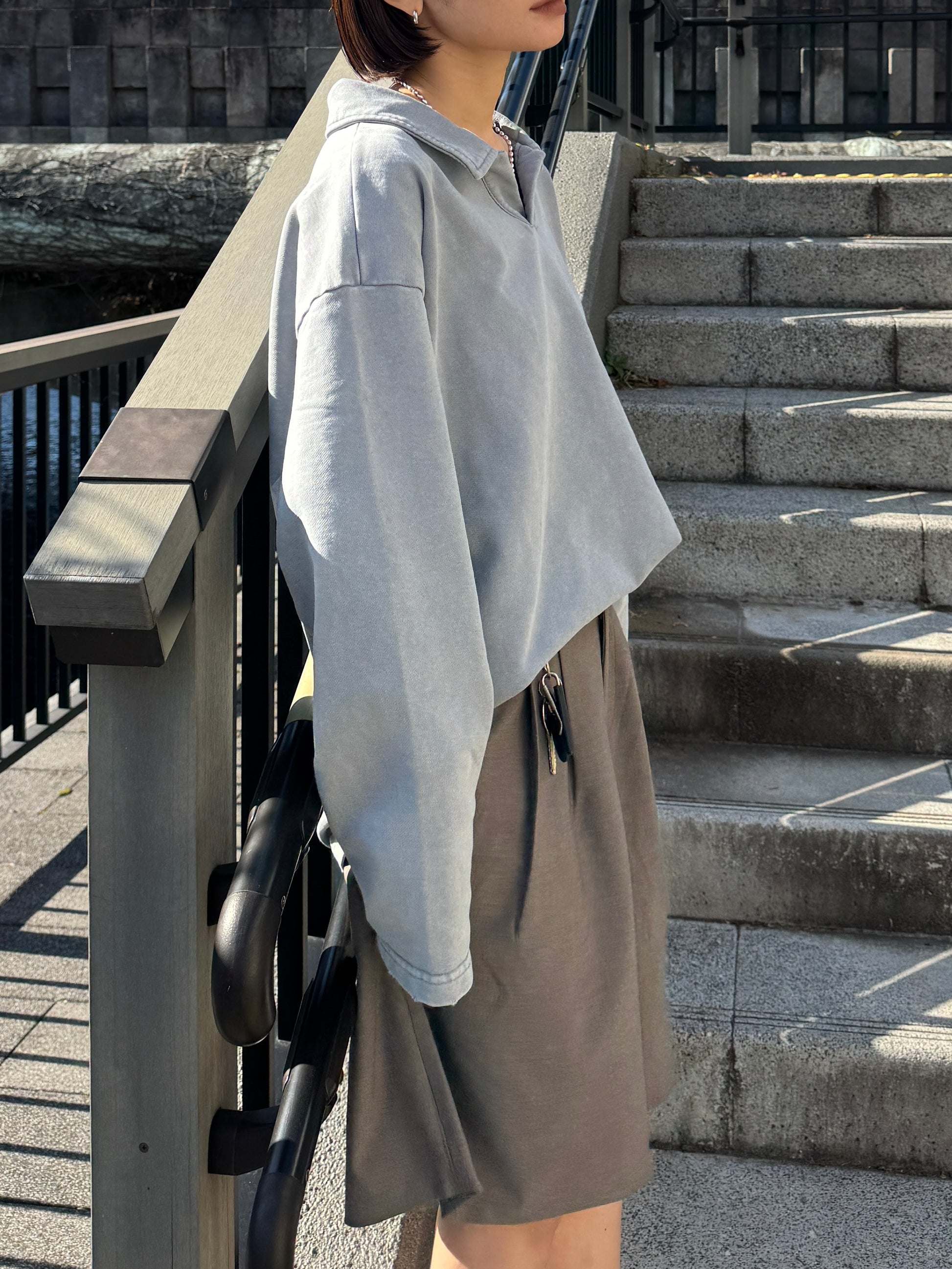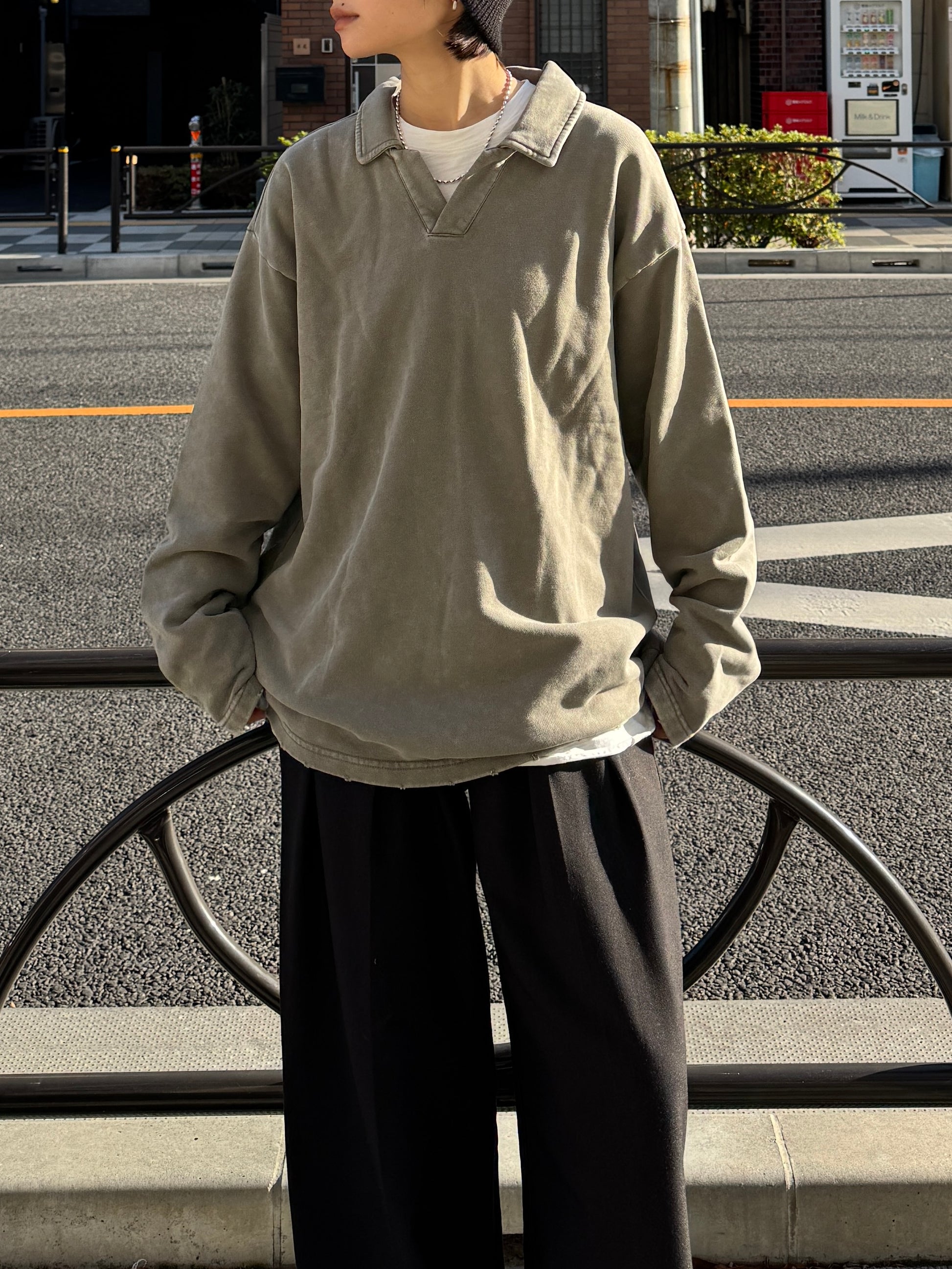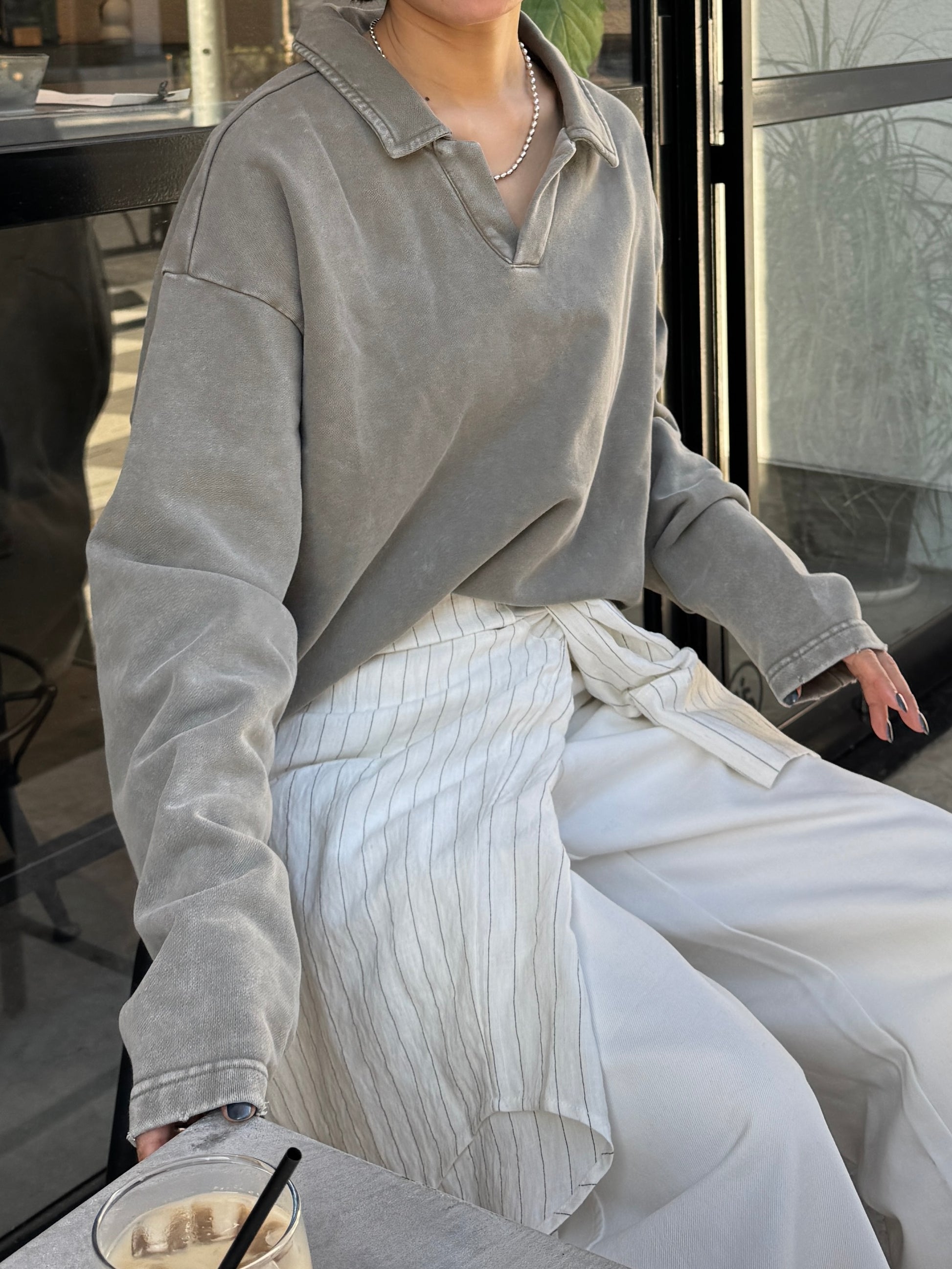 ヴィンテージライクなウォッシュ感が印象的な、襟付きスウェットトップス。 程よく色褪せた表情に加え、袖口と裾に施したさりげないダメージ加工が、ラフさの中に抜け感をプラスします。 肩の力を抜いて着られる、ほどよくゆとりのあるシルエットも魅力。 落ち感のある素材とやわらかなフォルムが、カジュアルになりすぎず、さりげなく女性らしい印象に仕上げてくれます。 肌寒い時期から春に向けて、レイヤード次第で軽やかな季節感を楽しめる1枚です。