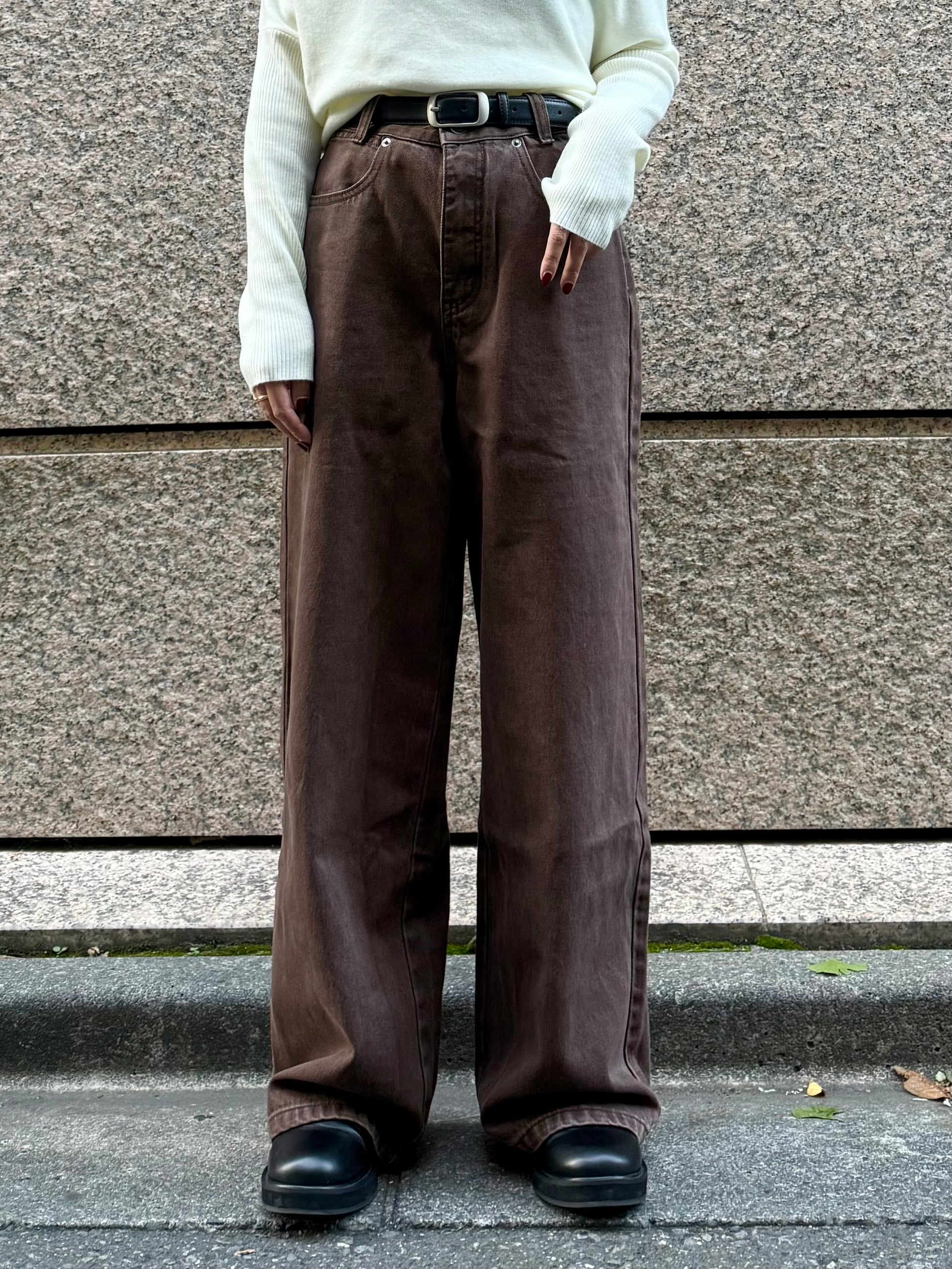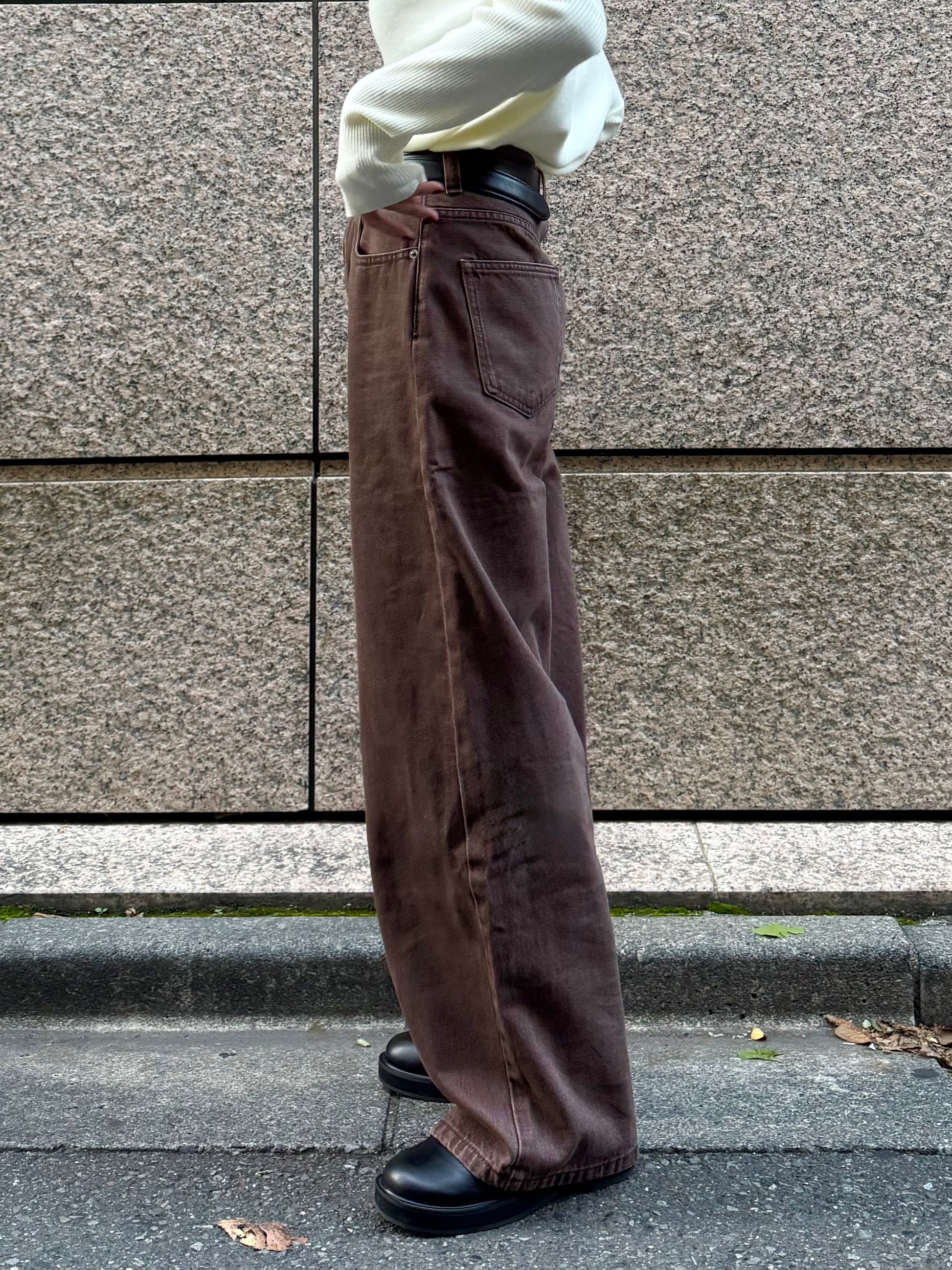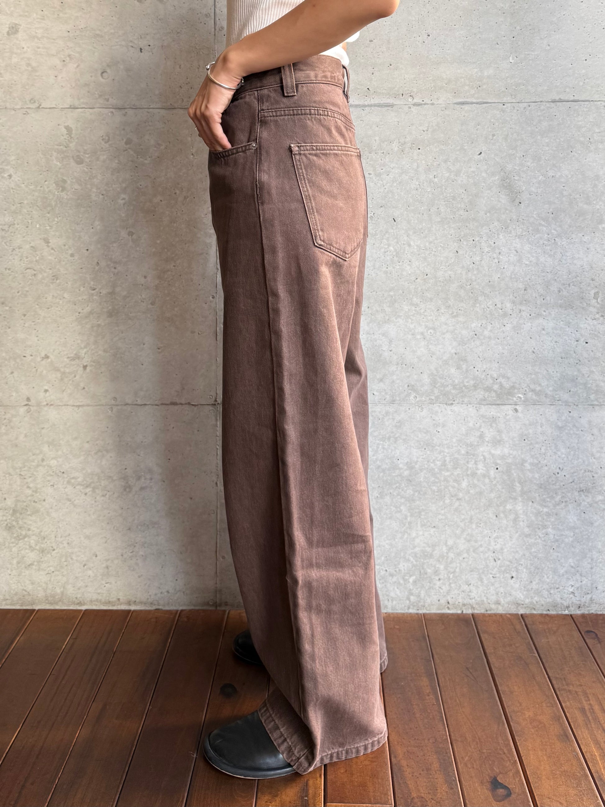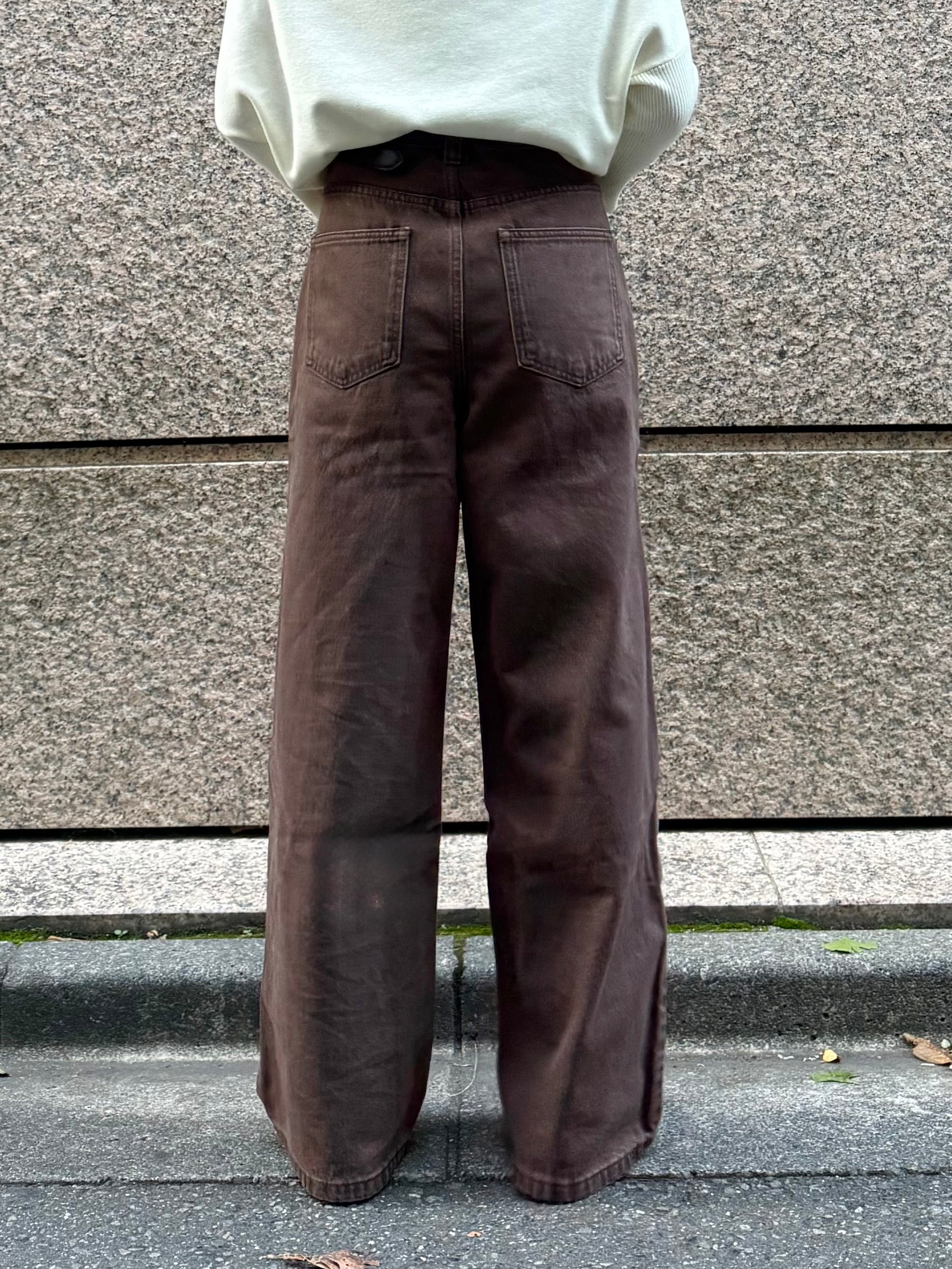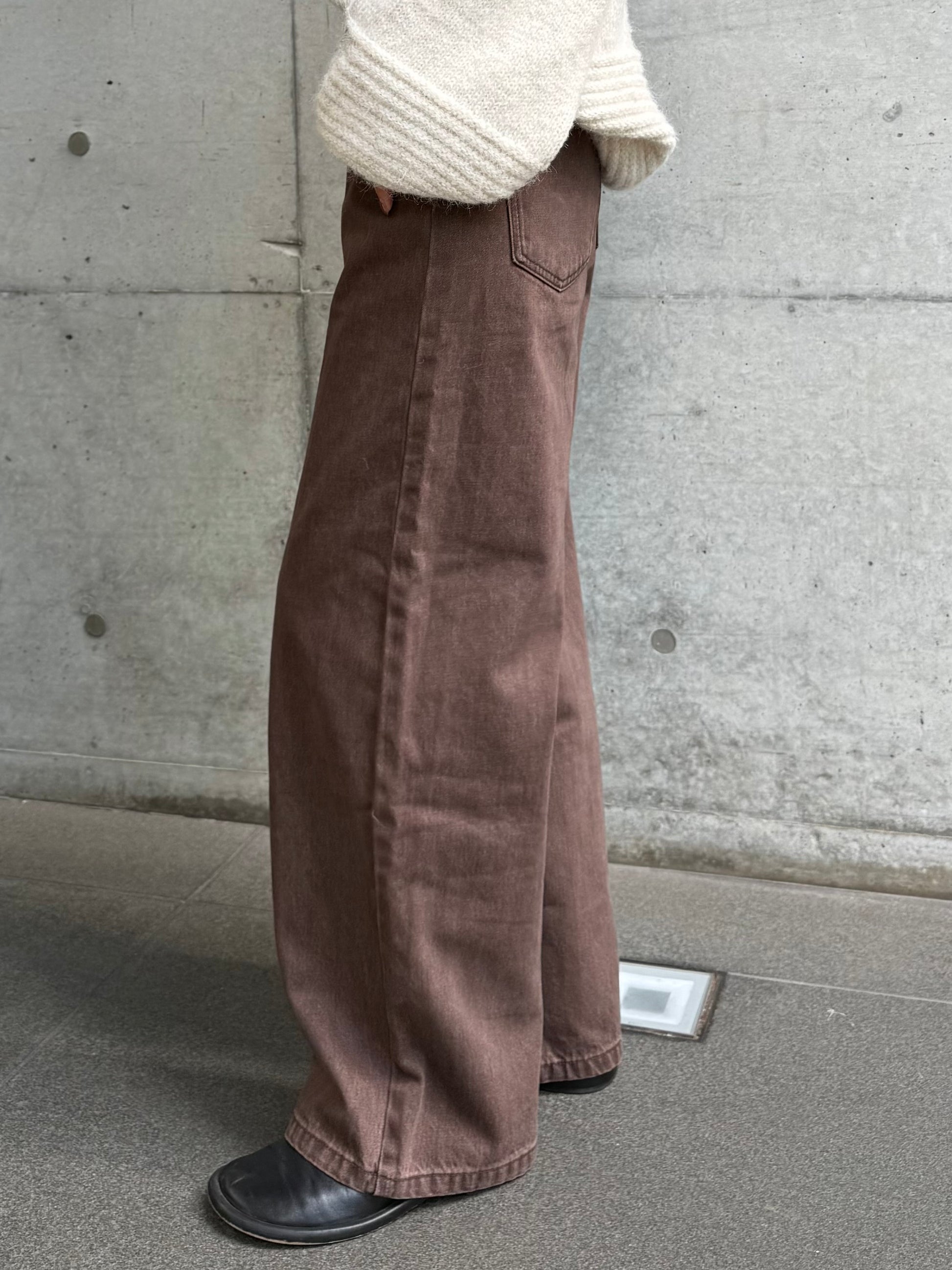 深みのあるブラウンカラーが大人の装いにマッチする、ハイウエストワイドストレートデニムパンツ。 柔らかく程よい厚みのある綿100%素材を使用し、穿くほどに身体になじむ上質な風合いを楽しめます。 ヴィンテージ加工を施すことで、カジュアルながらも表情感ある上品な印象に仕上げました。 ウエスト位置をやや高めに設定し腰回りをすっきり見せるシルエットに、太すぎず細すぎないワイドストレートラインが 脚を長く見せスニーカーからブーツまで幅広いシューズと相性◎ バックスタイルにはレザーパッチをあしらい、さりげなく大人のこなれ感を演出。 柔らかなブラウンカラーが馴染みやすく、シーズンレスで着まわしやすいのも魅力の1本。