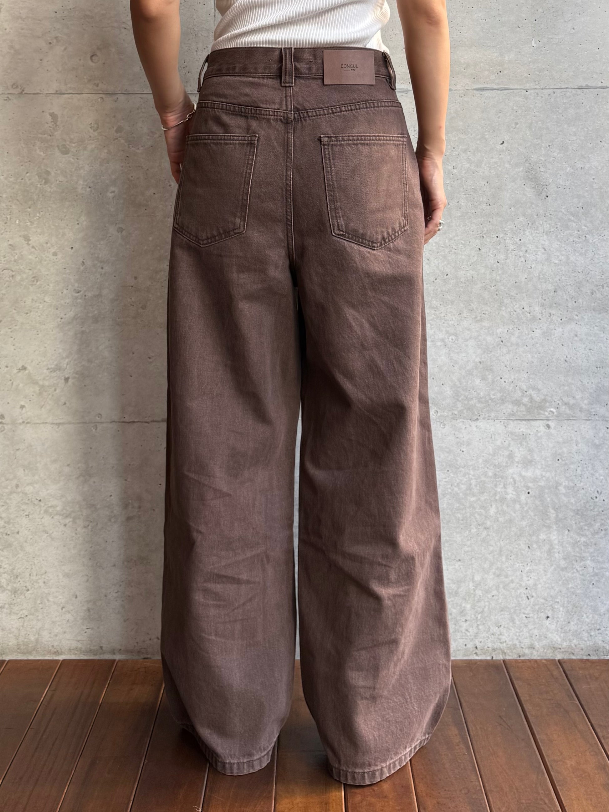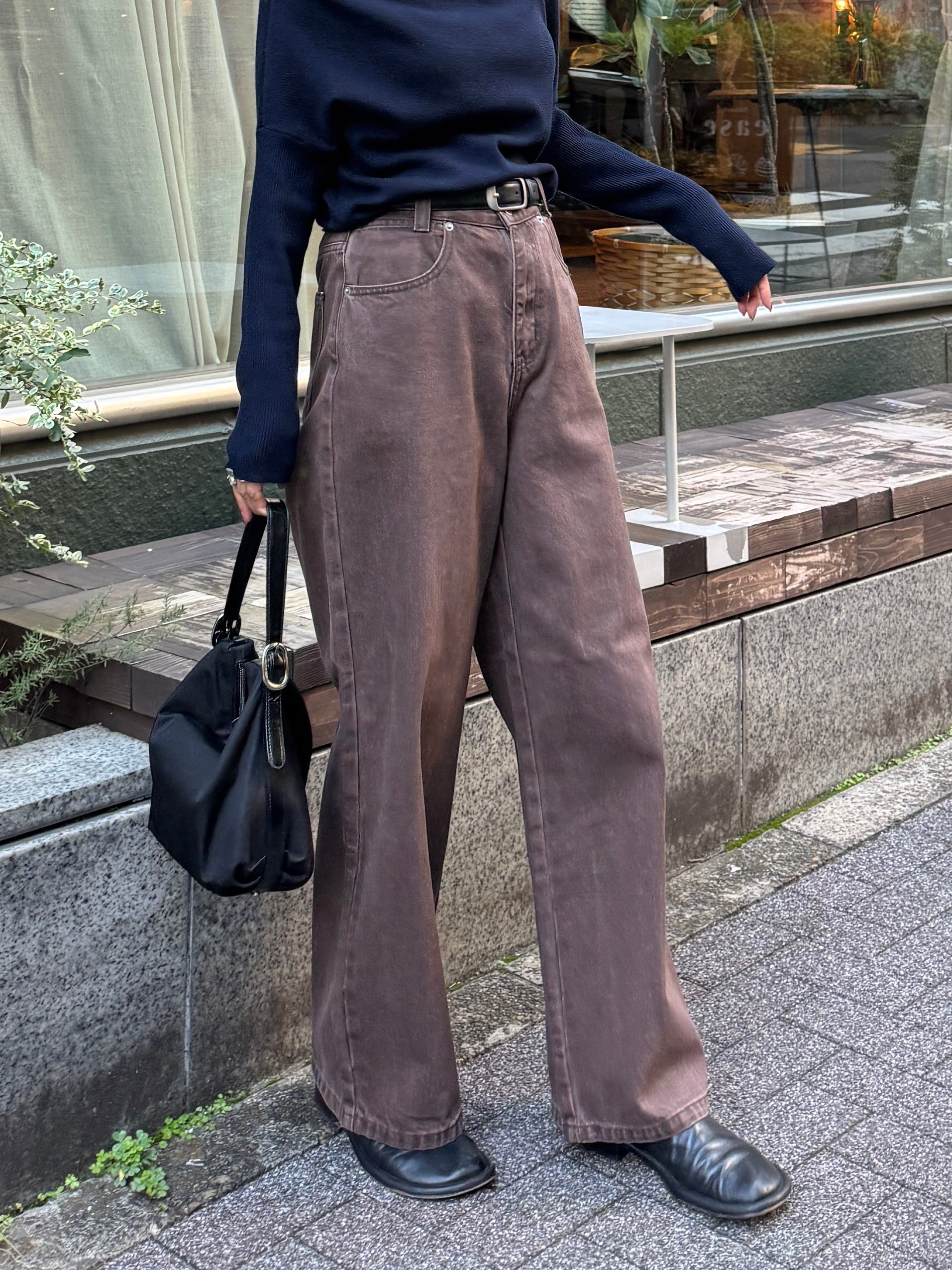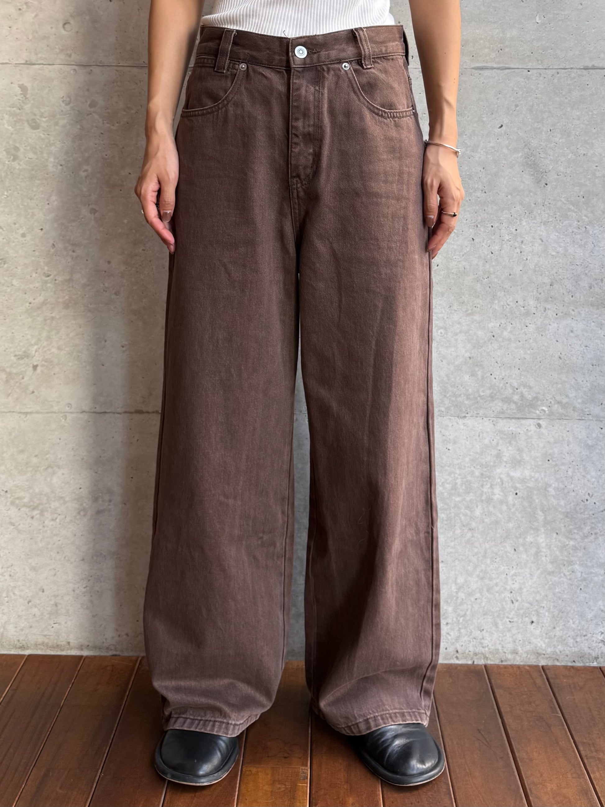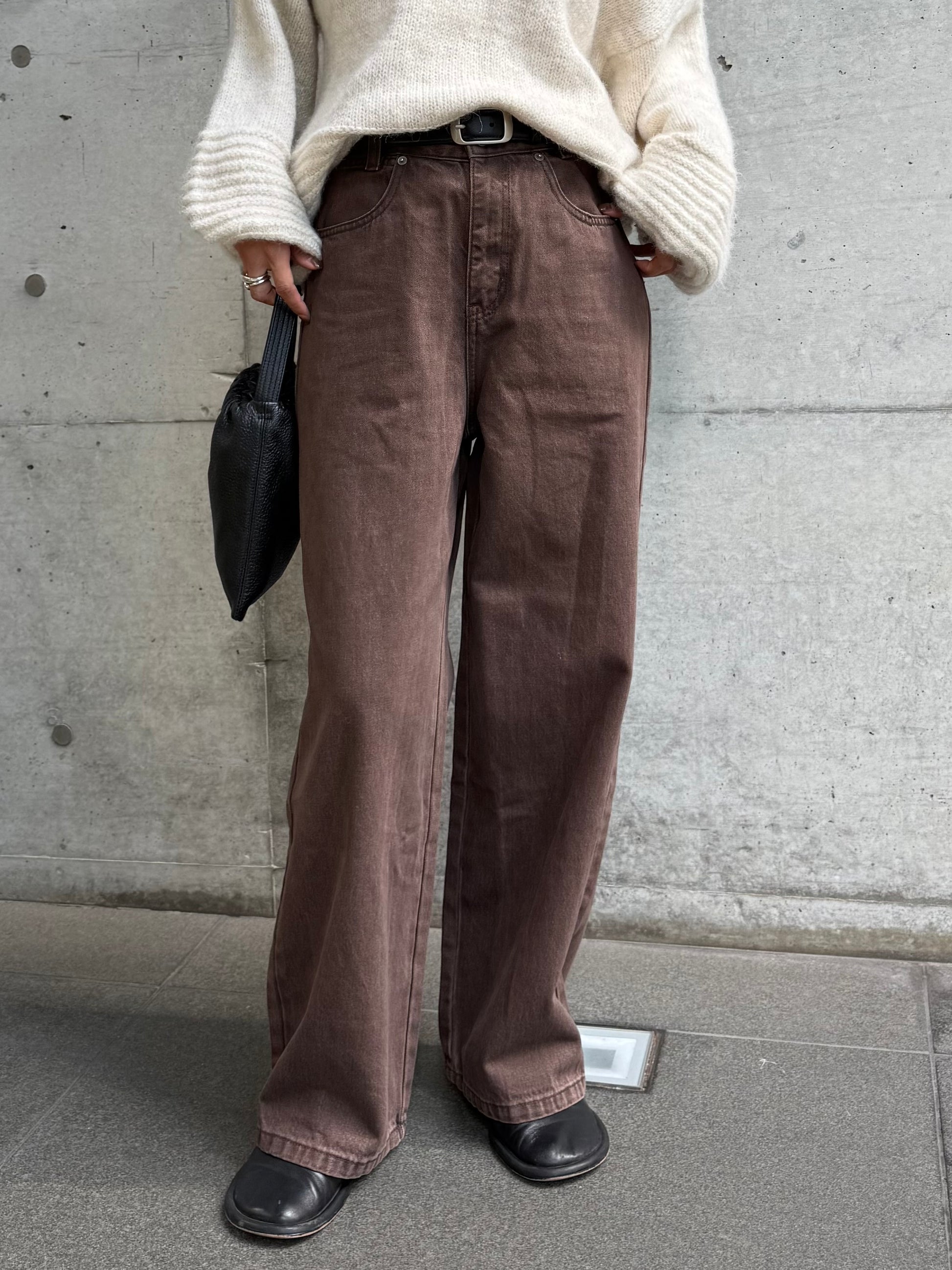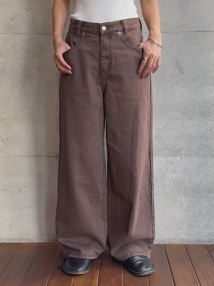 深みのあるブラウンカラーが大人の装いにマッチする、ハイウエストワイドストレートデニムパンツ。 柔らかく程よい厚みのある綿100%素材を使用し、穿くほどに身体になじむ上質な風合いを楽しめます。 ヴィンテージ加工を施すことで、カジュアルながらも表情感ある上品な印象に仕上げました。 ウエスト位置をやや高めに設定し腰回りをすっきり見せるシルエットに、太すぎず細すぎないワイドストレートラインが 脚を長く見せスニーカーからブーツまで幅広いシューズと相性◎ バックスタイルにはレザーパッチをあしらい、さりげなく大人のこなれ感を演出。 柔らかなブラウンカラーが馴染みやすく、シーズンレスで着まわしやすいのも魅力の1本。