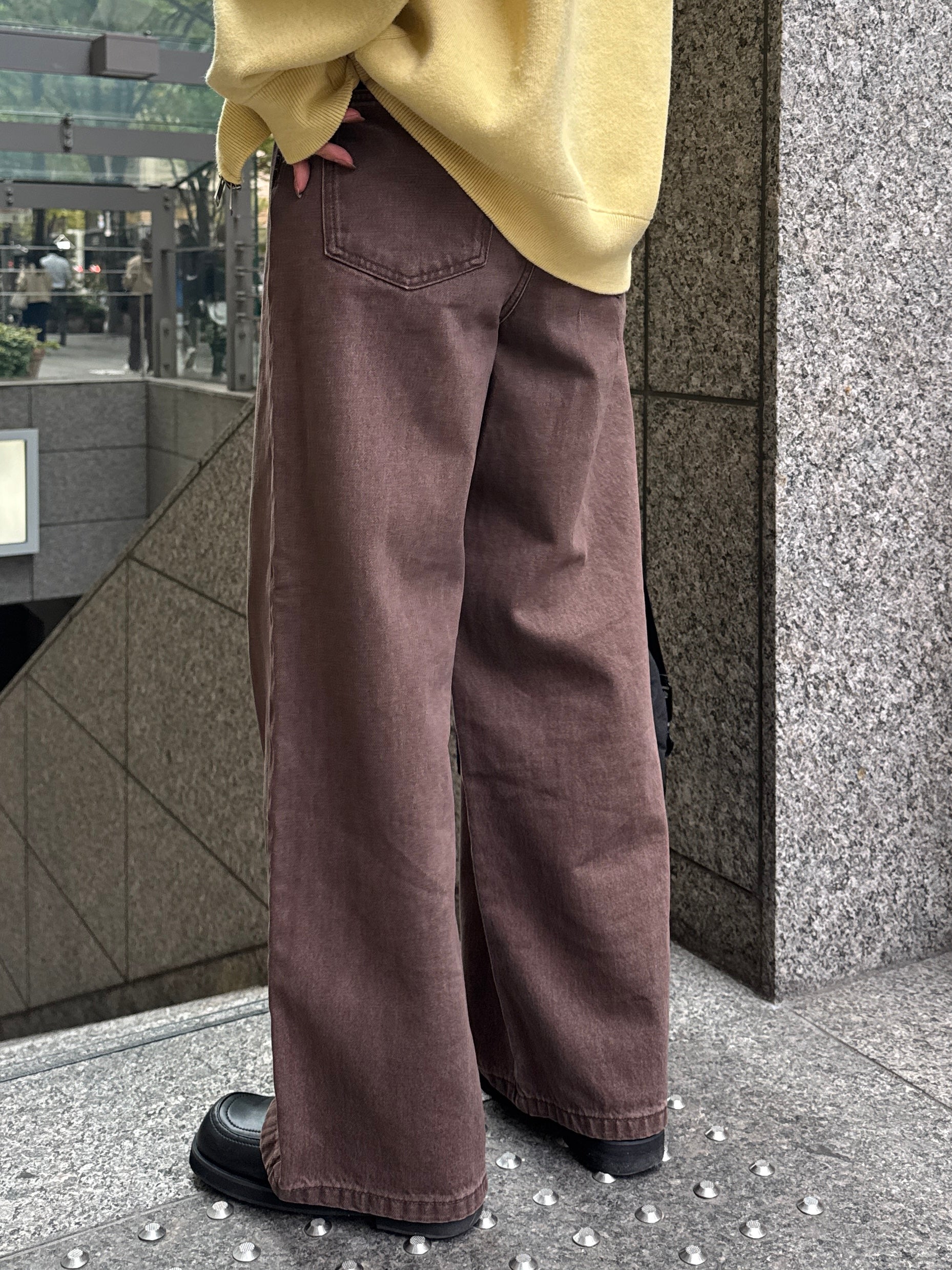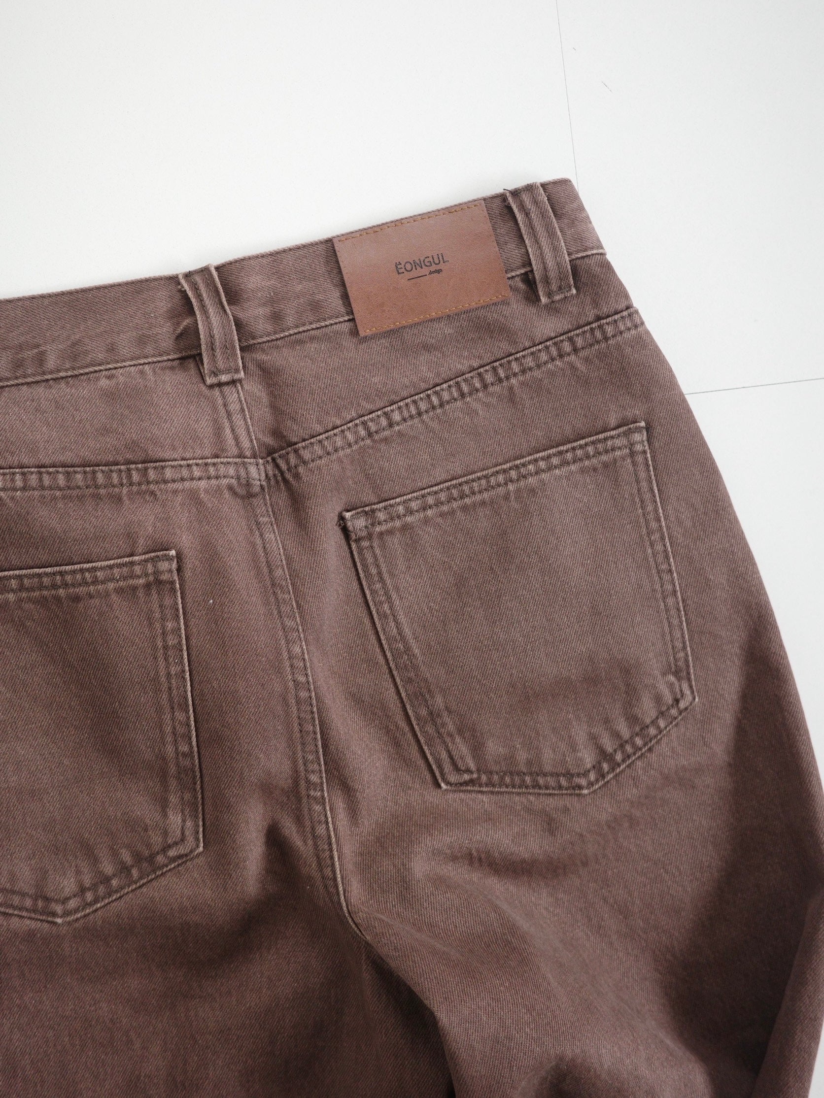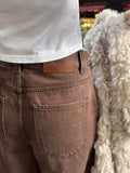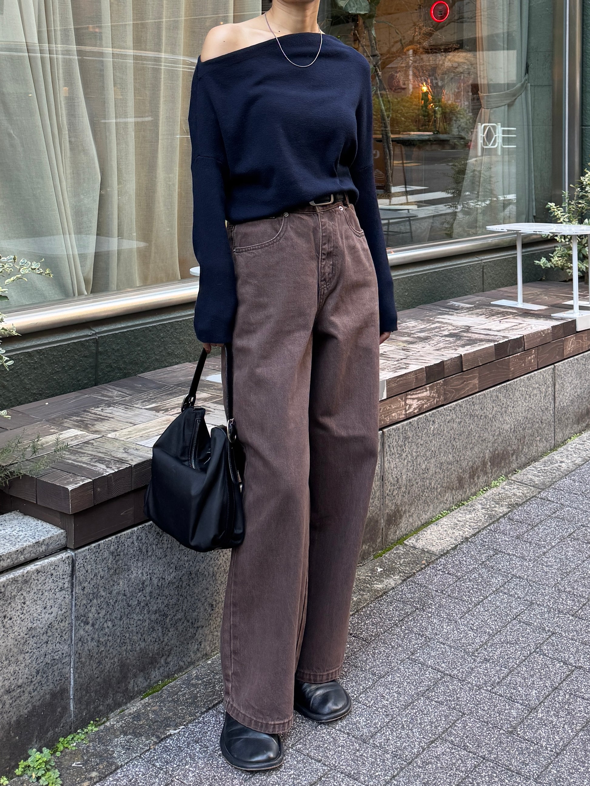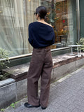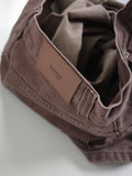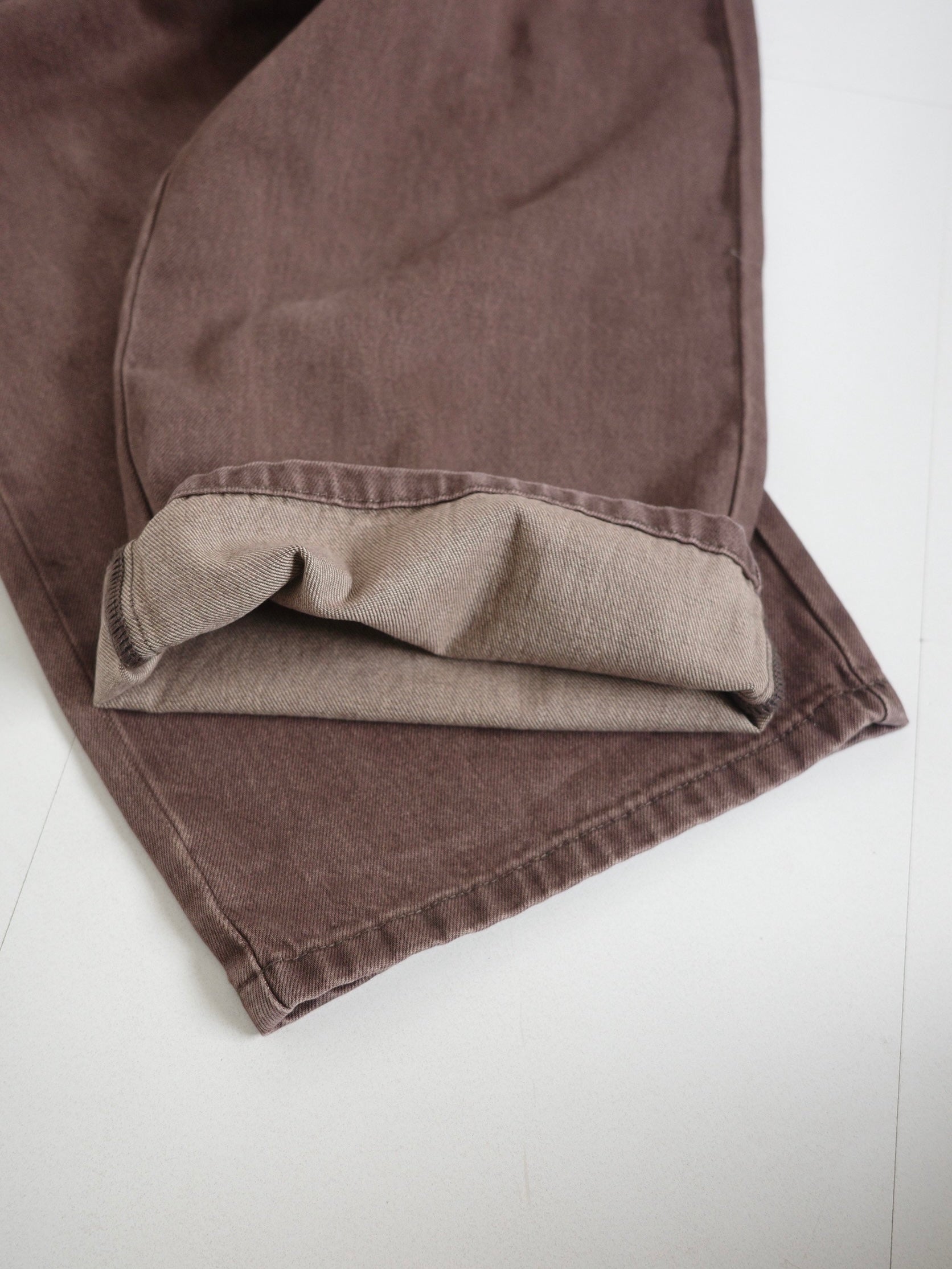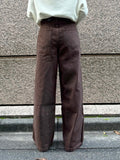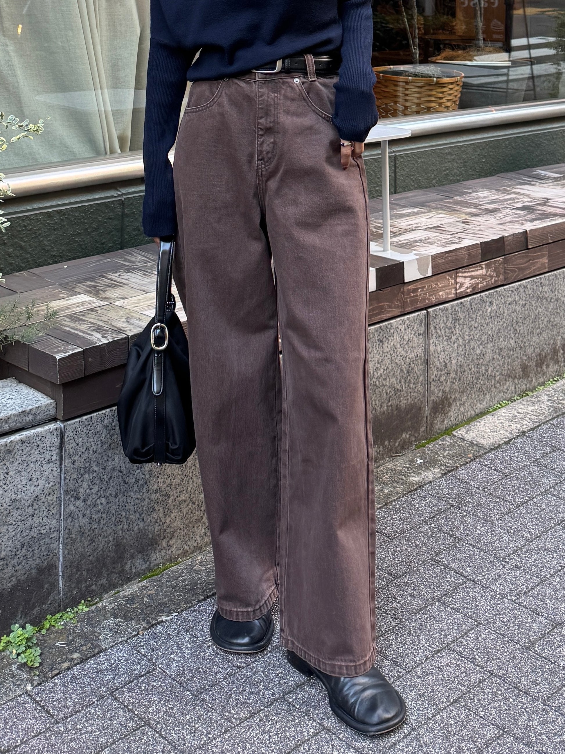 深みのあるブラウンカラーが大人の装いにマッチする、ハイウエストワイドストレートデニムパンツ。 柔らかく程よい厚みのある綿100%素材を使用し、穿くほどに身体になじむ上質な風合いを楽しめます。 ヴィンテージ加工を施すことで、カジュアルながらも表情感ある上品な印象に仕上げました。 ウエスト位置をやや高めに設定し腰回りをすっきり見せるシルエットに、太すぎず細すぎないワイドストレートラインが 脚を長く見せスニーカーからブーツまで幅広いシューズと相性◎ バックスタイルにはレザーパッチをあしらい、さりげなく大人のこなれ感を演出。 柔らかなブラウンカラーが馴染みやすく、シーズンレスで着まわしやすいのも魅力の1本。