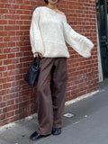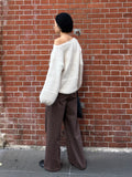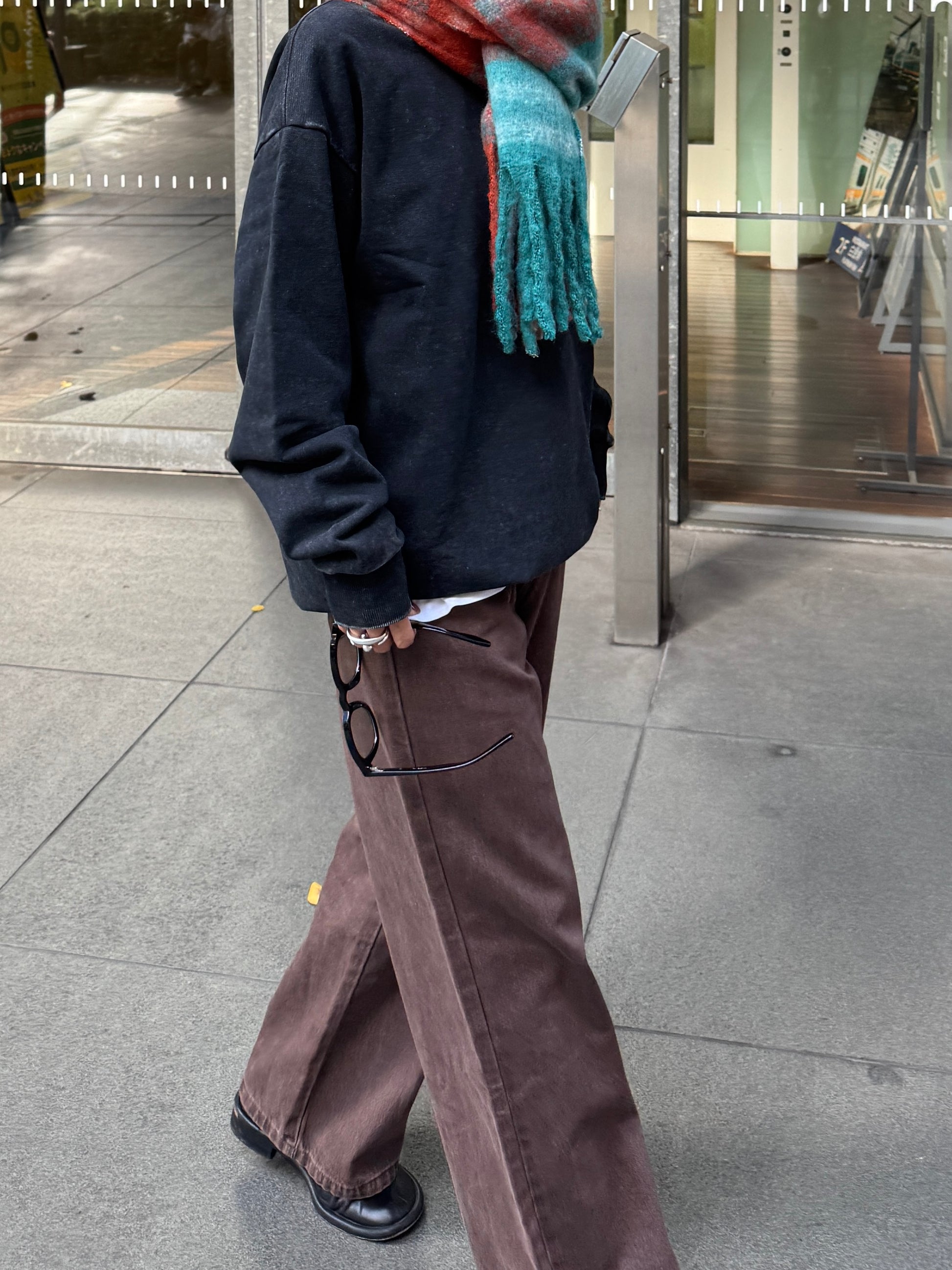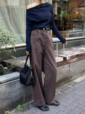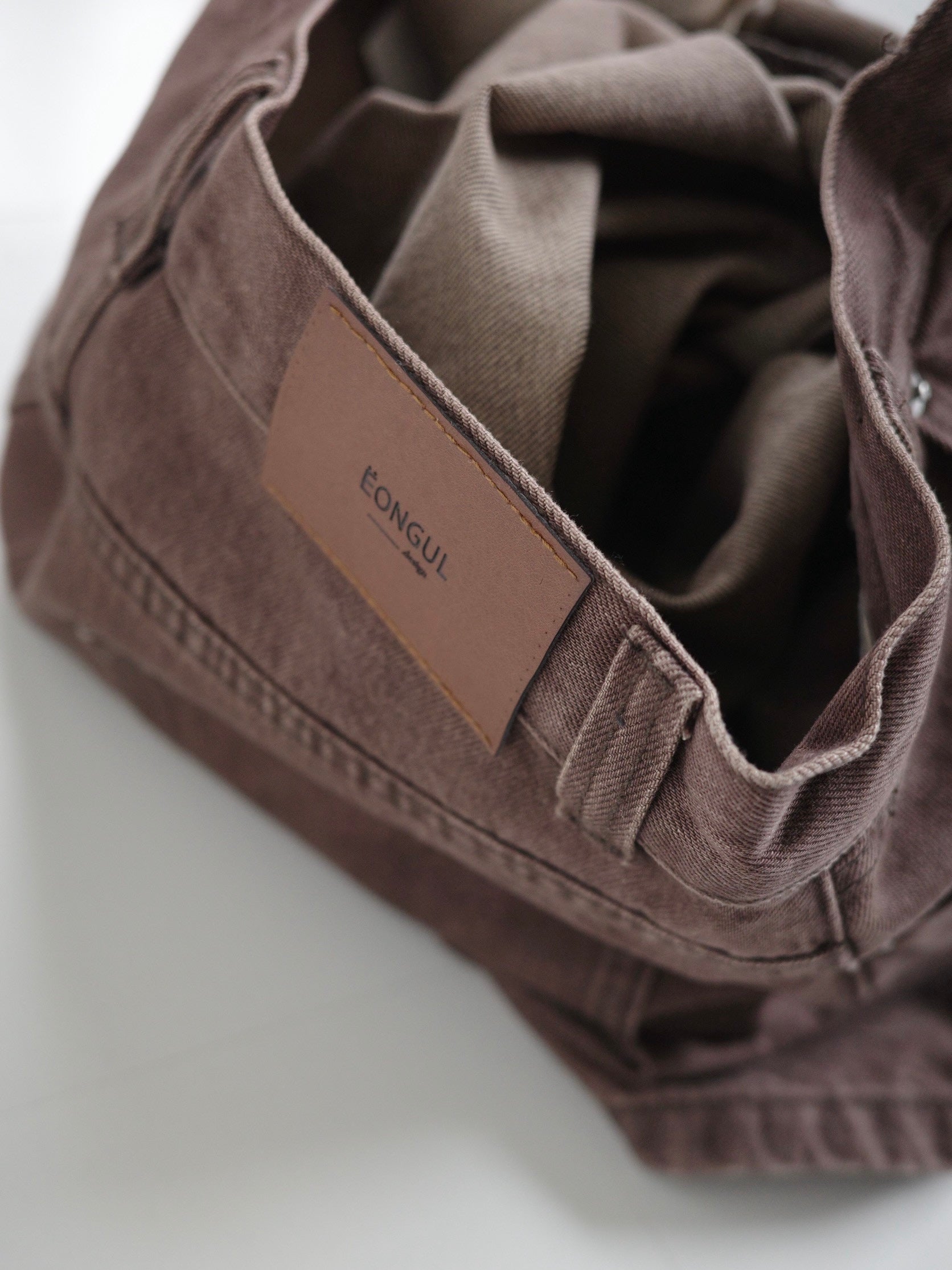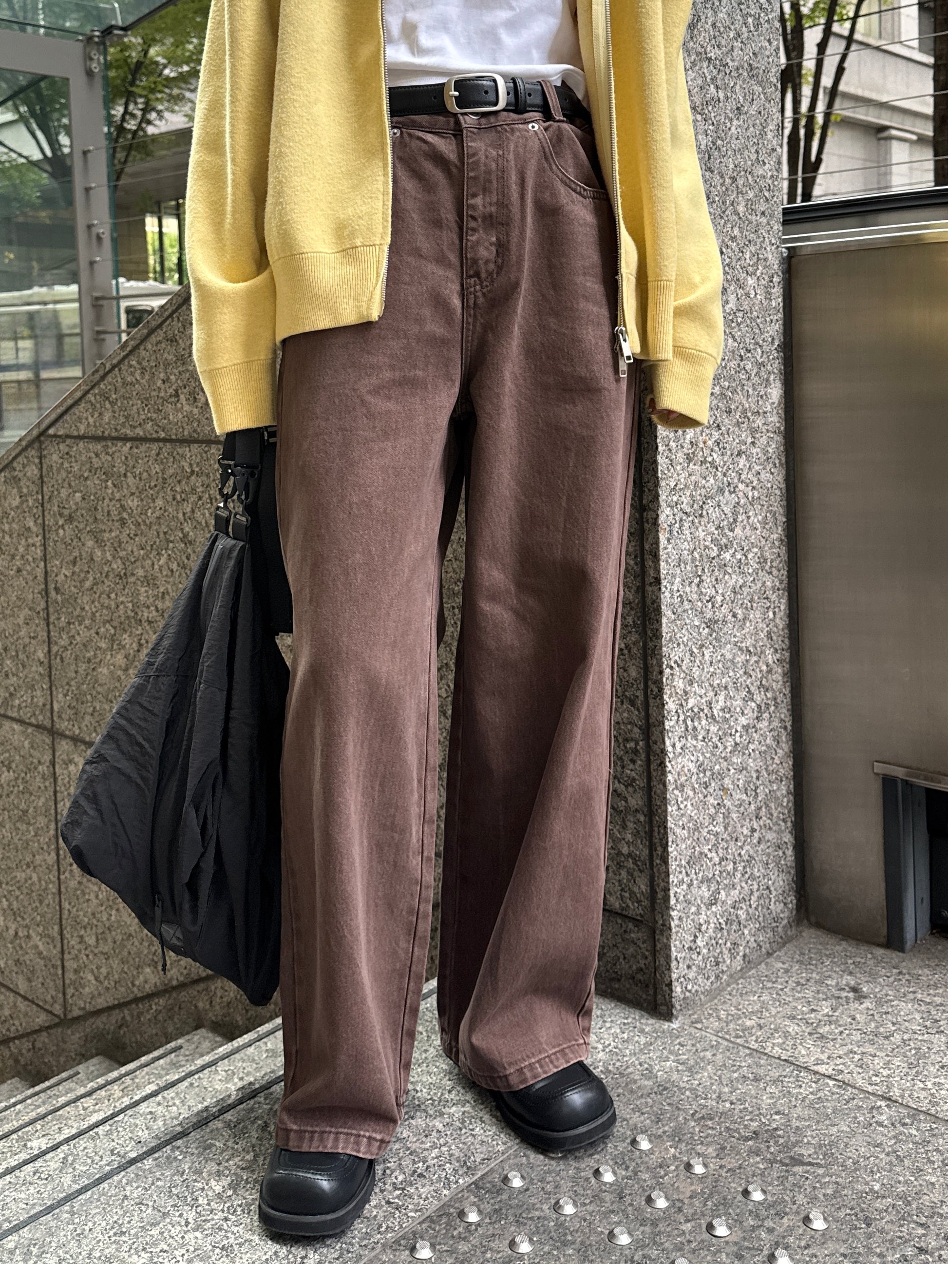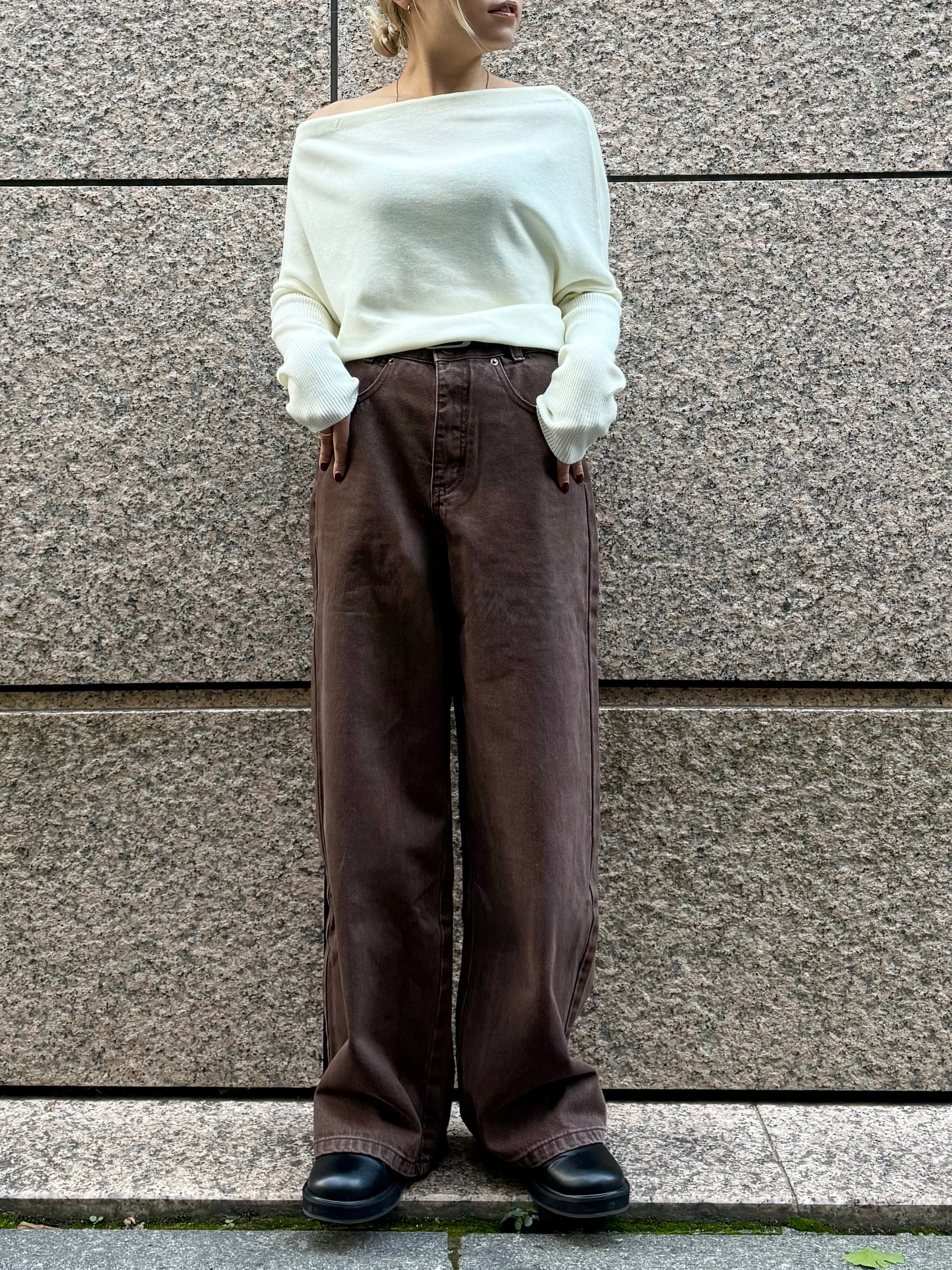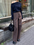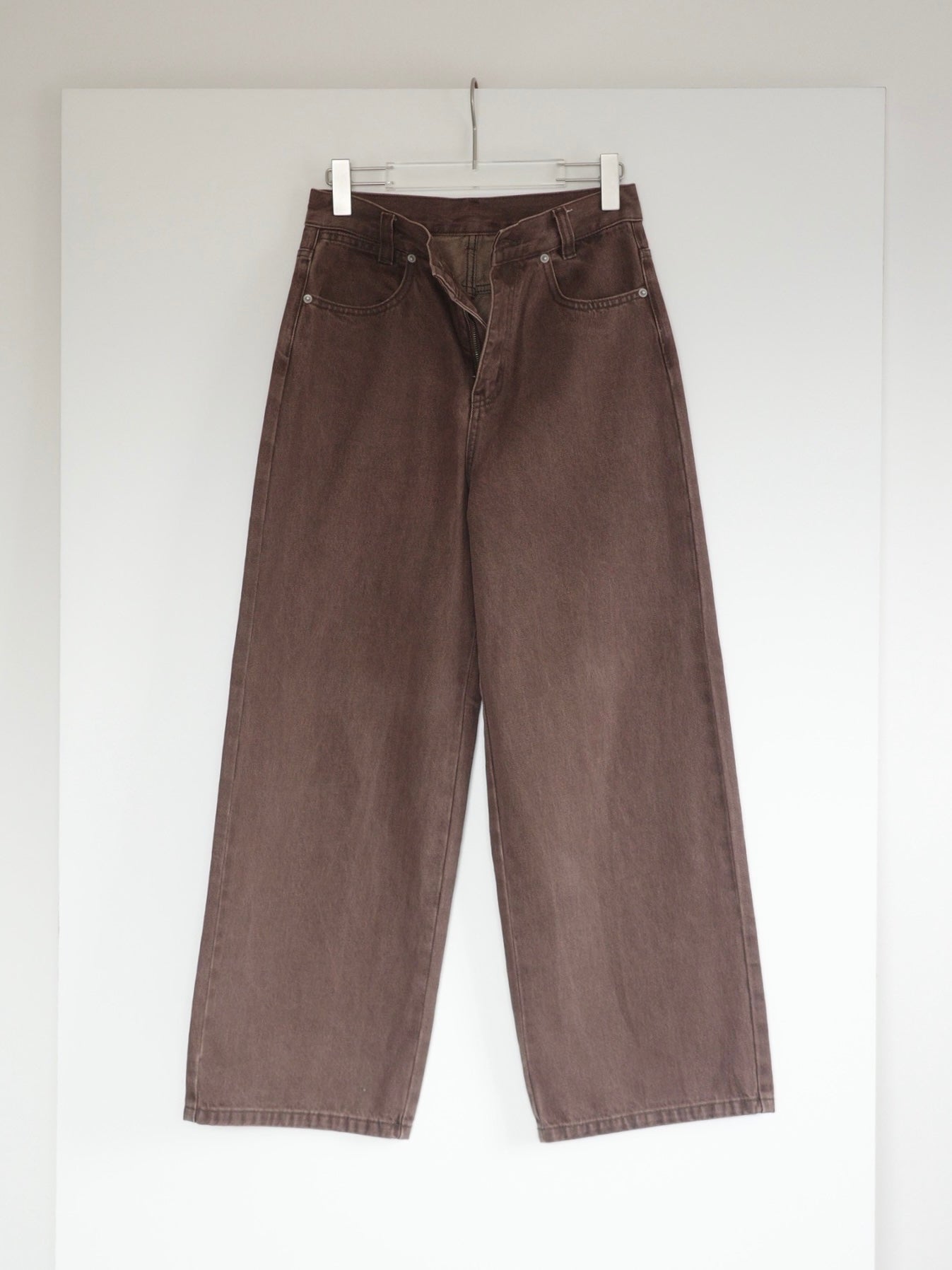 深みのあるブラウンカラーが大人の装いにマッチする、ハイウエストワイドストレートデニムパンツ。 柔らかく程よい厚みのある綿100%素材を使用し、穿くほどに身体になじむ上質な風合いを楽しめます。 ヴィンテージ加工を施すことで、カジュアルながらも表情感ある上品な印象に仕上げました。 ウエスト位置をやや高めに設定し腰回りをすっきり見せるシルエットに、太すぎず細すぎないワイドストレートラインが 脚を長く見せスニーカーからブーツまで幅広いシューズと相性◎ バックスタイルにはレザーパッチをあしらい、さりげなく大人のこなれ感を演出。 柔らかなブラウンカラーが馴染みやすく、シーズンレスで着まわしやすいのも魅力の1本。