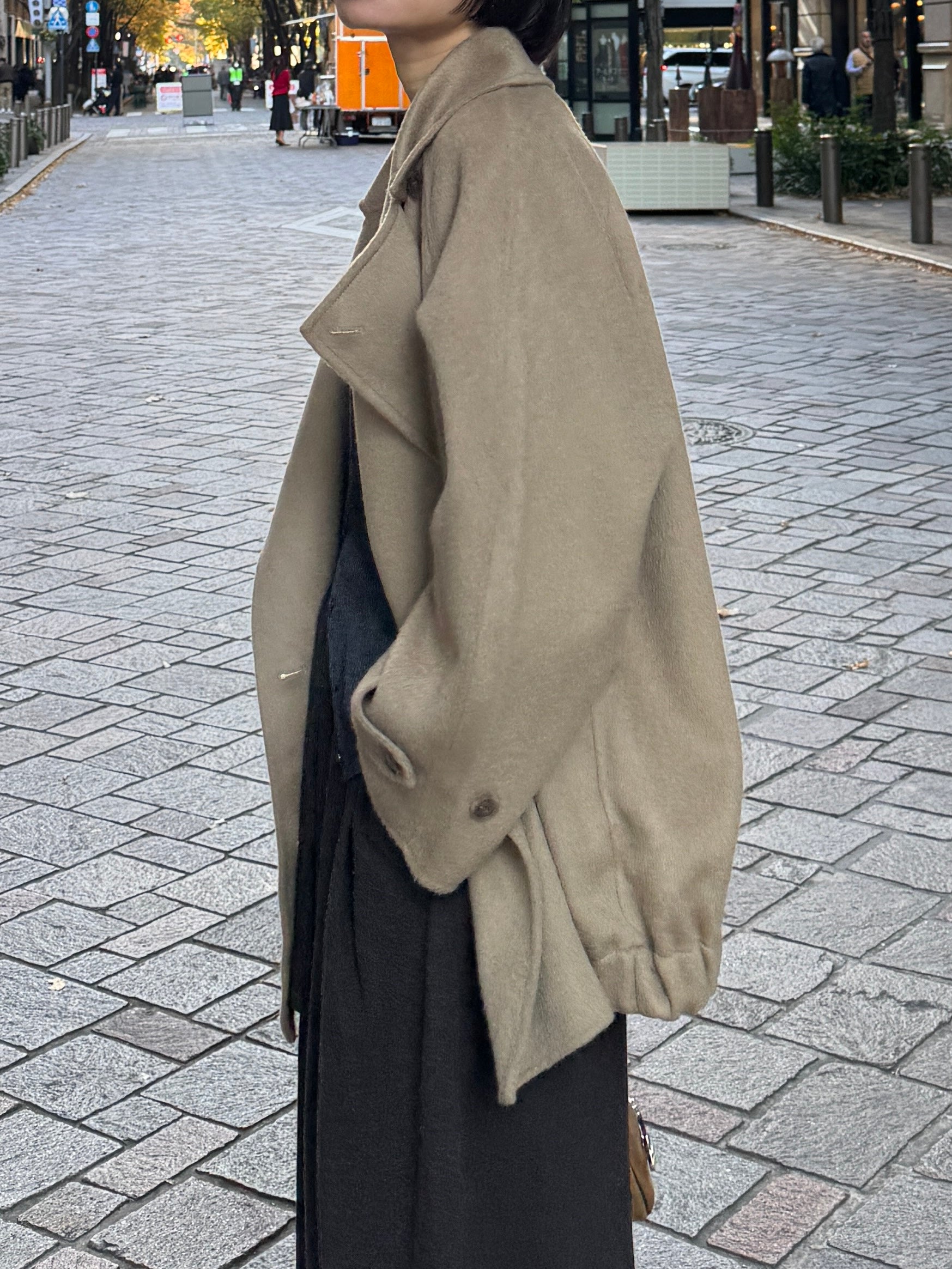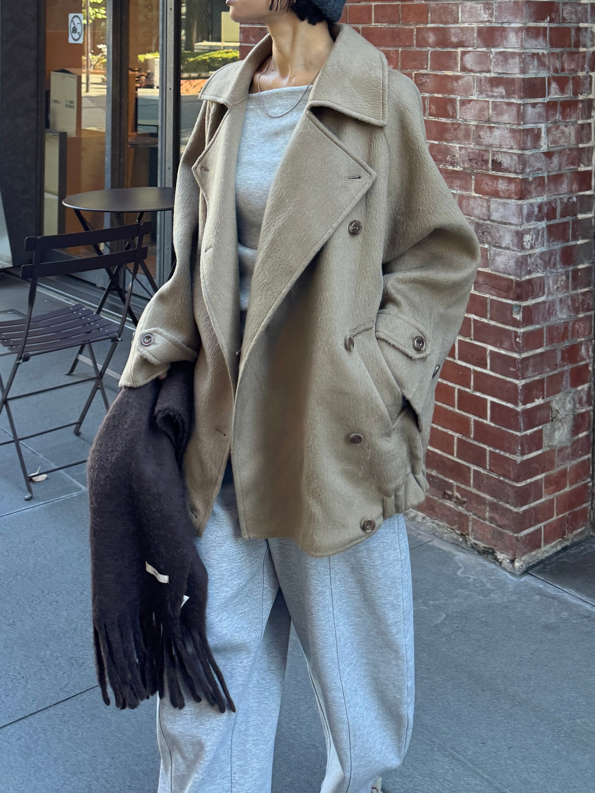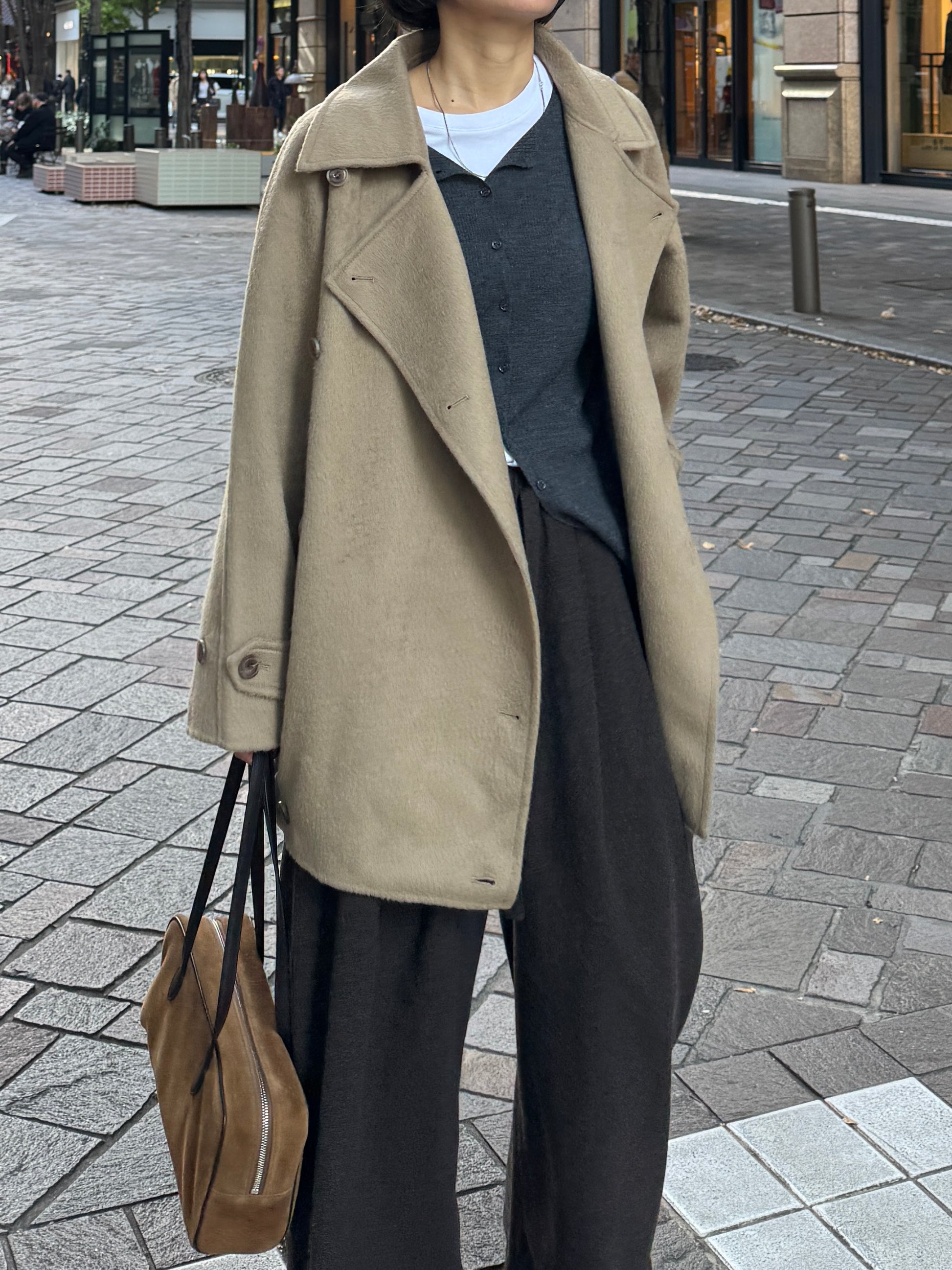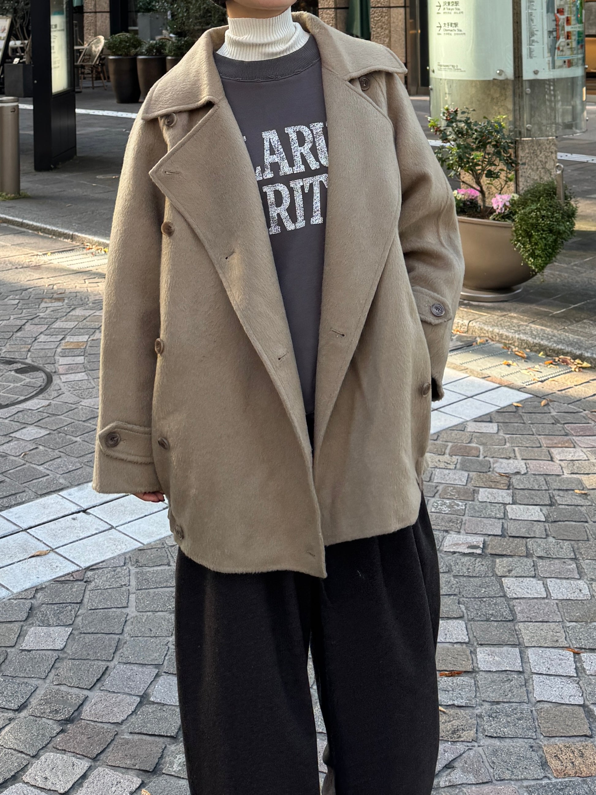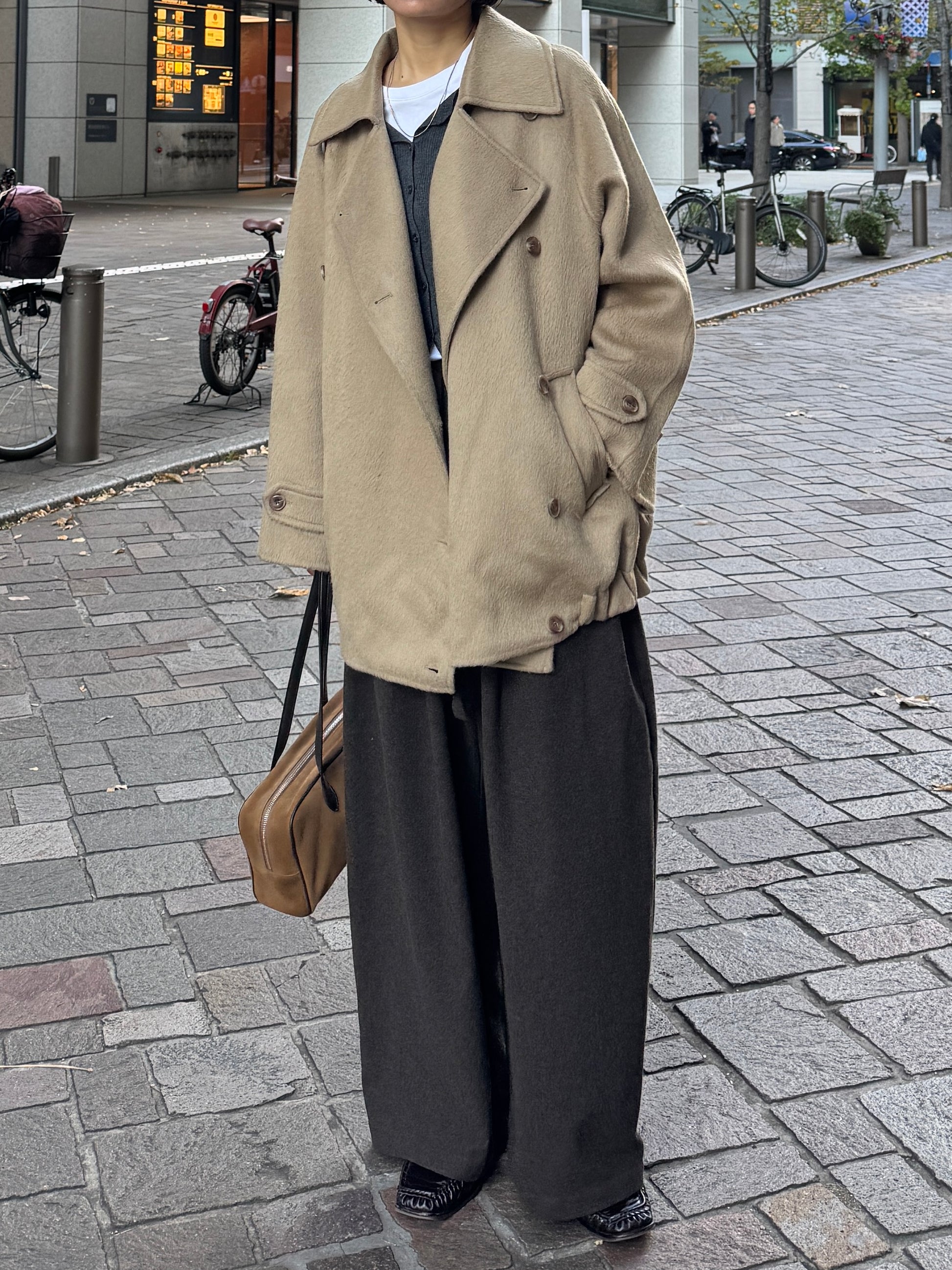 クラシックなPコートを、ゆったりと今のムードに落とし込んだ冬のオーバージャケット。 ウール100%の上質な素材ながら、軽やかで見た目以上に負担のない着心地が魅力です。 ゆとりのあるワイドシルエットに、肩線を落としたラグランスリーブを組み合わせリラックス感と程よい抜けをプラス。 厚手のニットやスウェットなどのレイヤードももたつきにくい、余白のあるフォルムが◎ フロントはクラシックな雰囲気のダブルボタン、低めに配置されたボタンが重心を落ち着かせシンプルながらこなれたムードに。 袖口のストラップボタンや、裾に入ったギャザー切り替えなど細部のディティールにもこだわりシンプルながら立体感あるデザインに仕上げました。 バランスが取りやすいミドル丈に設定し、デイリーに羽織れる気軽さがありながら品よくまとまる1着。