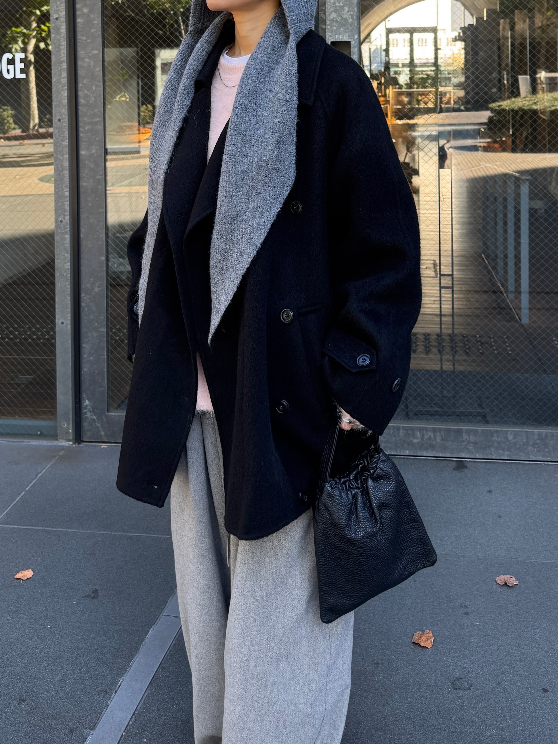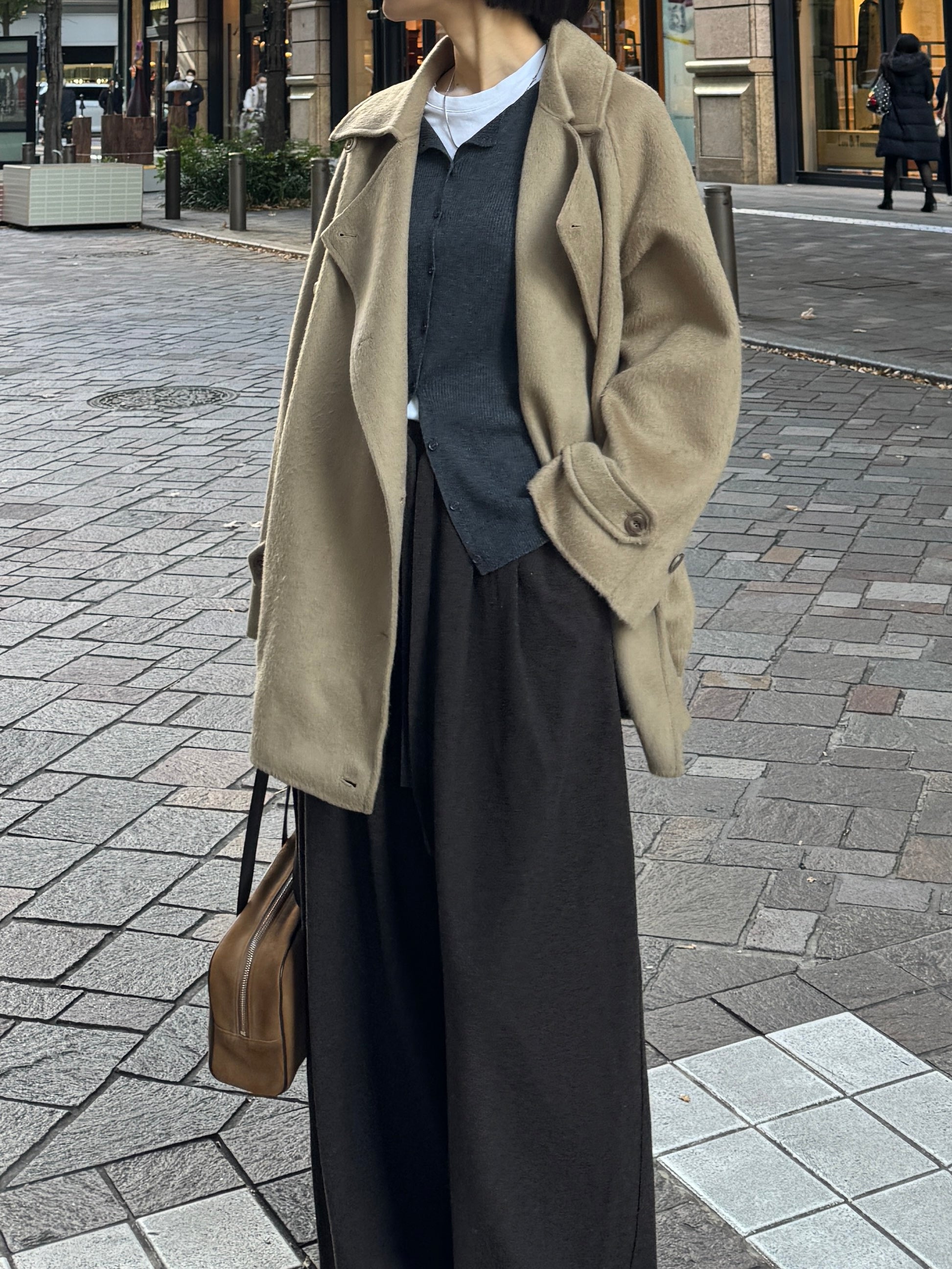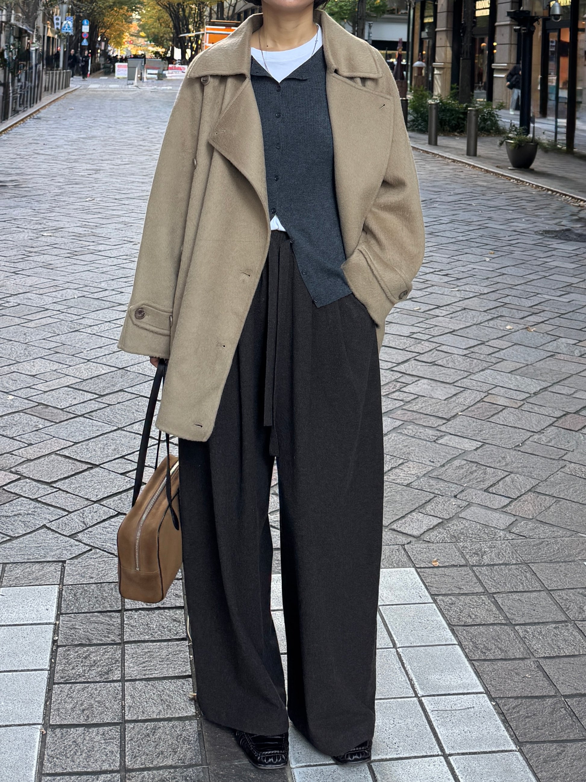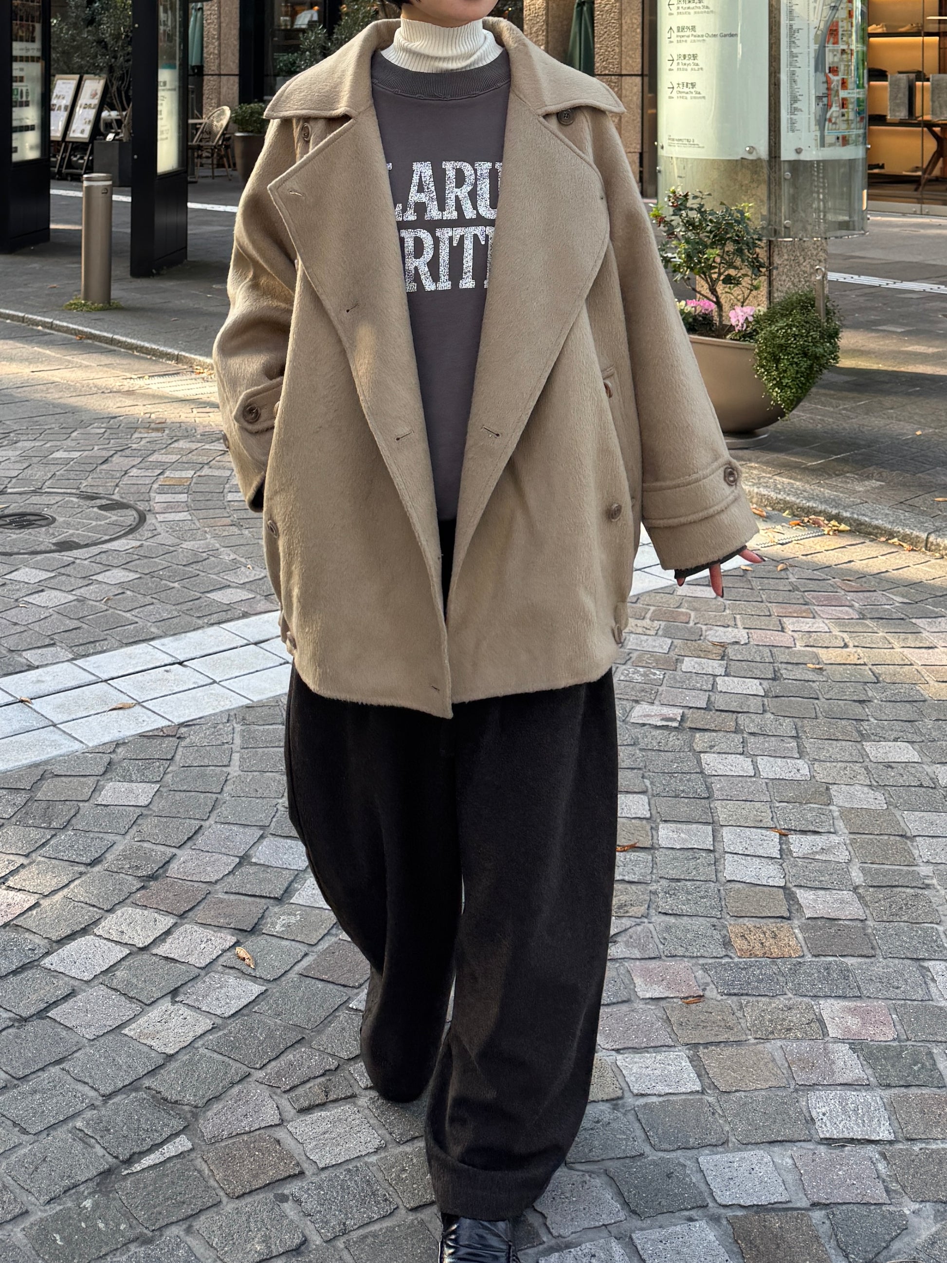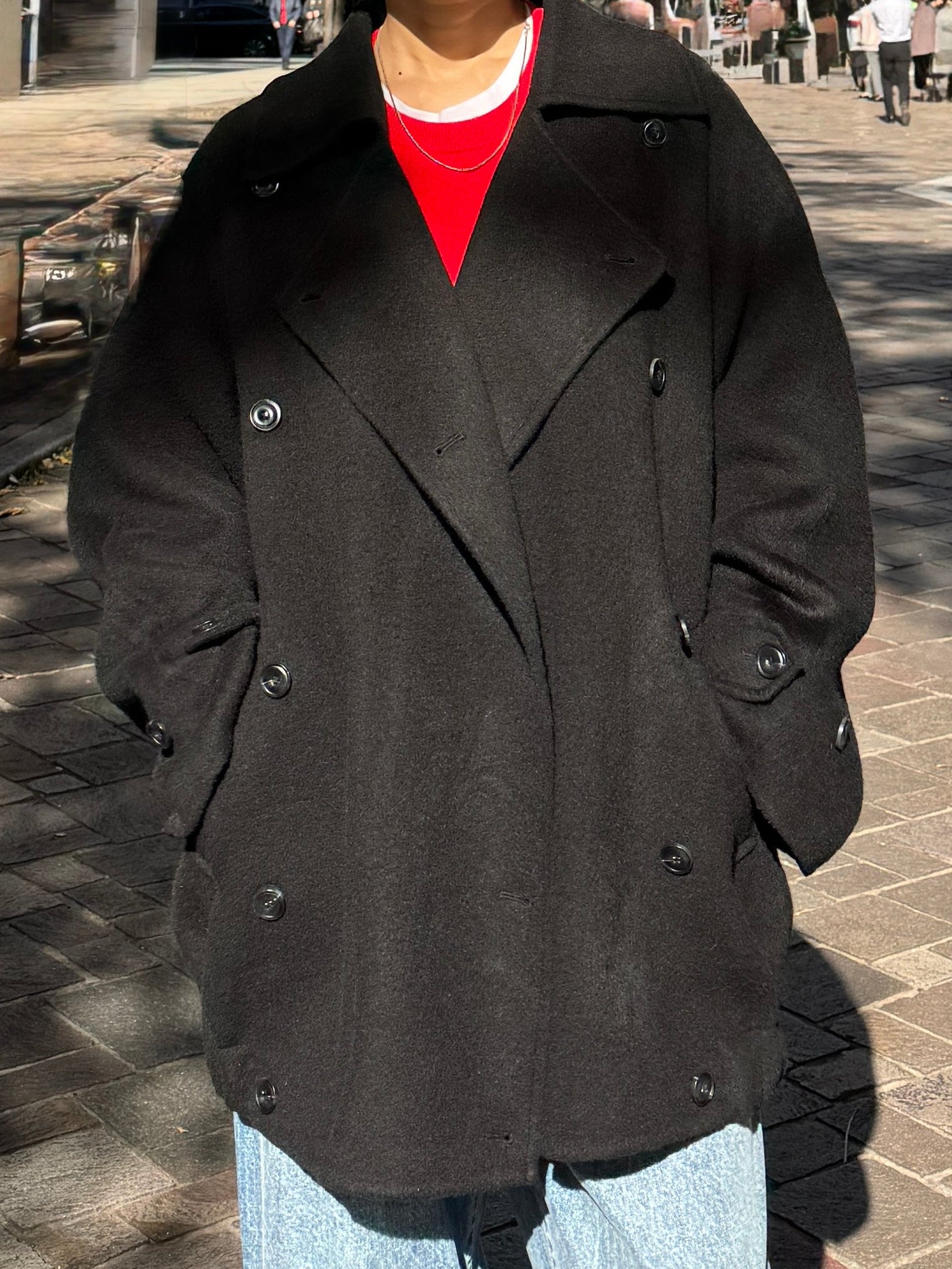 クラシックなPコートを、ゆったりと今のムードに落とし込んだ冬のオーバージャケット。 ウール100%の上質な素材ながら、軽やかで見た目以上に負担のない着心地が魅力です。 ゆとりのあるワイドシルエットに、肩線を落としたラグランスリーブを組み合わせリラックス感と程よい抜けをプラス。 厚手のニットやスウェットなどのレイヤードももたつきにくい、余白のあるフォルムが◎ フロントはクラシックな雰囲気のダブルボタン、低めに配置されたボタンが重心を落ち着かせシンプルながらこなれたムードに。 袖口のストラップボタンや、裾に入ったギャザー切り替えなど細部のディティールにもこだわりシンプルながら立体感あるデザインに仕上げました。 バランスが取りやすいミドル丈に設定し、デイリーに羽織れる気軽さがありながら品よくまとまる1着。