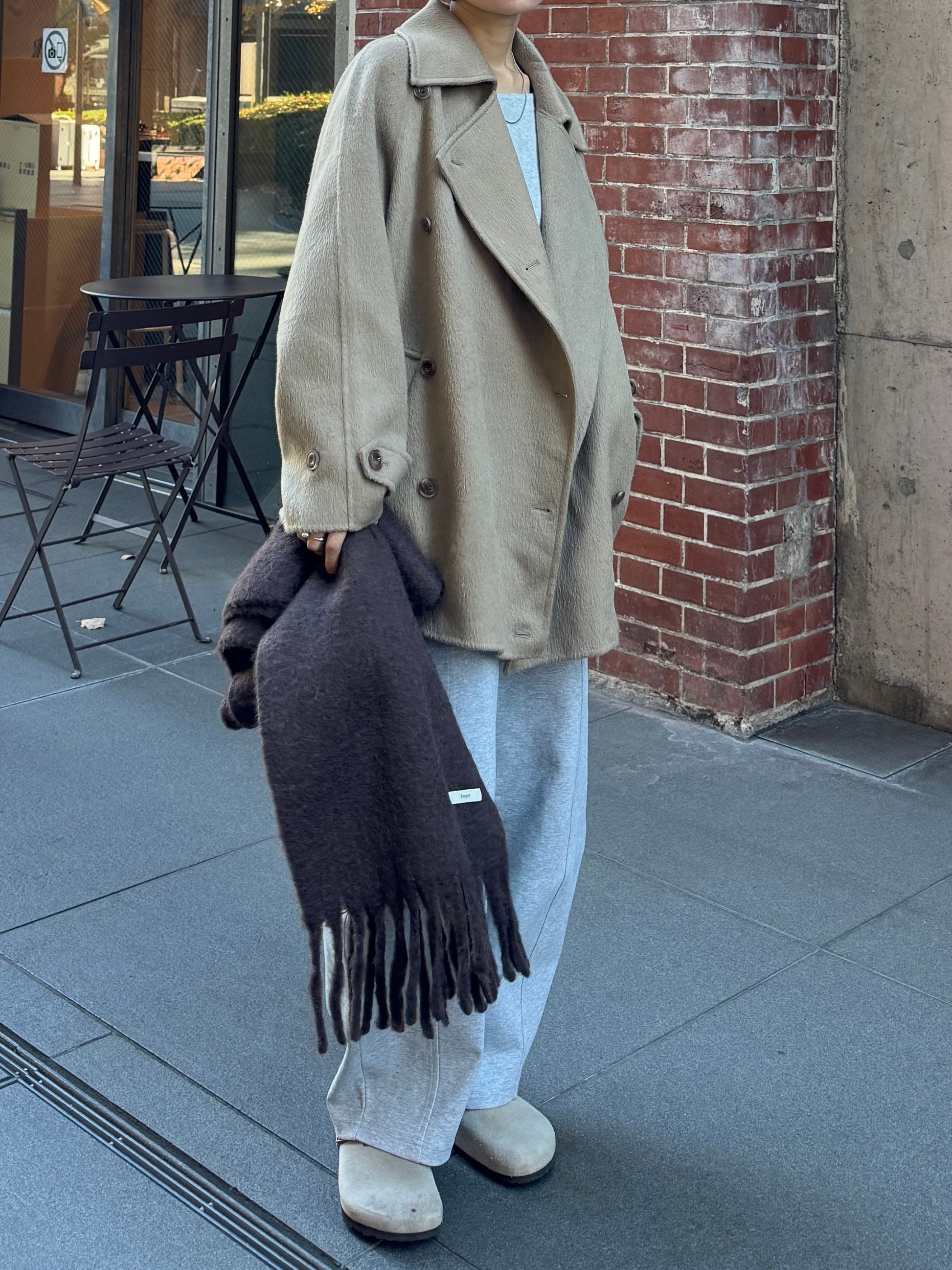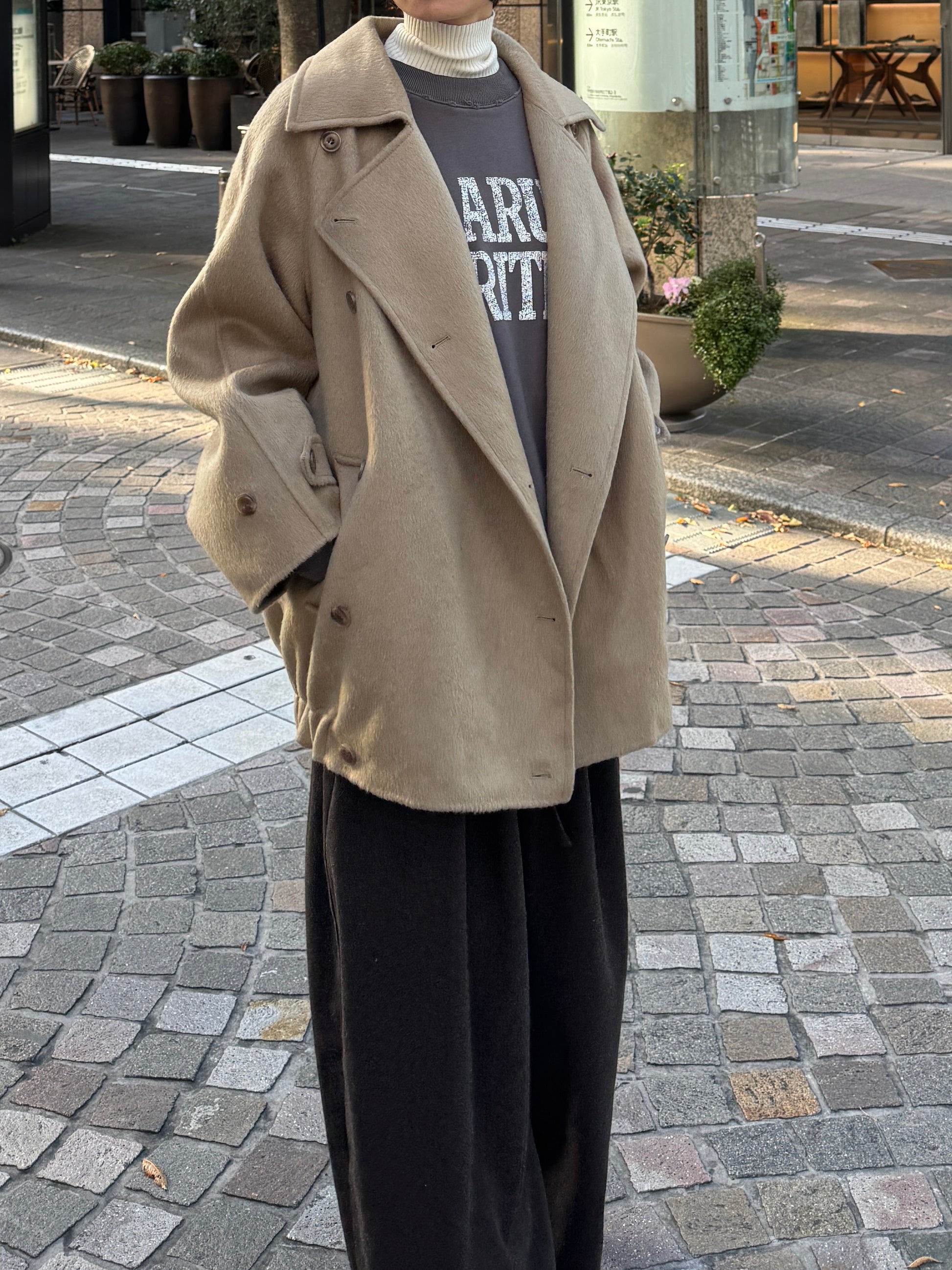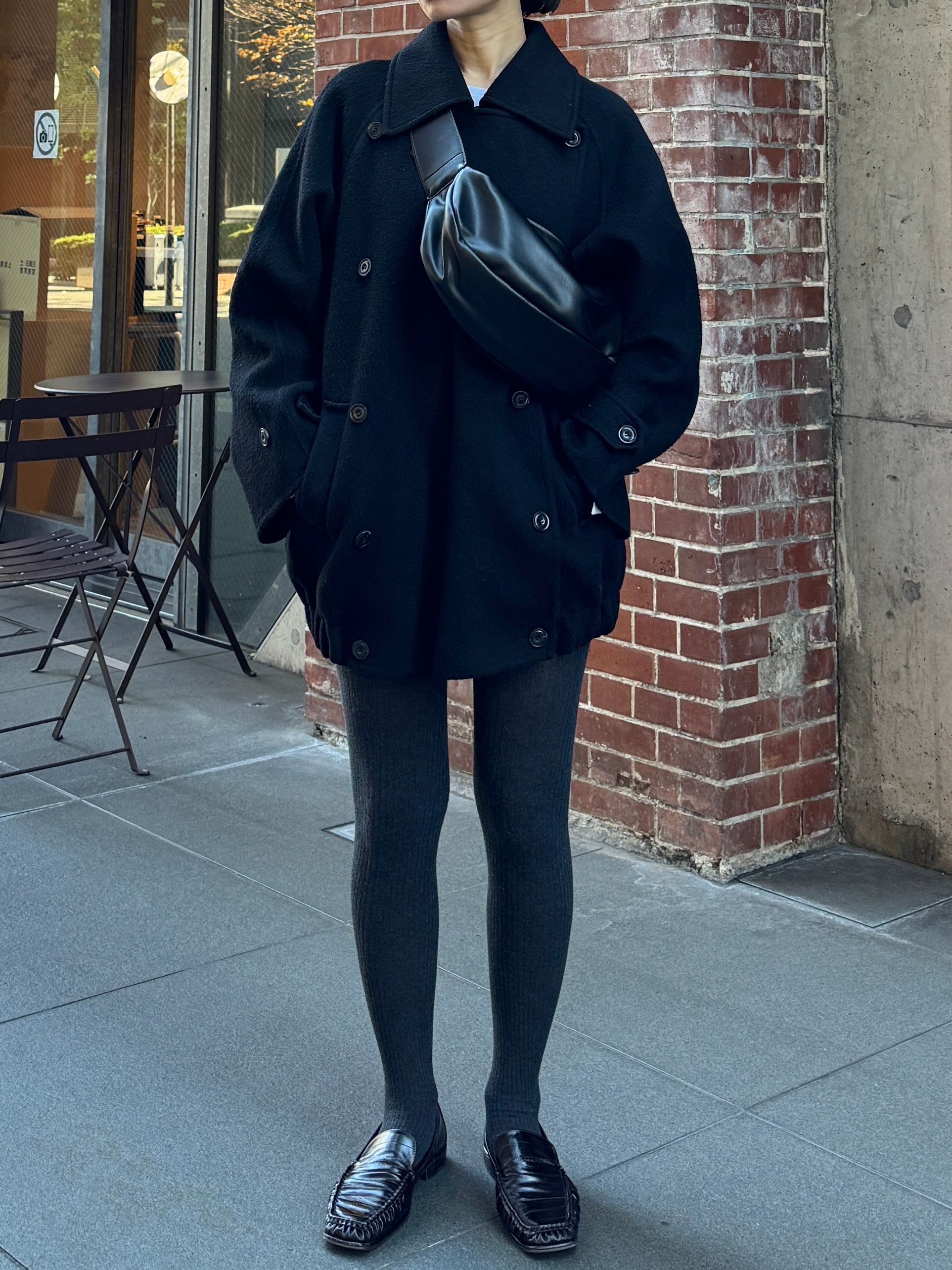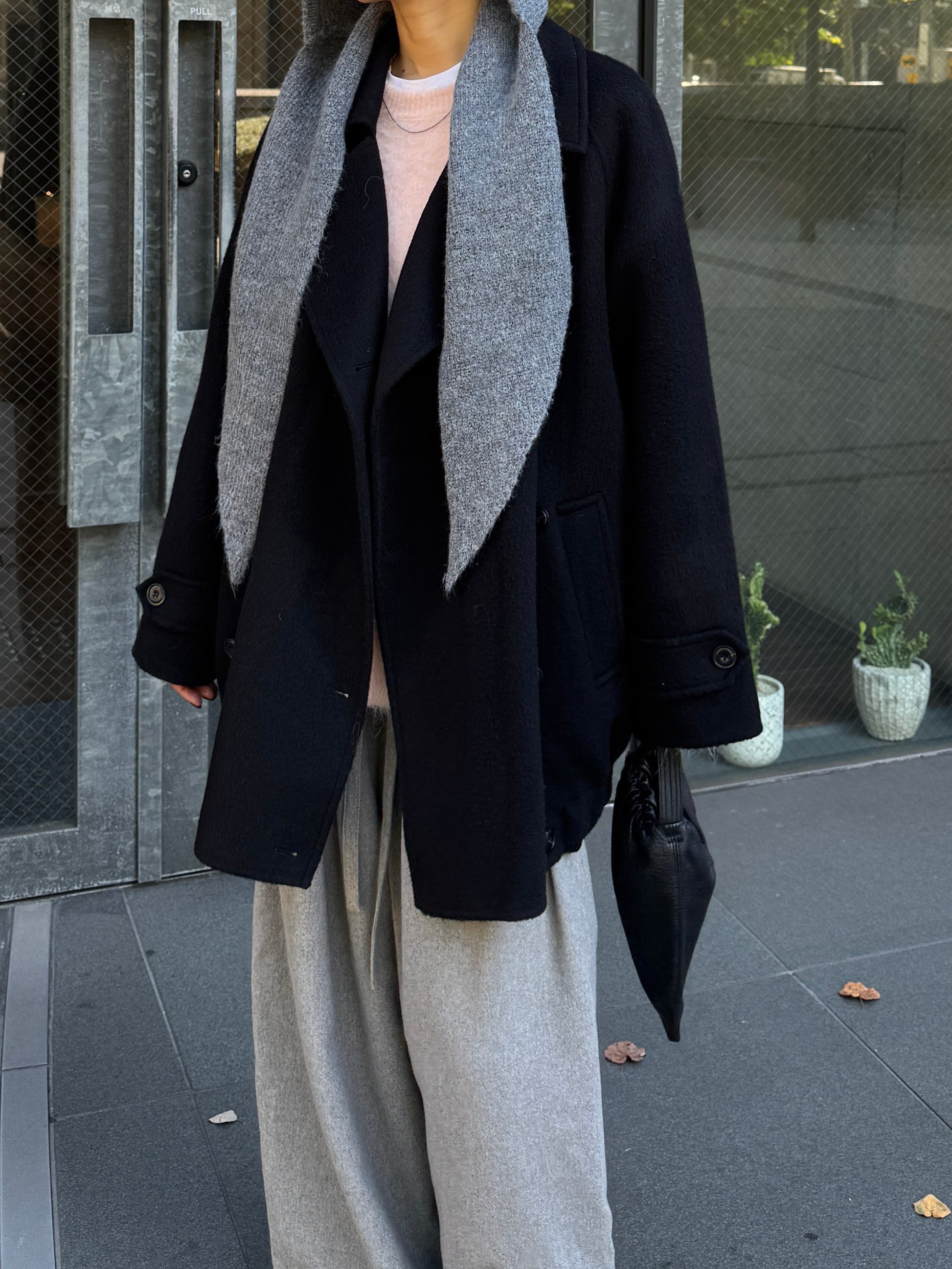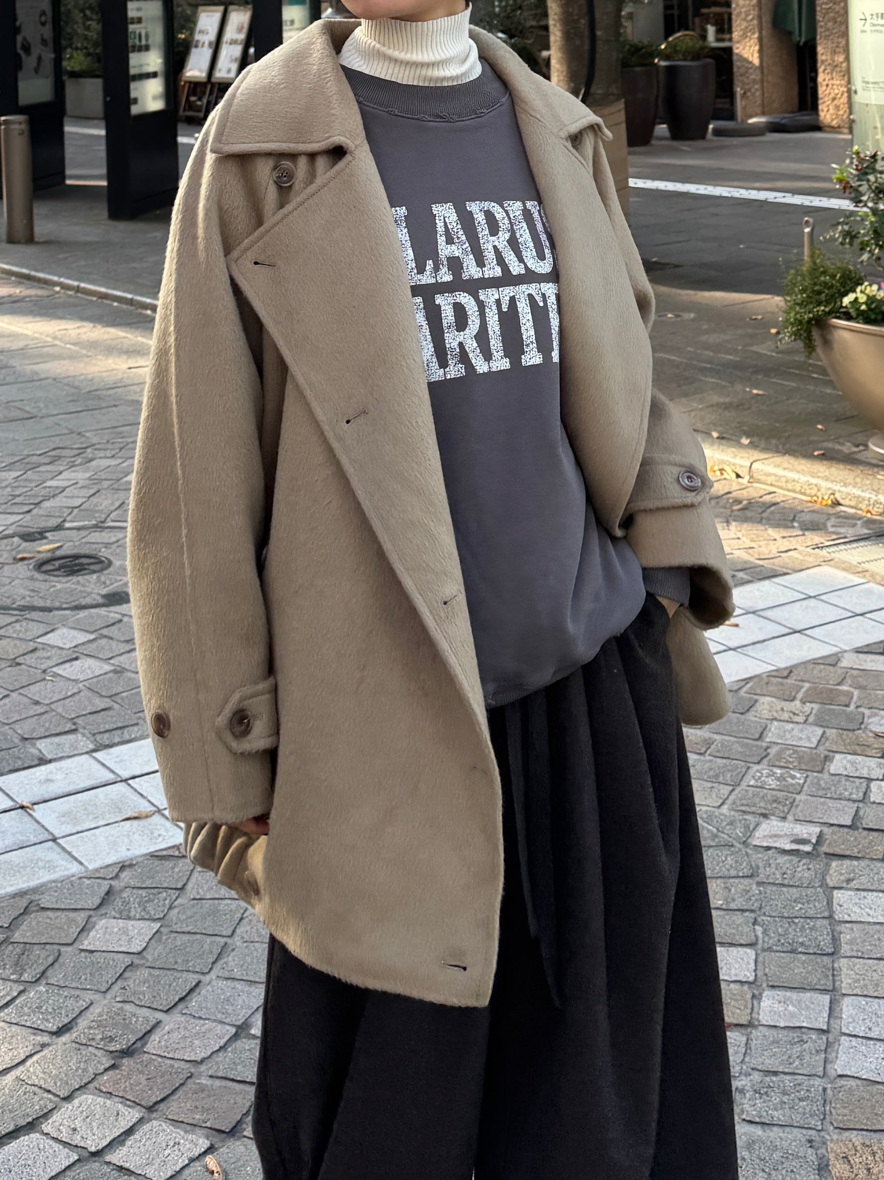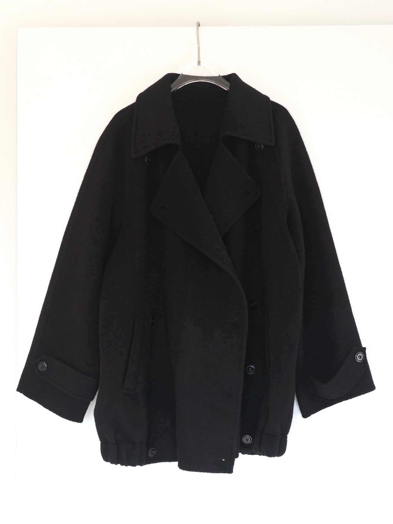 クラシックなPコートを、ゆったりと今のムードに落とし込んだ冬のオーバージャケット。 ウール100%の上質な素材ながら、軽やかで見た目以上に負担のない着心地が魅力です。 ゆとりのあるワイドシルエットに、肩線を落としたラグランスリーブを組み合わせリラックス感と程よい抜けをプラス。 厚手のニットやスウェットなどのレイヤードももたつきにくい、余白のあるフォルムが◎ フロントはクラシックな雰囲気のダブルボタン、低めに配置されたボタンが重心を落ち着かせシンプルながらこなれたムードに。 袖口のストラップボタンや、裾に入ったギャザー切り替えなど細部のディティールにもこだわりシンプルながら立体感あるデザインに仕上げました。 バランスが取りやすいミドル丈に設定し、デイリーに羽織れる気軽さがありながら品よくまとまる1着。