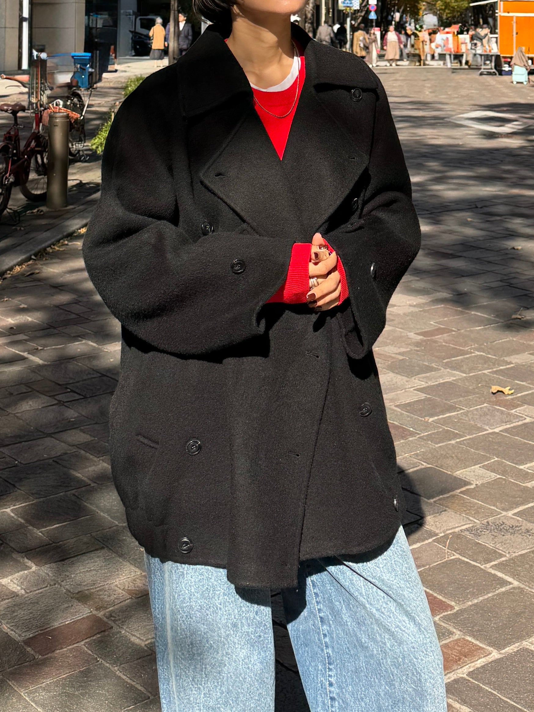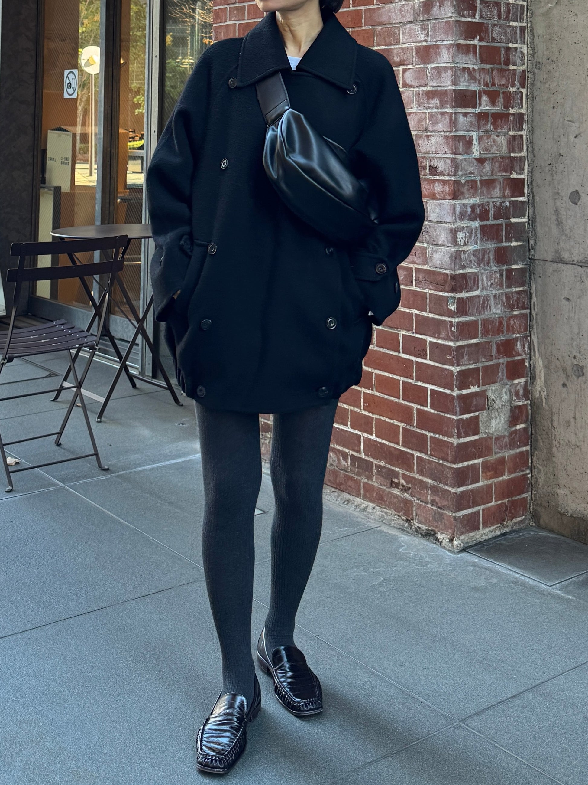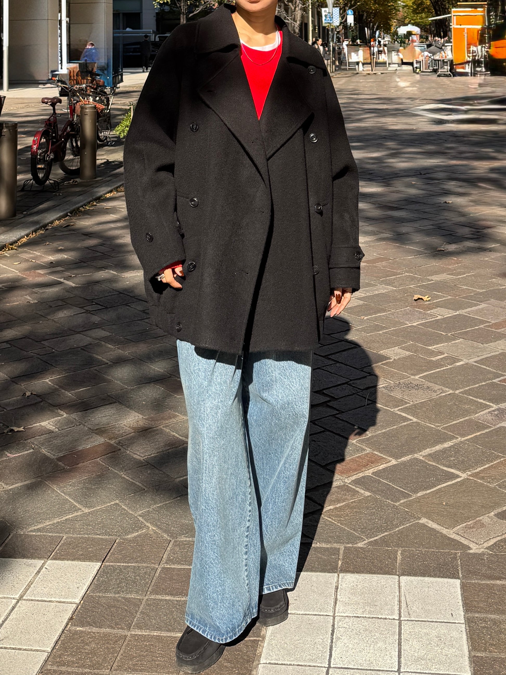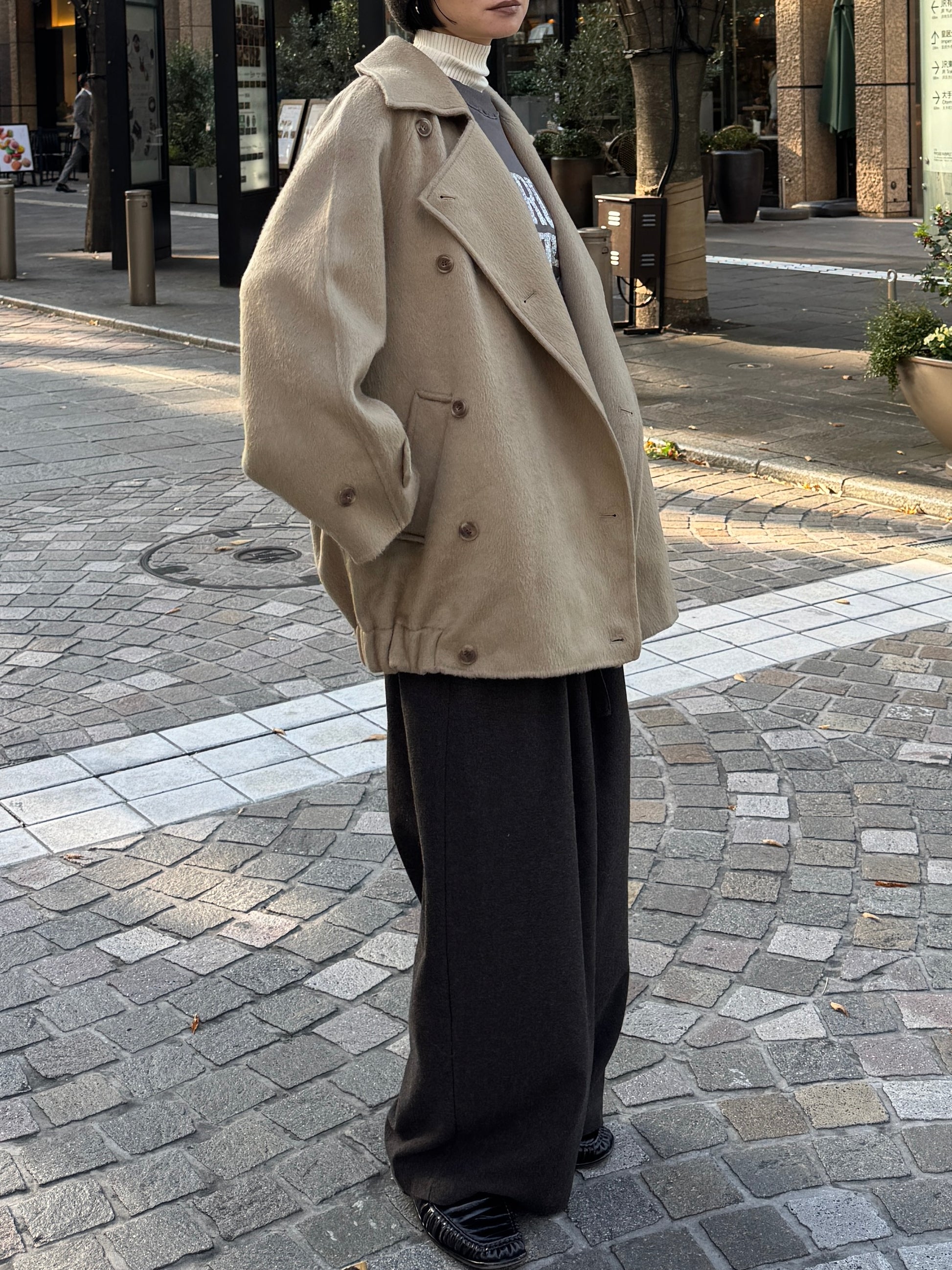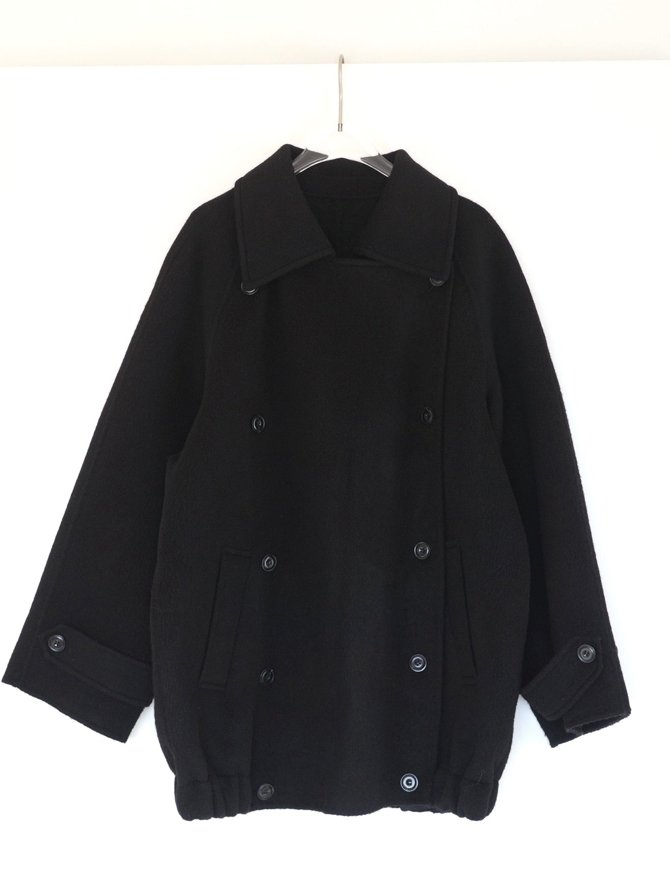 クラシックなPコートを、ゆったりと今のムードに落とし込んだ冬のオーバージャケット。 ウール100%の上質な素材ながら、軽やかで見た目以上に負担のない着心地が魅力です。 ゆとりのあるワイドシルエットに、肩線を落としたラグランスリーブを組み合わせリラックス感と程よい抜けをプラス。 厚手のニットやスウェットなどのレイヤードももたつきにくい、余白のあるフォルムが◎ フロントはクラシックな雰囲気のダブルボタン、低めに配置されたボタンが重心を落ち着かせシンプルながらこなれたムードに。 袖口のストラップボタンや、裾に入ったギャザー切り替えなど細部のディティールにもこだわりシンプルながら立体感あるデザインに仕上げました。 バランスが取りやすいミドル丈に設定し、デイリーに羽織れる気軽さがありながら品よくまとまる1着。