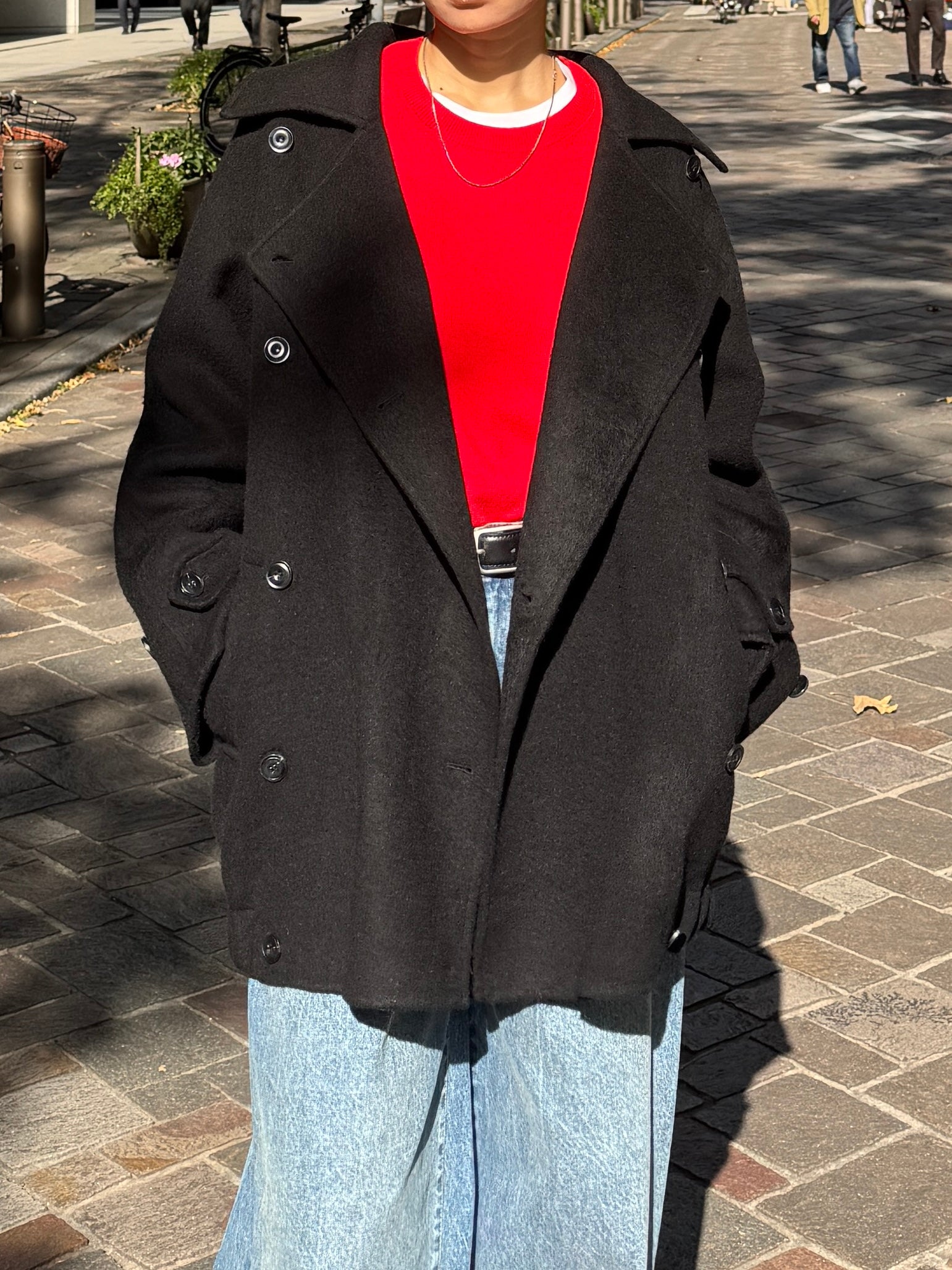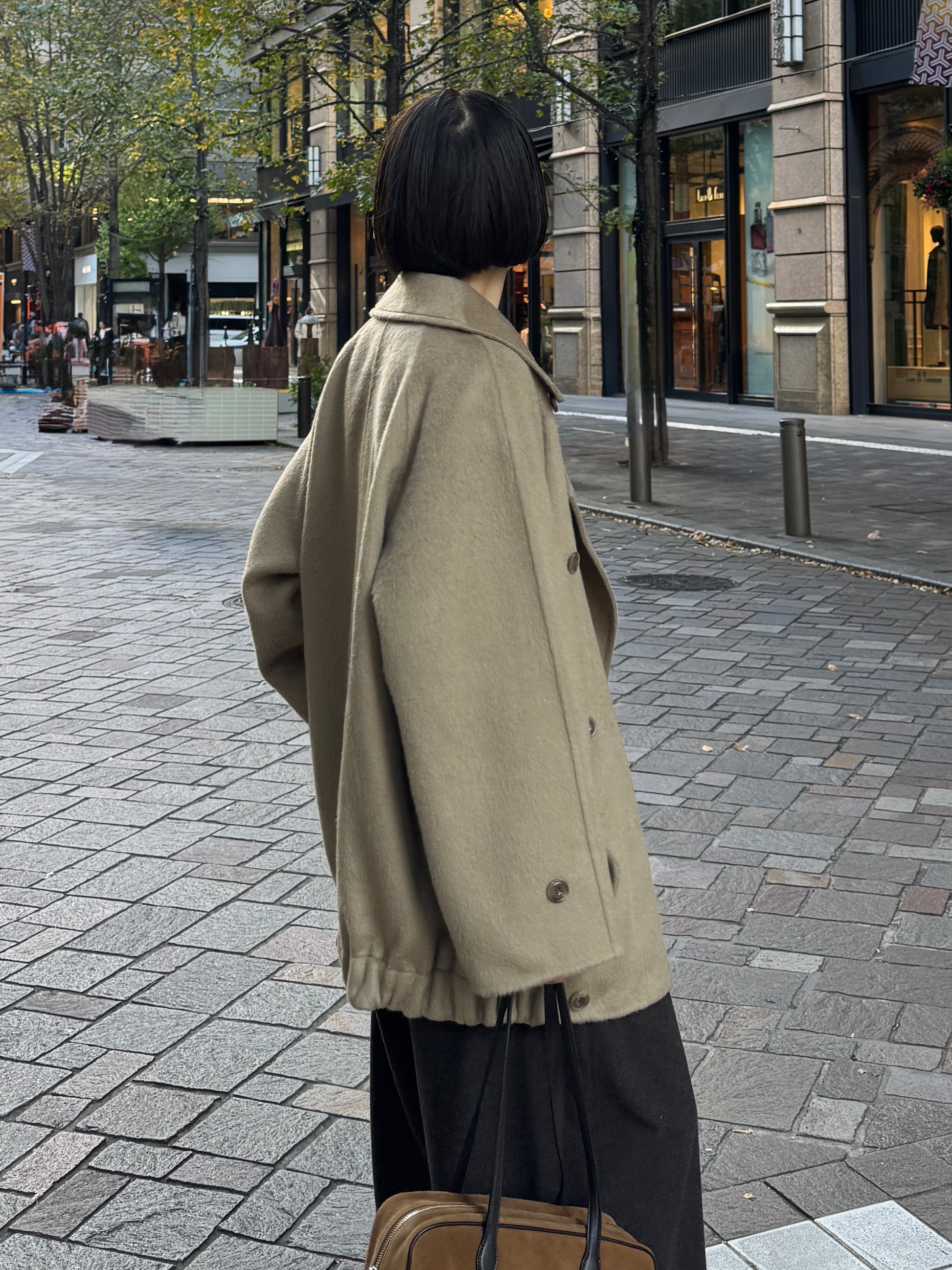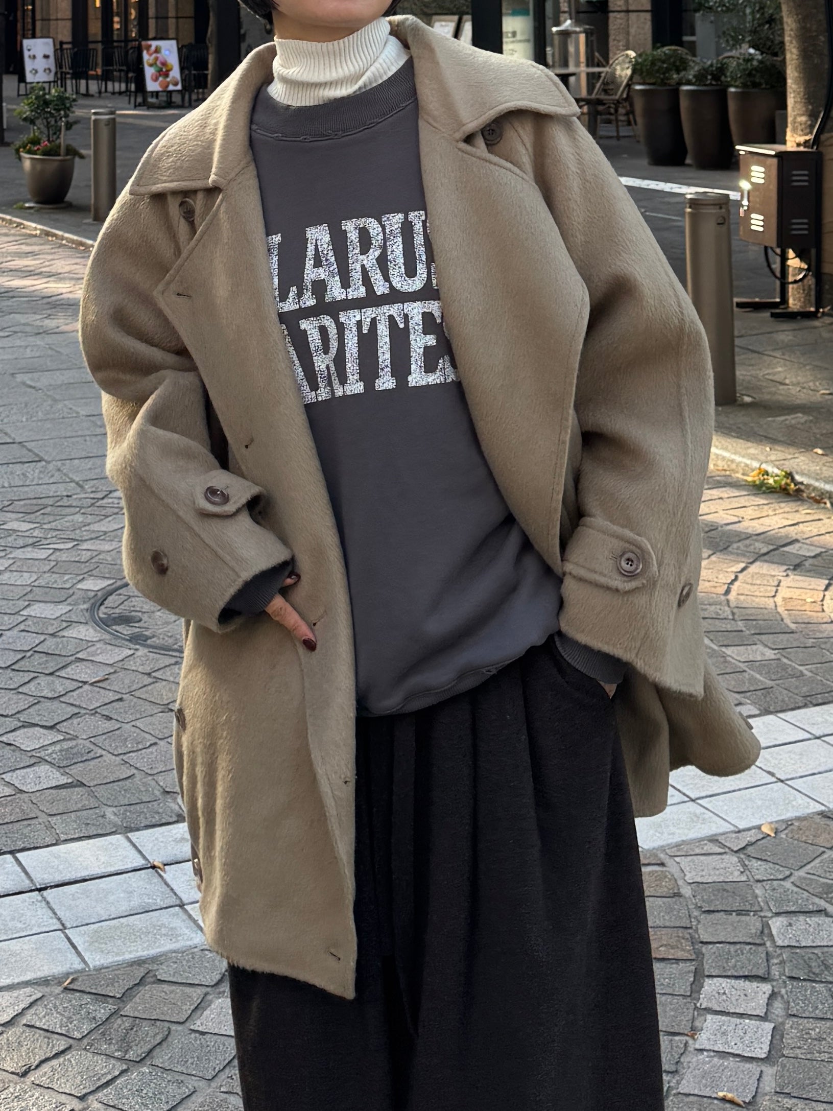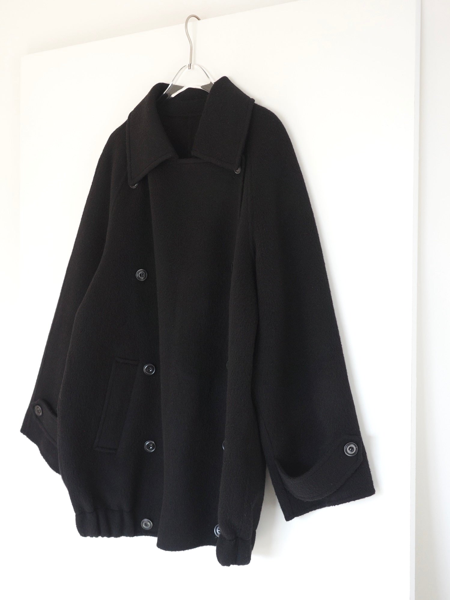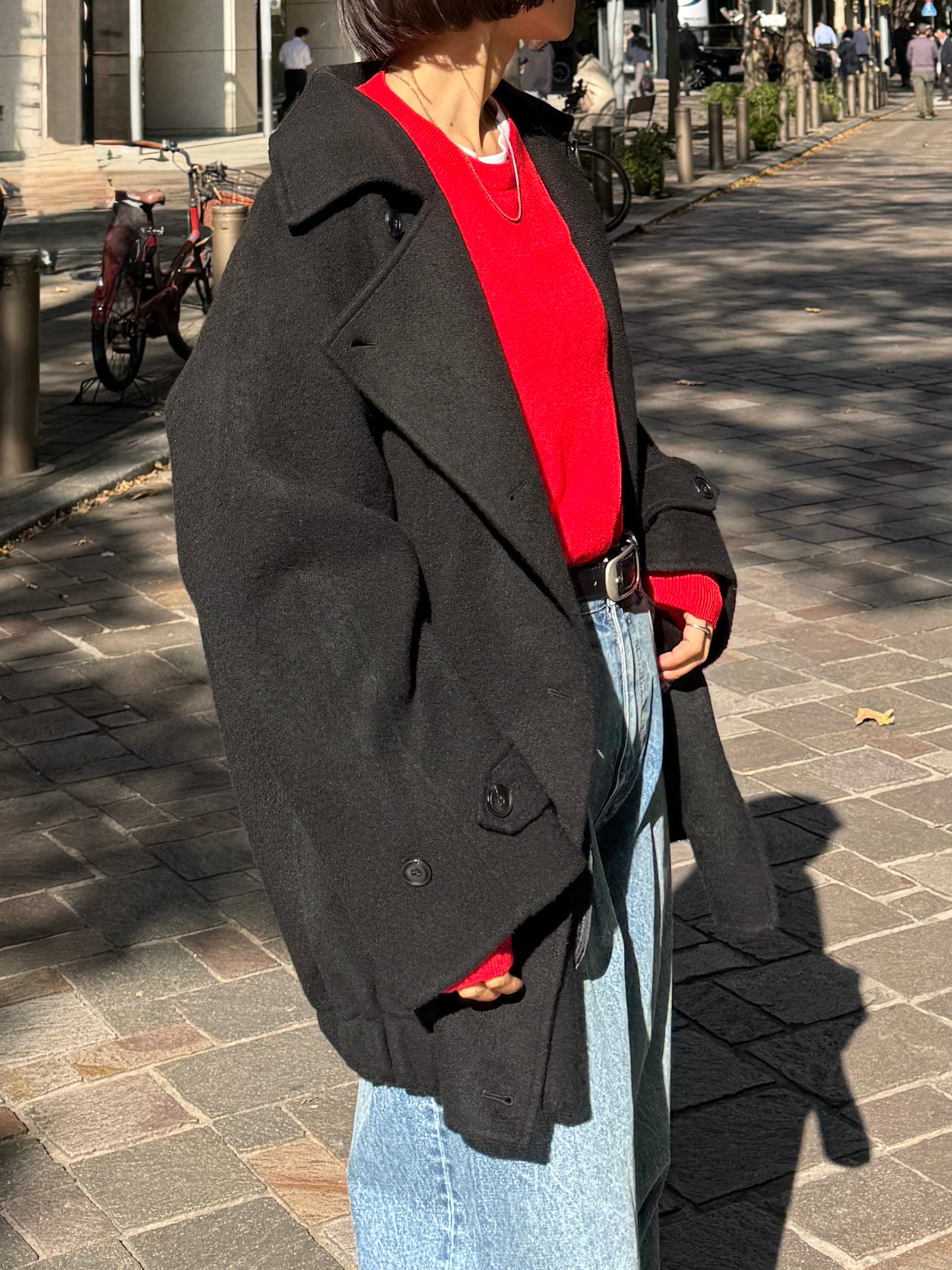 クラシックなPコートを、ゆったりと今のムードに落とし込んだ冬のオーバージャケット。 ウール100%の上質な素材ながら、軽やかで見た目以上に負担のない着心地が魅力です。 ゆとりのあるワイドシルエットに、肩線を落としたラグランスリーブを組み合わせリラックス感と程よい抜けをプラス。 厚手のニットやスウェットなどのレイヤードももたつきにくい、余白のあるフォルムが◎ フロントはクラシックな雰囲気のダブルボタン、低めに配置されたボタンが重心を落ち着かせシンプルながらこなれたムードに。 袖口のストラップボタンや、裾に入ったギャザー切り替えなど細部のディティールにもこだわりシンプルながら立体感あるデザインに仕上げました。 バランスが取りやすいミドル丈に設定し、デイリーに羽織れる気軽さがありながら品よくまとまる1着。