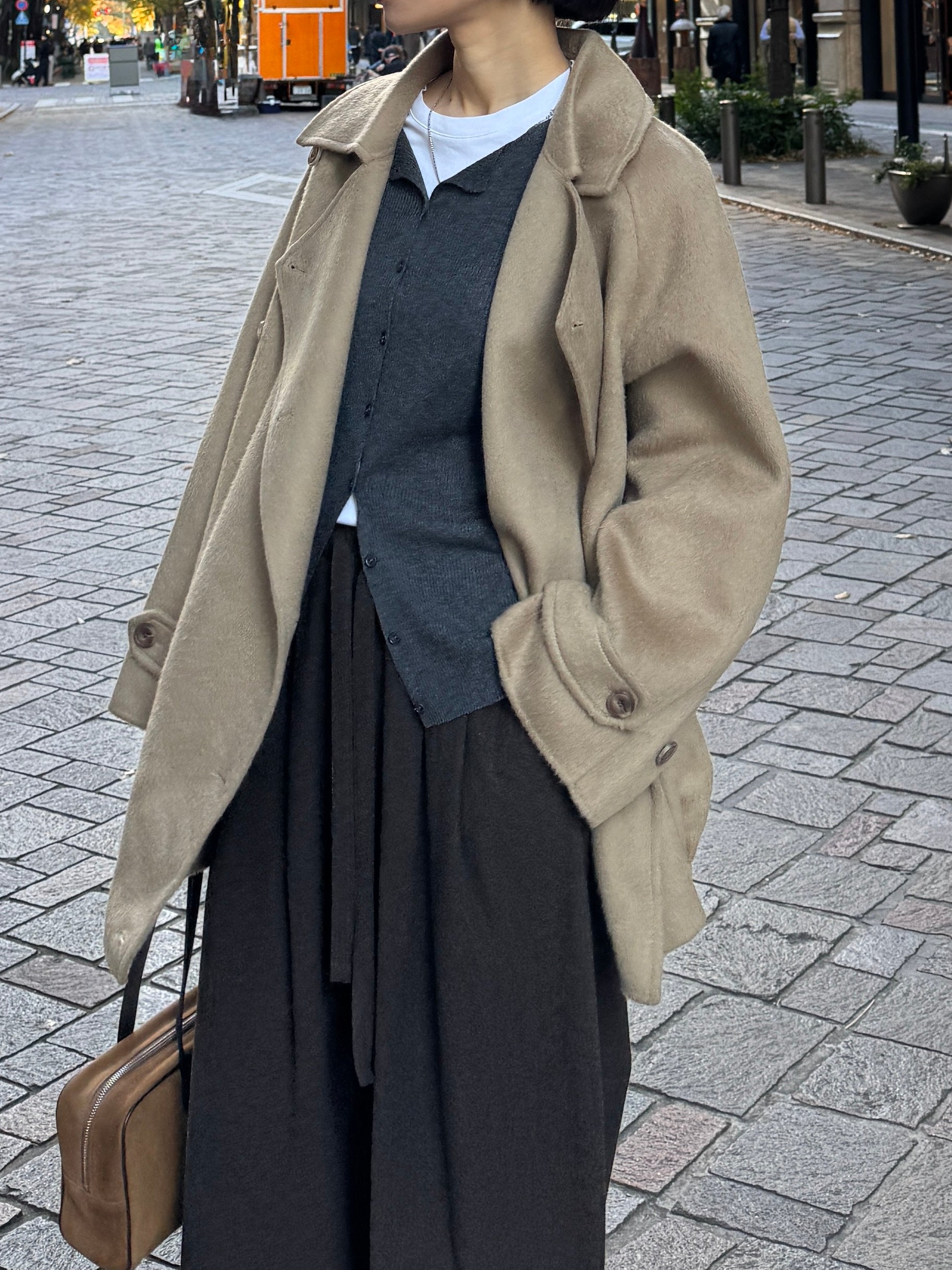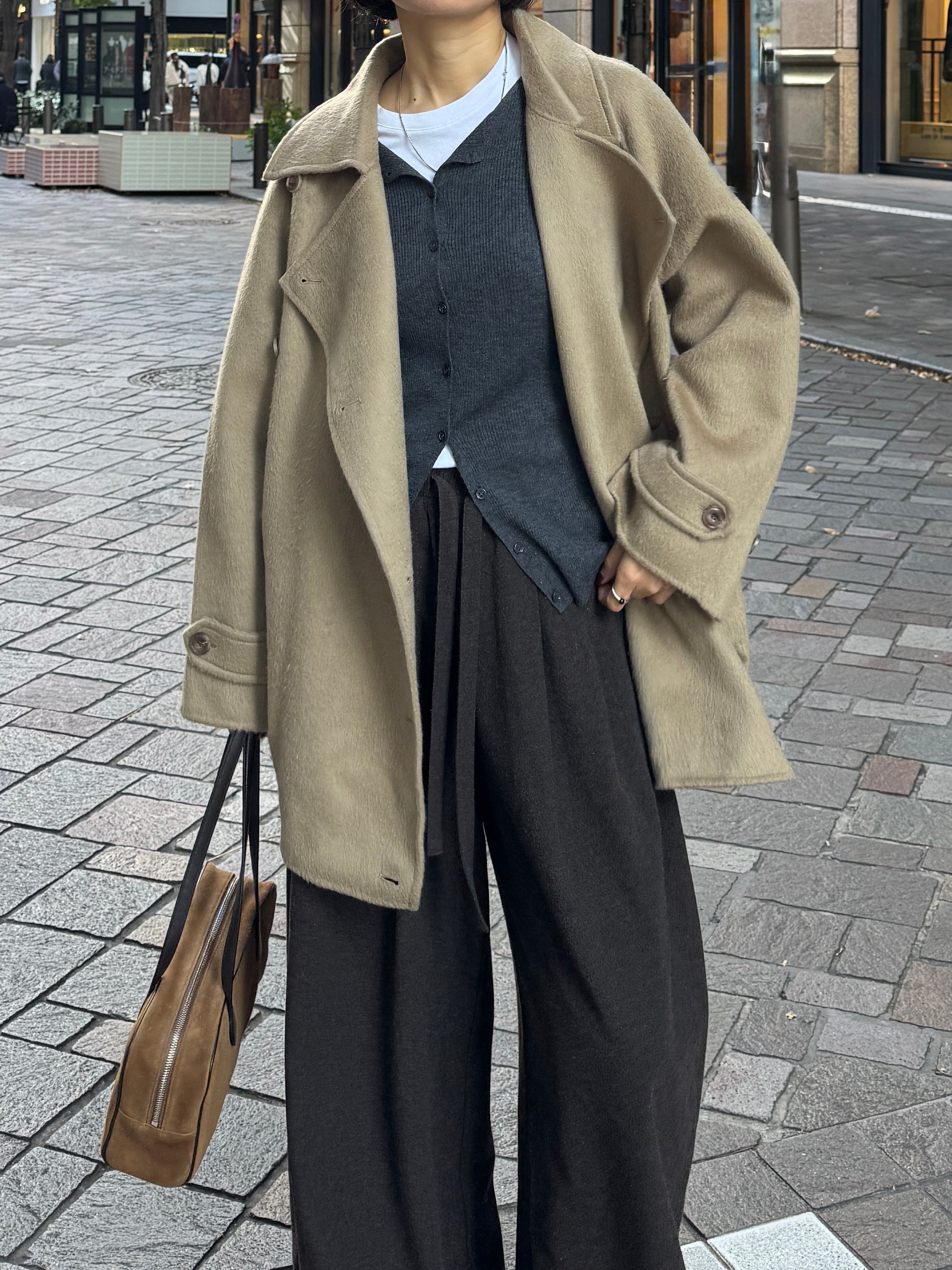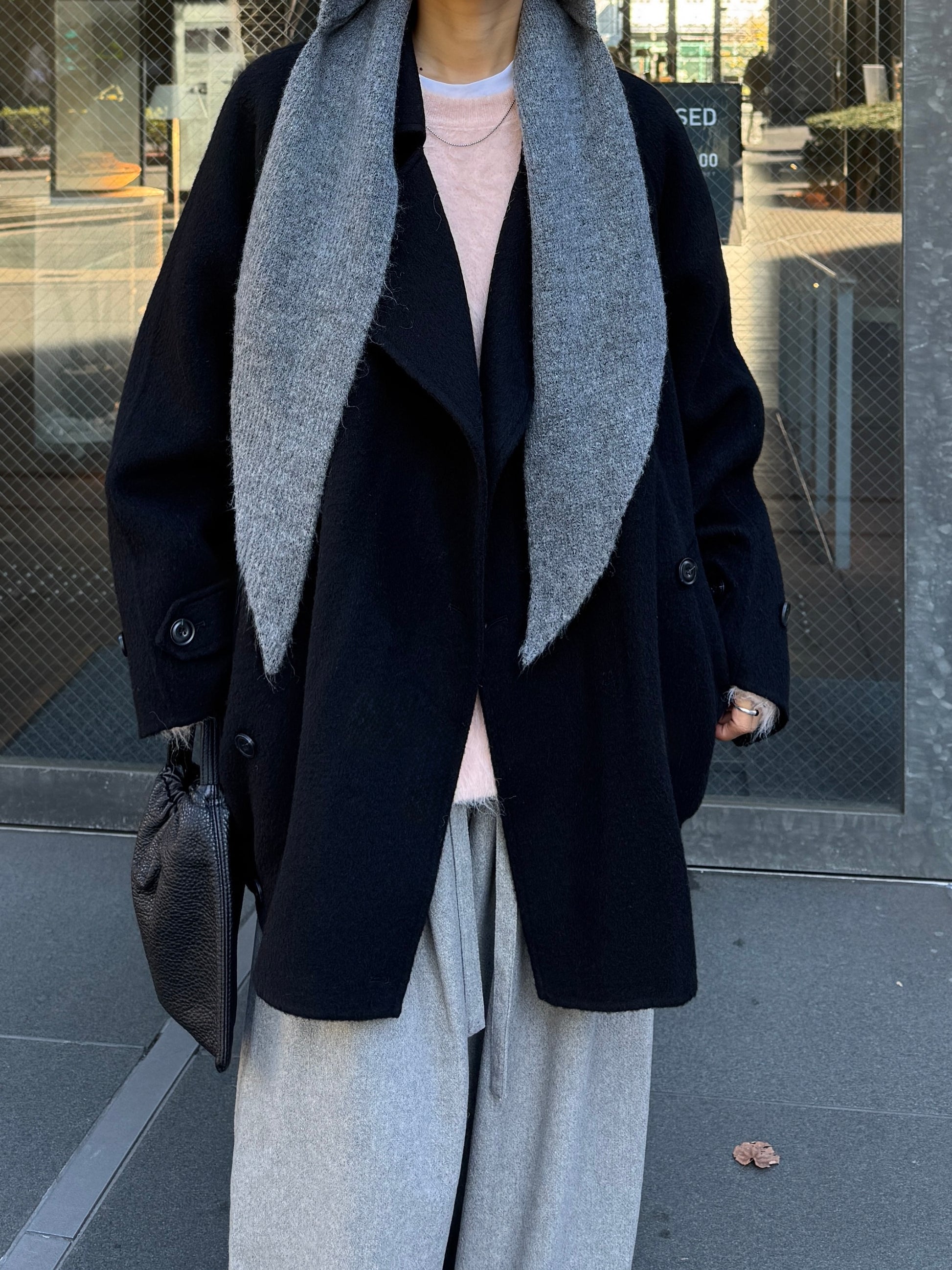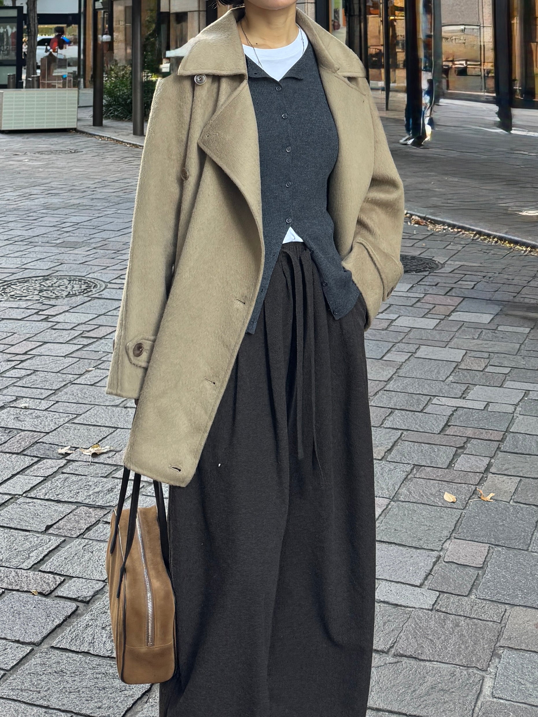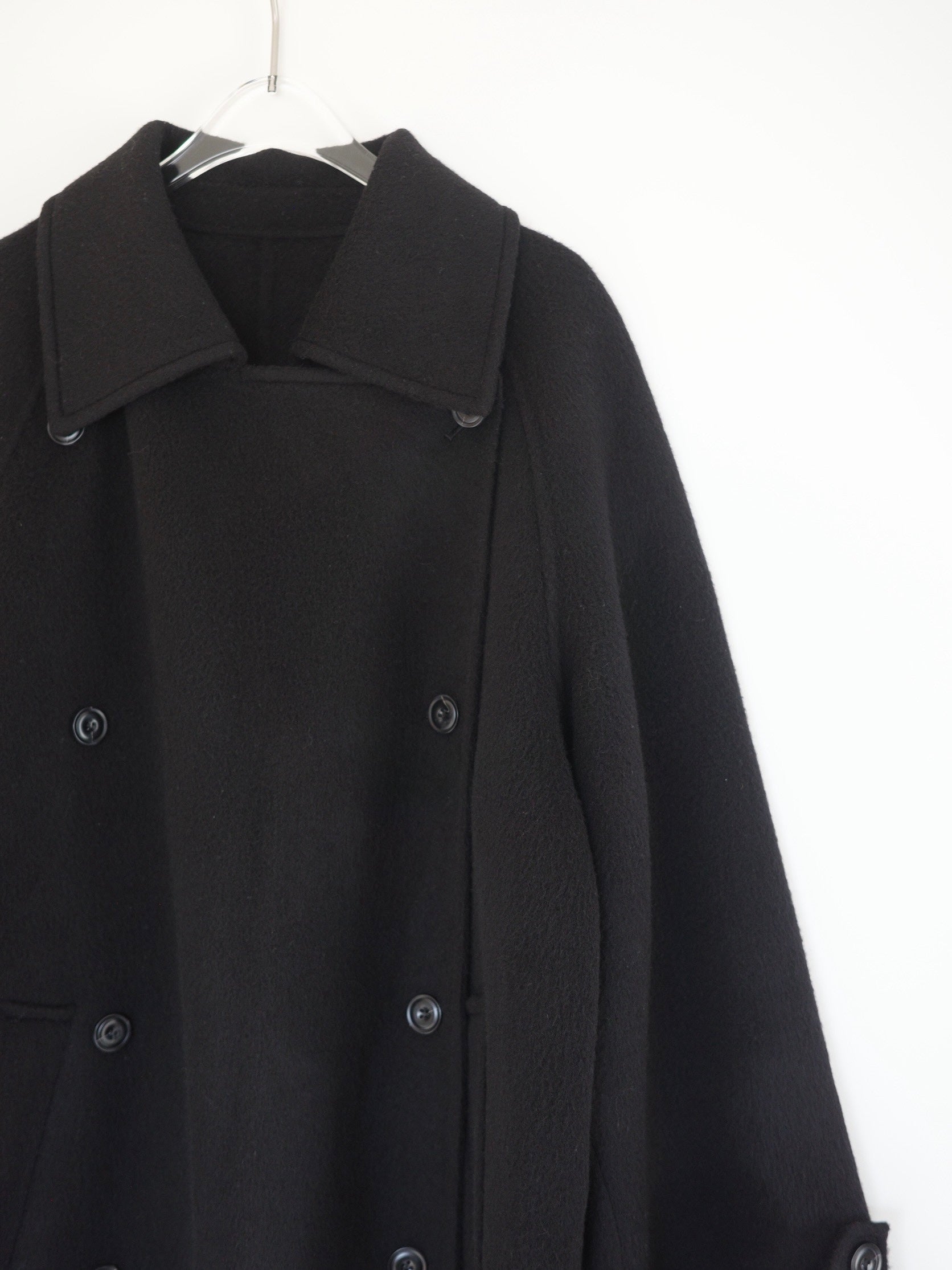 クラシックなPコートを、ゆったりと今のムードに落とし込んだ冬のオーバージャケット。 ウール100%の上質な素材ながら、軽やかで見た目以上に負担のない着心地が魅力です。 ゆとりのあるワイドシルエットに、肩線を落としたラグランスリーブを組み合わせリラックス感と程よい抜けをプラス。 厚手のニットやスウェットなどのレイヤードももたつきにくい、余白のあるフォルムが◎ フロントはクラシックな雰囲気のダブルボタン、低めに配置されたボタンが重心を落ち着かせシンプルながらこなれたムードに。 袖口のストラップボタンや、裾に入ったギャザー切り替えなど細部のディティールにもこだわりシンプルながら立体感あるデザインに仕上げました。 バランスが取りやすいミドル丈に設定し、デイリーに羽織れる気軽さがありながら品よくまとまる1着。