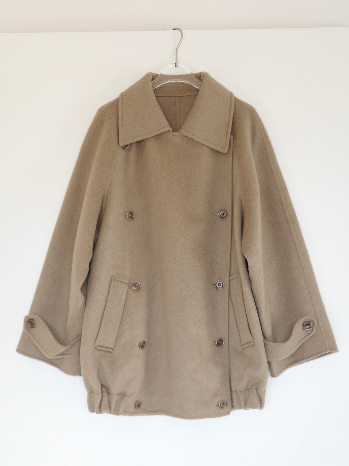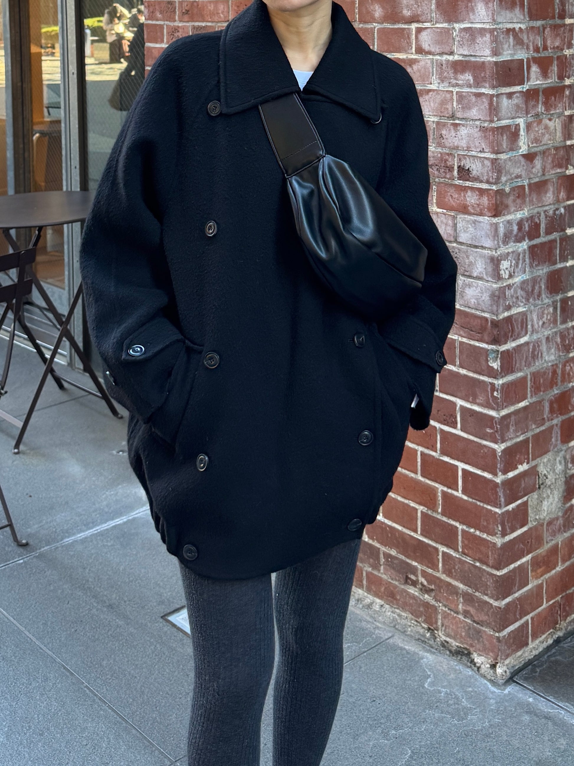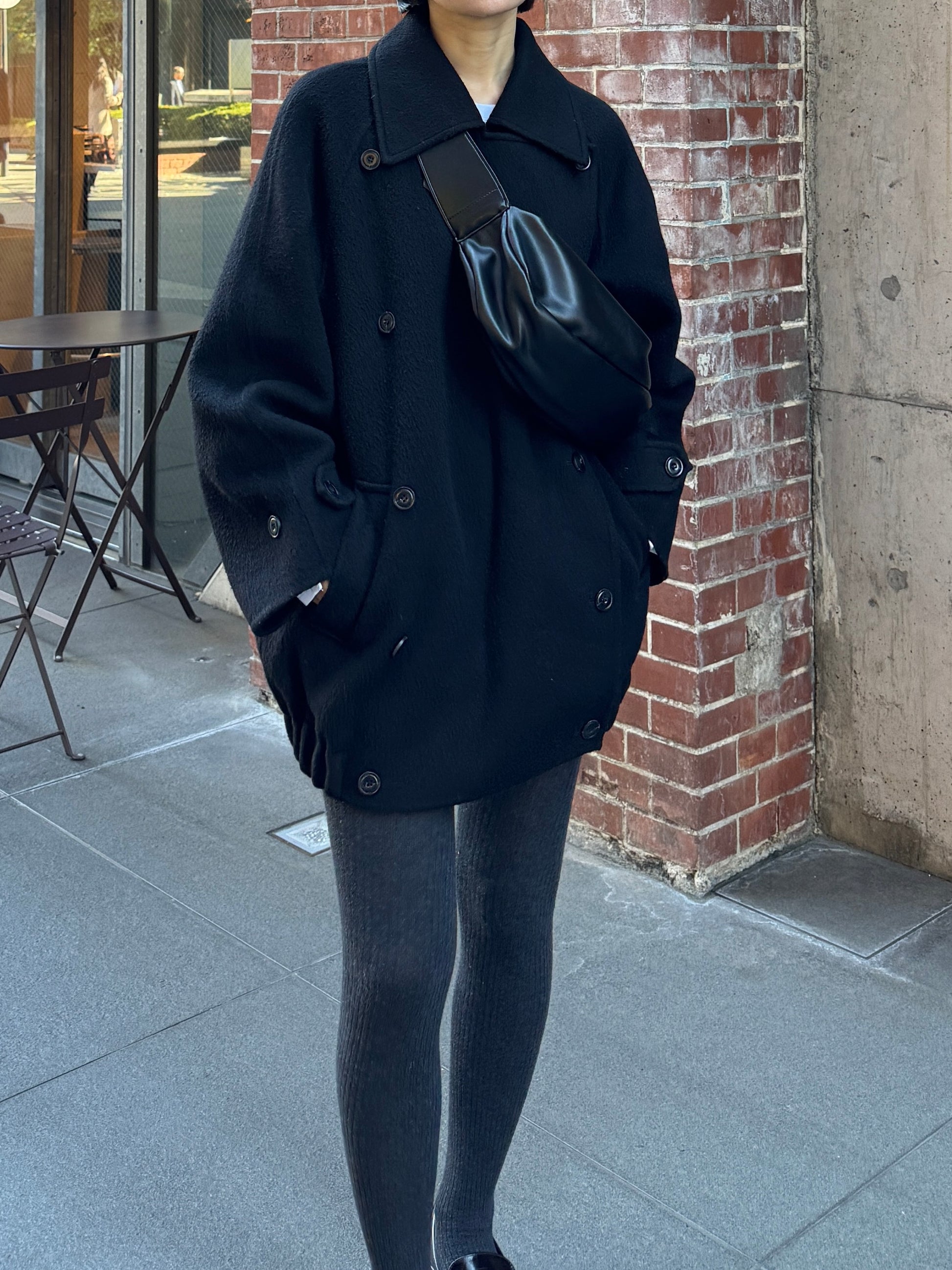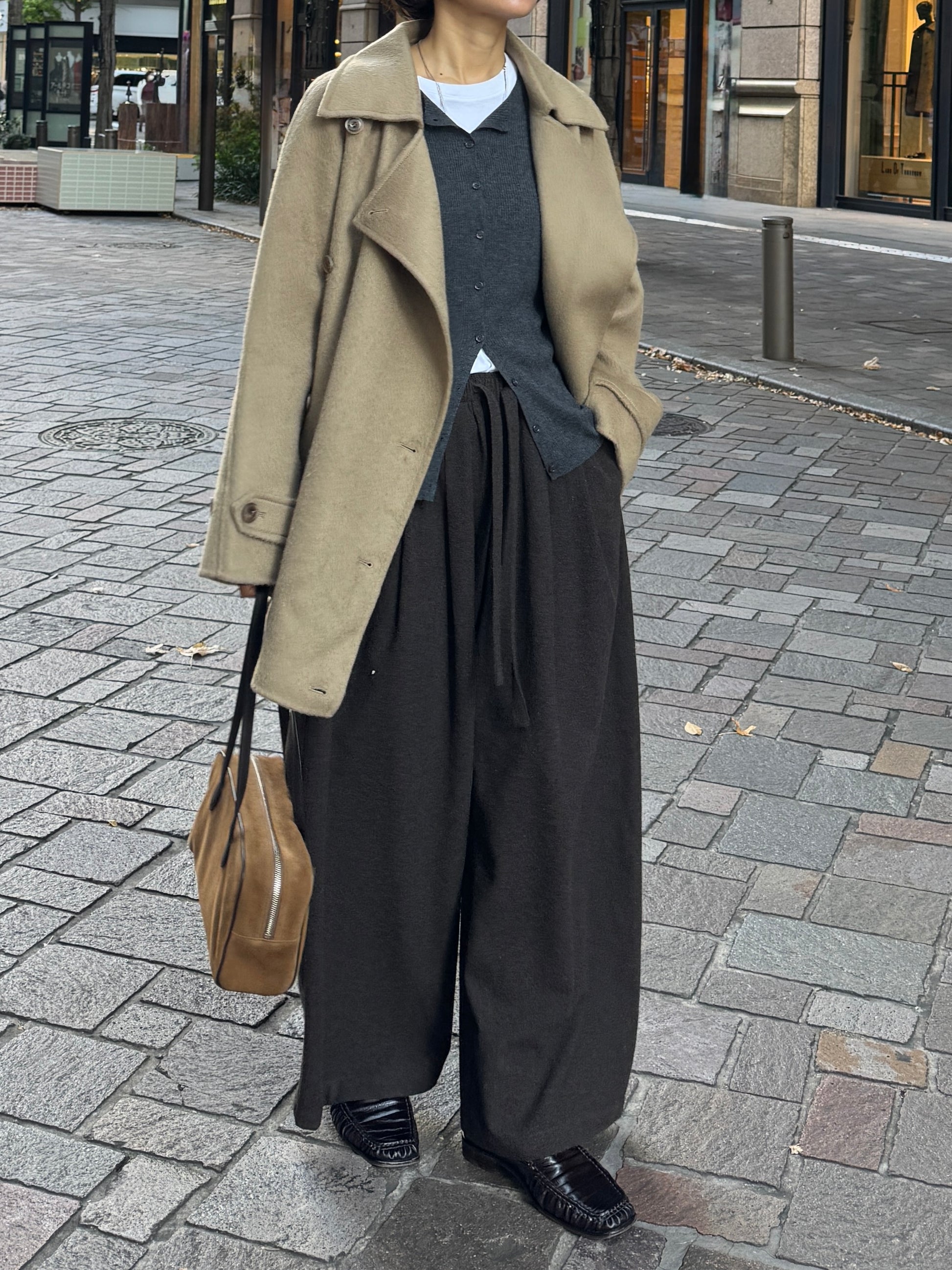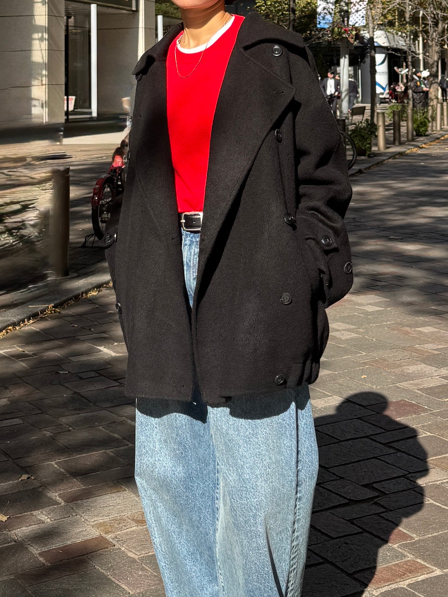 クラシックなPコートを、ゆったりと今のムードに落とし込んだ冬のオーバージャケット。 ウール100%の上質な素材ながら、軽やかで見た目以上に負担のない着心地が魅力です。 ゆとりのあるワイドシルエットに、肩線を落としたラグランスリーブを組み合わせリラックス感と程よい抜けをプラス。 厚手のニットやスウェットなどのレイヤードももたつきにくい、余白のあるフォルムが◎ フロントはクラシックな雰囲気のダブルボタン、低めに配置されたボタンが重心を落ち着かせシンプルながらこなれたムードに。 袖口のストラップボタンや、裾に入ったギャザー切り替えなど細部のディティールにもこだわりシンプルながら立体感あるデザインに仕上げました。 バランスが取りやすいミドル丈に設定し、デイリーに羽織れる気軽さがありながら品よくまとまる1着。