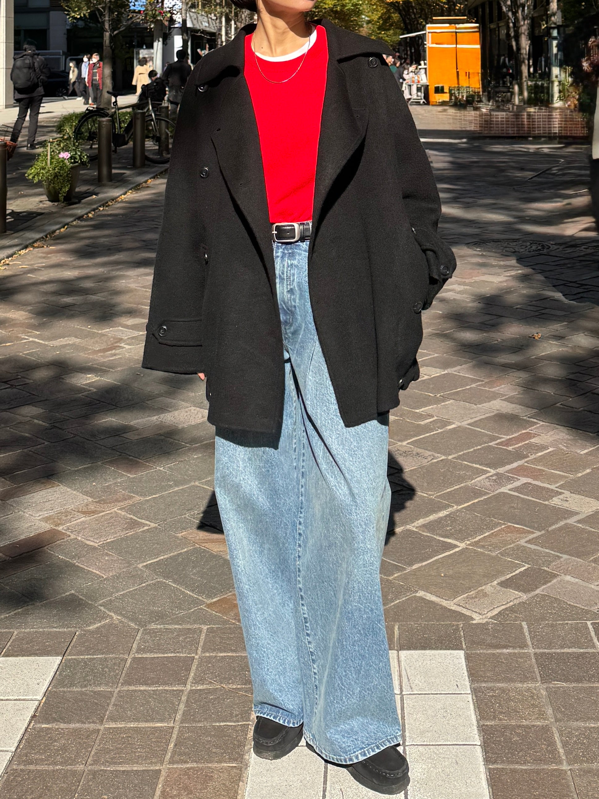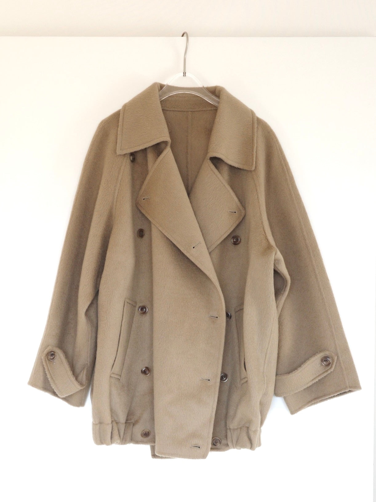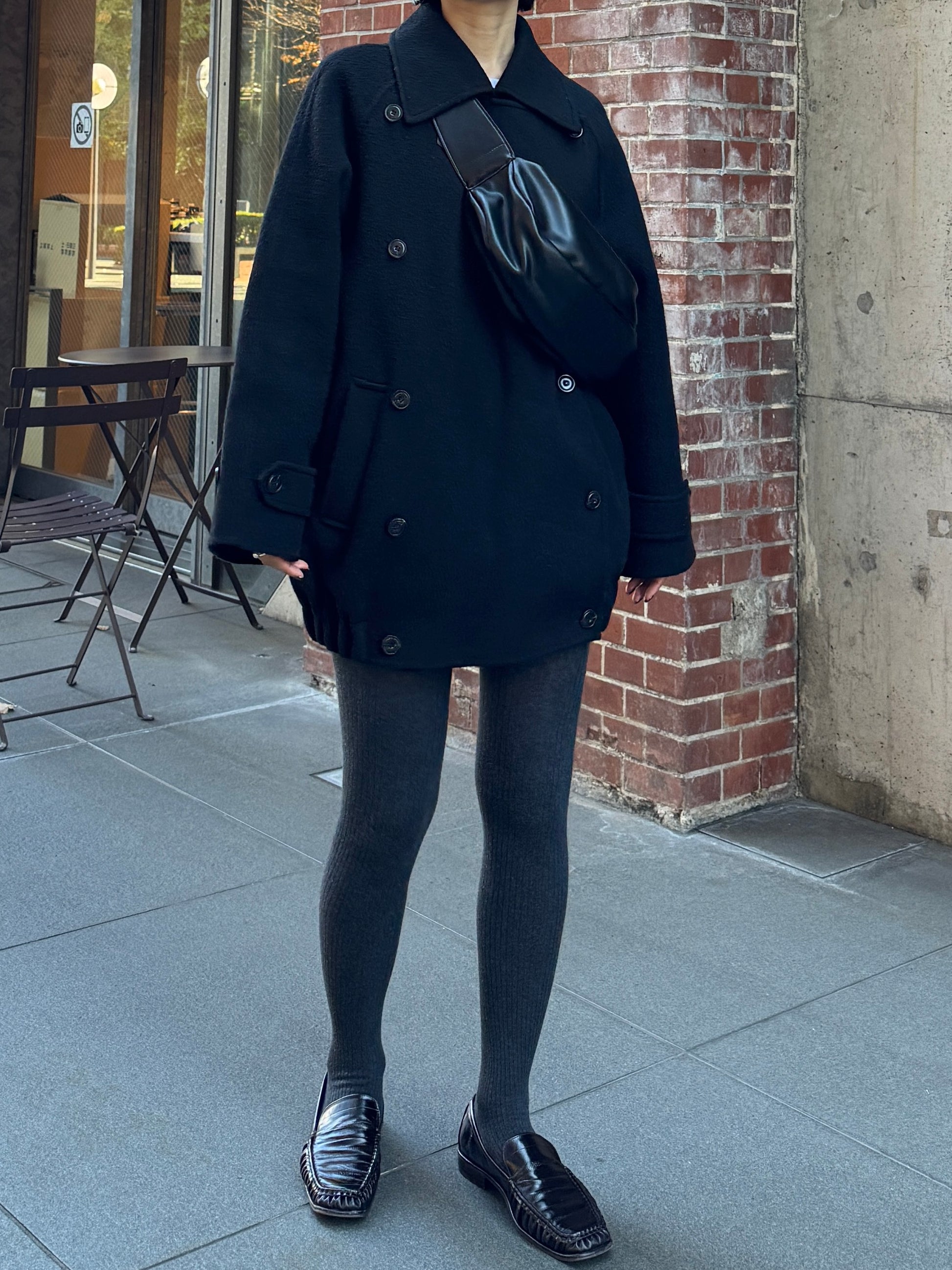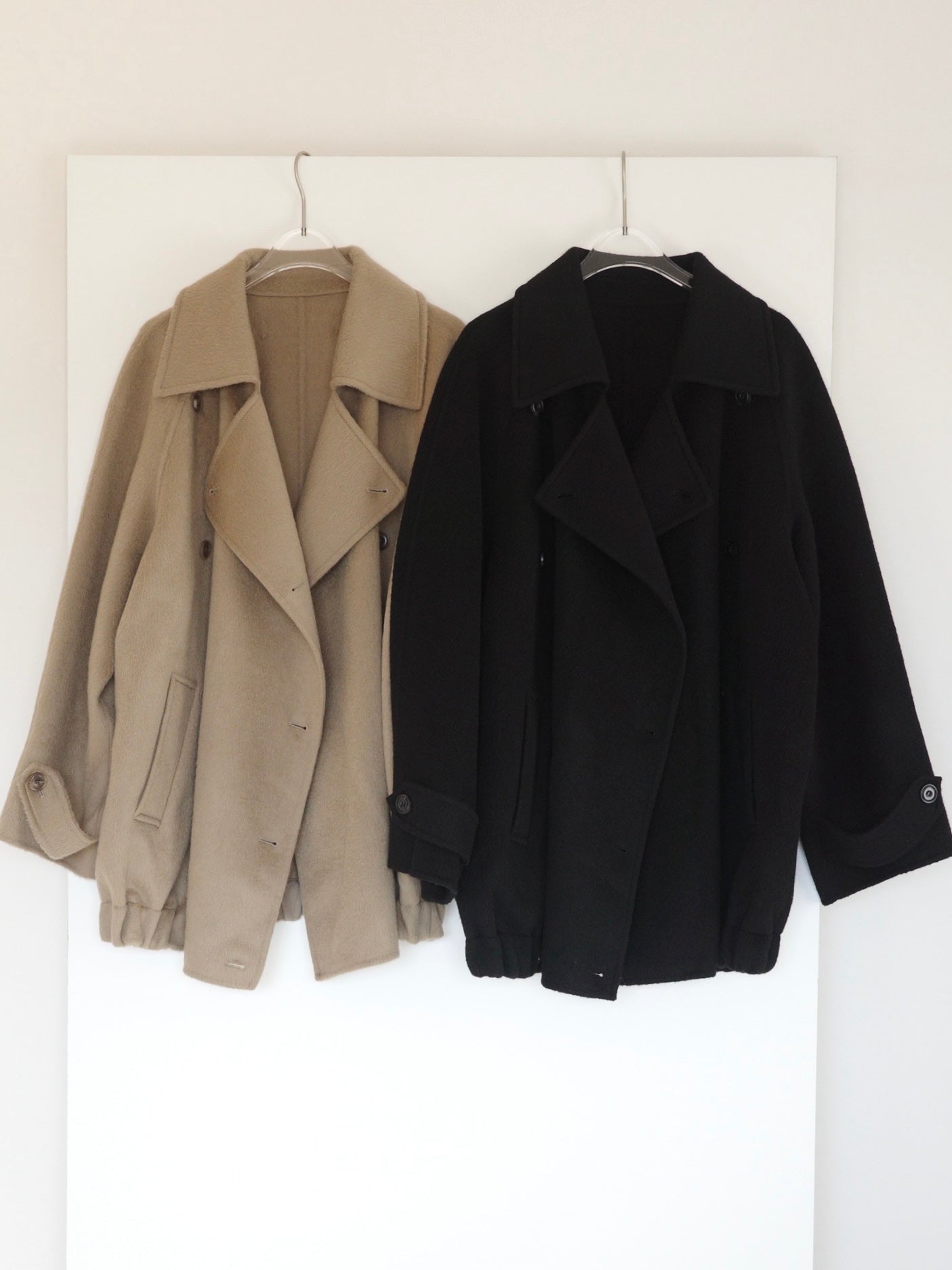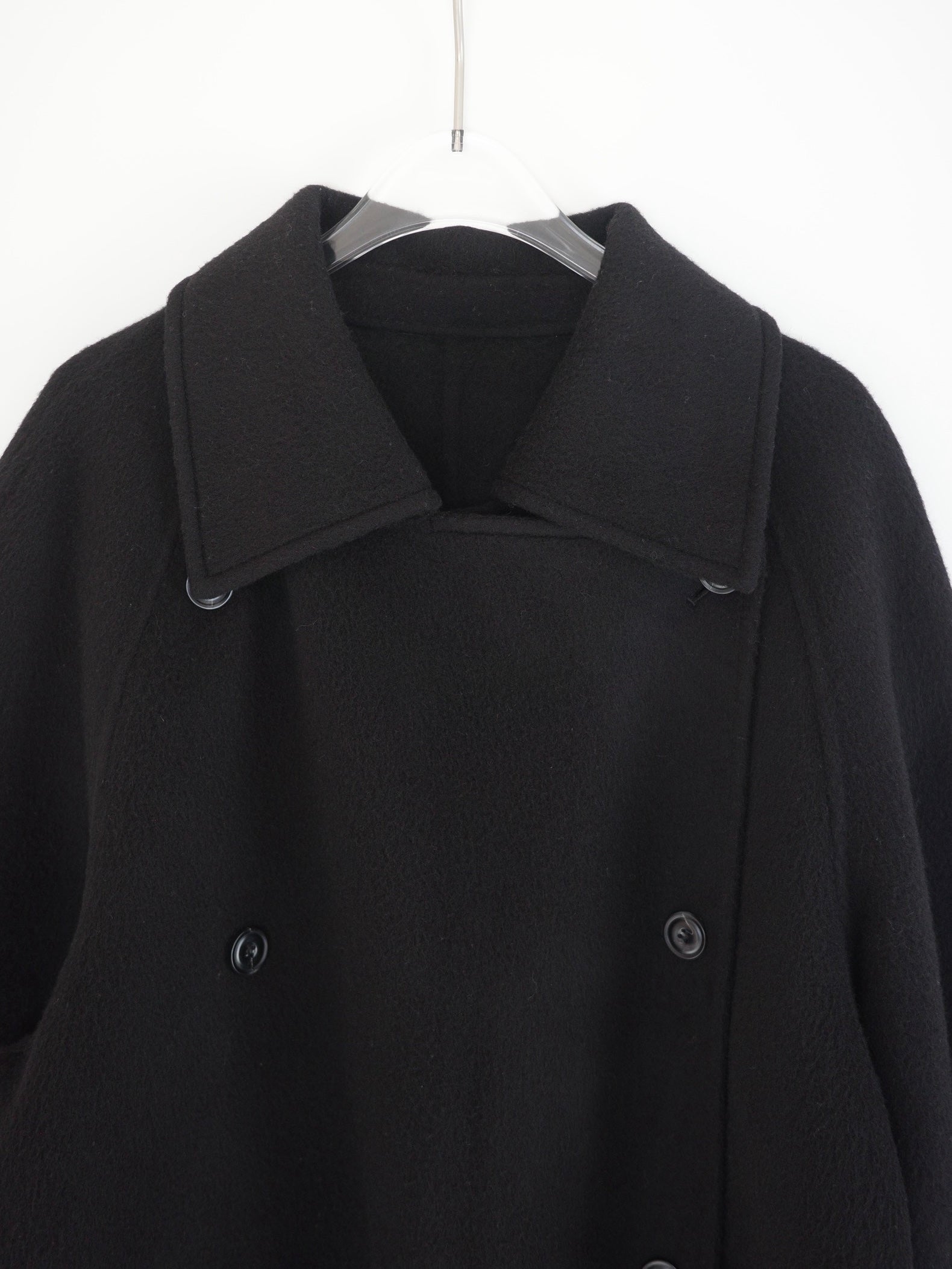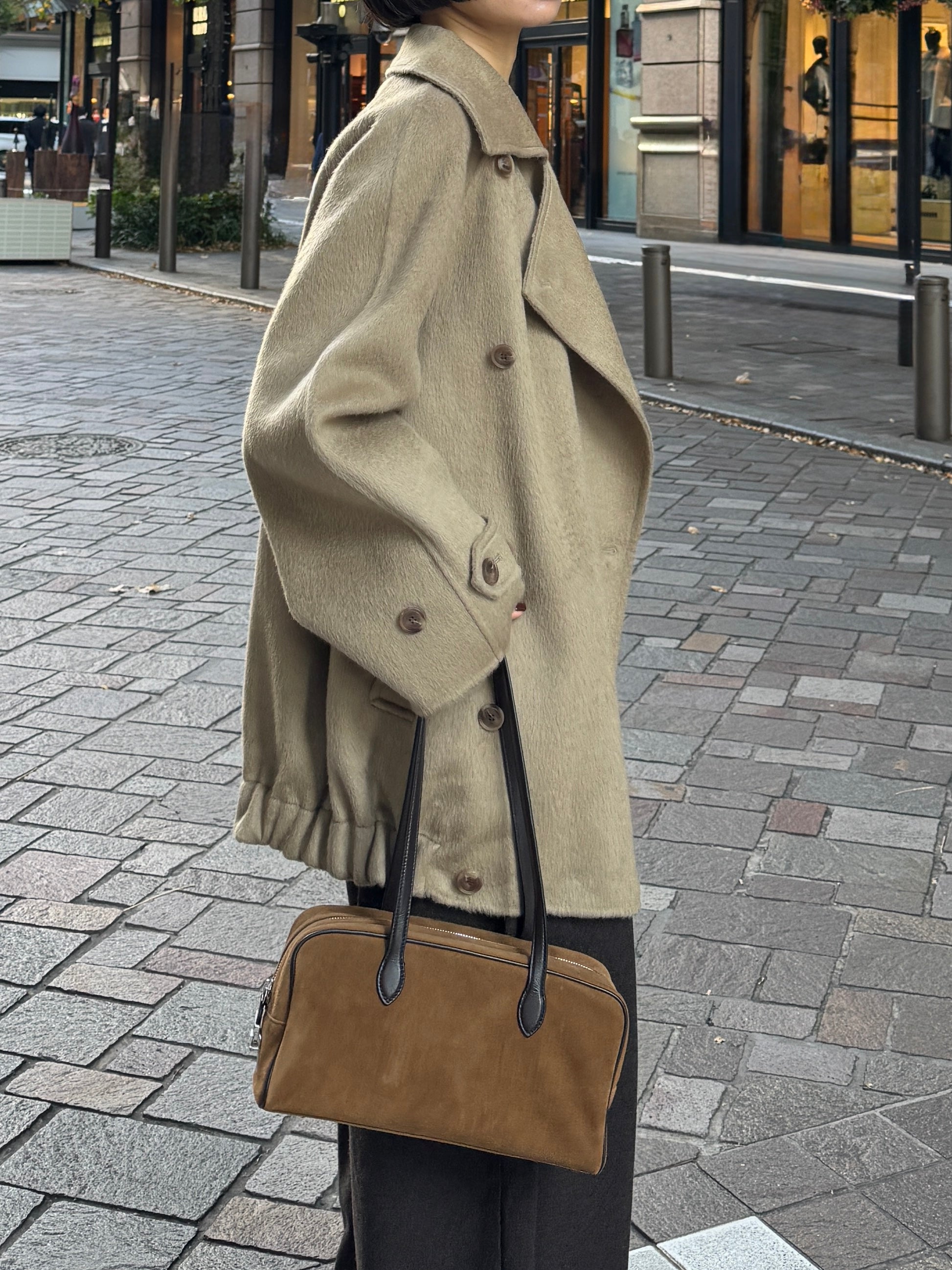 クラシックなPコートを、ゆったりと今のムードに落とし込んだ冬のオーバージャケット。 ウール100%の上質な素材ながら、軽やかで見た目以上に負担のない着心地が魅力です。 ゆとりのあるワイドシルエットに、肩線を落としたラグランスリーブを組み合わせリラックス感と程よい抜けをプラス。 厚手のニットやスウェットなどのレイヤードももたつきにくい、余白のあるフォルムが◎ フロントはクラシックな雰囲気のダブルボタン、低めに配置されたボタンが重心を落ち着かせシンプルながらこなれたムードに。 袖口のストラップボタンや、裾に入ったギャザー切り替えなど細部のディティールにもこだわりシンプルながら立体感あるデザインに仕上げました。 バランスが取りやすいミドル丈に設定し、デイリーに羽織れる気軽さがありながら品よくまとまる1着。