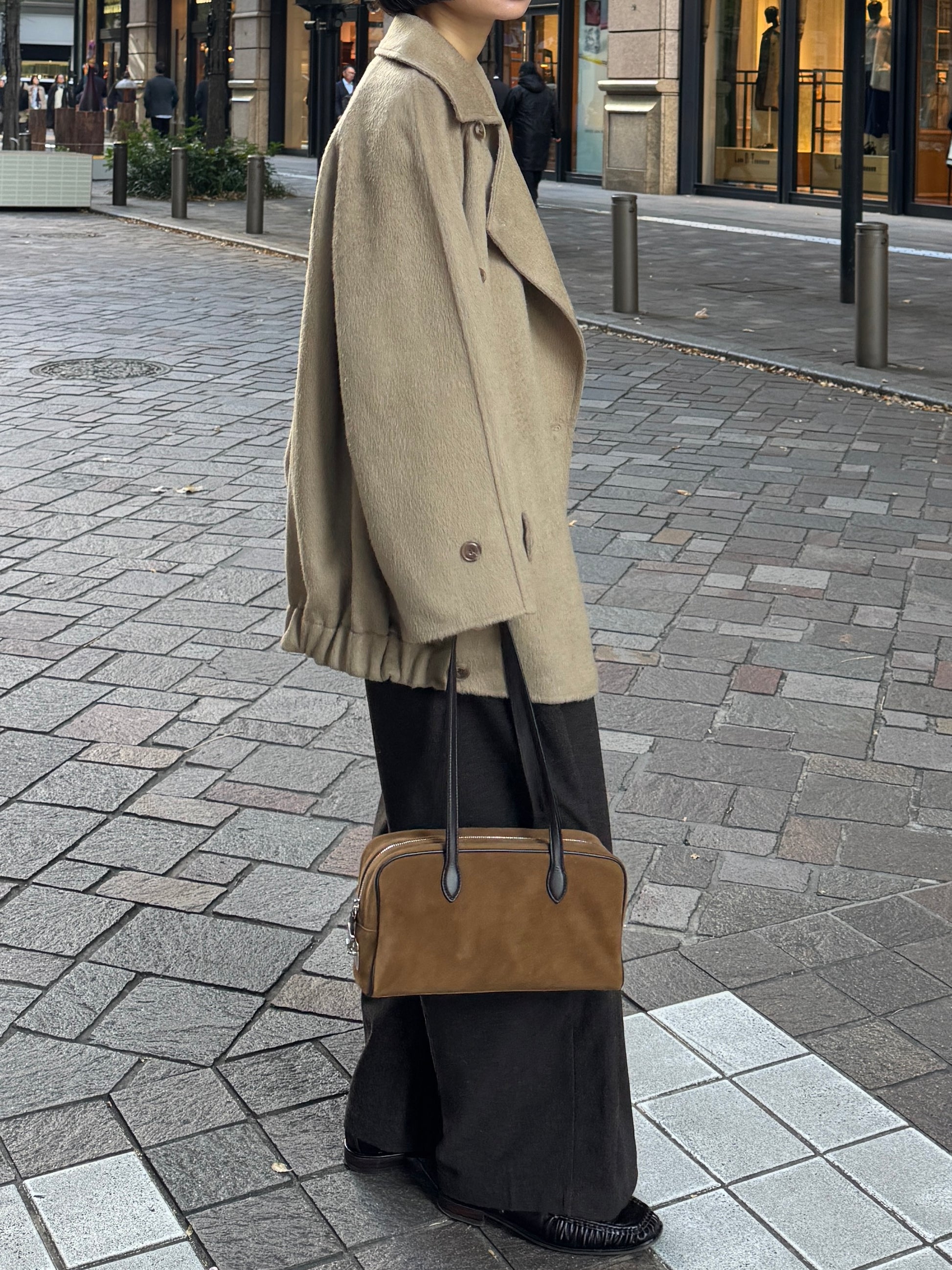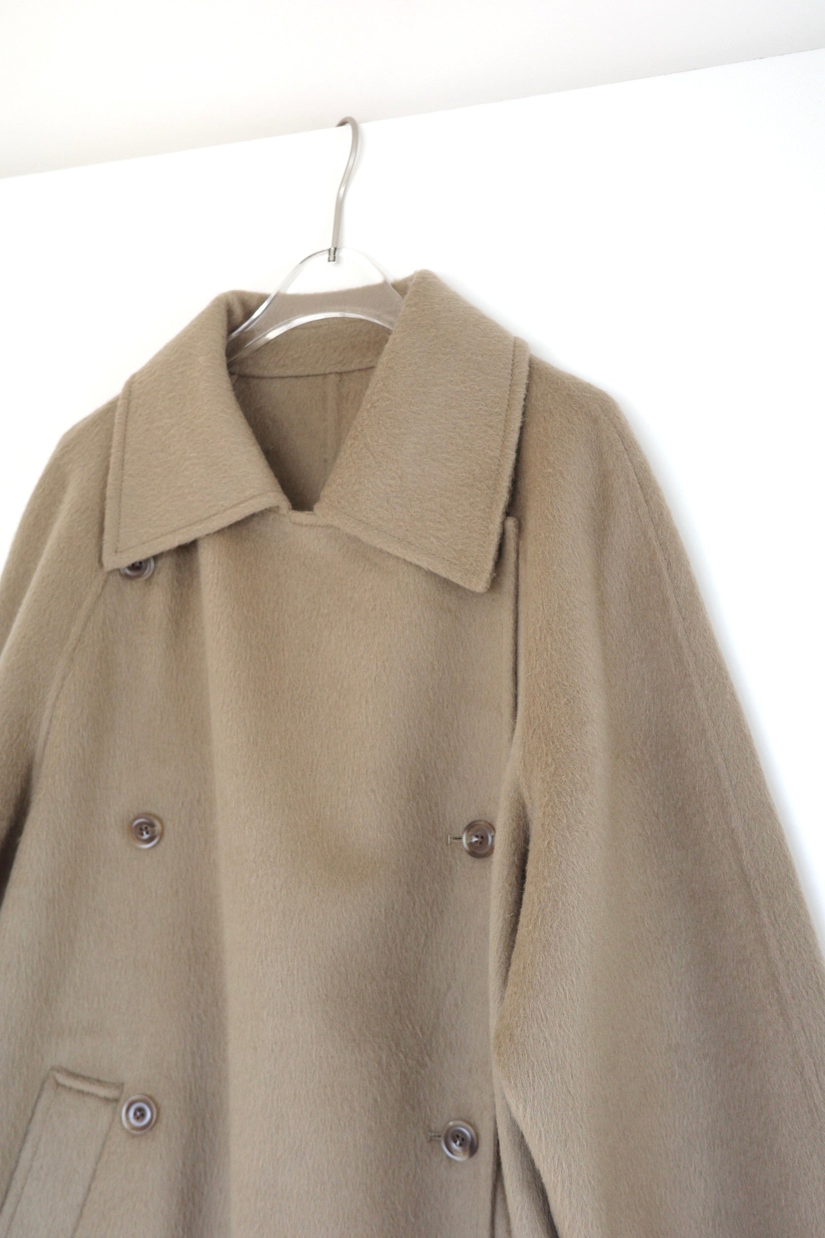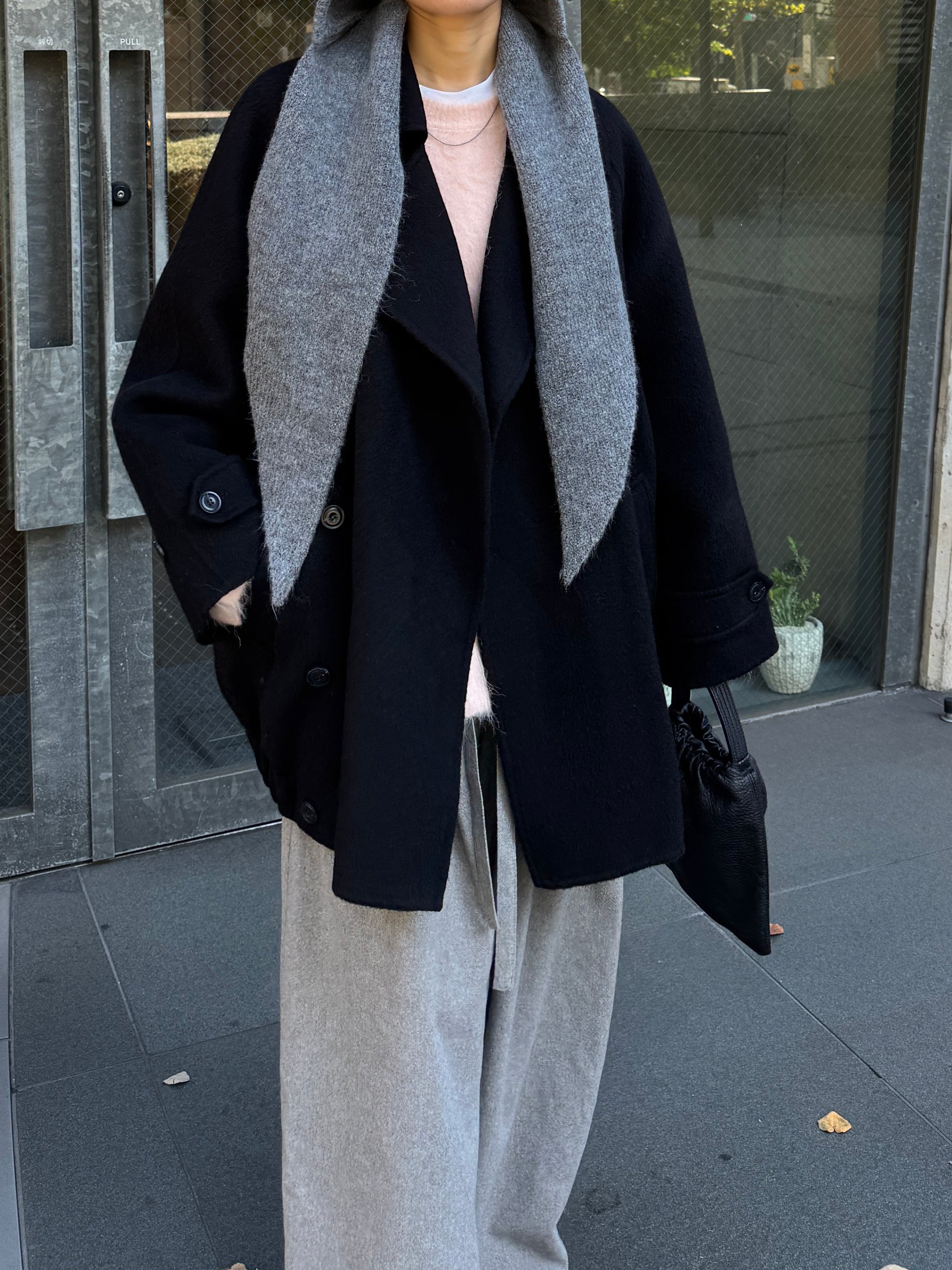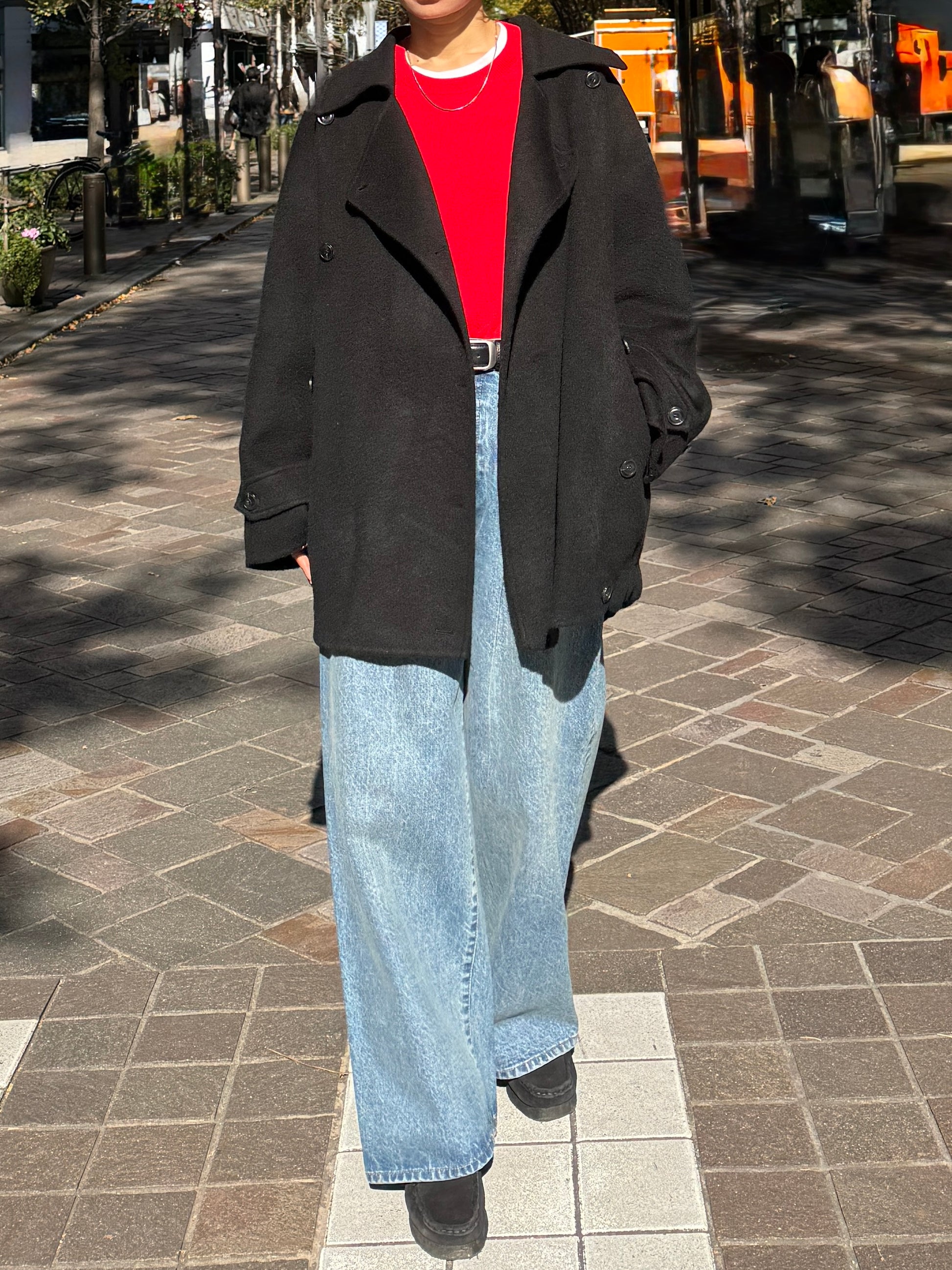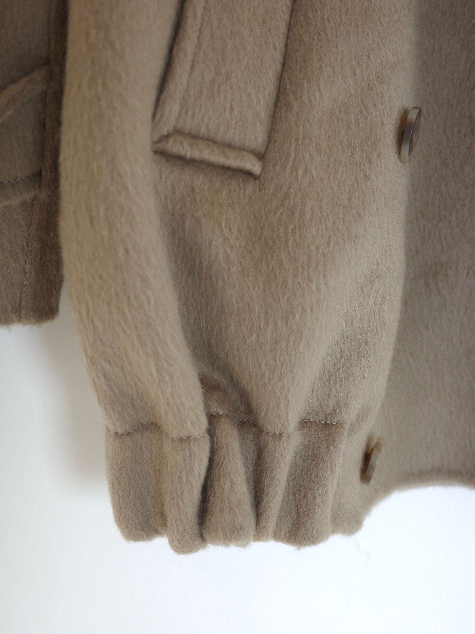 クラシックなPコートを、ゆったりと今のムードに落とし込んだ冬のオーバージャケット。 ウール100%の上質な素材ながら、軽やかで見た目以上に負担のない着心地が魅力です。 ゆとりのあるワイドシルエットに、肩線を落としたラグランスリーブを組み合わせリラックス感と程よい抜けをプラス。 厚手のニットやスウェットなどのレイヤードももたつきにくい、余白のあるフォルムが◎ フロントはクラシックな雰囲気のダブルボタン、低めに配置されたボタンが重心を落ち着かせシンプルながらこなれたムードに。 袖口のストラップボタンや、裾に入ったギャザー切り替えなど細部のディティールにもこだわりシンプルながら立体感あるデザインに仕上げました。 バランスが取りやすいミドル丈に設定し、デイリーに羽織れる気軽さがありながら品よくまとまる1着。