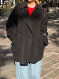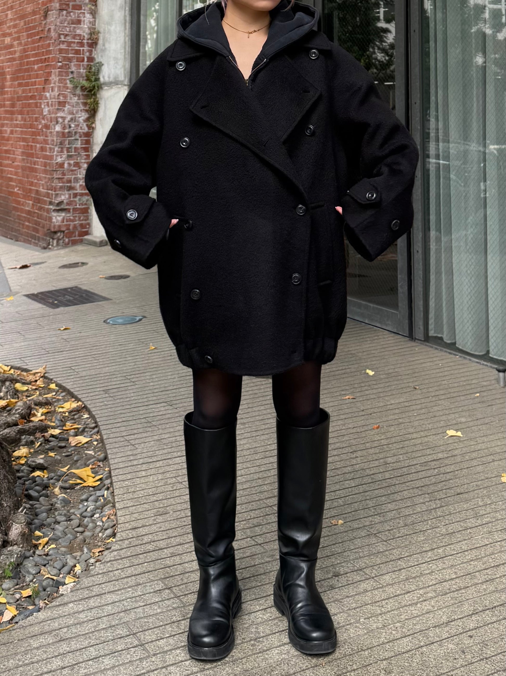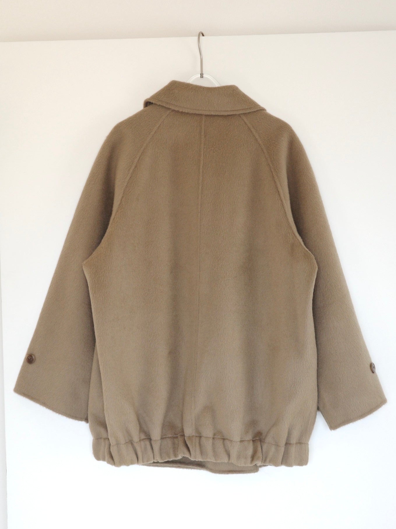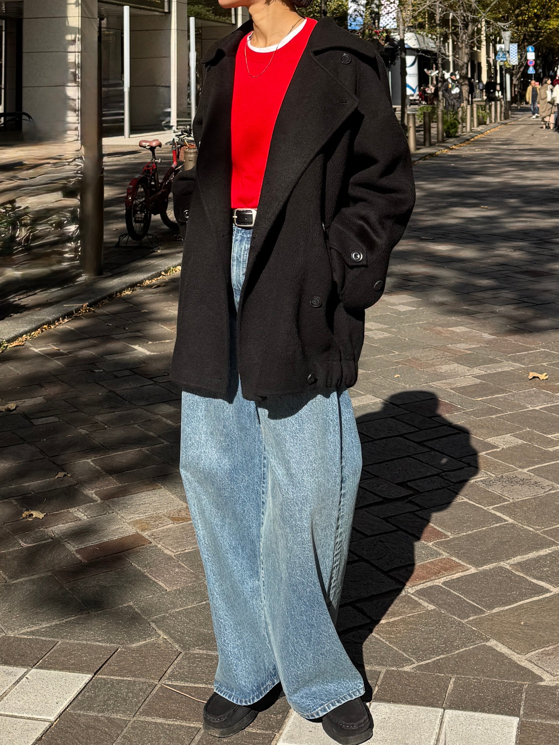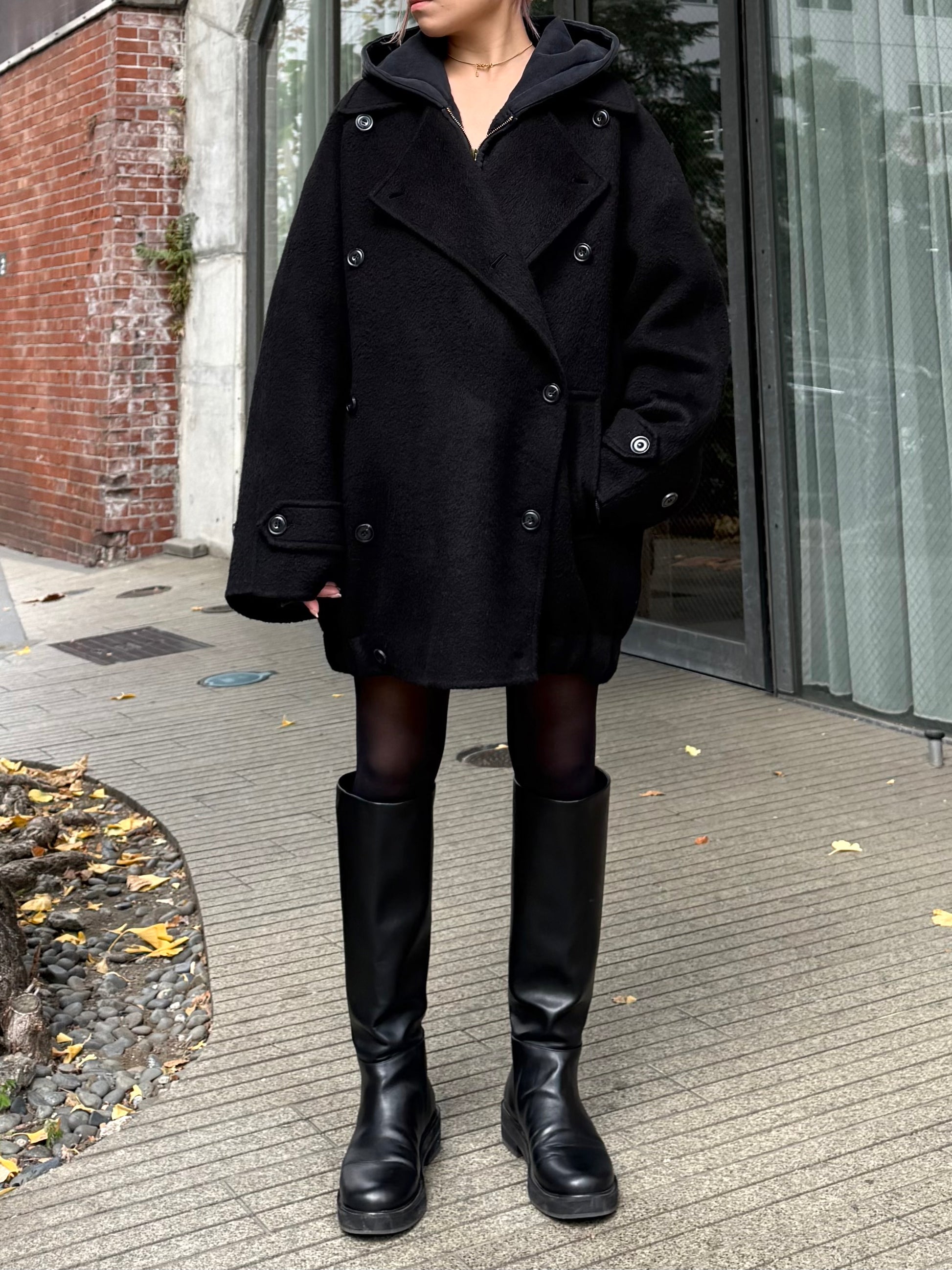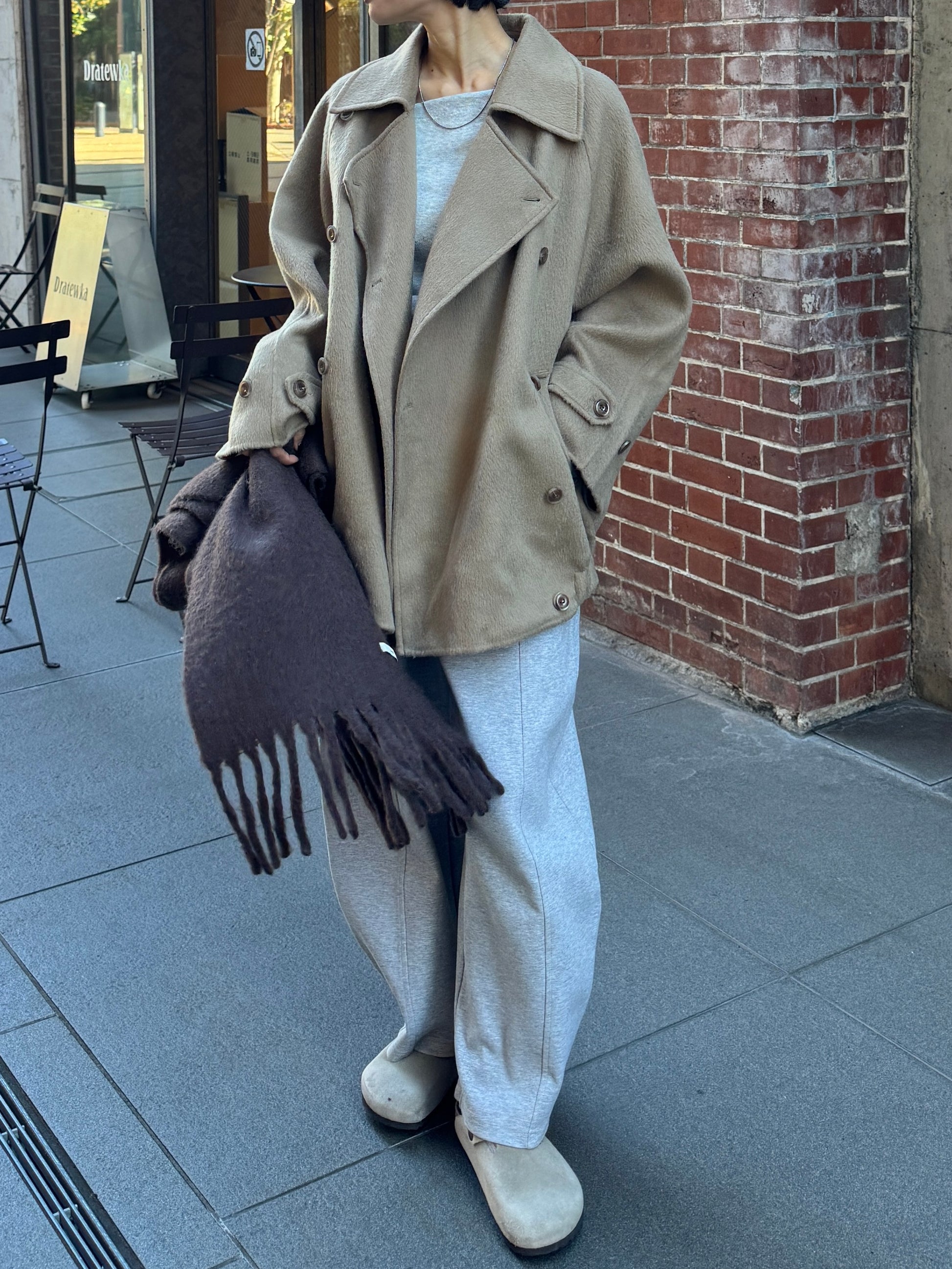クラシックなPコートを、ゆったりと今のムードに落とし込んだ冬のオーバージャケット。 ウール100%の上質な素材ながら、軽やかで見た目以上に負担のない着心地が魅力です。 ゆとりのあるワイドシルエットに、肩線を落としたラグランスリーブを組み合わせリラックス感と程よい抜けをプラス。 厚手のニットやスウェットなどのレイヤードももたつきにくい、余白のあるフォルムが◎ フロントはクラシックな雰囲気のダブルボタン、低めに配置されたボタンが重心を落ち着かせシンプルながらこなれたムードに。 袖口のストラップボタンや、裾に入ったギャザー切り替えなど細部のディティールにもこだわりシンプルながら立体感あるデザインに仕上げました。 バランスが取りやすいミドル丈に設定し、デイリーに羽織れる気軽さがありながら品よくまとまる1着。